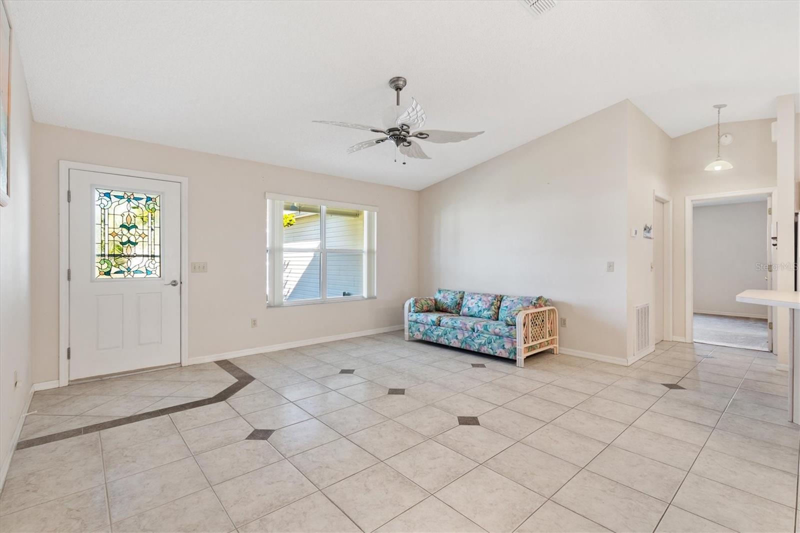 No Bond on this 2/2 Stetson model home in the Village of Santiago. Enjoy peace of mind with a new roof and HVAC system from 2021, along with a gas tankless hot water heater installed in 2020. All new Stainless Steel Appliances, 2025. Situated on a corner lot with lush landscaping, this home has an inviting covered front porch and decorative lead glass front door leading you into a spacious open-plan layout. The added Family Room and enclosed Lanai provide perfect spaces for relaxation after a day of activities in The Villages. The outdoor patio with a Pergola offers a perfect setting for dining and grilling, while the Master Bedroom boasts an ensuite bath with a tub-shower combo, and the guest bedroom features a built-in wall unit with shelves and a Murphy bed. The guest bath has a shower only. Additional highlights include large walk-in closets, ample storage, ceiling fans throughout, an insulated garage door, decorative awning over the garage door, an extra refrigerator in the laundry room, and a solar tube in the living area, making this home a perfect blend of style and functionality. Located just minutes to the mail box, and a mile to El Diablo Executive Golf Course and El Santiago Recreation Center. Plus, you're just minutes away from the lively Spanish Springs Town Square, offering dining, entertainment, and shopping galore! Savor life in The Villages and surrounding area have to provide. Be sure to watch our virtual tour of this wonderful home.