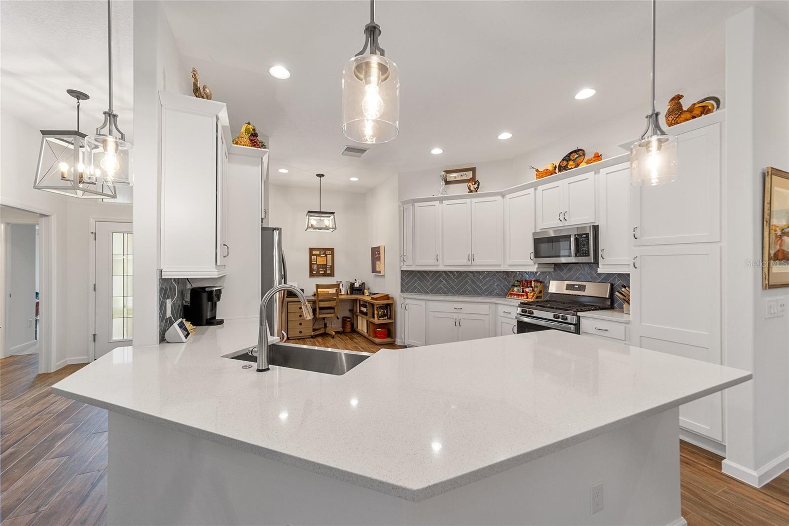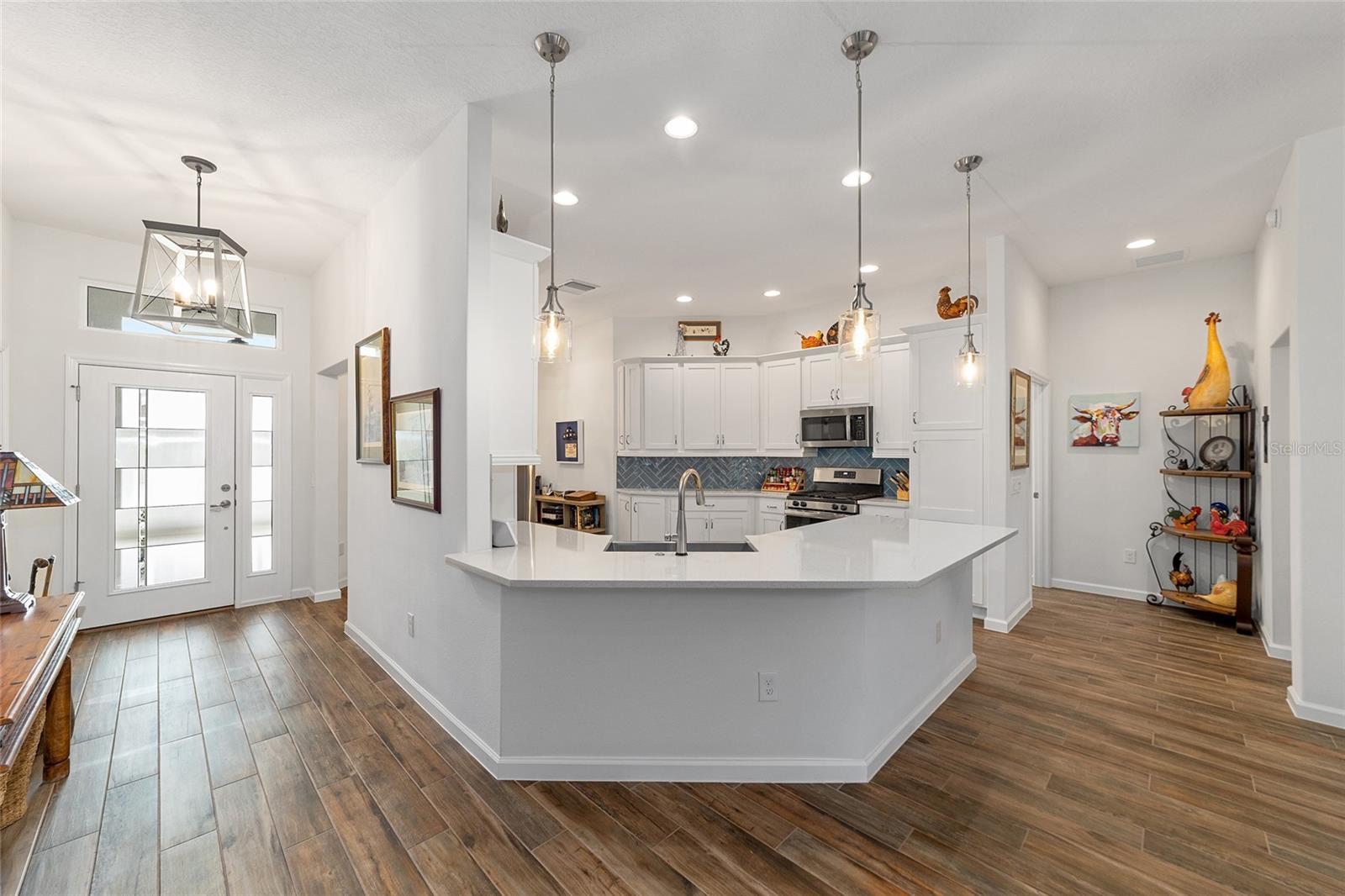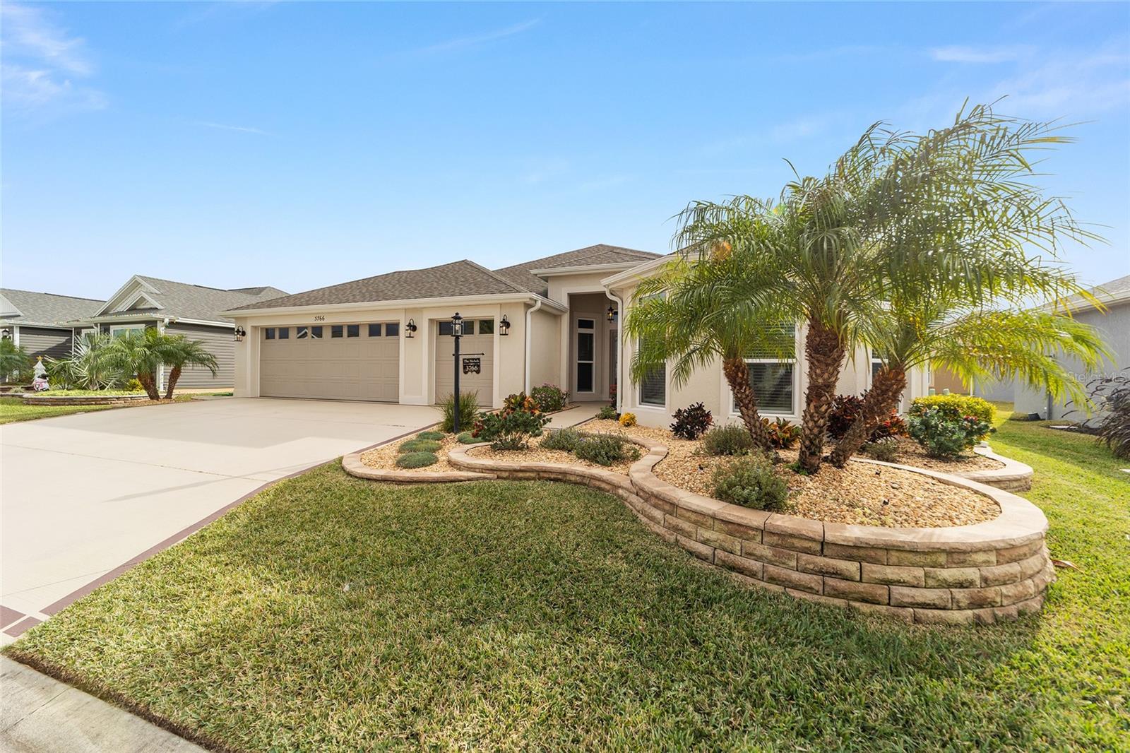 NEW PRICE!!! Welcome Home to this stunning 3-bedroom 2-bathroom TURNKEY EXPANDED BEGONIA located in the Village of Hammock at Fenney! Professionally landscaped exterior showcases stacked stone-framed rock beds and palms, creating an impressive curb appeal leading you to the gorgeous leaded glass door entry where stunning ceramic tile flooring flows through the kitchen, living room, dining room and bathrooms. The spacious kitchen offers loads of white cabinets, quartz countertops, striking subway tiled backsplash, stainless steel appliances including a gas stove and renovated eat-in kitchen nook. The dining and living areas are spacious and centrally located with pocket sliding glass doors leading to the screened lanai, perfect for relaxing and entertaining. The master bedroom is a true retreat, with tray ceilings, two walk-in closets, and a luxurious en-suite bath featuring separate double vanities, walk-in Roman shower with seat and dedicated lavatory. Guests will feel at home in the 2 additional bedrooms that include a pocket door for added privacy, while the adjacent full bath features a shower-tub combination. For added convenience and adjacent to the kitchen, is an indoor laundry room with sink and upper cabinets for extra storage. You’ll love all the space in the 2 car+ GOLF CART GARAGE! Other features include pendant lighting, soft close drawers and cabinets, painted driveway and custom hunter douglas window treatments. The Décor in this home is beautiful and perfect for you to begin your Villages Dreams! Schedule your private showing today.