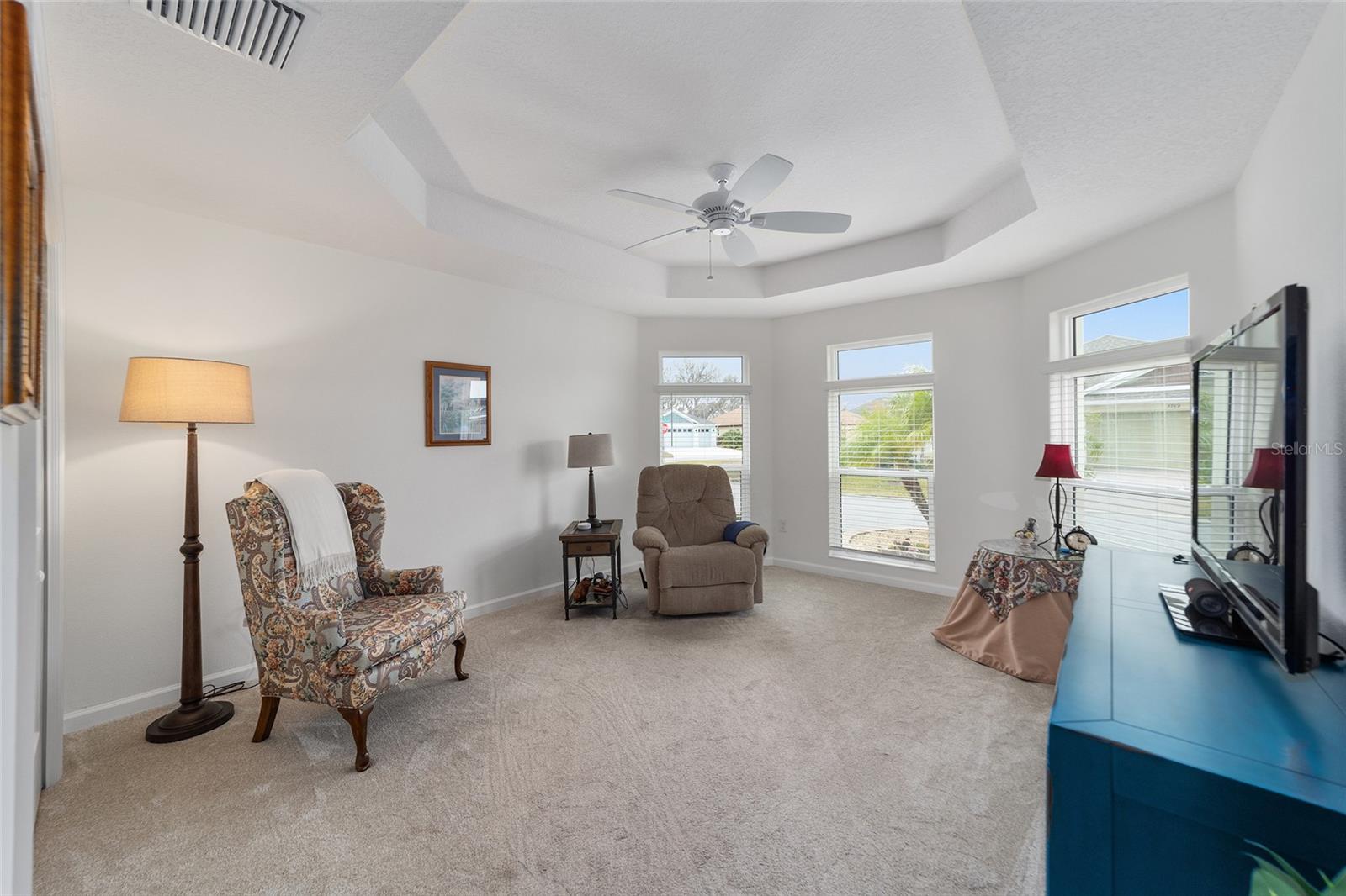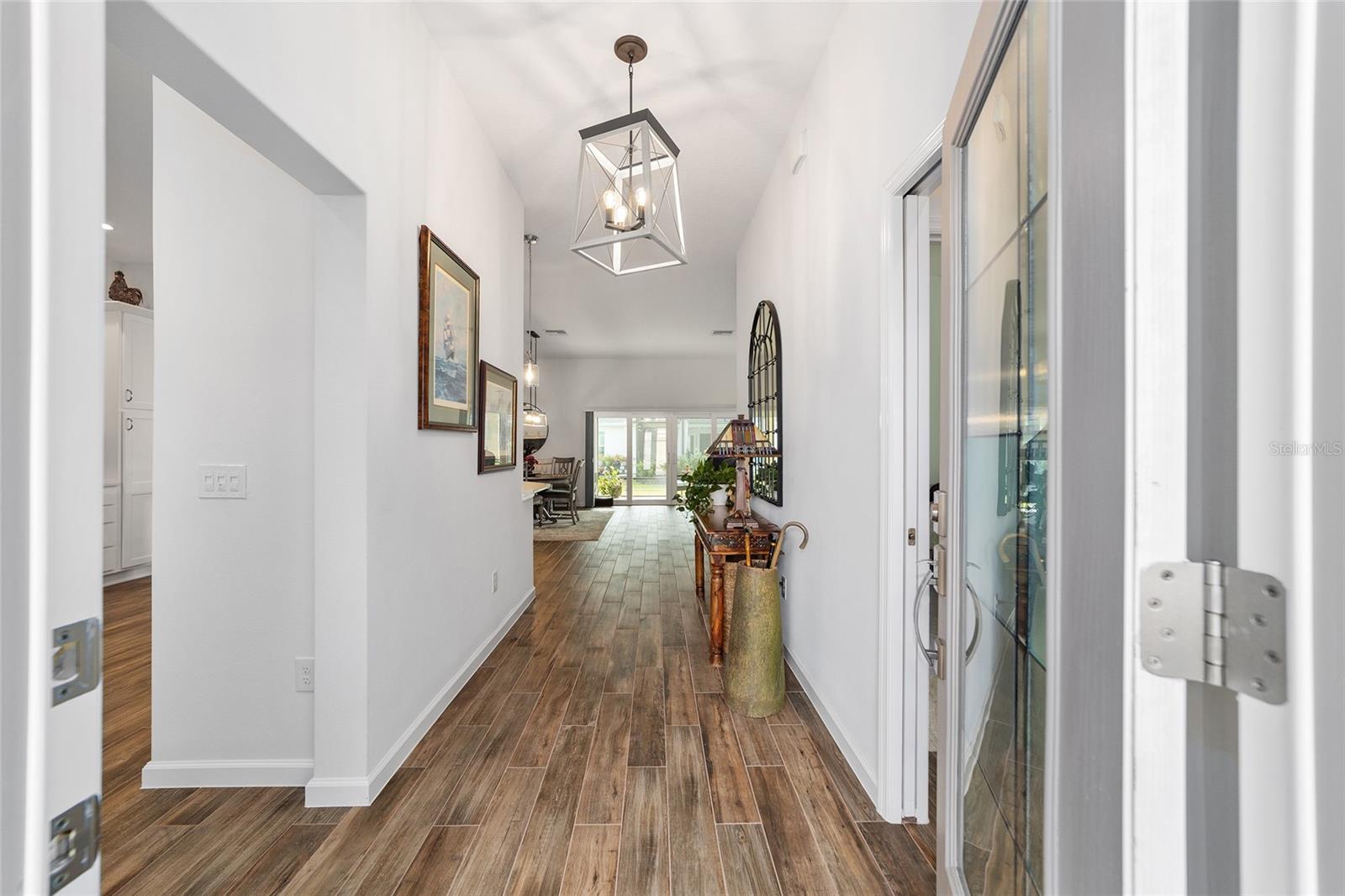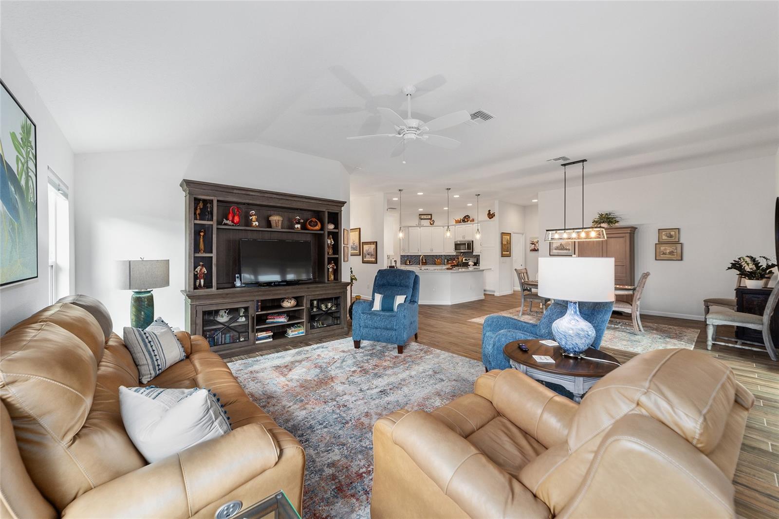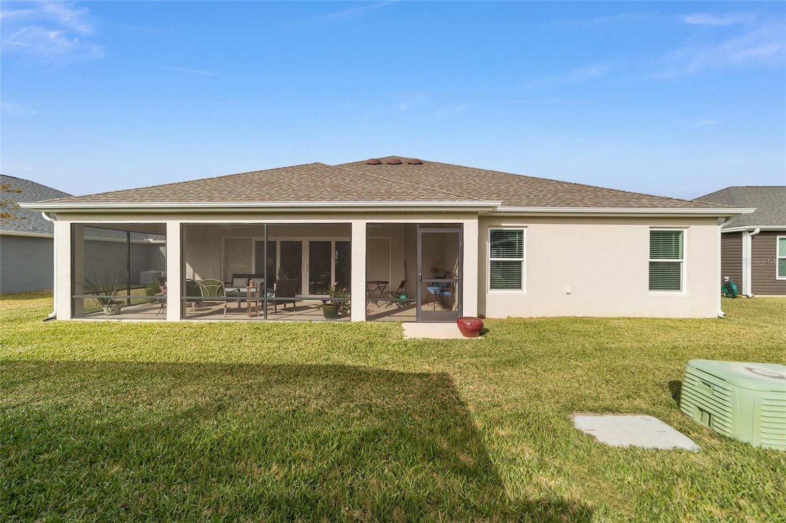 NEW PRICE!!! Welcome Home to this stunning 3-bedroom 2-bathroom TURNKEY EXPANDED BEGONIA located in the Village of Hammock at Fenney! Professionally landscaped exterior showcases stacked stone-framed rock beds and palms, creating an impressive curb appeal leading you to the gorgeous leaded glass door entry where stunning ceramic tile flooring flows through the kitchen, living room, dining room and bathrooms. The spacious kitchen offers loads of white cabinets, quartz countertops, striking subway tiled backsplash, stainless steel appliances including a gas stove and renovated eat-in kitchen nook. The dining and living areas are spacious and centrally located with pocket sliding glass doors leading to the screened lanai, perfect for relaxing and entertaining. The master bedroom is a true retreat, with tray ceilings, two walk-in closets, and a luxurious en-suite bath featuring separate double vanities, walk-in Roman shower with seat and dedicated lavatory. Guests will feel at home in the 2 additional bedrooms that include a pocket door for added privacy, while the adjacent full bath features a shower-tub combination. For added convenience and adjacent to the kitchen, is an indoor laundry room with sink and upper cabinets for extra storage. You’ll love all the space in the 2 car+ GOLF CART GARAGE! Other features include pendant lighting, soft close drawers and cabinets, painted driveway and custom hunter douglas window treatments. The Décor in this home is beautiful and perfect for you to begin your Villages Dreams! Schedule your private showing today.