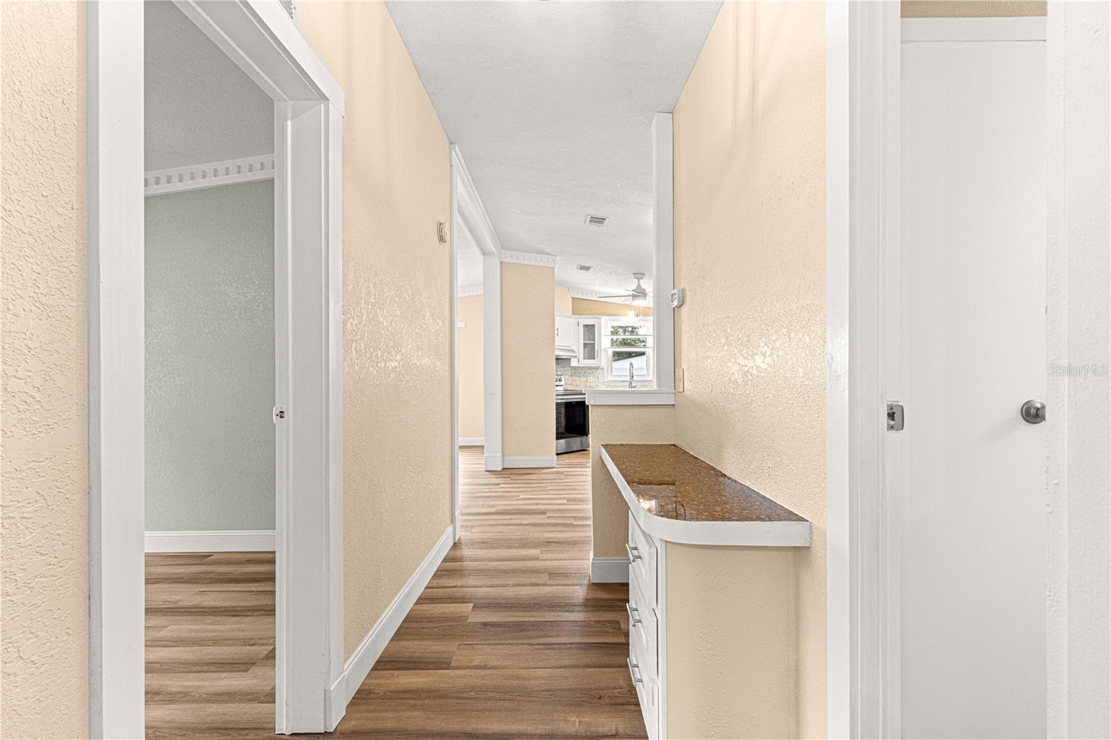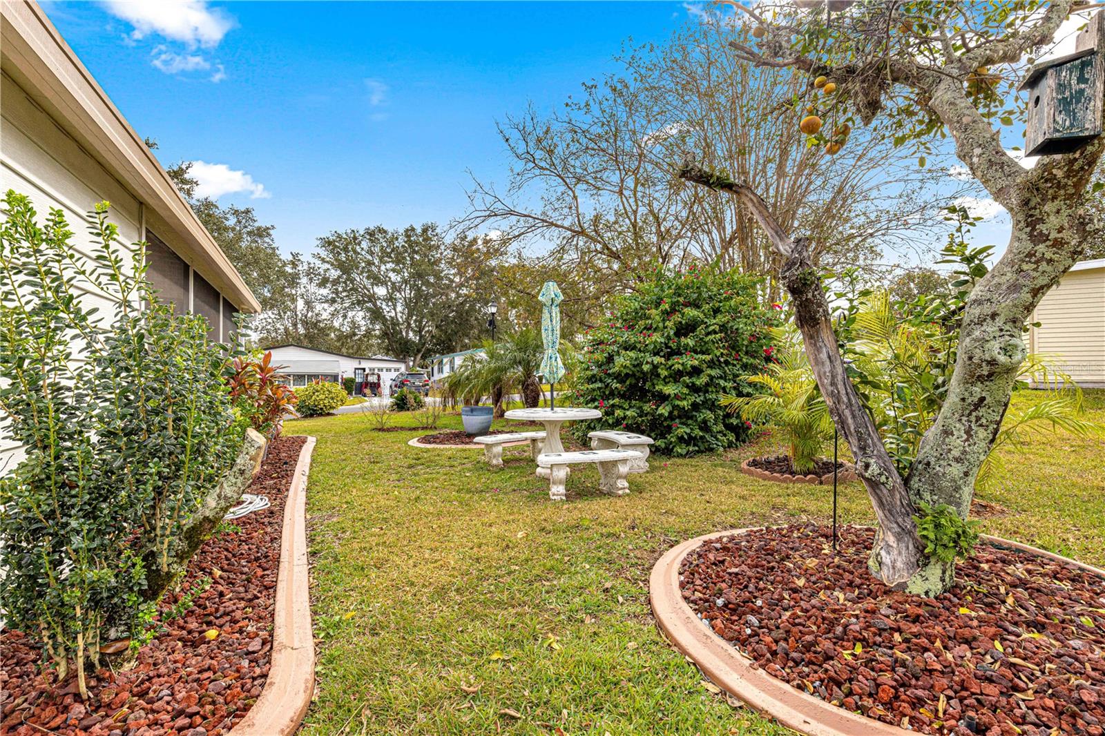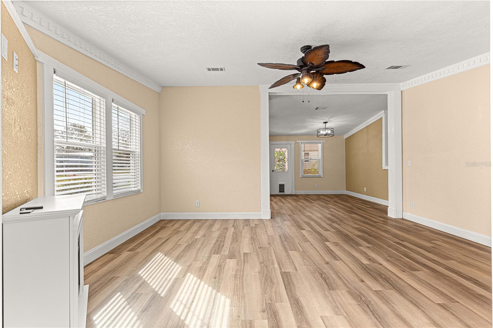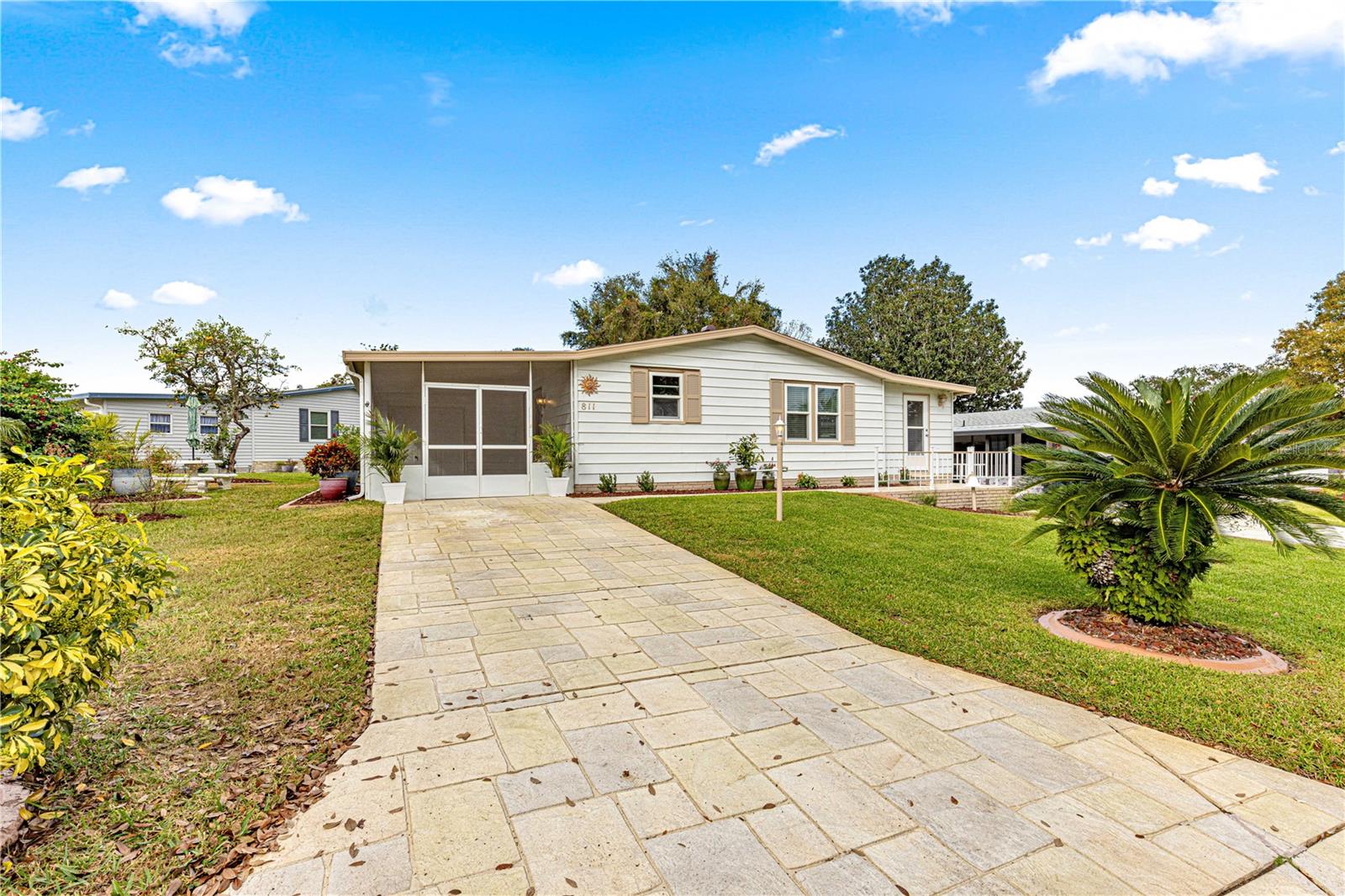 THE REMODELING IS COMPLETED! WITH A PRICE IMPROVEMENT. This home has been totally refreshed with modern upgrades that add a sleek and stylish appeal. This 2 Bedroom, 2 Bath is complete with a new roof (2024), new texture plaster on ceiling and walls, new flooring, trim, doors, baseboard, electrical outlets and modern electrical fan/lighting fixtures. The entire interior has been newly painted in neutral colors to match any decor. In addition, there is a custom master bath with new vanity/sink, storage cabinetry, large tile shower, with all new plumbing fixtures and newer barn doors for a modern look. You will be greeted with a beautifully landscaped yard featuring various plants and 2 grapefruit trees on an oversize lot. The kitchen boasts of new granite counters, coordinating backsplash and all stainless-steel appliances. With NO bond, this clean, move-in ready home is situated in a great location, just a block from the community pool and 2 blocks from the Orange Blossom Country Club/ Restaurant and waterfall pool. As if all this isn't enough, the home sits just minutes from Spanish Springs town center, which includes nightly entertainment, dining venues, shopping and medical facilities. The Screened Porch /Garage plus golfcart garage/ laundry room which includes washer and dryer plus a sink are a big plus ... Please keep in mind all these upgrades are brand new and exquisite. The house has designer crown molding throughout, giving it a very unique elegant style, please take a look at the pictures carefully to appreciate it. Electrical updates: All electrical outlets and switches were replaced in 2024, ensuring safety and reliability, plus power surge protection throughout the house. No bond: A great perk for those looking for easy and affordable living! This home is ideal l for someone looking to enjoy The Villages lifestyle. Don’t miss out on this one! schedule your virtual or in-person tour today! If you’re ready to take a closer look, I can help arrange a viewing at your convenience. A quick closing is possible on this home!