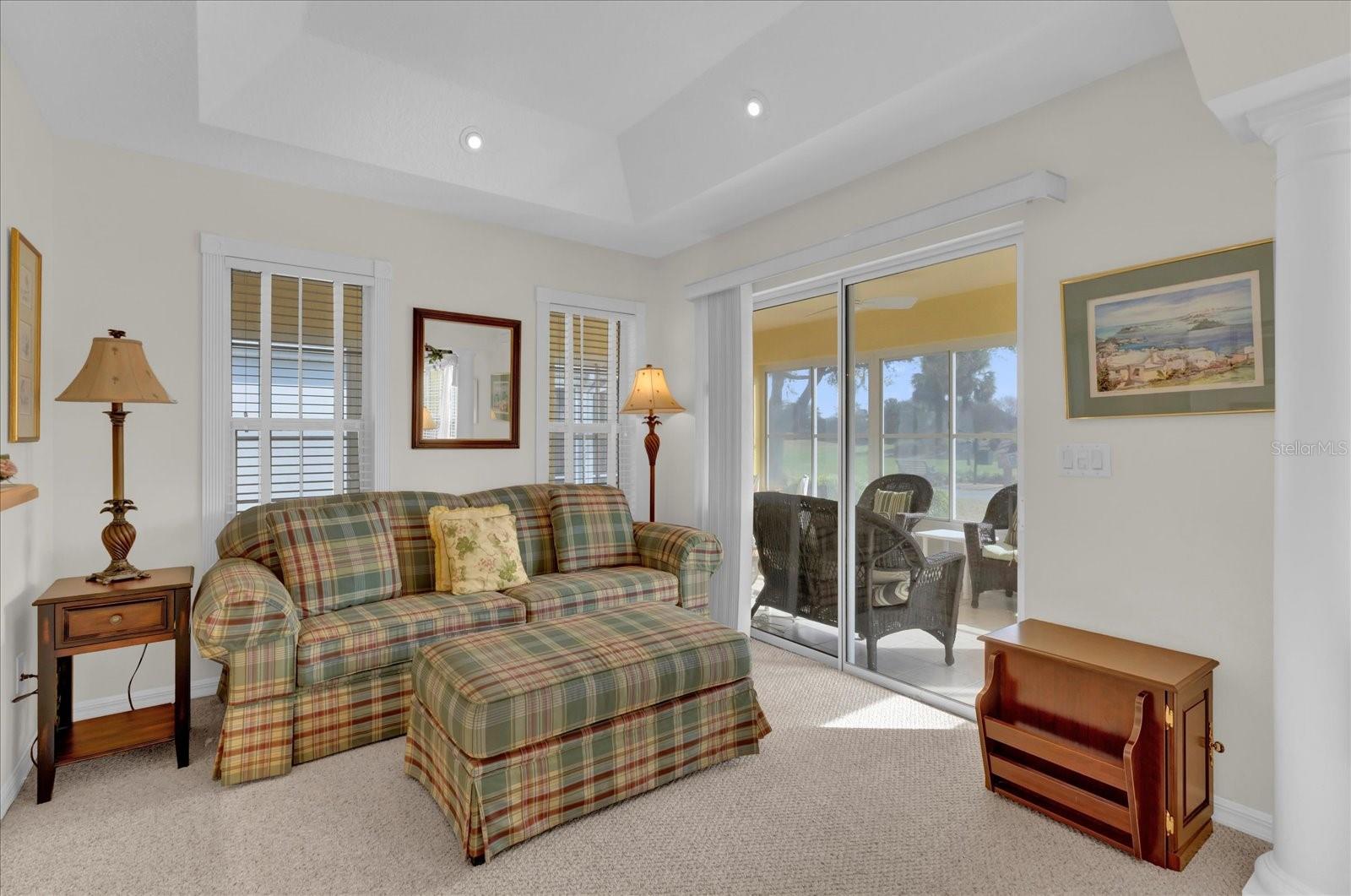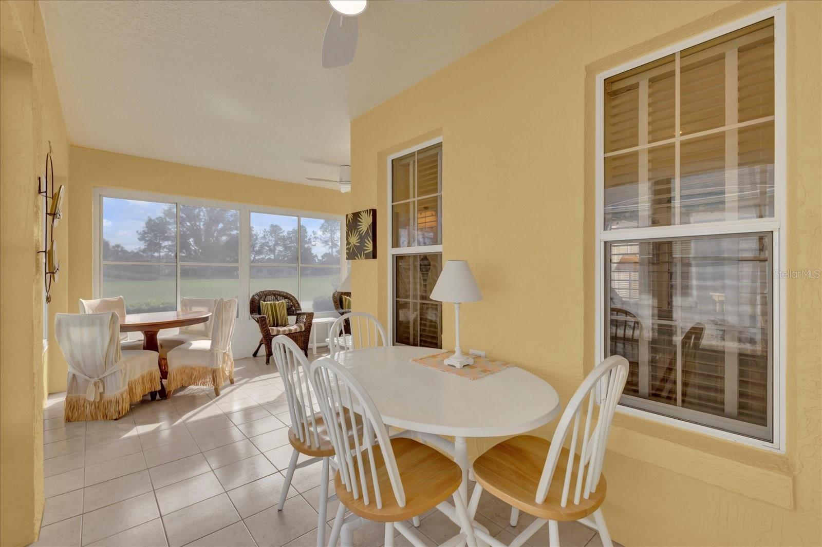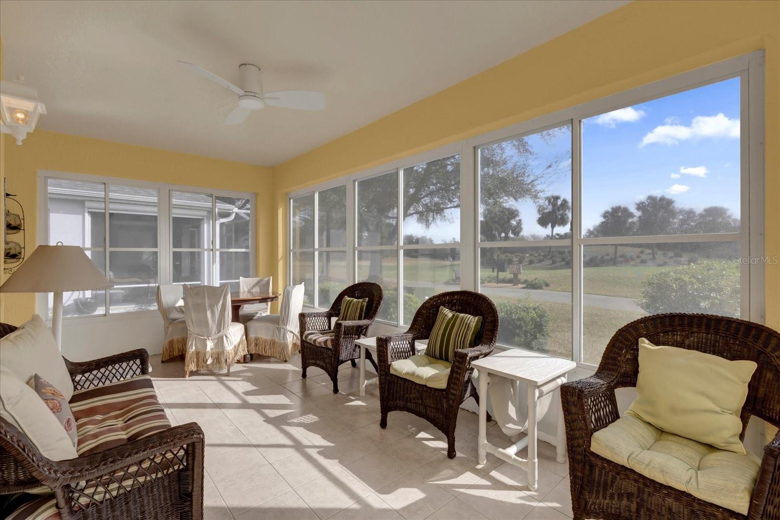 BOND PAID! TURNKEY WITH YAMAHA GAS GOLF CART! Nestled in a tranquil setting in The Villages, this 3-bedroom, 2-bathroom block and stucco home offers an extraordinary golf course view overlooking the stunning El Diablo Executive Golf Course. Imagine enjoying your morning coffee or evening cocktail on the tiled, enclosed lanai or on the outdoor patio, taking in the serene beauty of golfers passing by and the lush greens. Conveniently located just a short golf cart ride to Spanish Springs Town Square, you’ll have access to vibrant entertainment, shopping, and dining, all within moments from your doorstep. This home is conveying turnkey, including a Yamaha gas golf cart, so all you need to bring is your toothbrush to start enjoying the ultimate Villages lifestyle. The serene location at the back of the neighborhood ensures minimal traffic, offering peace and privacy. The exterior boasts charming Curb-It landscaping and an electric garage screen, while the new roof (2023) and HVAC system (2012) with a Comfort EZ Flex air filtration cabinet provide peace of mind and energy efficiency. Inside, the home features volume ceilings with tray accents in the dining room and master bedroom, creating an open and airy ambiance. The spacious kitchen with a center island is perfect for culinary enthusiasts or casual dining. Ceramic tile in the wet areas and durable Berber carpet throughout the rest of the home ensure comfort and low maintenance. The 2-car garage offers ample space for storage and convenience. Don’t miss this incredible opportunity to own a piece of paradise in The Villages with breathtaking golf course views, modern updates, and close proximity to all the amenities Spanish Springs has to offer!