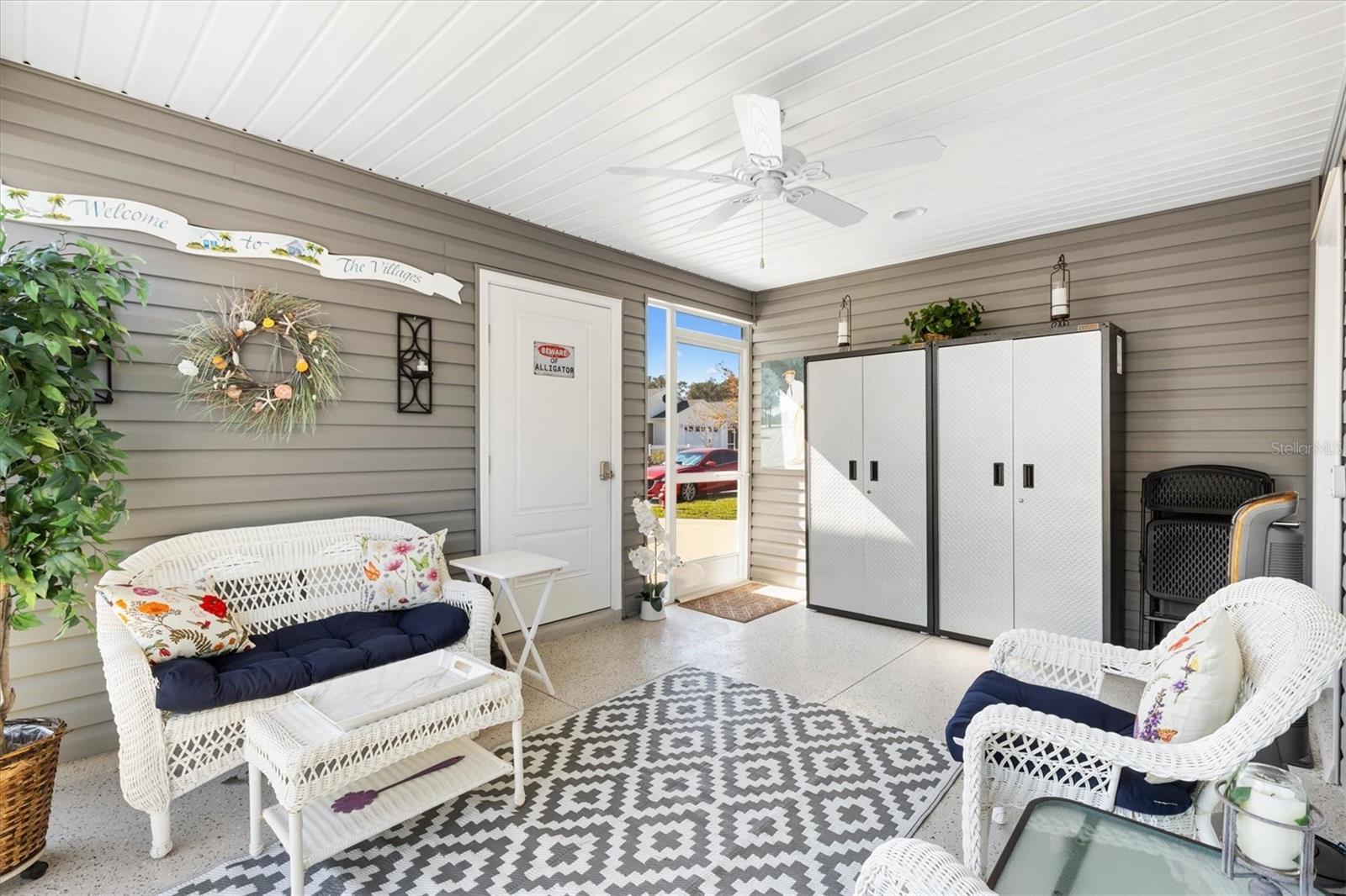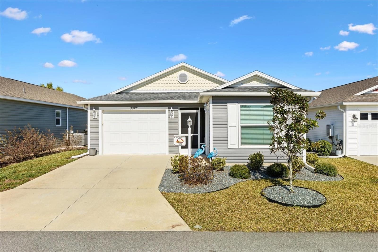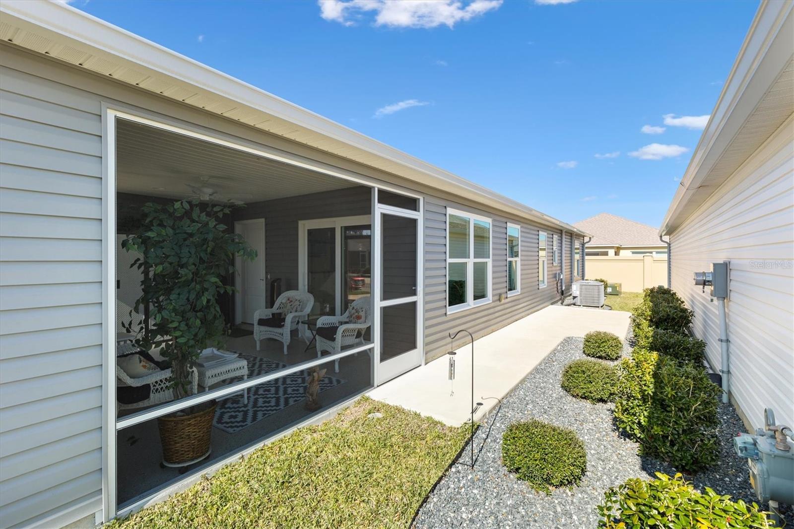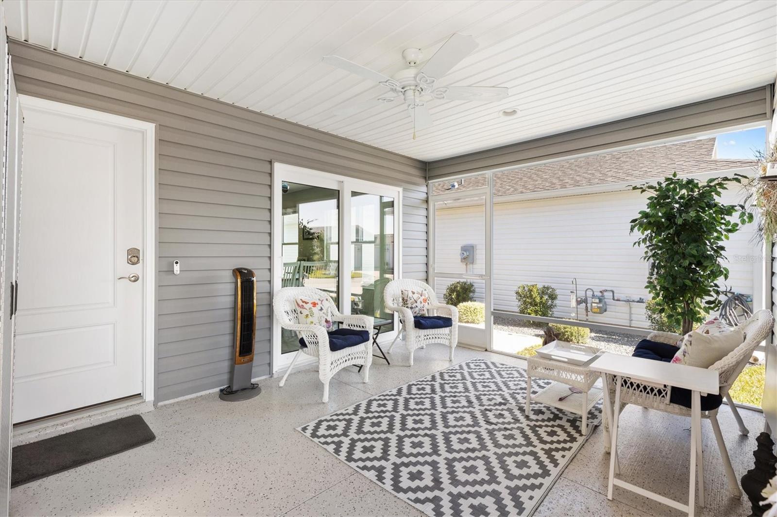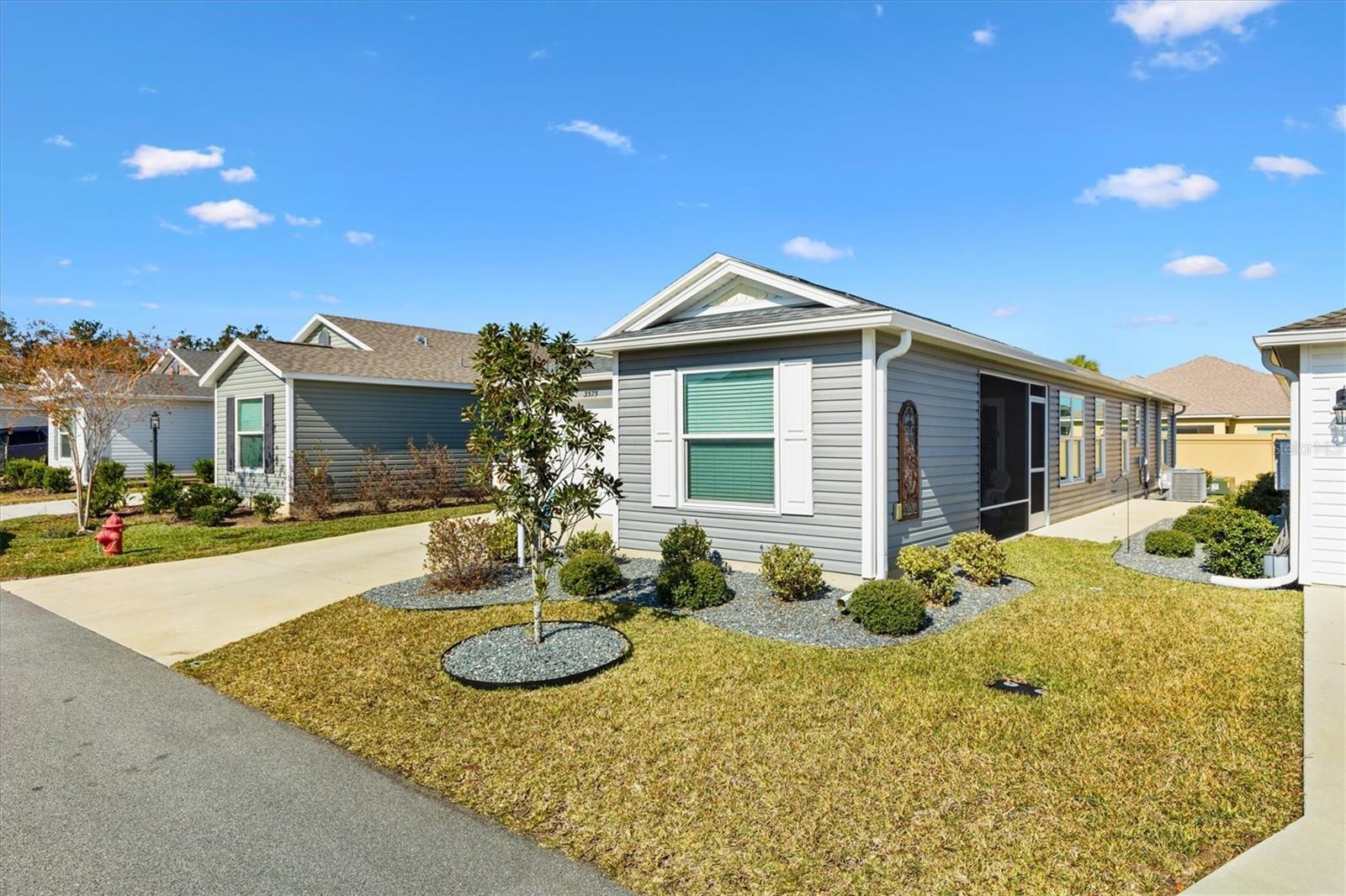 Pristine 2/2 Emerald Patio Villa. Swallowtail Villas in the Hammock at Fenney. Enjoy the screened front lanai with epoxy floors to relax after a day of activities. Then walk into your freshly painted open floor plan with luxury vinyl plank flooring throughout, top down bottom up black out shades on all the windows, upgraded lighting in the kitchen and dining rooms, ceiling fans in the living room and bedrooms. The kitchen is open to the living and dining room with a large island and breakfast bar. The kitchen boasts stainless steel appliances, 4 burner gas range with griddle, oversized Stainless Steel sink, pull out shelves, pantry closet, and desk. Inside laundry closet complete with washer and dryer and additional storage shelves is just off the kitchen. The master bedroom has an ensuite bath with shower, dual vanity, water closet, linen closet and a large walk in closet with added shelving. The guest bath has a pocket door and a shower tub combination. Garage and golf cart garage have epoxy floors and insulated doors. The garage has a Mitsubishi mini split dehumidifier AC system. Enjoy outdoor relaxing, grilling and dining patio, low maintenance landscaping, Nova Water Filtration System, Teeho Key Pad entry on all exterior doors, tankless hot water heater, bidet toilets in both bathrooms, high vaulted ceilings throughout, interior utility closet with additional shelving. Rain gutters around the house have been added. This home has a fire hydrant on the property giving you an insurance benefit. Located less than a quarter mile to the Hammock’s golf courses, and less than 1 mile to Fenney Recreation Center and Nature Trail for activities and swimming. Savor life in all The Villages and surrounding area have to provide. Be sure to watch our virtual tour of this wonderful home and schedule your appointment to see it today!