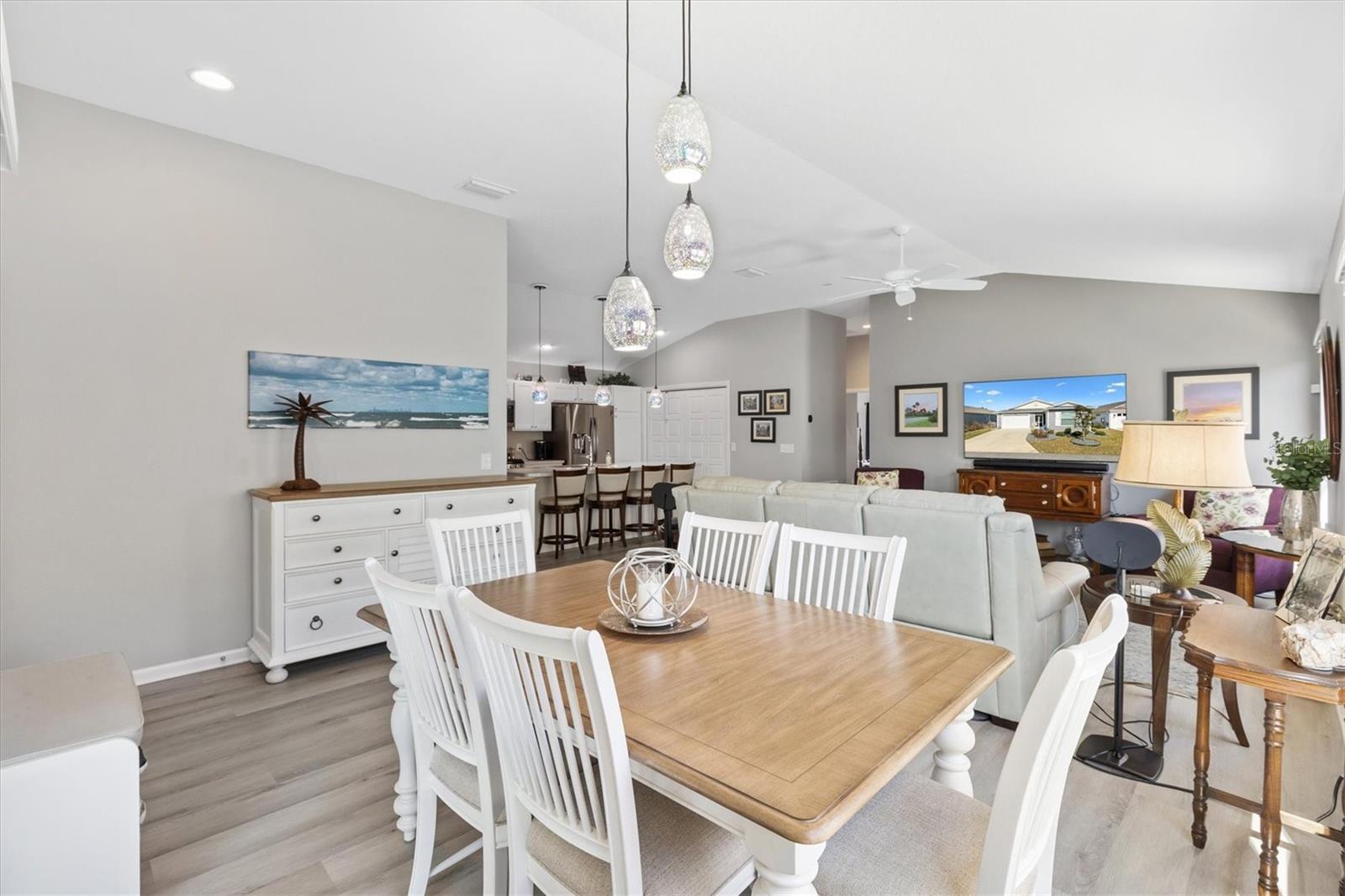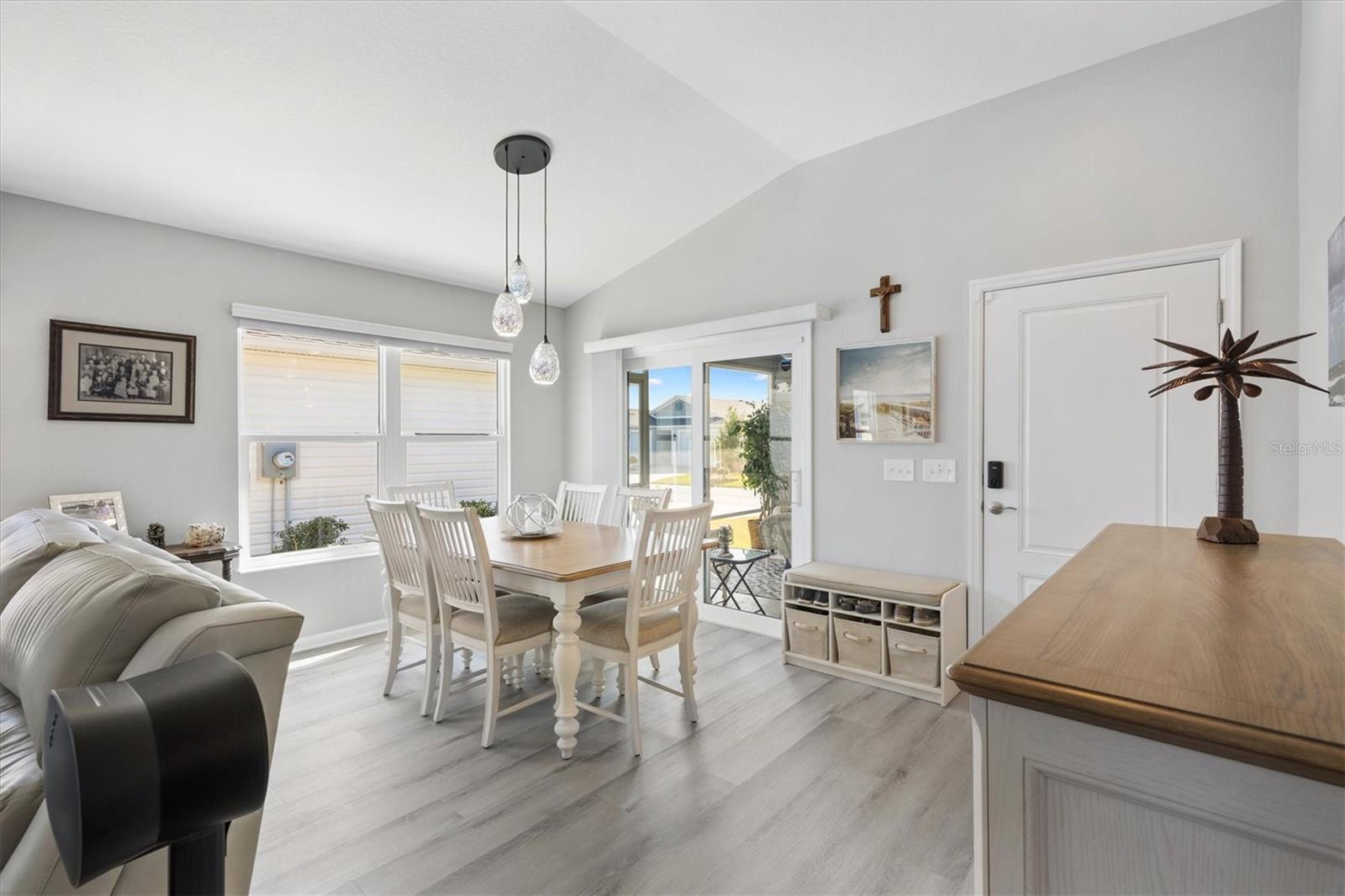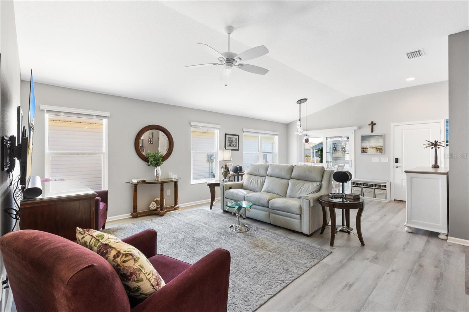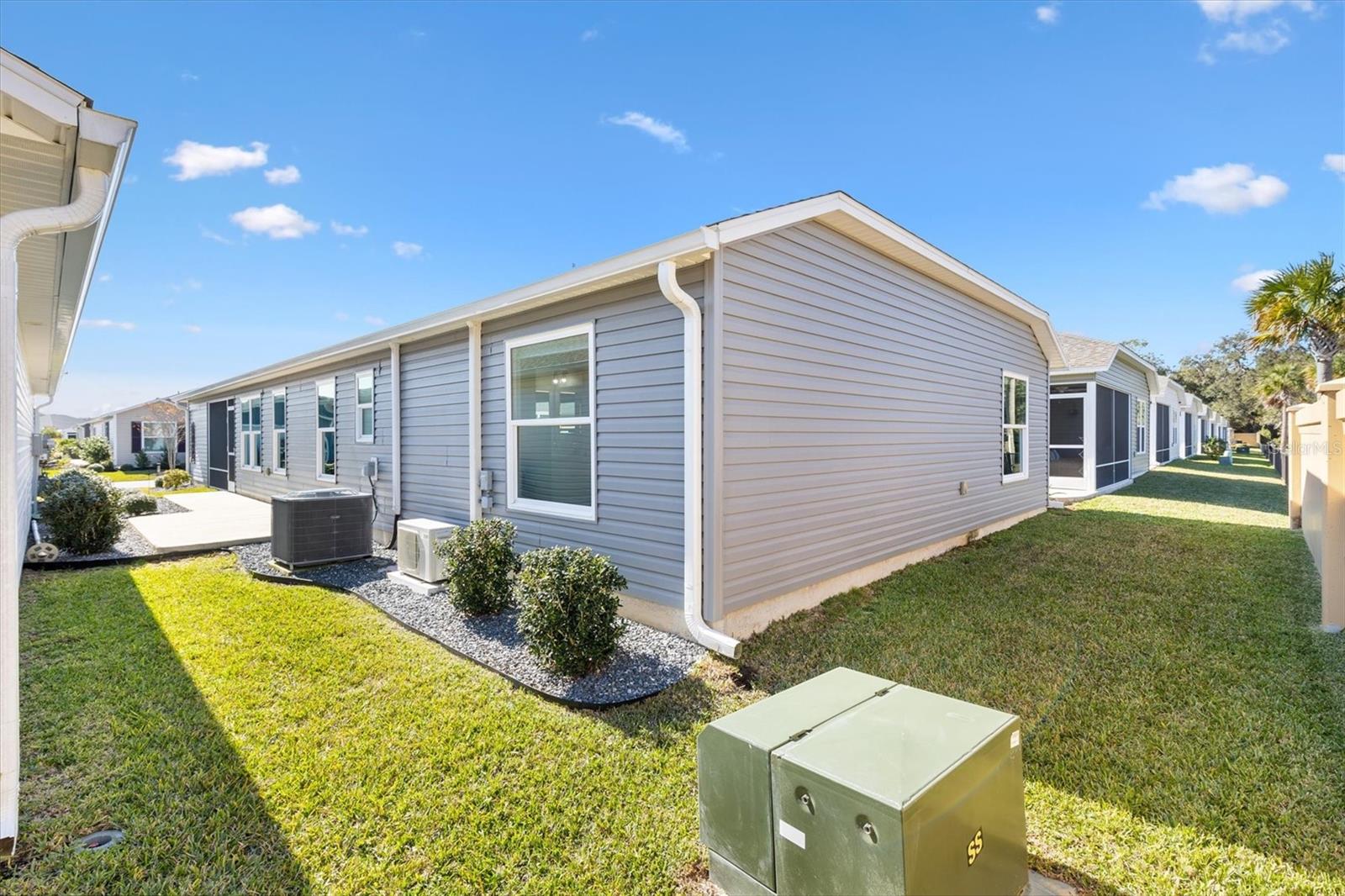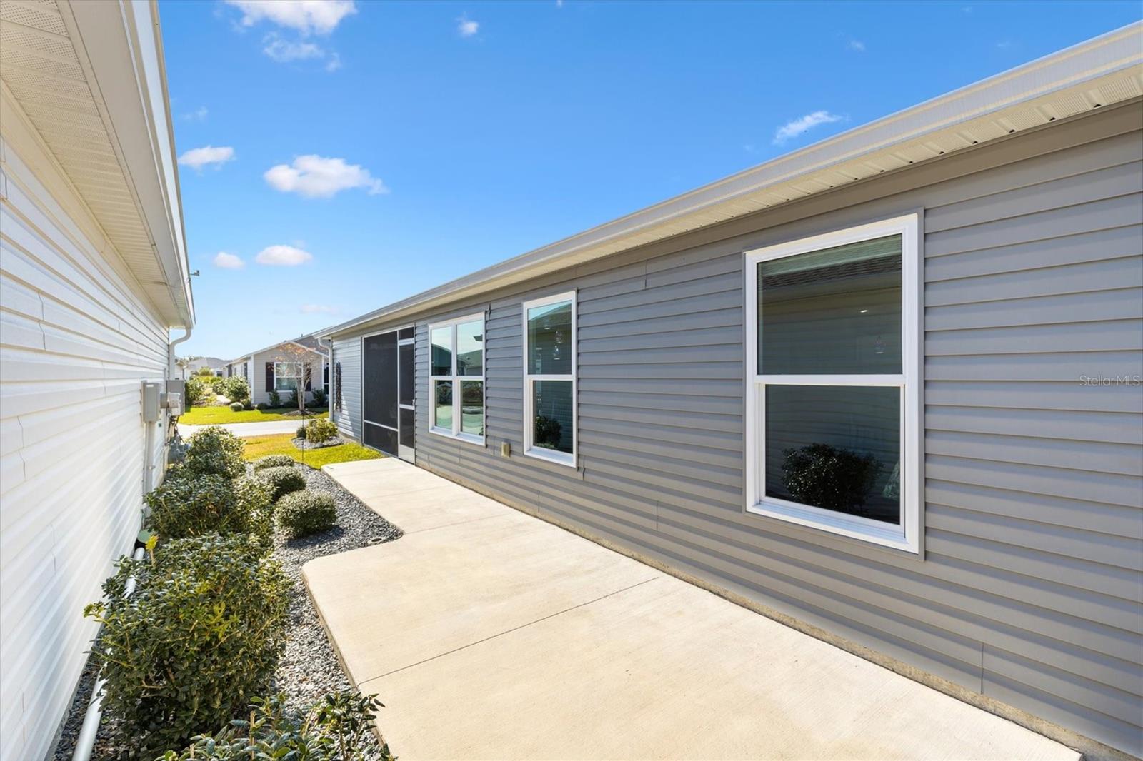 Pristine 2/2 Emerald Patio Villa. Swallowtail Villas in the Hammock at Fenney. Enjoy the screened front lanai with epoxy floors to relax after a day of activities. Then walk into your freshly painted open floor plan with luxury vinyl plank flooring throughout, top down bottom up black out shades on all the windows, upgraded lighting in the kitchen and dining rooms, ceiling fans in the living room and bedrooms. The kitchen is open to the living and dining room with a large island and breakfast bar. The kitchen boasts stainless steel appliances, 4 burner gas range with griddle, oversized Stainless Steel sink, pull out shelves, pantry closet, and desk. Inside laundry closet complete with washer and dryer and additional storage shelves is just off the kitchen. The master bedroom has an ensuite bath with shower, dual vanity, water closet, linen closet and a large walk in closet with added shelving. The guest bath has a pocket door and a shower tub combination. Garage and golf cart garage have epoxy floors and insulated doors. The garage has a Mitsubishi mini split dehumidifier AC system. Enjoy outdoor relaxing, grilling and dining patio, low maintenance landscaping, Nova Water Filtration System, Teeho Key Pad entry on all exterior doors, tankless hot water heater, bidet toilets in both bathrooms, high vaulted ceilings throughout, interior utility closet with additional shelving. Rain gutters around the house have been added. This home has a fire hydrant on the property giving you an insurance benefit. Located less than a quarter mile to the Hammock’s golf courses, and less than 1 mile to Fenney Recreation Center and Nature Trail for activities and swimming. Savor life in all The Villages and surrounding area have to provide. Be sure to watch our virtual tour of this wonderful home and schedule your appointment to see it today!