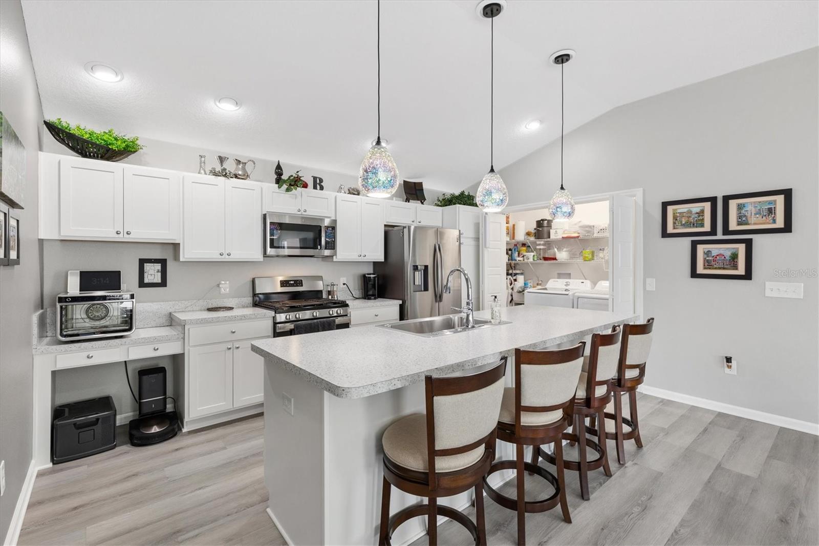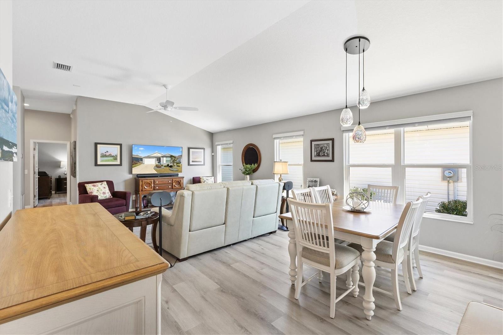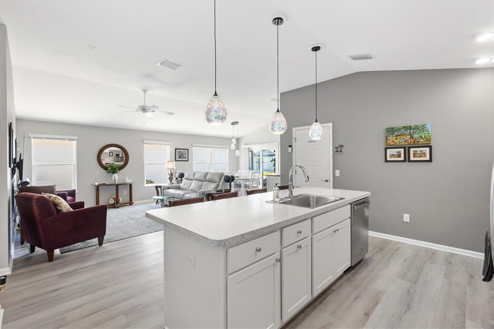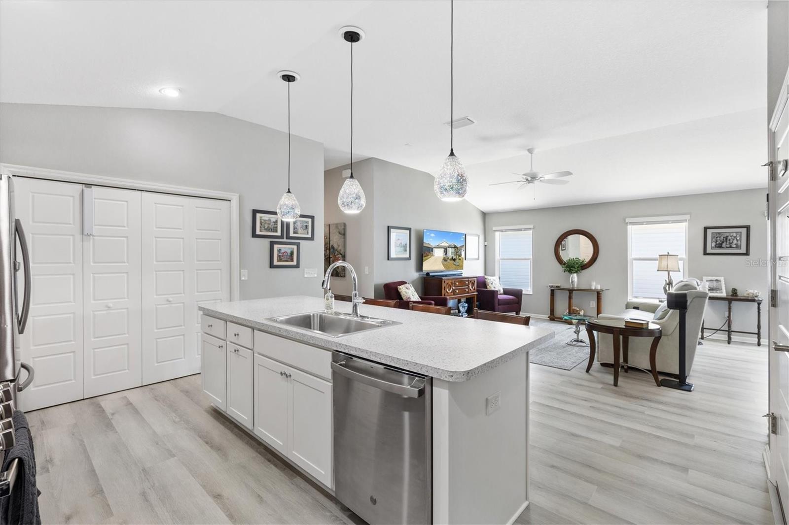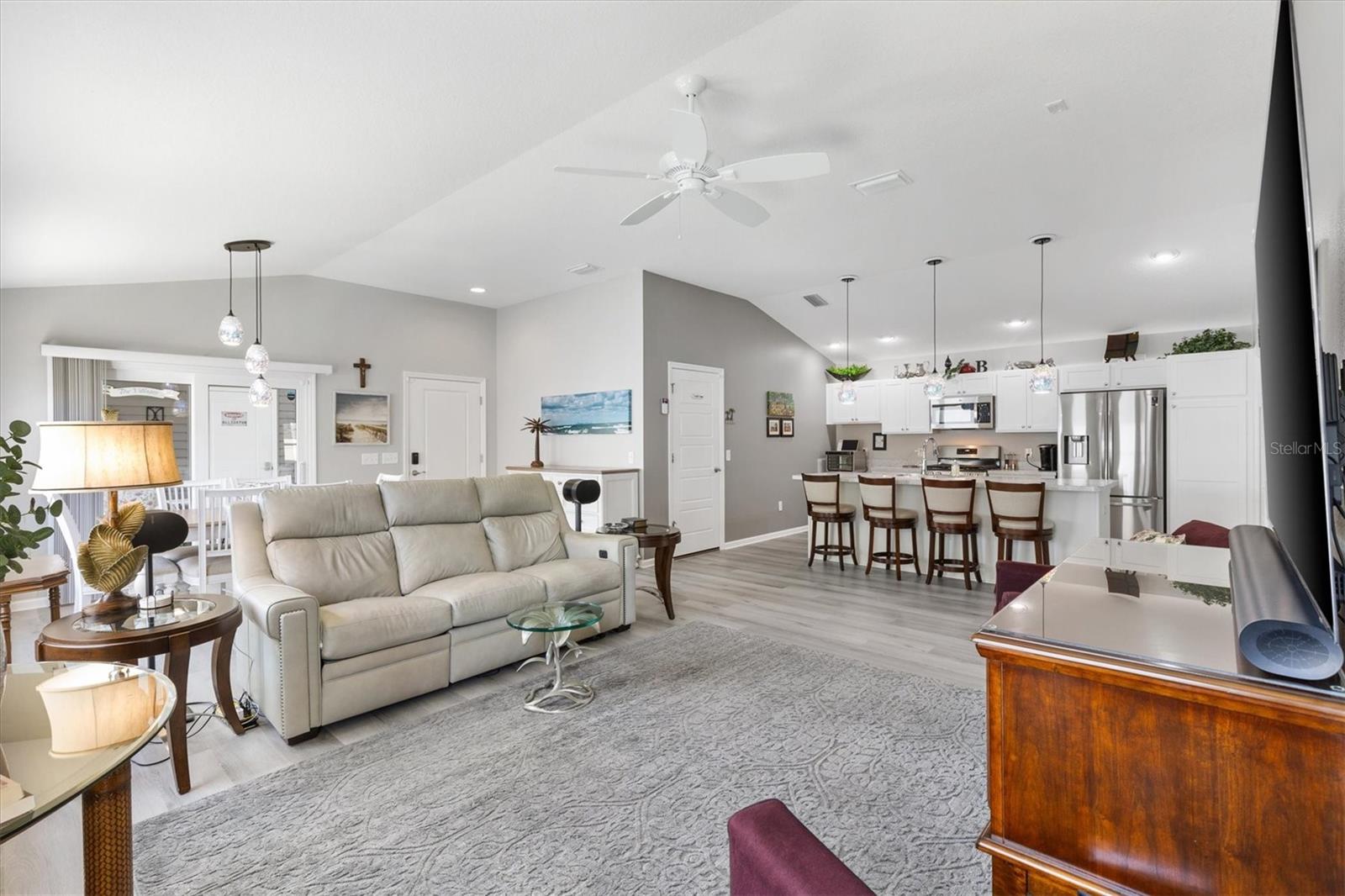 Pristine 2/2 Emerald Patio Villa. Swallowtail Villas in the Hammock at Fenney. Enjoy the screened front lanai with epoxy floors to relax after a day of activities. Then walk into your freshly painted open floor plan with luxury vinyl plank flooring throughout, top down bottom up black out shades on all the windows, upgraded lighting in the kitchen and dining rooms, ceiling fans in the living room and bedrooms. The kitchen is open to the living and dining room with a large island and breakfast bar. The kitchen boasts stainless steel appliances, 4 burner gas range with griddle, oversized Stainless Steel sink, pull out shelves, pantry closet, and desk. Inside laundry closet complete with washer and dryer and additional storage shelves is just off the kitchen. The master bedroom has an ensuite bath with shower, dual vanity, water closet, linen closet and a large walk in closet with added shelving. The guest bath has a pocket door and a shower tub combination. Garage and golf cart garage have epoxy floors and insulated doors. The garage has a Mitsubishi mini split dehumidifier AC system. Enjoy outdoor relaxing, grilling and dining patio, low maintenance landscaping, Nova Water Filtration System, Teeho Key Pad entry on all exterior doors, tankless hot water heater, bidet toilets in both bathrooms, high vaulted ceilings throughout, interior utility closet with additional shelving. Rain gutters around the house have been added. This home has a fire hydrant on the property giving you an insurance benefit. Located less than a quarter mile to the Hammock’s golf courses, and less than 1 mile to Fenney Recreation Center and Nature Trail for activities and swimming. Savor life in all The Villages and surrounding area have to provide. Be sure to watch our virtual tour of this wonderful home and schedule your appointment to see it today!