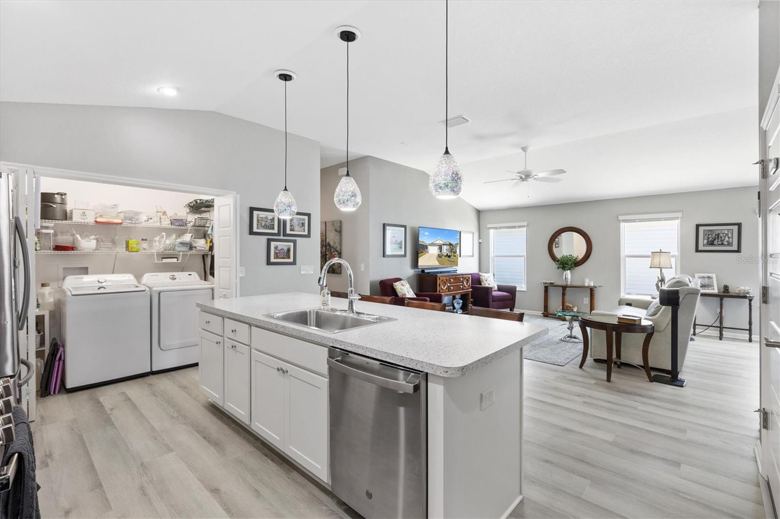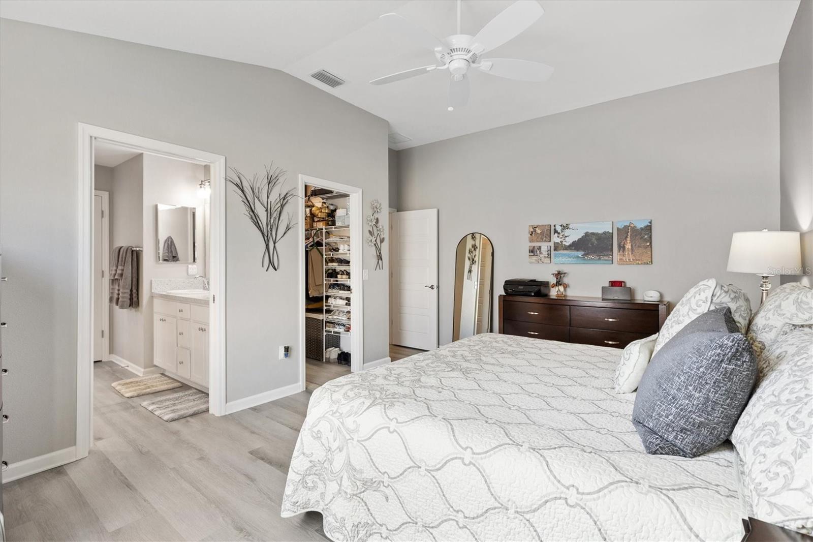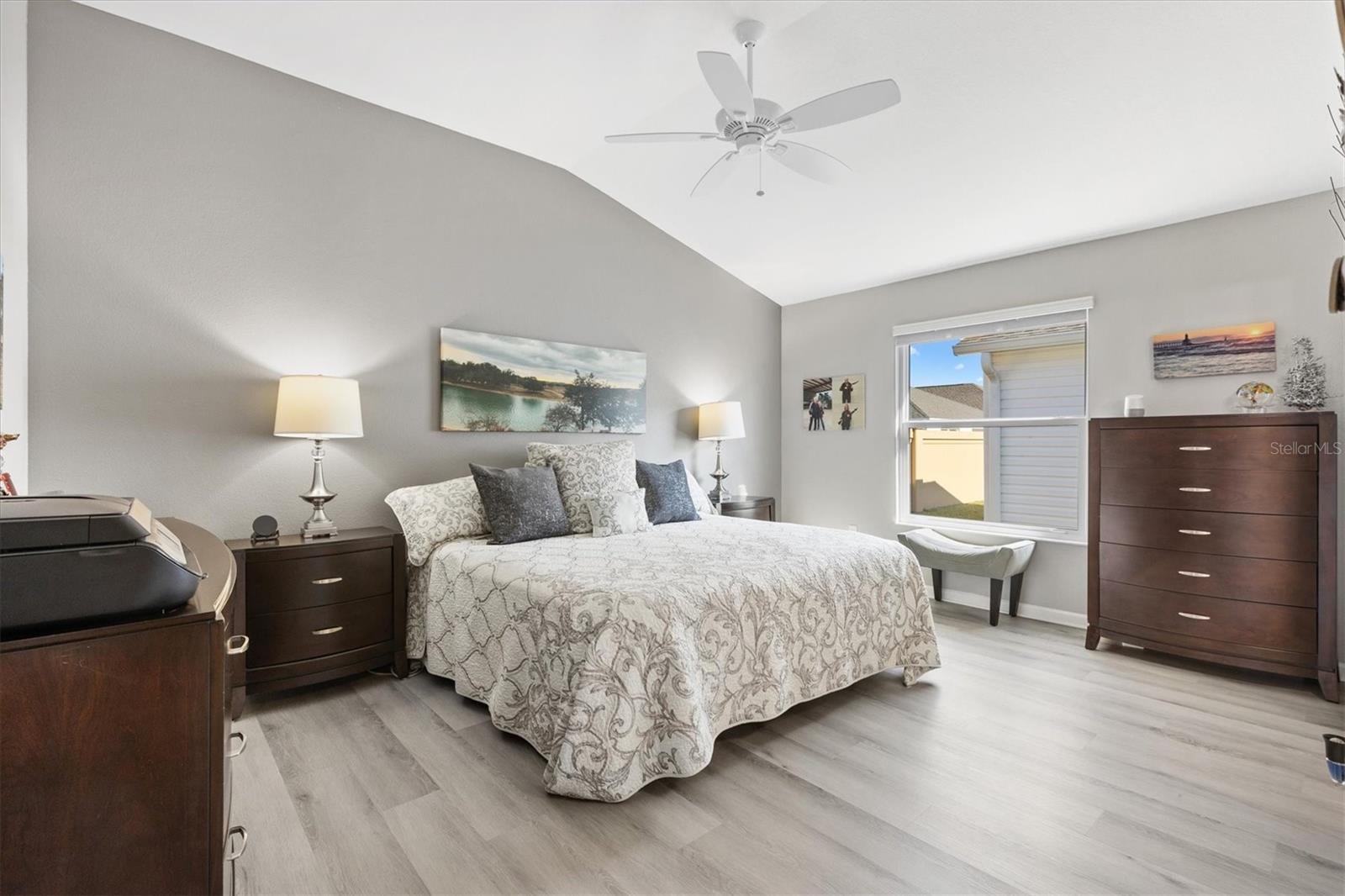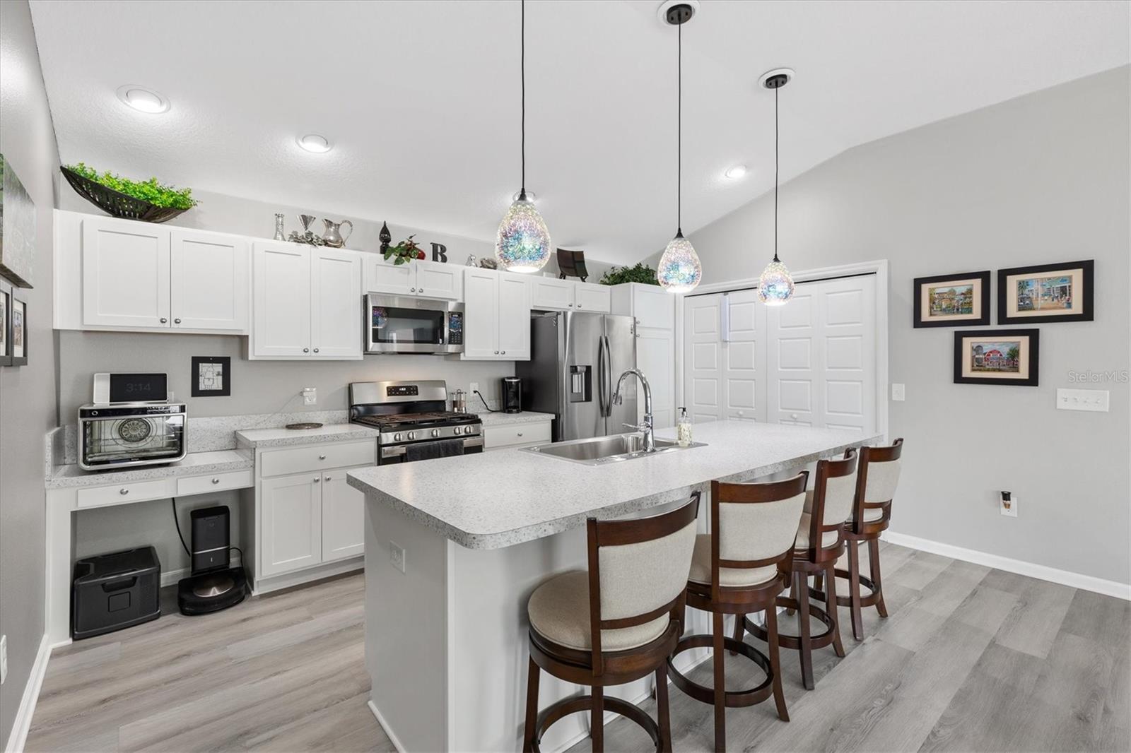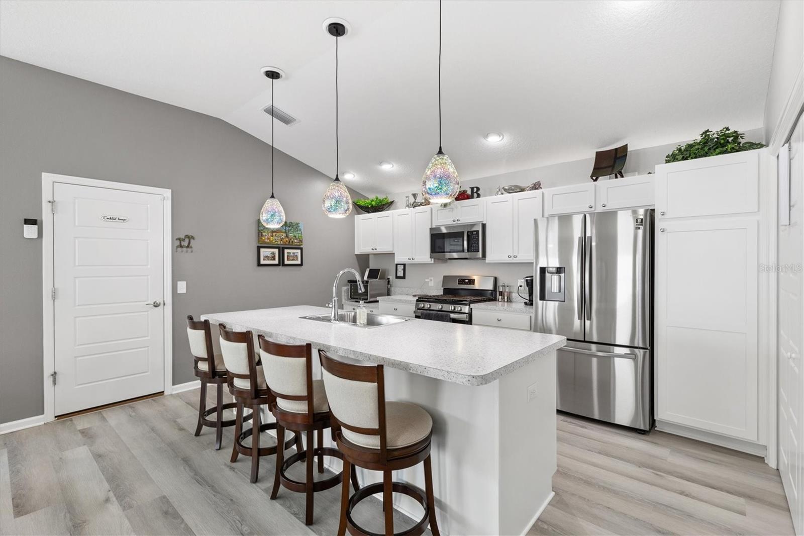 Pristine 2/2 Emerald Patio Villa. Swallowtail Villas in the Hammock at Fenney. Enjoy the screened front lanai with epoxy floors to relax after a day of activities. Then walk into your freshly painted open floor plan with luxury vinyl plank flooring throughout, top down bottom up black out shades on all the windows, upgraded lighting in the kitchen and dining rooms, ceiling fans in the living room and bedrooms. The kitchen is open to the living and dining room with a large island and breakfast bar. The kitchen boasts stainless steel appliances, 4 burner gas range with griddle, oversized Stainless Steel sink, pull out shelves, pantry closet, and desk. Inside laundry closet complete with washer and dryer and additional storage shelves is just off the kitchen. The master bedroom has an ensuite bath with shower, dual vanity, water closet, linen closet and a large walk in closet with added shelving. The guest bath has a pocket door and a shower tub combination. Garage and golf cart garage have epoxy floors and insulated doors. The garage has a Mitsubishi mini split dehumidifier AC system. Enjoy outdoor relaxing, grilling and dining patio, low maintenance landscaping, Nova Water Filtration System, Teeho Key Pad entry on all exterior doors, tankless hot water heater, bidet toilets in both bathrooms, high vaulted ceilings throughout, interior utility closet with additional shelving. Rain gutters around the house have been added. This home has a fire hydrant on the property giving you an insurance benefit. Located less than a quarter mile to the Hammock’s golf courses, and less than 1 mile to Fenney Recreation Center and Nature Trail for activities and swimming. Savor life in all The Villages and surrounding area have to provide. Be sure to watch our virtual tour of this wonderful home and schedule your appointment to see it today!