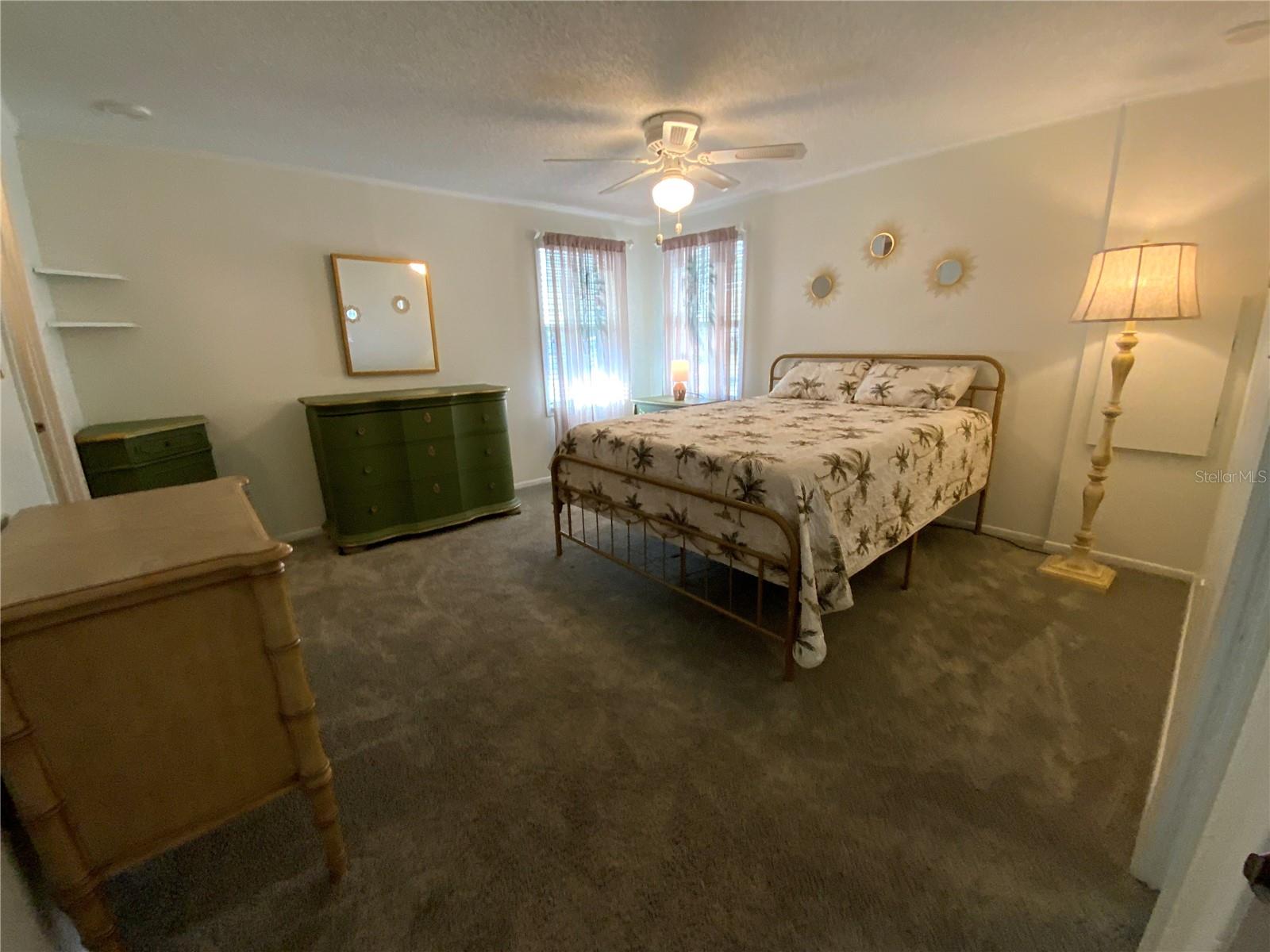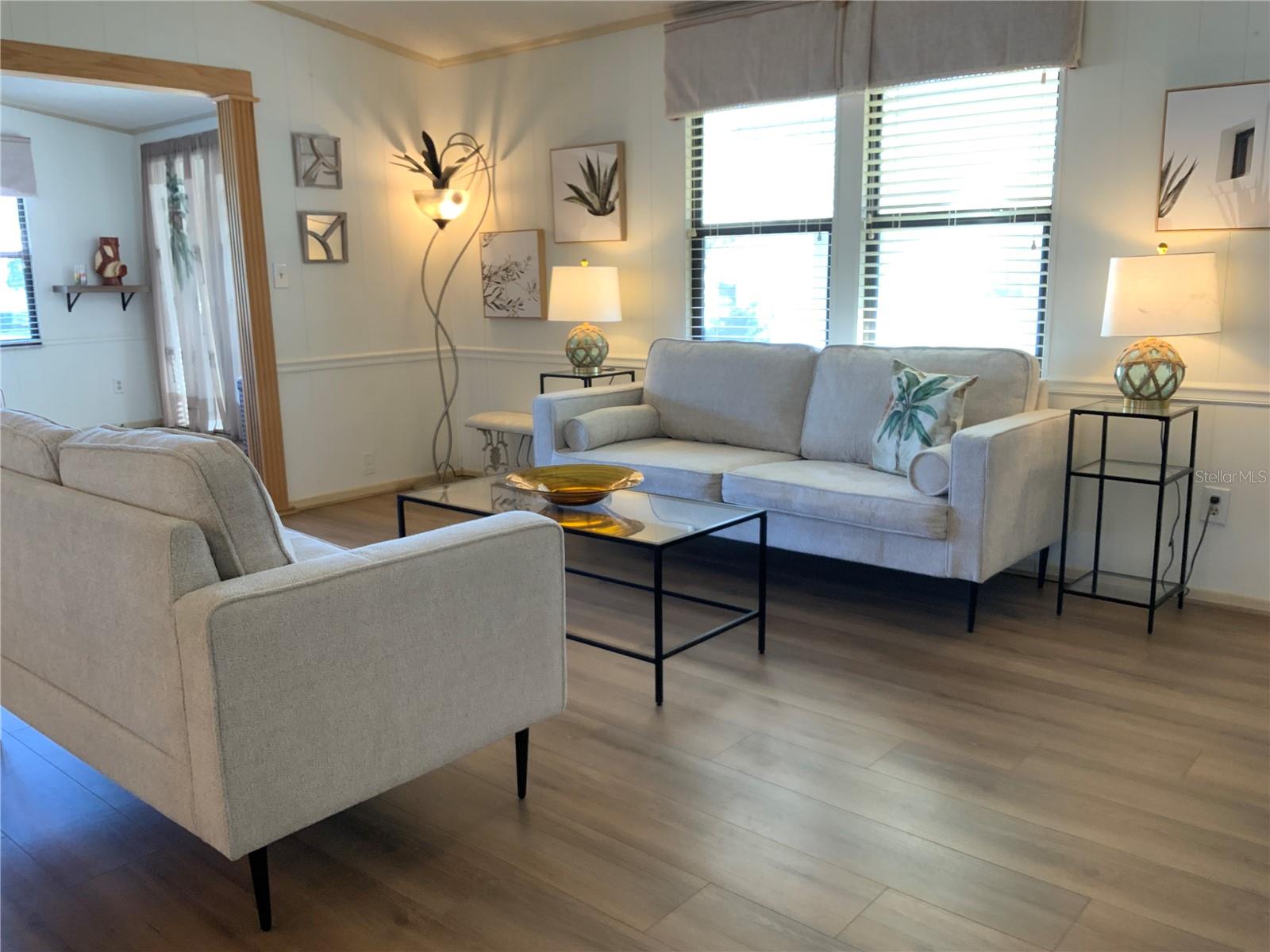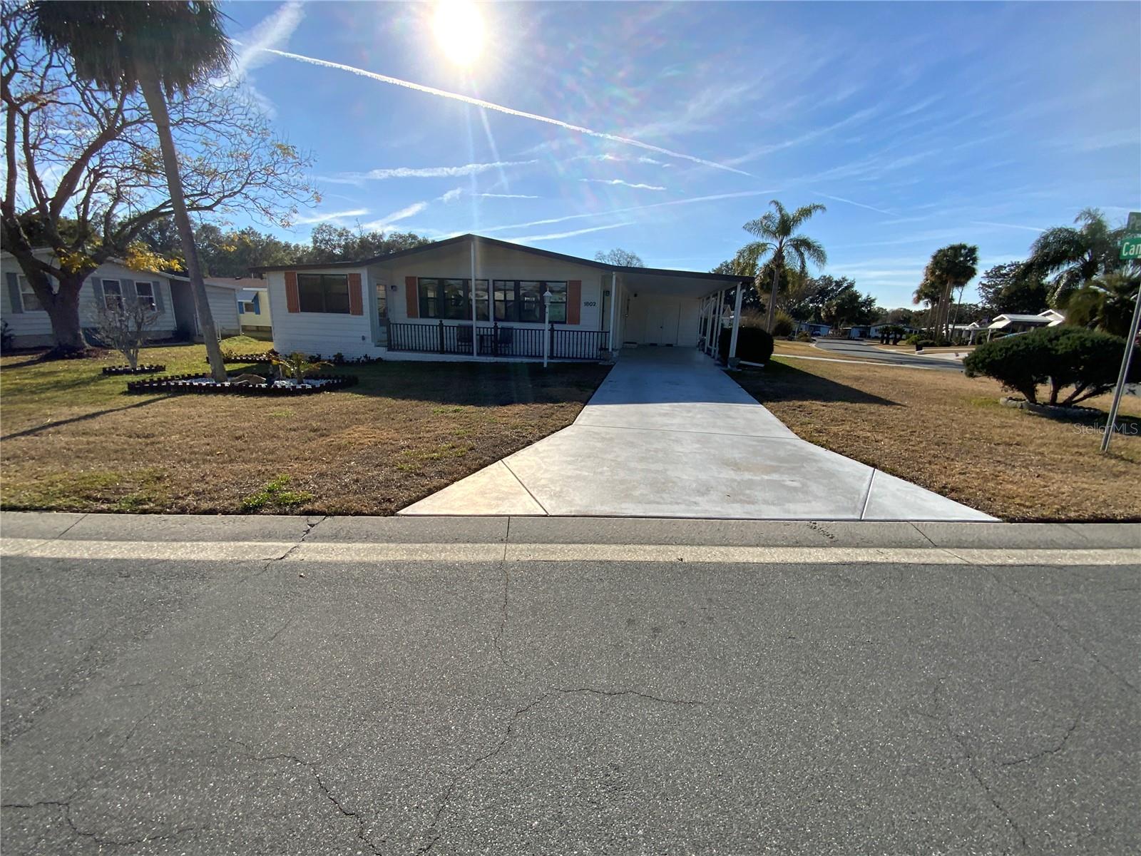 THE VILLAGES TURNKEY with no Bond. Beautiful and tasteful furnishing all remain. This home features A large Kitchen and an Extra large secondary Living area with wetbar. 3 bedrooms and 2 full baths. One bedroom has a private outside entrance and 2 closets. The home is on a corner lot and has 2 driveways. Plenty of room for parking. There is a storage room off the driveway that holds the washer and dryer and it has room for your golf cart. Home is located IN The Villages and is very close to shopping. Spanish Springs Square and Orange Blossom Country Club are very close by. Home has been Painted inside and out in 2024. New flooring installed in 2024 as well as new ceiling fans in 2024. The roof is 12 years old and the HVAC was serviced and had some parts replaced in 2024. Yard has been beautifully landscape has great curb appeal. Home is ready to occupy..seller request the bed coverings not convey but evertyhing else stays.