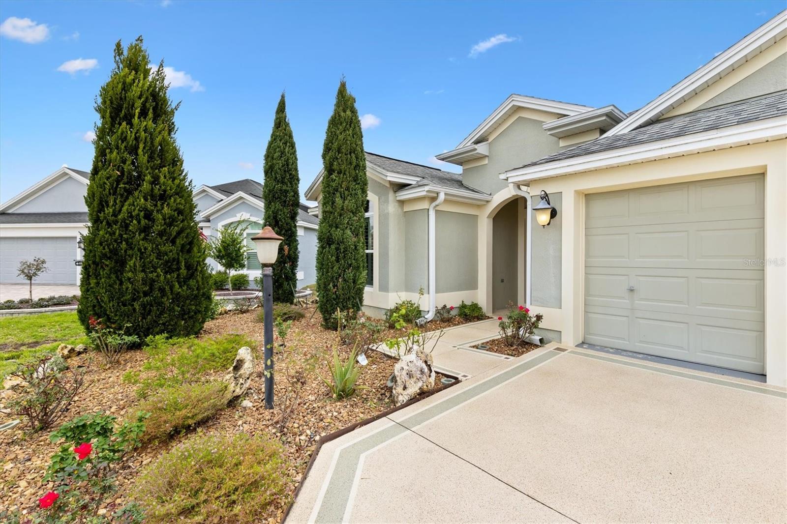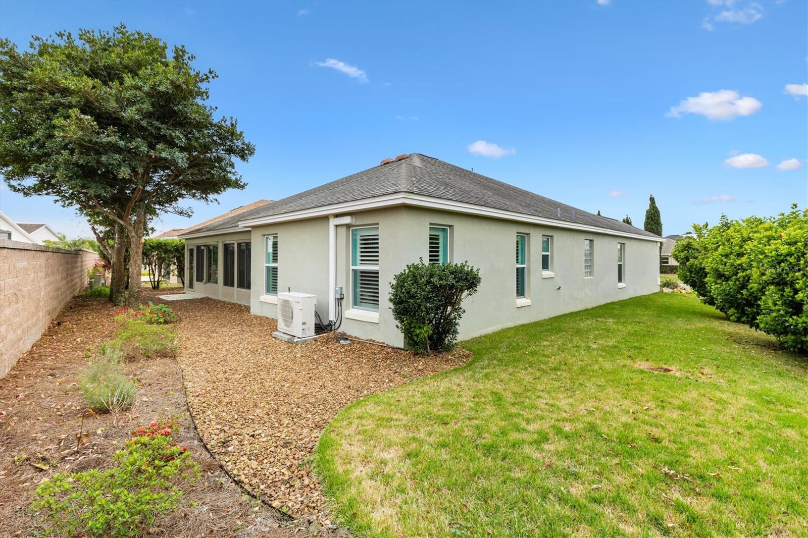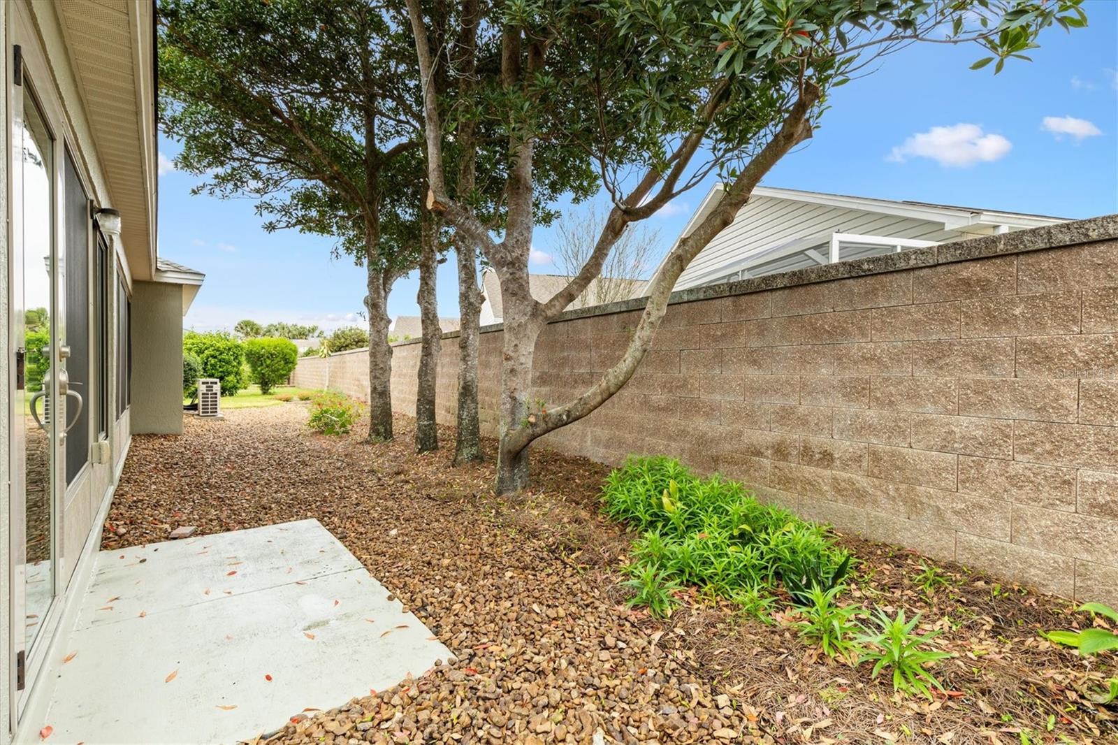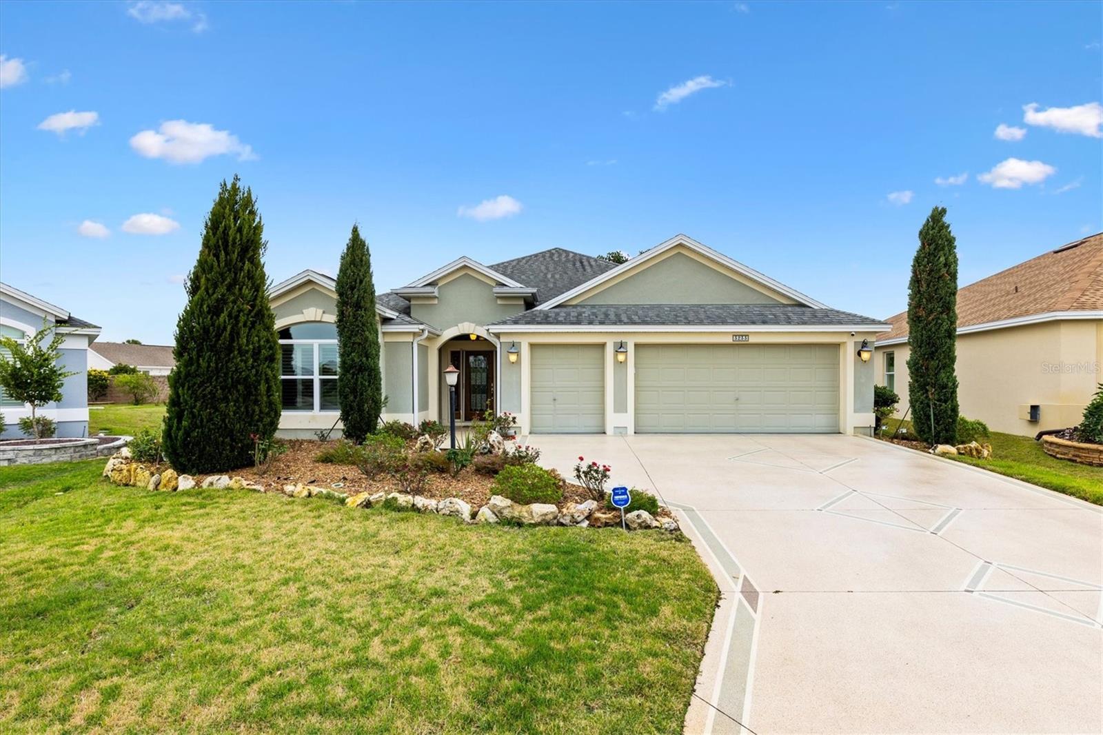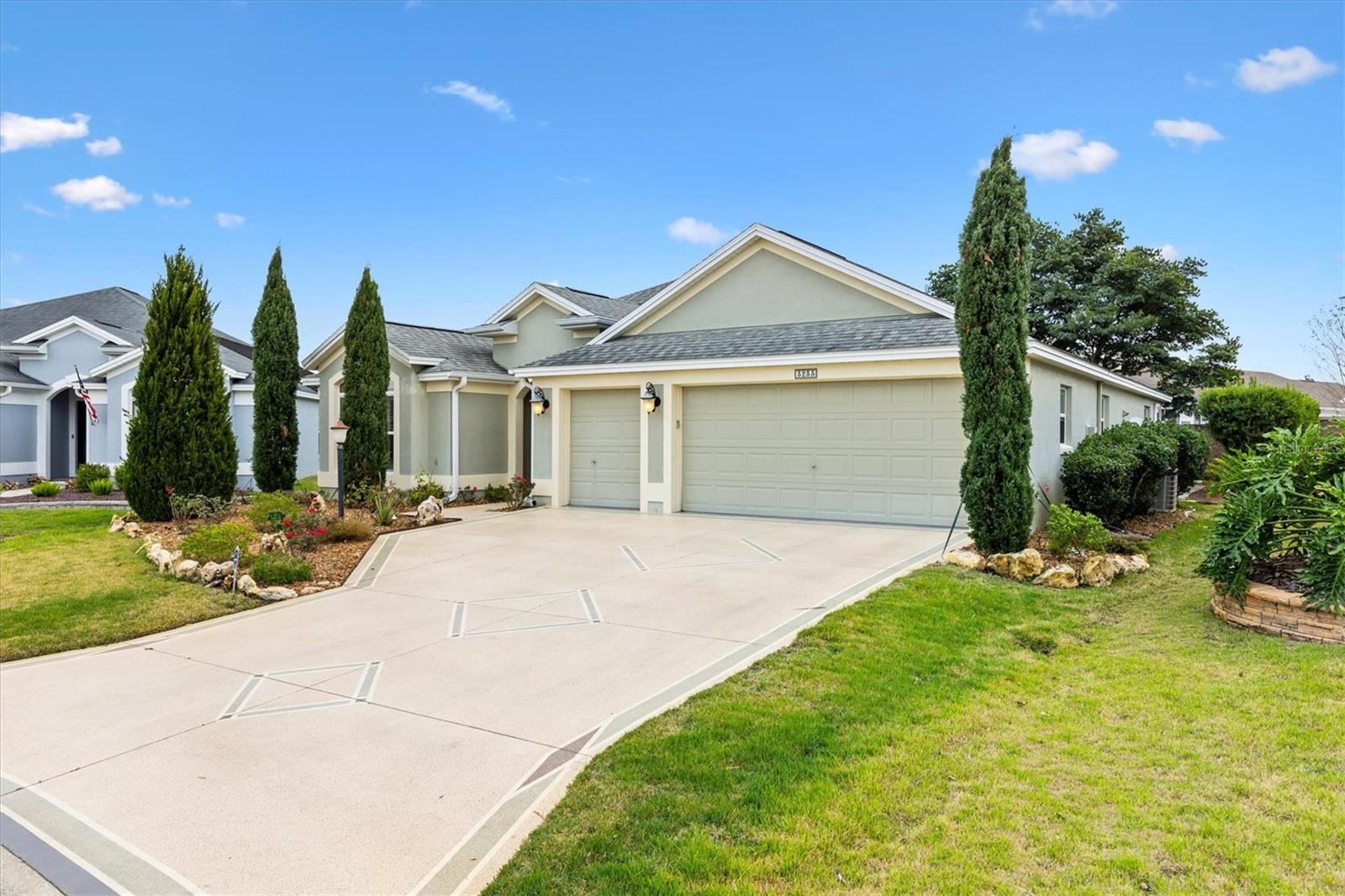 2-Car plus Golf Cart Garage with Privacy Wall. This turn-key 3-bedroom, 2-bathroom Iris floorplan with two-car garage and golf cart garage with privacy in the desirable Village of Charlotte is available to call home. A widened decorative driveway leads to the two-car garage plus golf cart garage, with privacy screens, adding convenience and curb appeal. Step through the covered entry and lead glass doors into a bright foyer, where the split floorplan ensures privacy between the guest and primary suites. To the left, two guest bedrooms provide comfortable accommodations—one featuring a bump-out with plank flooring, while the other also boasts plank floors, both guest rooms have closets. A nearby guest bath has a tiled tub/shower combo and is nestled away for privacy. The open-concept living area is highlighted by vaulted ceilings, creating an airy and inviting space. The kitchen is thoughtfully designed with granite countertops, stainless steel appliances, a decorative tile backsplash, and tile flooring that extends into the dinette and laundry room. Adjacent to the kitchen, the laundry room offers versatility, with space to add extra cabinets or an office nook. The primary suite is a private retreat with a tray ceiling and a mini-split temperature controller for personalized comfort. Enjoy the walk-in closet with a pocket door and closet organizers. The en-suite bath features dual vanities with a granite countertop, a separate water closet, an easy-care Roman shower, and a soaking tub for a spa-like experience. Decorative shutters throughout the home add a charming touch. Step into the enclosed lanai with a mini-split for an ideal space to relax and enjoy the Florida lifestyle year-round. The backyard features a privacy wall and shade, providing a peaceful outdoor escape. With a golf cart available separately, this home is waiting for you to call home. Enjoy The Villages, FL, lifestyle with abundant amenities for you to attend golfing, shopping, dining, and enjoy many entertainment choices, club meetings, medical services, and more, all accessible by a golf cart. (Most art and decor items do not convey.)
