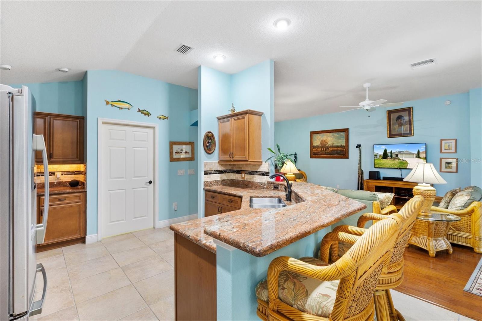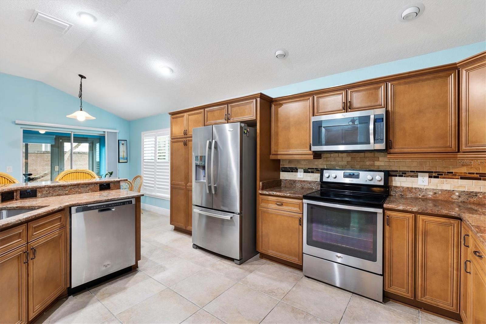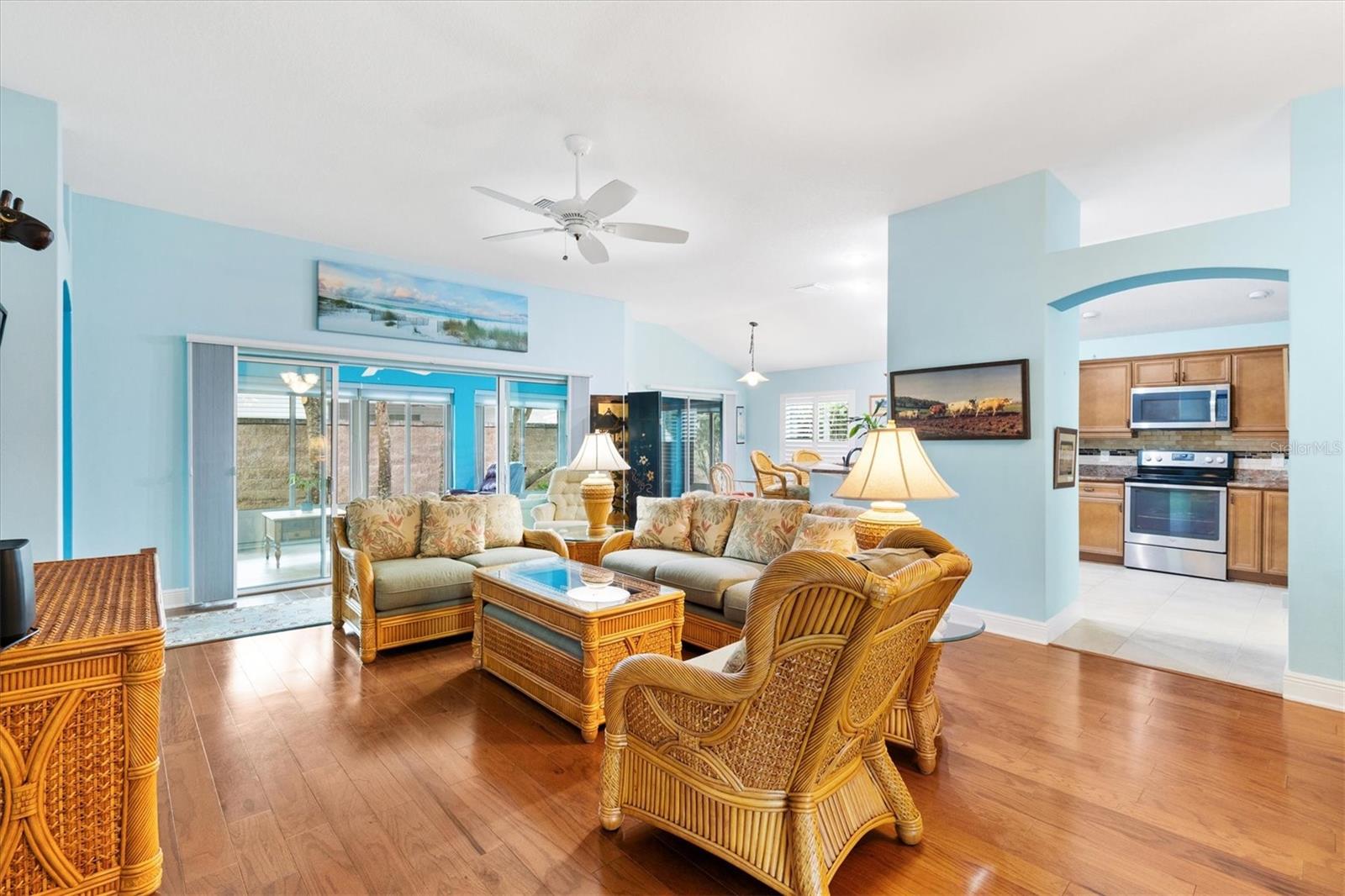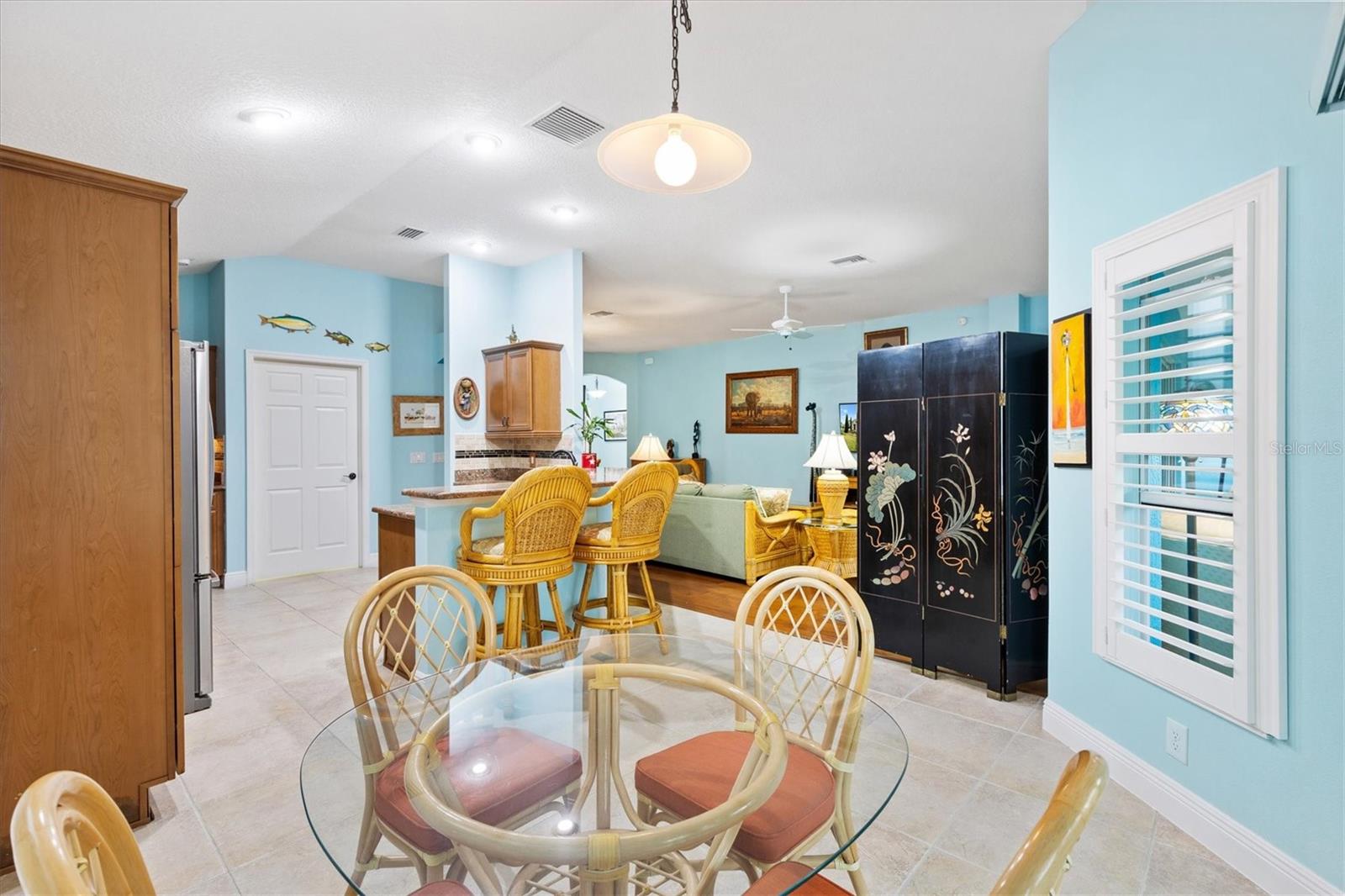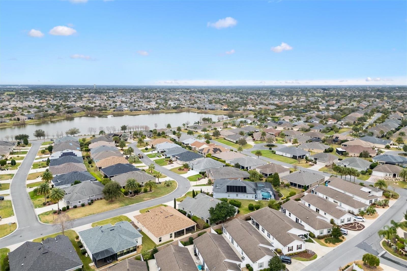 2-Car plus Golf Cart Garage with Privacy Wall. This turn-key 3-bedroom, 2-bathroom Iris floorplan with two-car garage and golf cart garage with privacy in the desirable Village of Charlotte is available to call home. A widened decorative driveway leads to the two-car garage plus golf cart garage, with privacy screens, adding convenience and curb appeal. Step through the covered entry and lead glass doors into a bright foyer, where the split floorplan ensures privacy between the guest and primary suites. To the left, two guest bedrooms provide comfortable accommodations—one featuring a bump-out with plank flooring, while the other also boasts plank floors, both guest rooms have closets. A nearby guest bath has a tiled tub/shower combo and is nestled away for privacy. The open-concept living area is highlighted by vaulted ceilings, creating an airy and inviting space. The kitchen is thoughtfully designed with granite countertops, stainless steel appliances, a decorative tile backsplash, and tile flooring that extends into the dinette and laundry room. Adjacent to the kitchen, the laundry room offers versatility, with space to add extra cabinets or an office nook. The primary suite is a private retreat with a tray ceiling and a mini-split temperature controller for personalized comfort. Enjoy the walk-in closet with a pocket door and closet organizers. The en-suite bath features dual vanities with a granite countertop, a separate water closet, an easy-care Roman shower, and a soaking tub for a spa-like experience. Decorative shutters throughout the home add a charming touch. Step into the enclosed lanai with a mini-split for an ideal space to relax and enjoy the Florida lifestyle year-round. The backyard features a privacy wall and shade, providing a peaceful outdoor escape. With a golf cart available separately, this home is waiting for you to call home. Enjoy The Villages, FL, lifestyle with abundant amenities for you to attend golfing, shopping, dining, and enjoy many entertainment choices, club meetings, medical services, and more, all accessible by a golf cart. (Most art and decor items do not convey.)