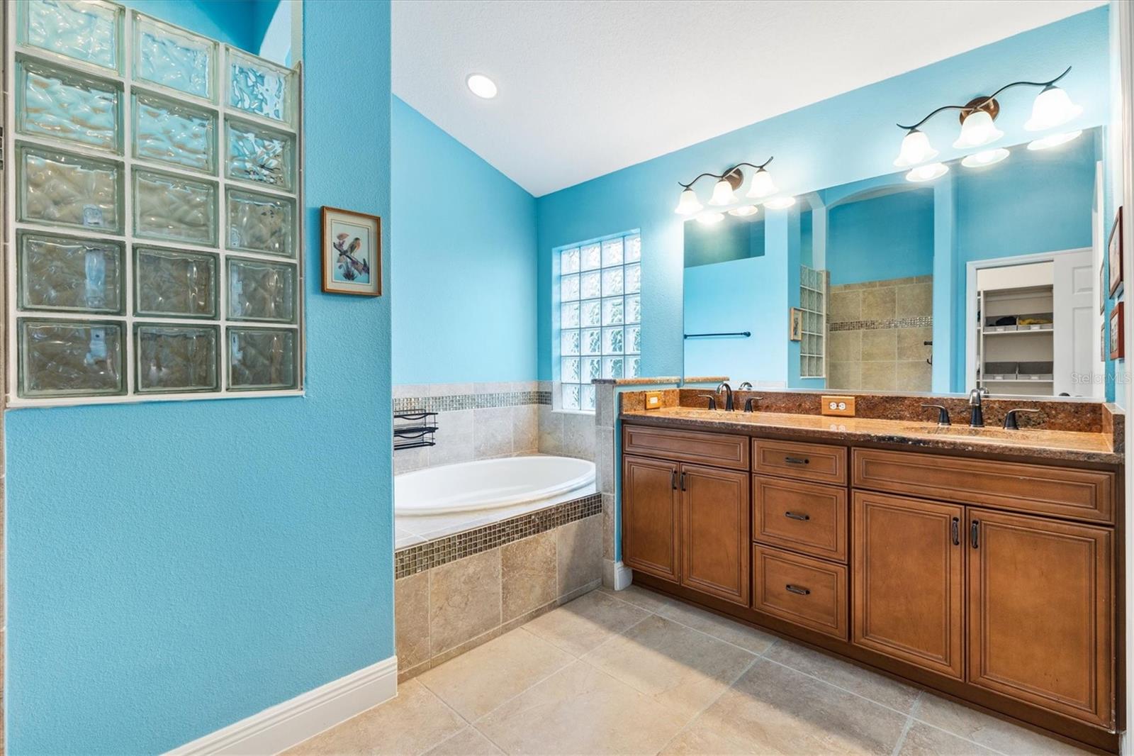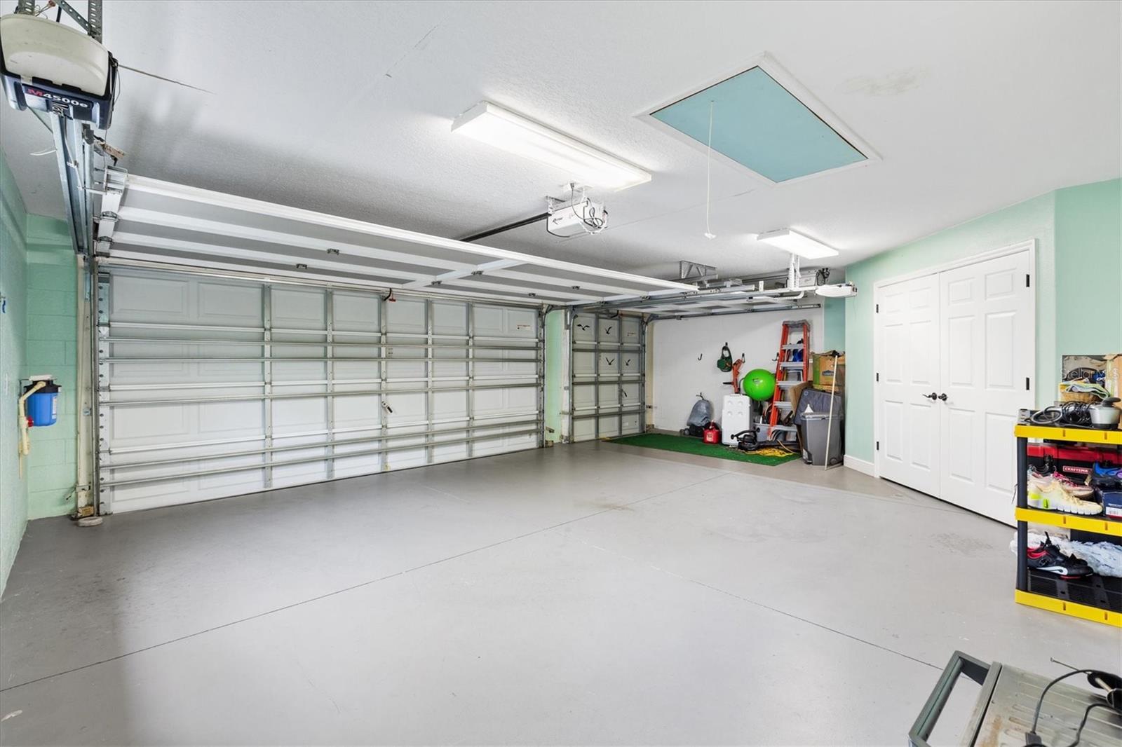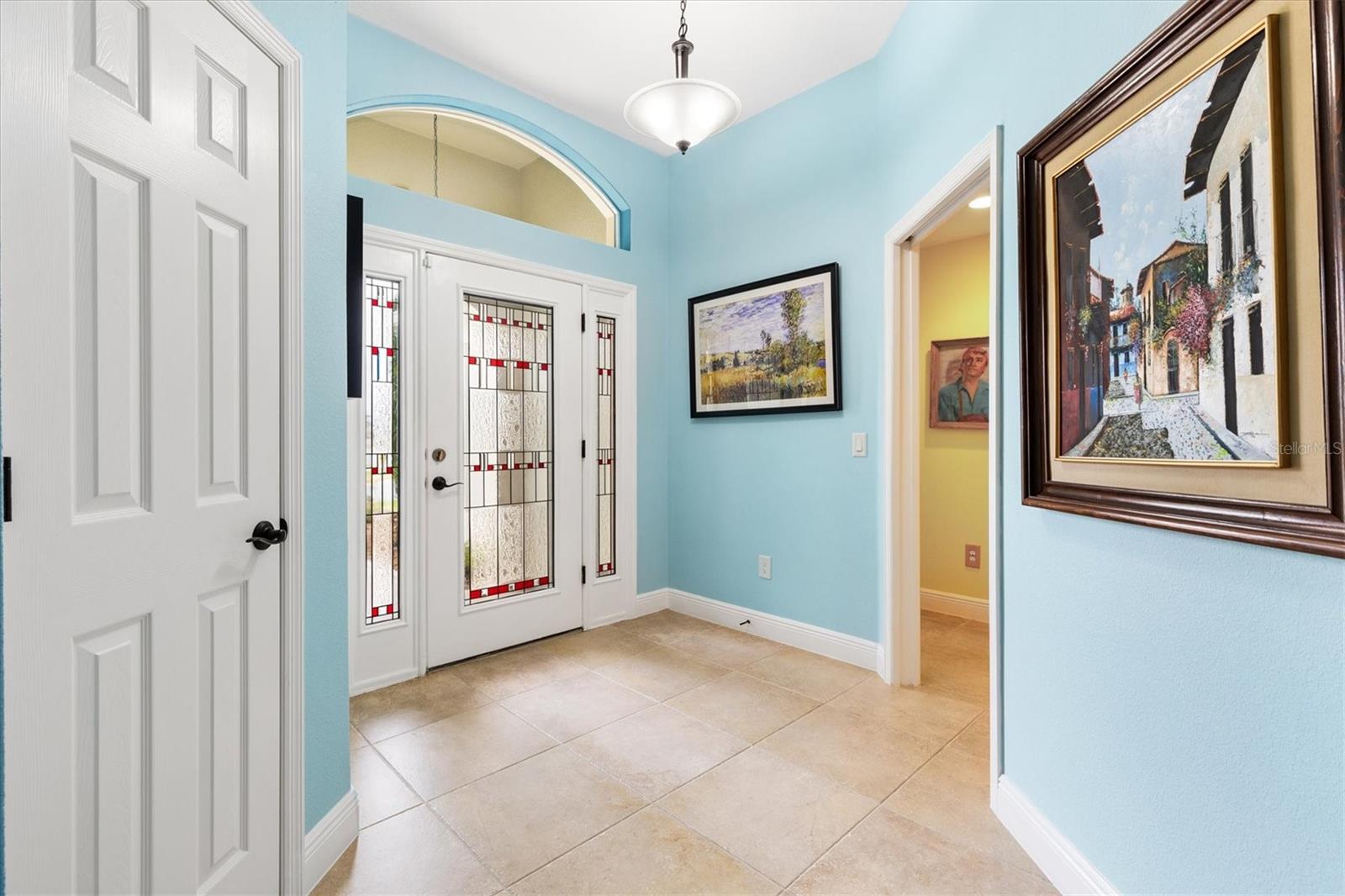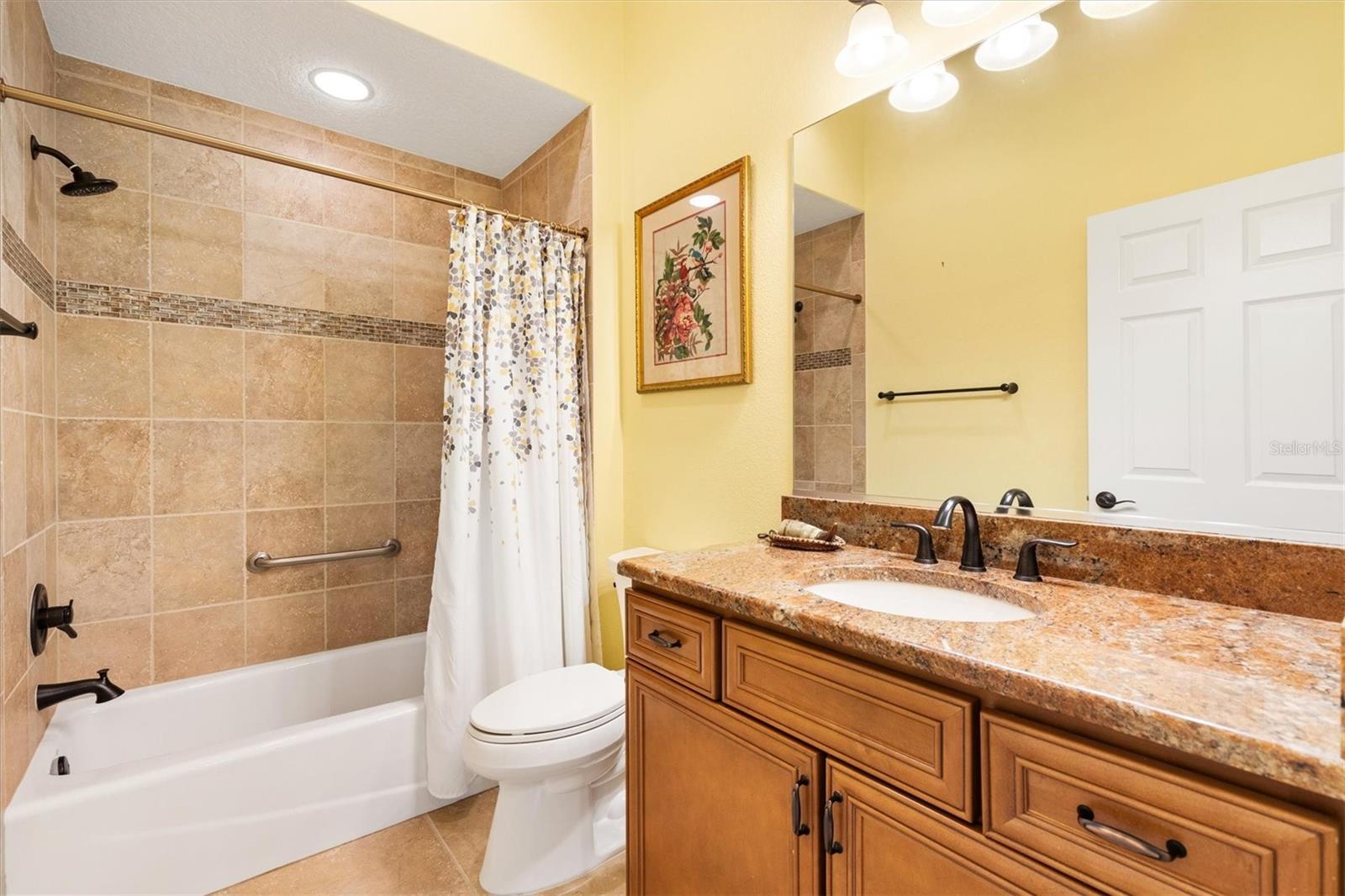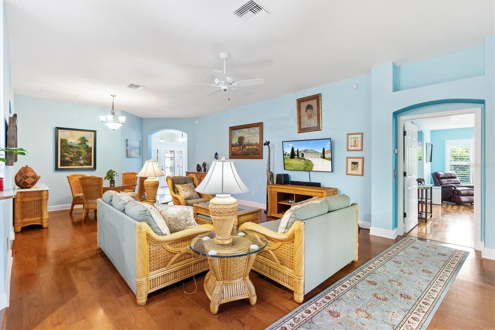 2-Car plus Golf Cart Garage with Privacy Wall. This turn-key 3-bedroom, 2-bathroom Iris floorplan with two-car garage and golf cart garage with privacy in the desirable Village of Charlotte is available to call home. A widened decorative driveway leads to the two-car garage plus golf cart garage, with privacy screens, adding convenience and curb appeal. Step through the covered entry and lead glass doors into a bright foyer, where the split floorplan ensures privacy between the guest and primary suites. To the left, two guest bedrooms provide comfortable accommodations—one featuring a bump-out with plank flooring, while the other also boasts plank floors, both guest rooms have closets. A nearby guest bath has a tiled tub/shower combo and is nestled away for privacy. The open-concept living area is highlighted by vaulted ceilings, creating an airy and inviting space. The kitchen is thoughtfully designed with granite countertops, stainless steel appliances, a decorative tile backsplash, and tile flooring that extends into the dinette and laundry room. Adjacent to the kitchen, the laundry room offers versatility, with space to add extra cabinets or an office nook. The primary suite is a private retreat with a tray ceiling and a mini-split temperature controller for personalized comfort. Enjoy the walk-in closet with a pocket door and closet organizers. The en-suite bath features dual vanities with a granite countertop, a separate water closet, an easy-care Roman shower, and a soaking tub for a spa-like experience. Decorative shutters throughout the home add a charming touch. Step into the enclosed lanai with a mini-split for an ideal space to relax and enjoy the Florida lifestyle year-round. The backyard features a privacy wall and shade, providing a peaceful outdoor escape. With a golf cart available separately, this home is waiting for you to call home. Enjoy The Villages, FL, lifestyle with abundant amenities for you to attend golfing, shopping, dining, and enjoy many entertainment choices, club meetings, medical services, and more, all accessible by a golf cart. (Most art and decor items do not convey.)