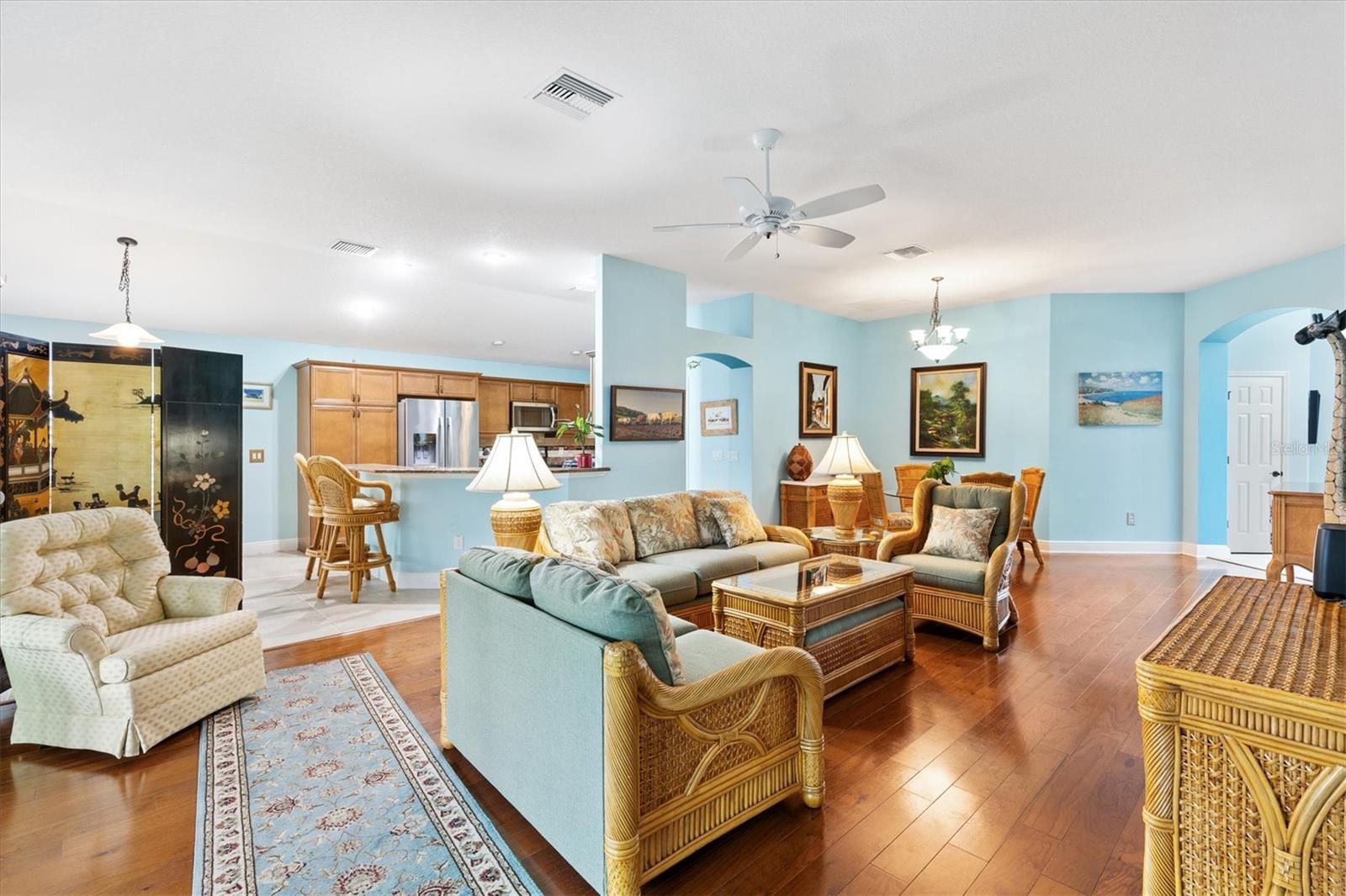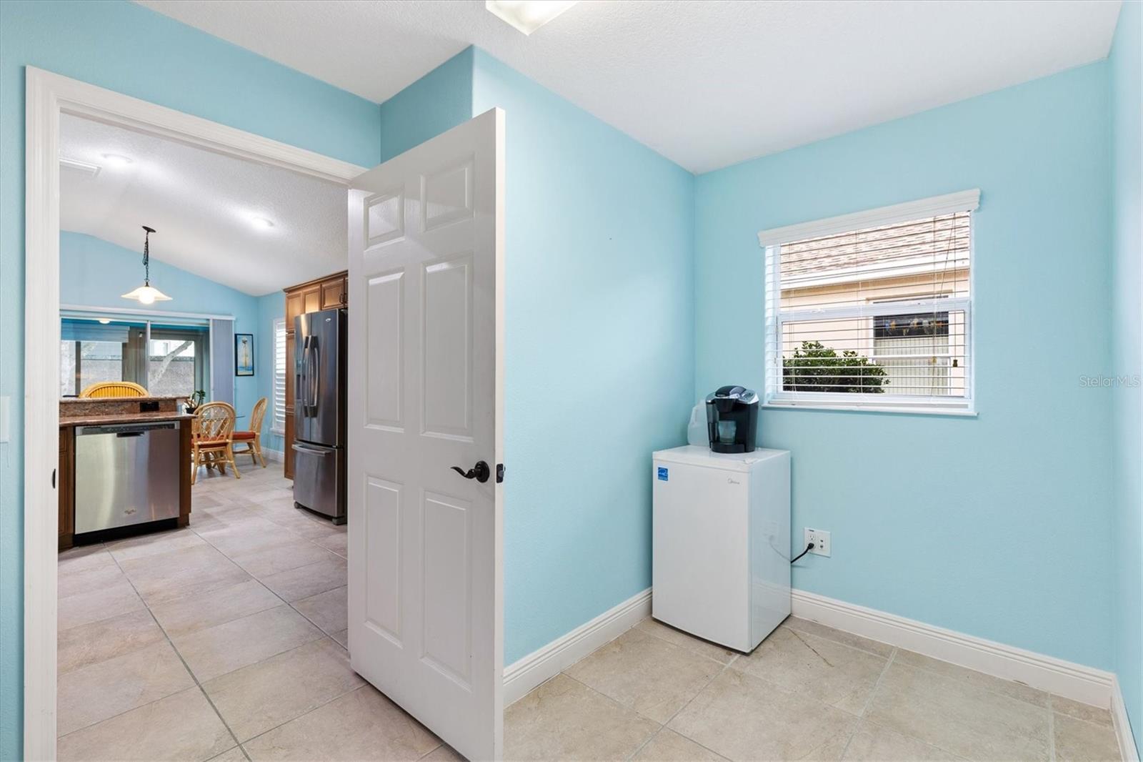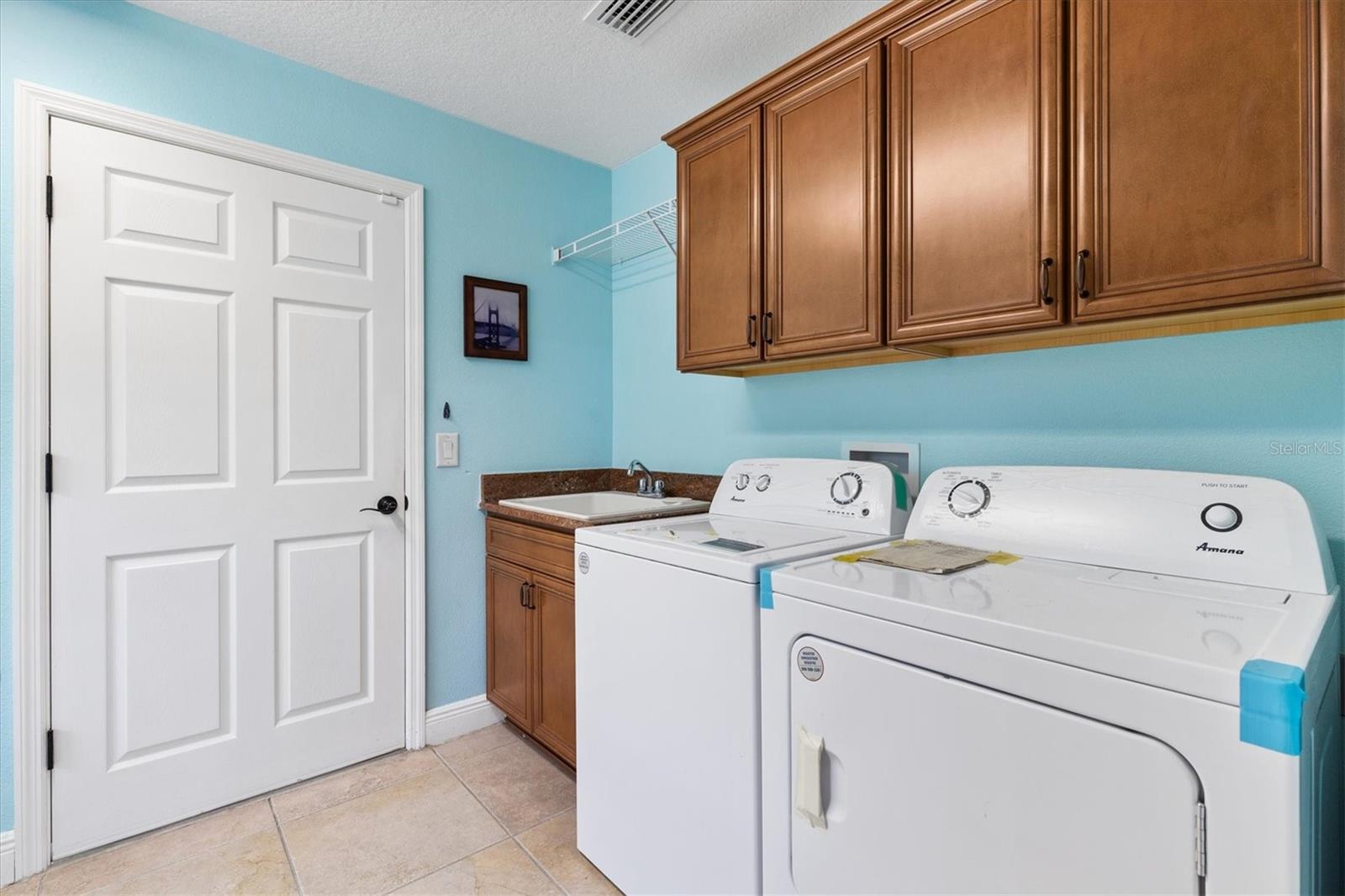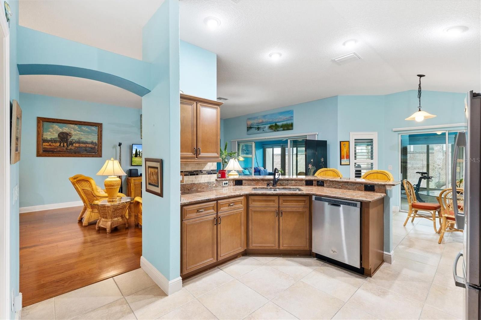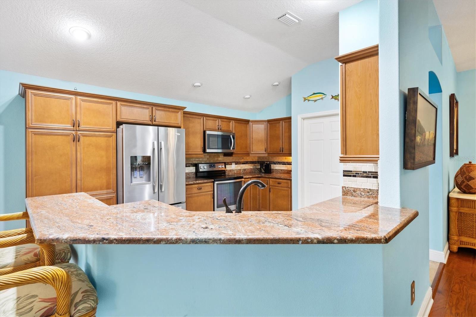 2-Car plus Golf Cart Garage with Privacy Wall. This turn-key 3-bedroom, 2-bathroom Iris floorplan with two-car garage and golf cart garage with privacy in the desirable Village of Charlotte is available to call home. A widened decorative driveway leads to the two-car garage plus golf cart garage, with privacy screens, adding convenience and curb appeal. Step through the covered entry and lead glass doors into a bright foyer, where the split floorplan ensures privacy between the guest and primary suites. To the left, two guest bedrooms provide comfortable accommodations—one featuring a bump-out with plank flooring, while the other also boasts plank floors, both guest rooms have closets. A nearby guest bath has a tiled tub/shower combo and is nestled away for privacy. The open-concept living area is highlighted by vaulted ceilings, creating an airy and inviting space. The kitchen is thoughtfully designed with granite countertops, stainless steel appliances, a decorative tile backsplash, and tile flooring that extends into the dinette and laundry room. Adjacent to the kitchen, the laundry room offers versatility, with space to add extra cabinets or an office nook. The primary suite is a private retreat with a tray ceiling and a mini-split temperature controller for personalized comfort. Enjoy the walk-in closet with a pocket door and closet organizers. The en-suite bath features dual vanities with a granite countertop, a separate water closet, an easy-care Roman shower, and a soaking tub for a spa-like experience. Decorative shutters throughout the home add a charming touch. Step into the enclosed lanai with a mini-split for an ideal space to relax and enjoy the Florida lifestyle year-round. The backyard features a privacy wall and shade, providing a peaceful outdoor escape. With a golf cart available separately, this home is waiting for you to call home. Enjoy The Villages, FL, lifestyle with abundant amenities for you to attend golfing, shopping, dining, and enjoy many entertainment choices, club meetings, medical services, and more, all accessible by a golf cart. (Most art and decor items do not convey.)