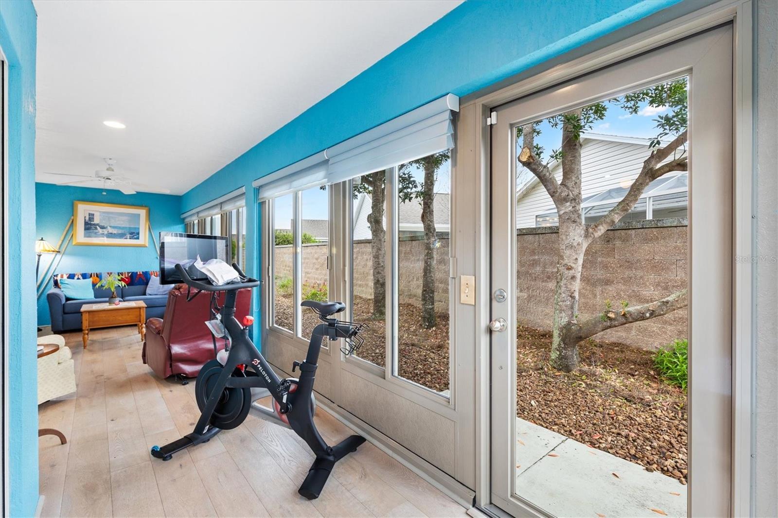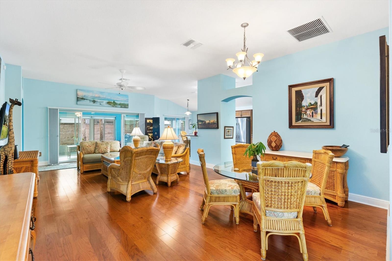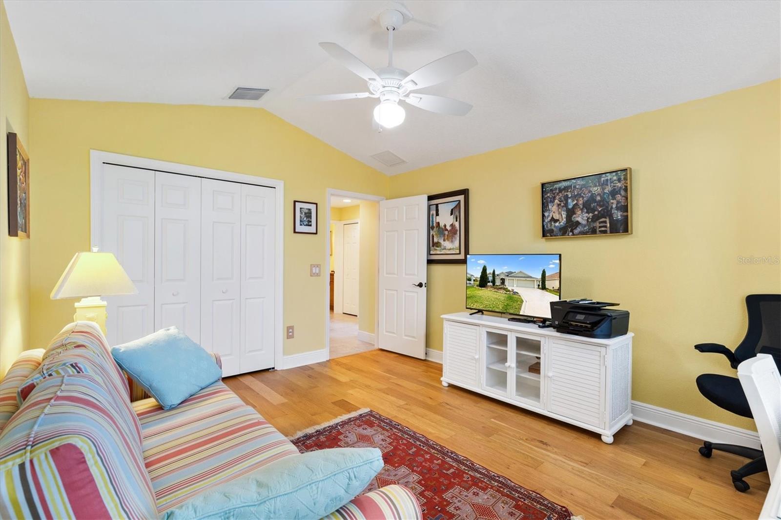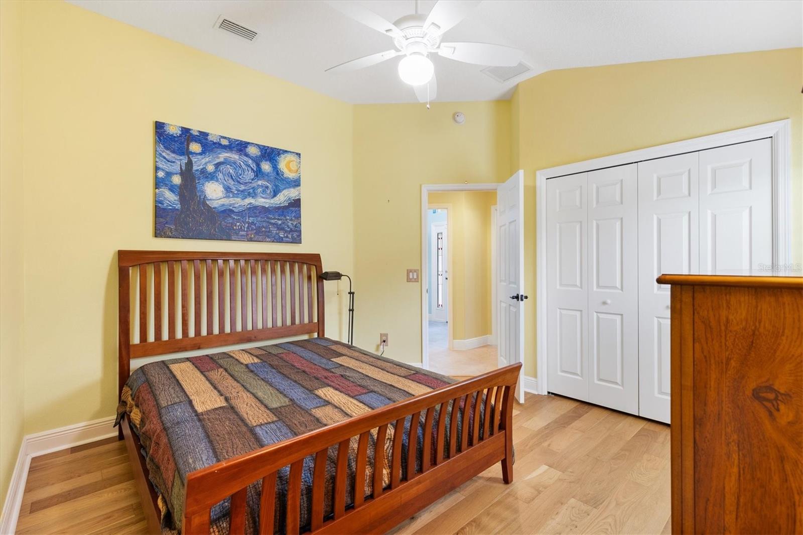 2-Car plus Golf Cart Garage with Privacy Wall. This turn-key 3-bedroom, 2-bathroom Iris floorplan with two-car garage and golf cart garage with privacy in the desirable Village of Charlotte is available to call home. A widened decorative driveway leads to the two-car garage plus golf cart garage, with privacy screens, adding convenience and curb appeal. Step through the covered entry and lead glass doors into a bright foyer, where the split floorplan ensures privacy between the guest and primary suites. To the left, two guest bedrooms provide comfortable accommodations—one featuring a bump-out with plank flooring, while the other also boasts plank floors, both guest rooms have closets. A nearby guest bath has a tiled tub/shower combo and is nestled away for privacy. The open-concept living area is highlighted by vaulted ceilings, creating an airy and inviting space. The kitchen is thoughtfully designed with granite countertops, stainless steel appliances, a decorative tile backsplash, and tile flooring that extends into the dinette and laundry room. Adjacent to the kitchen, the laundry room offers versatility, with space to add extra cabinets or an office nook. The primary suite is a private retreat with a tray ceiling and a mini-split temperature controller for personalized comfort. Enjoy the walk-in closet with a pocket door and closet organizers. The en-suite bath features dual vanities with a granite countertop, a separate water closet, an easy-care Roman shower, and a soaking tub for a spa-like experience. Decorative shutters throughout the home add a charming touch. Step into the enclosed lanai with a mini-split for an ideal space to relax and enjoy the Florida lifestyle year-round. The backyard features a privacy wall and shade, providing a peaceful outdoor escape. With a golf cart available separately, this home is waiting for you to call home. Enjoy The Villages, FL, lifestyle with abundant amenities for you to attend golfing, shopping, dining, and enjoy many entertainment choices, club meetings, medical services, and more, all accessible by a golf cart. (Most art and decor items do not convey.)