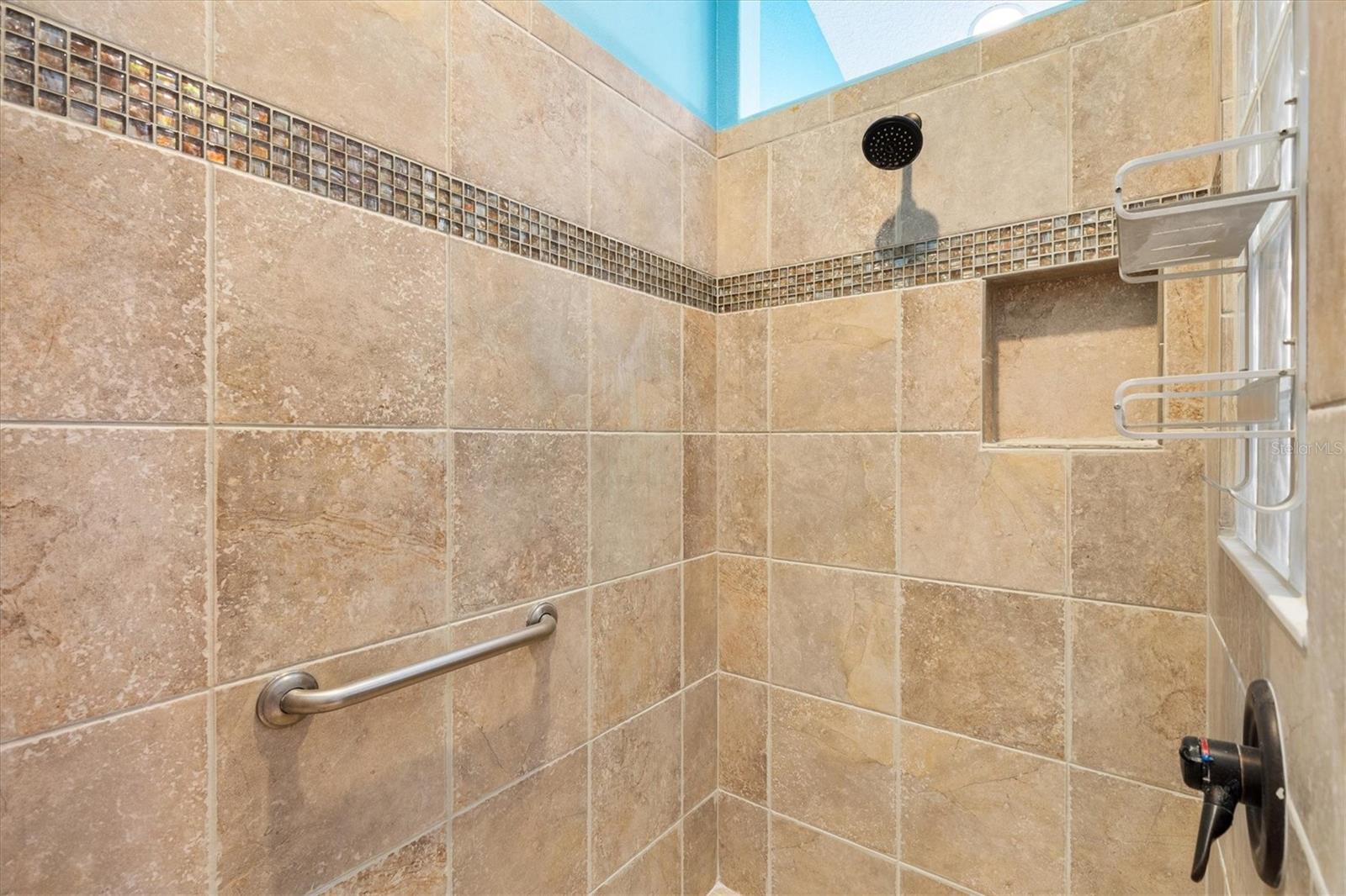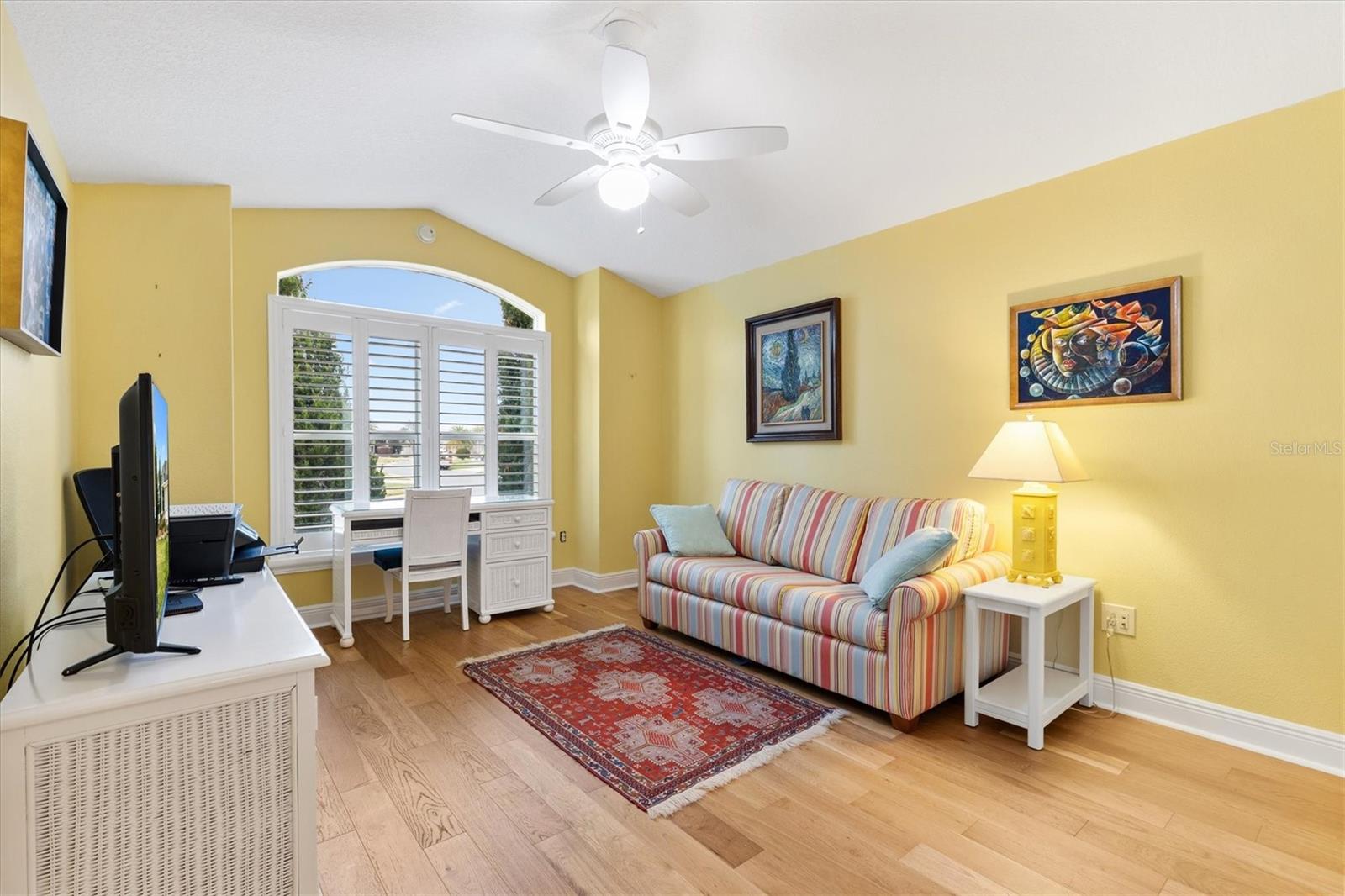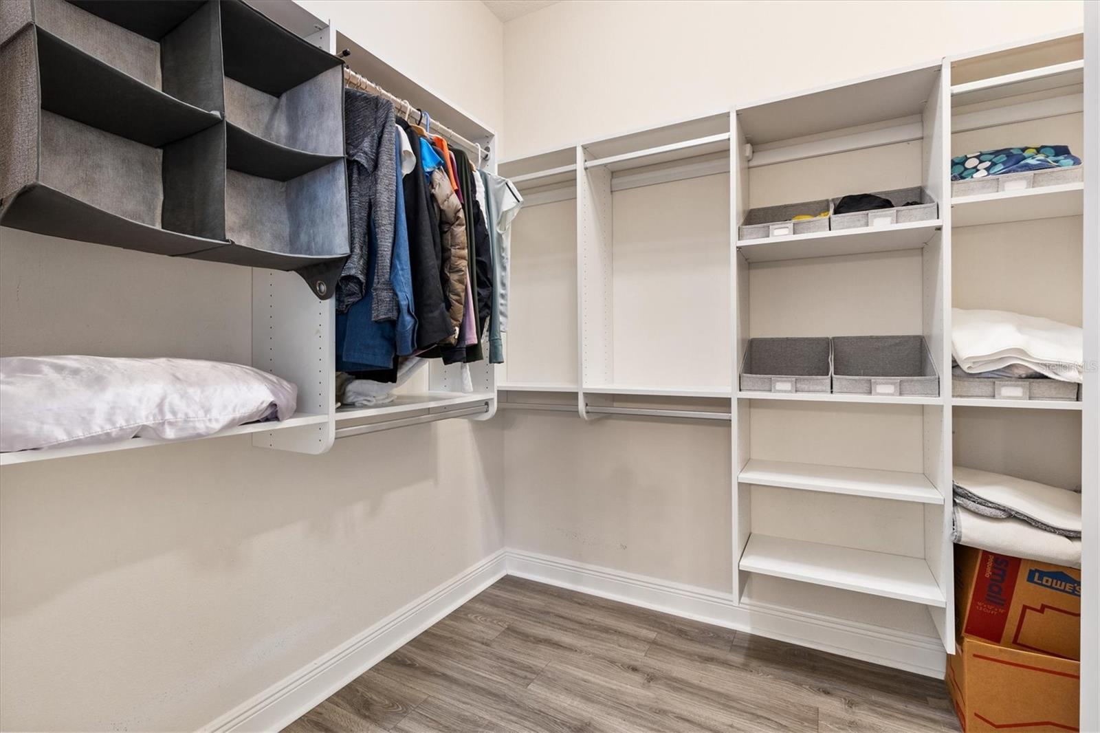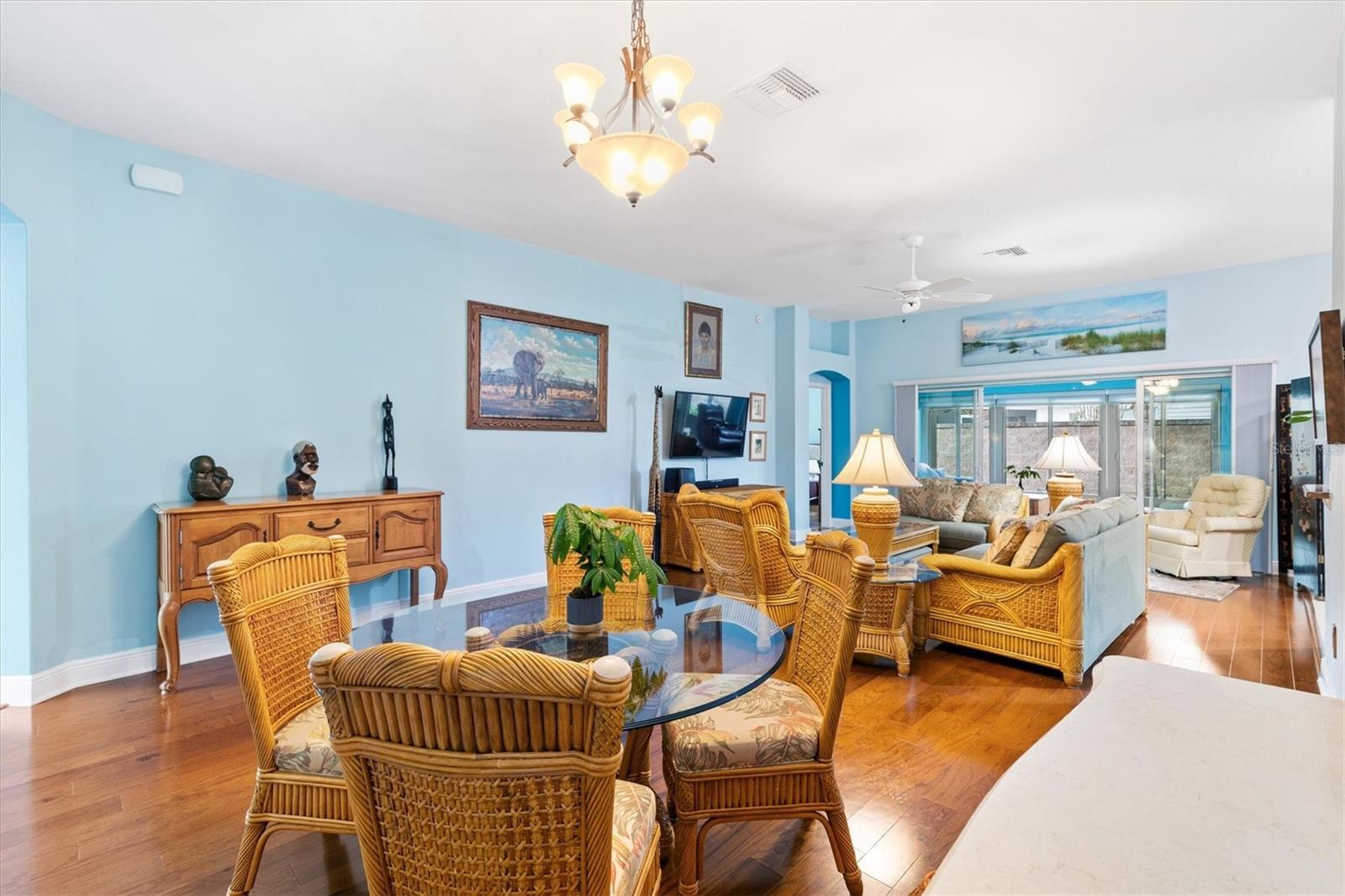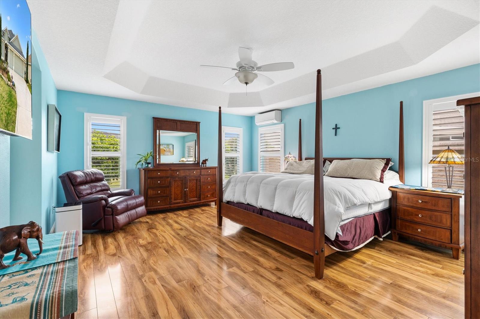 2-Car plus Golf Cart Garage with Privacy Wall. This turn-key 3-bedroom, 2-bathroom Iris floorplan with two-car garage and golf cart garage with privacy in the desirable Village of Charlotte is available to call home. A widened decorative driveway leads to the two-car garage plus golf cart garage, with privacy screens, adding convenience and curb appeal. Step through the covered entry and lead glass doors into a bright foyer, where the split floorplan ensures privacy between the guest and primary suites. To the left, two guest bedrooms provide comfortable accommodations—one featuring a bump-out with plank flooring, while the other also boasts plank floors, both guest rooms have closets. A nearby guest bath has a tiled tub/shower combo and is nestled away for privacy. The open-concept living area is highlighted by vaulted ceilings, creating an airy and inviting space. The kitchen is thoughtfully designed with granite countertops, stainless steel appliances, a decorative tile backsplash, and tile flooring that extends into the dinette and laundry room. Adjacent to the kitchen, the laundry room offers versatility, with space to add extra cabinets or an office nook. The primary suite is a private retreat with a tray ceiling and a mini-split temperature controller for personalized comfort. Enjoy the walk-in closet with a pocket door and closet organizers. The en-suite bath features dual vanities with a granite countertop, a separate water closet, an easy-care Roman shower, and a soaking tub for a spa-like experience. Decorative shutters throughout the home add a charming touch. Step into the enclosed lanai with a mini-split for an ideal space to relax and enjoy the Florida lifestyle year-round. The backyard features a privacy wall and shade, providing a peaceful outdoor escape. With a golf cart available separately, this home is waiting for you to call home. Enjoy The Villages, FL, lifestyle with abundant amenities for you to attend golfing, shopping, dining, and enjoy many entertainment choices, club meetings, medical services, and more, all accessible by a golf cart. (Most art and decor items do not convey.)