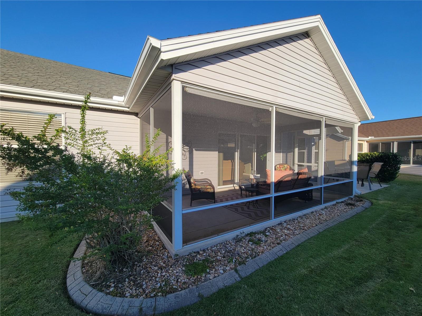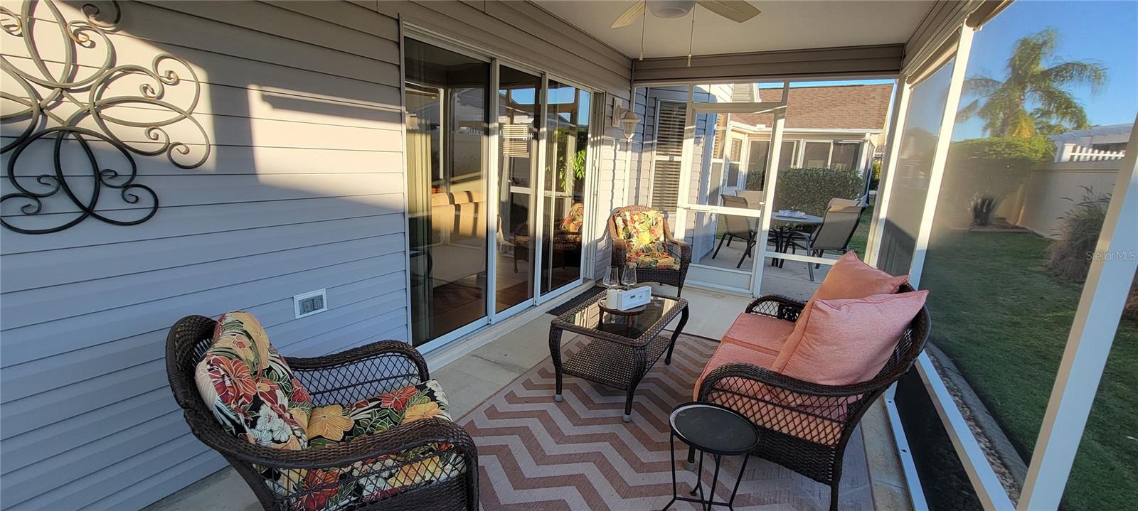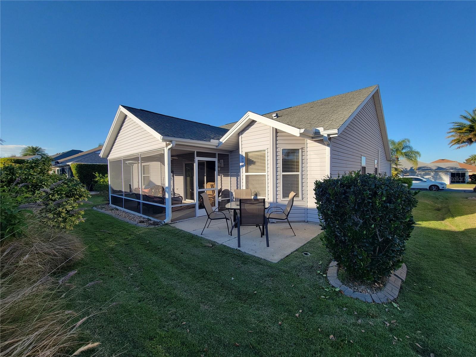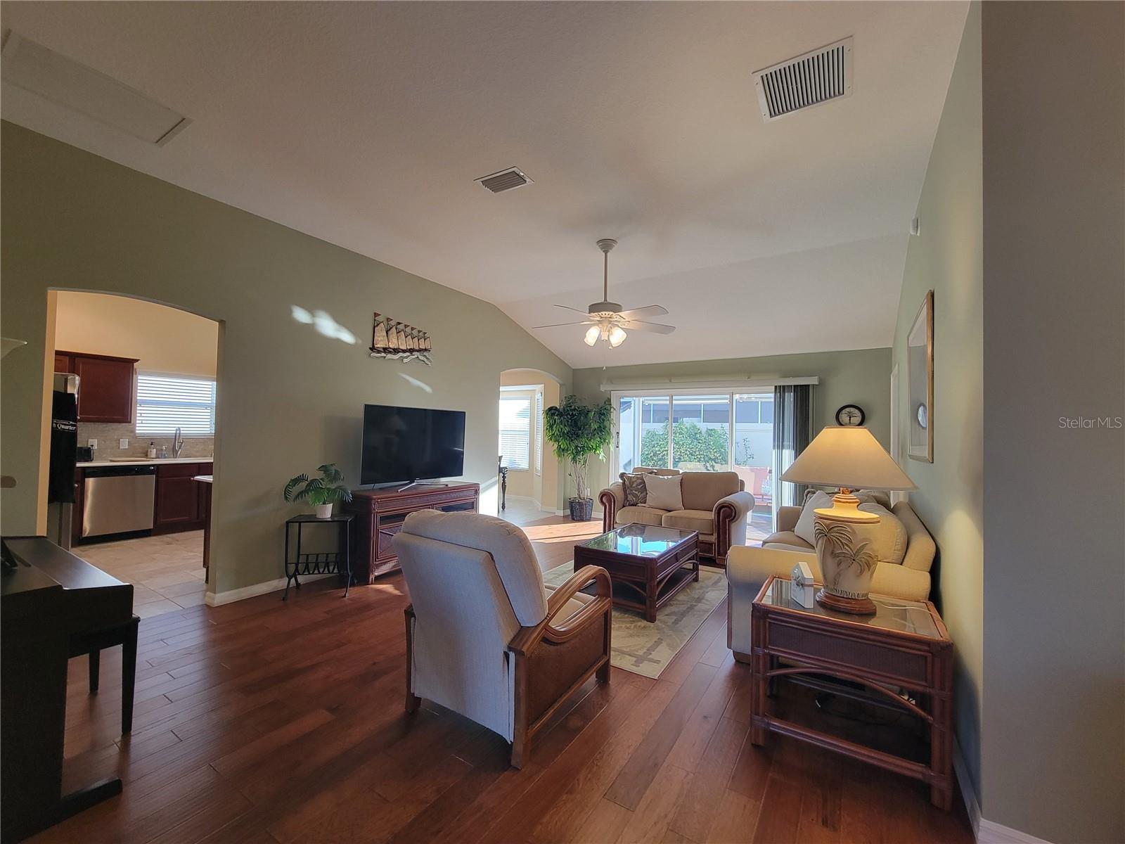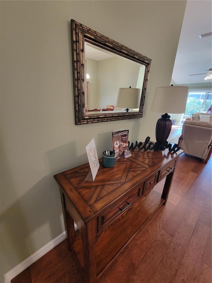 Move right into this pristine "Turnkey" Whispering Pines model in the desirable Village of Hadley! This 3-bedroom, 2-bathroom home offers 1644 sq ft of beautifully maintained living space. The heart of the home is a large, eat-in kitchen featuring quartz countertops, stainless steel appliances, a stylish tile backsplash, and a convenient breakfast bar. Enjoy gatherings in the open living and dining area, highlighted by rich hickory wood floors, a soaring vaulted ceiling, and triple sliders that lead to your private screened lanai. A stucco wall and mature landscaping ensure privacy – NO KISSING LANAI! The flexible 3rd bedroom/den offers additional living space. The primary bedroom is a true retreat with a generous walk-in closet and an ensuite bathroom featuring double sinks and a walk-in shower. All bedrooms boast elegant hickory wood flooring. Enjoy the vibrant Villages lifestyle with easy access to Sumter Landing, Colony shopping center, Odell Rec Center (with family pool), and the Hadley and Amelia adult pools. Ideally situated between Mallory and Havana Country Clubs. This is more than just a house; it's a home! Motivated seller – schedule your private showing today! 2025 ROOF, 2018 AC & 2018 HWH Staging decoration items do not convey with this sale.