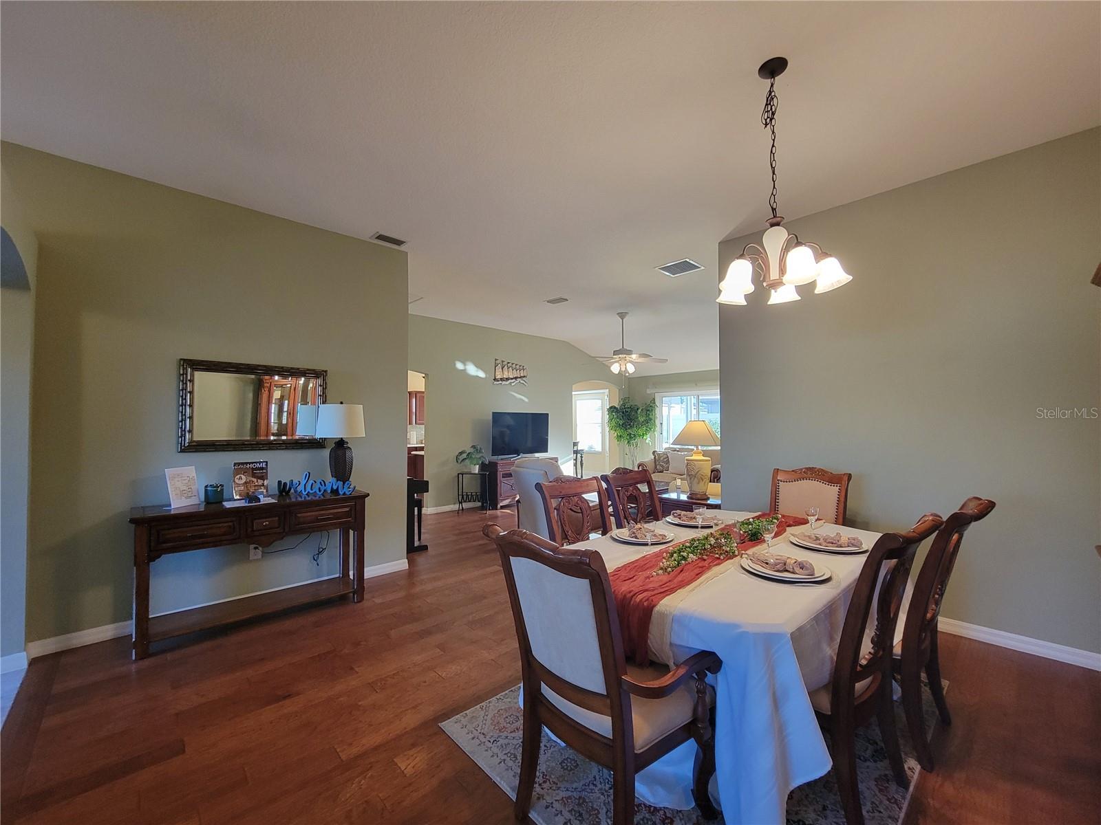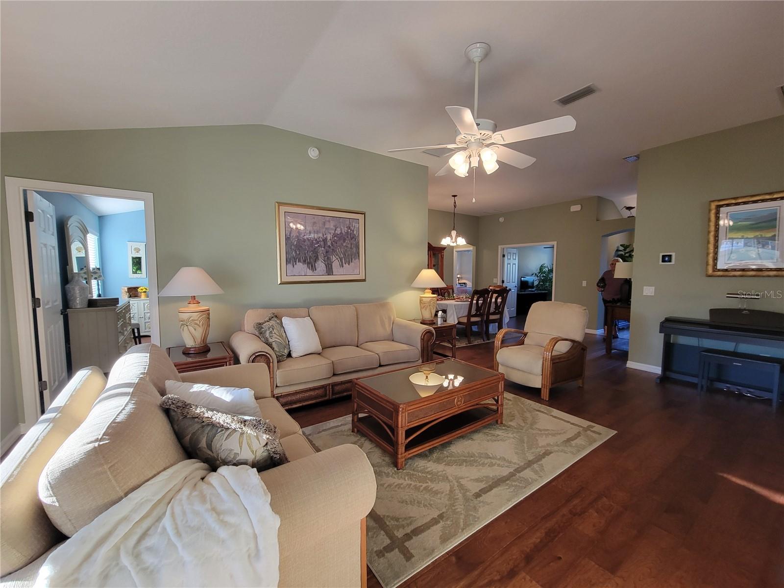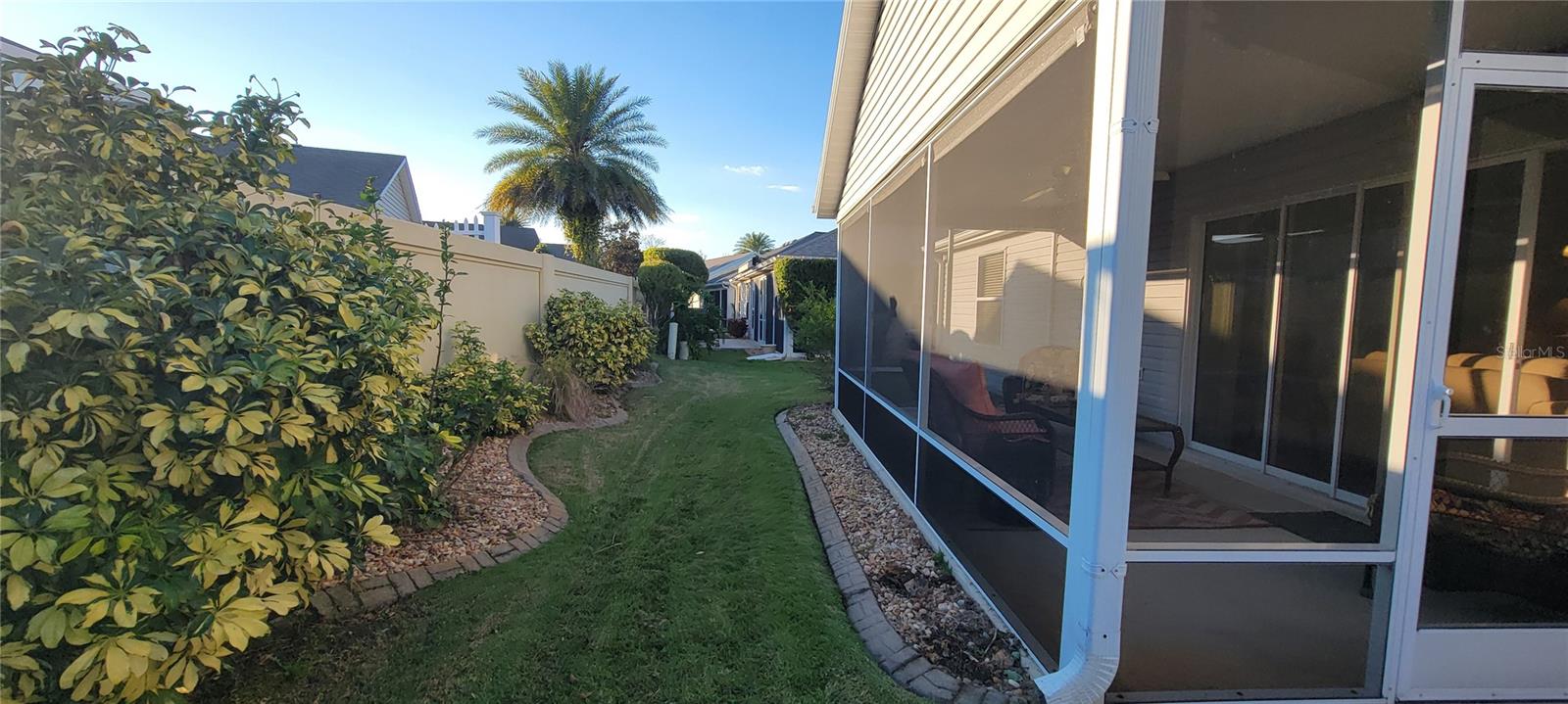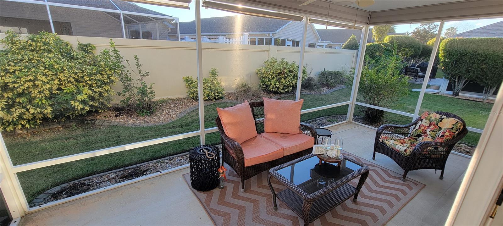 Move right into this pristine "Turnkey" Whispering Pines model in the desirable Village of Hadley! This 3-bedroom, 2-bathroom home offers 1644 sq ft of beautifully maintained living space. The heart of the home is a large, eat-in kitchen featuring quartz countertops, stainless steel appliances, a stylish tile backsplash, and a convenient breakfast bar. Enjoy gatherings in the open living and dining area, highlighted by rich hickory wood floors, a soaring vaulted ceiling, and triple sliders that lead to your private screened lanai. A stucco wall and mature landscaping ensure privacy – NO KISSING LANAI! The flexible 3rd bedroom/den offers additional living space. The primary bedroom is a true retreat with a generous walk-in closet and an ensuite bathroom featuring double sinks and a walk-in shower. All bedrooms boast elegant hickory wood flooring. Enjoy the vibrant Villages lifestyle with easy access to Sumter Landing, Colony shopping center, Odell Rec Center (with family pool), and the Hadley and Amelia adult pools. Ideally situated between Mallory and Havana Country Clubs. This is more than just a house; it's a home! Motivated seller – schedule your private showing today! 2025 ROOF, 2018 AC & 2018 HWH Staging decoration items do not convey with this sale.