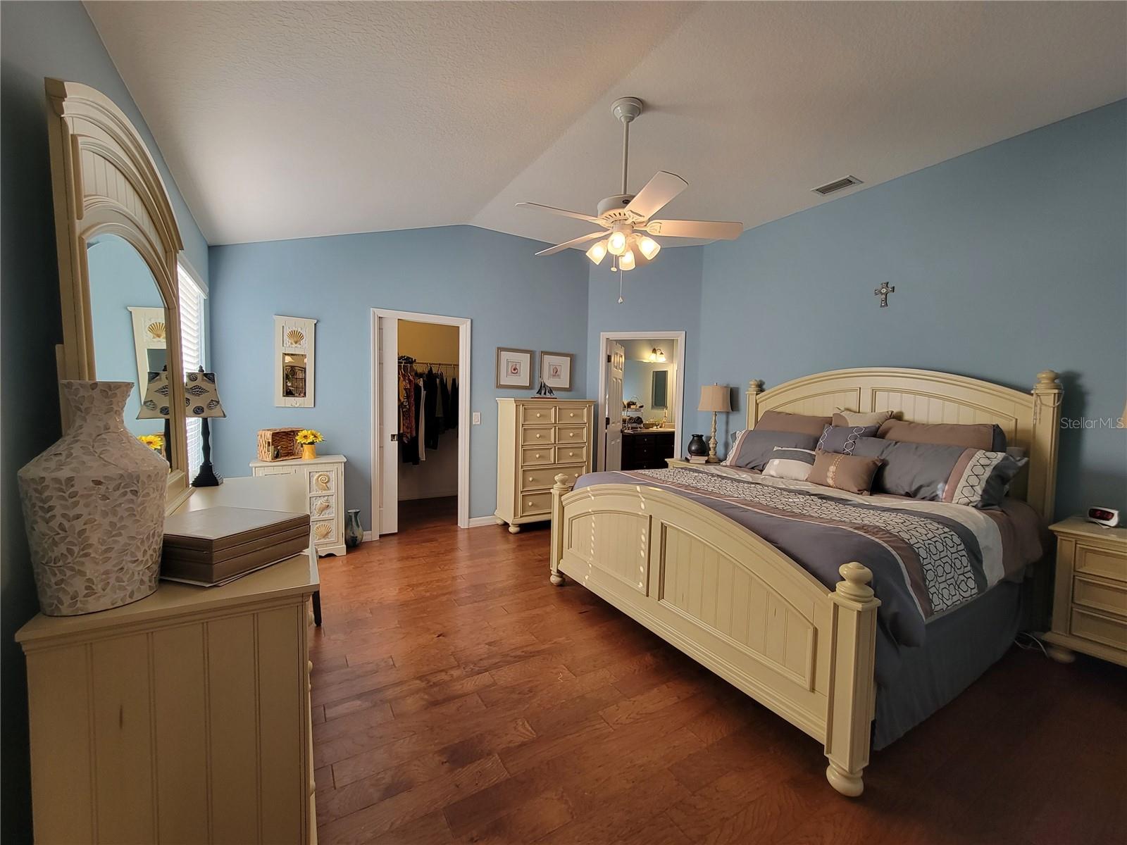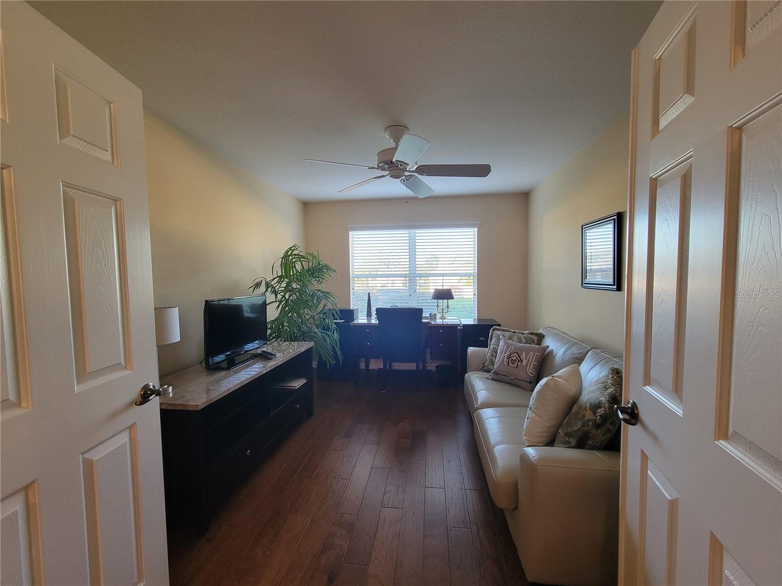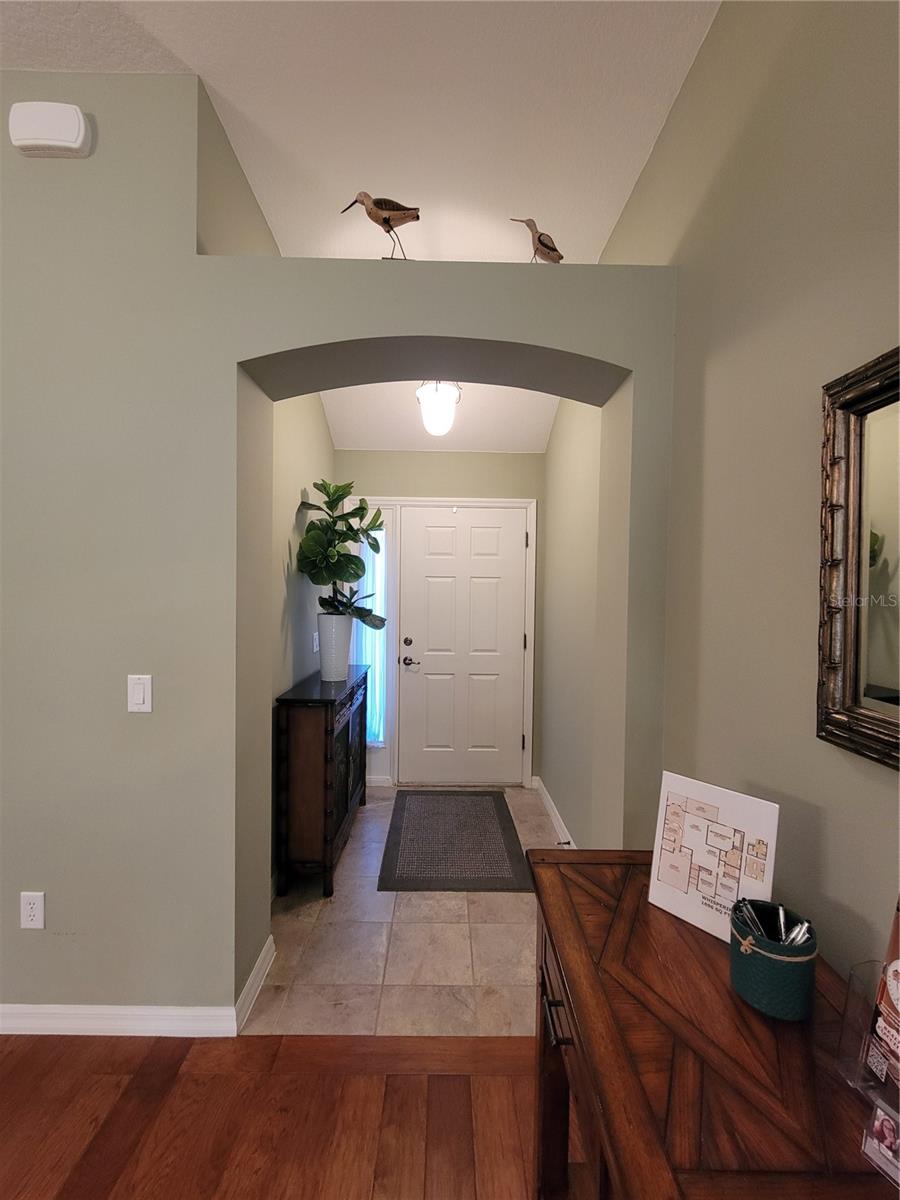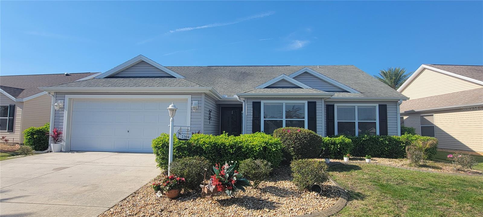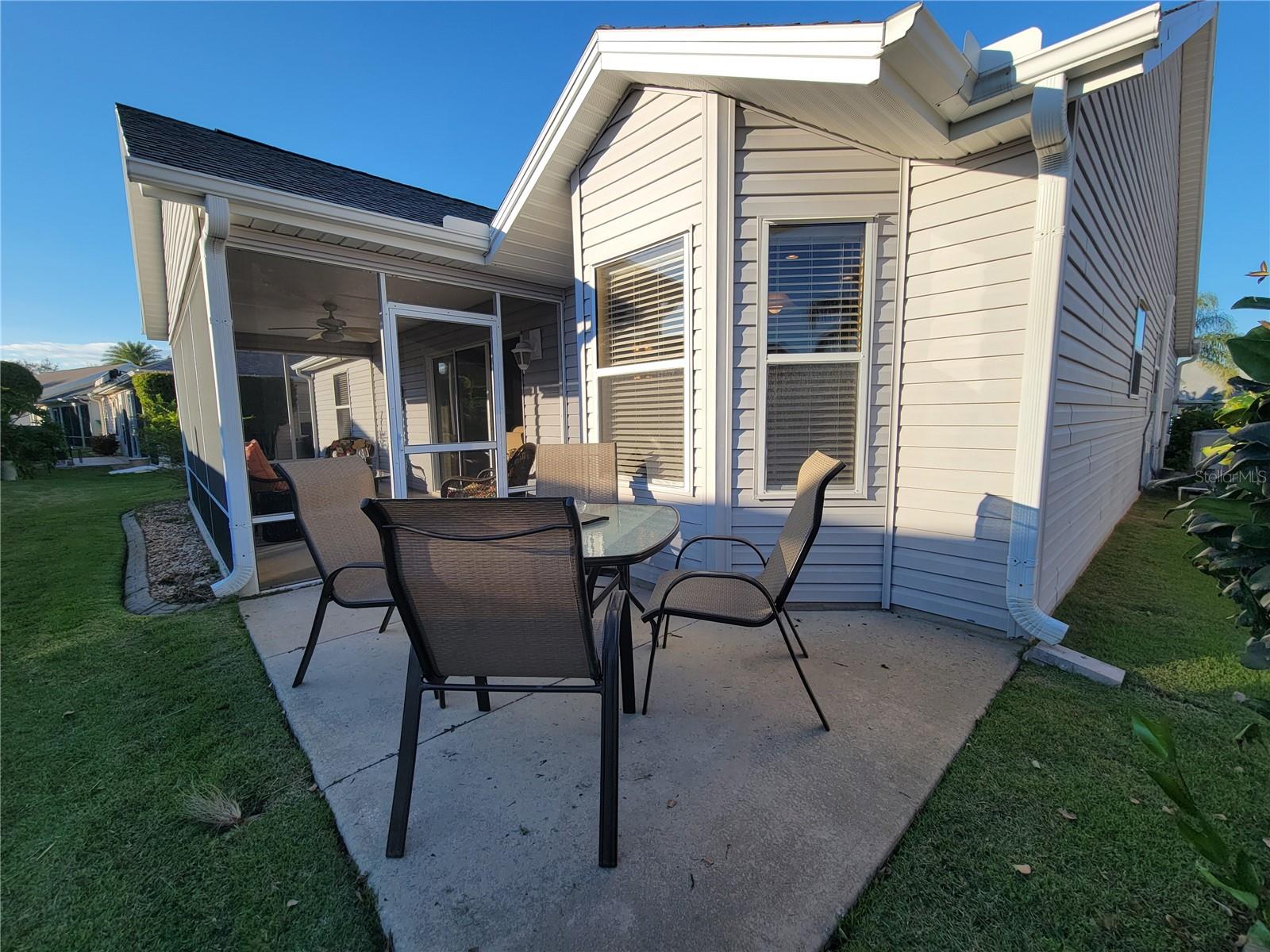 Move right into this pristine "Turnkey" Whispering Pines model in the desirable Village of Hadley! This 3-bedroom, 2-bathroom home offers 1644 sq ft of beautifully maintained living space. The heart of the home is a large, eat-in kitchen featuring quartz countertops, stainless steel appliances, a stylish tile backsplash, and a convenient breakfast bar. Enjoy gatherings in the open living and dining area, highlighted by rich hickory wood floors, a soaring vaulted ceiling, and triple sliders that lead to your private screened lanai. A stucco wall and mature landscaping ensure privacy – NO KISSING LANAI! The flexible 3rd bedroom/den offers additional living space. The primary bedroom is a true retreat with a generous walk-in closet and an ensuite bathroom featuring double sinks and a walk-in shower. All bedrooms boast elegant hickory wood flooring. Enjoy the vibrant Villages lifestyle with easy access to Sumter Landing, Colony shopping center, Odell Rec Center (with family pool), and the Hadley and Amelia adult pools. Ideally situated between Mallory and Havana Country Clubs. This is more than just a house; it's a home! Motivated seller – schedule your private showing today! 2025 ROOF, 2018 AC & 2018 HWH Staging decoration items do not convey with this sale.