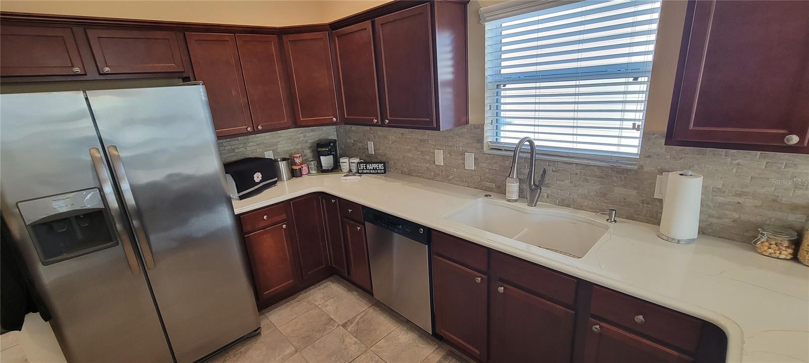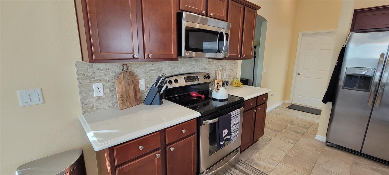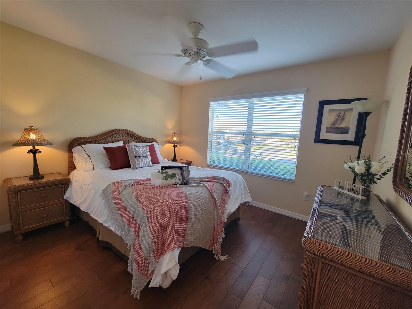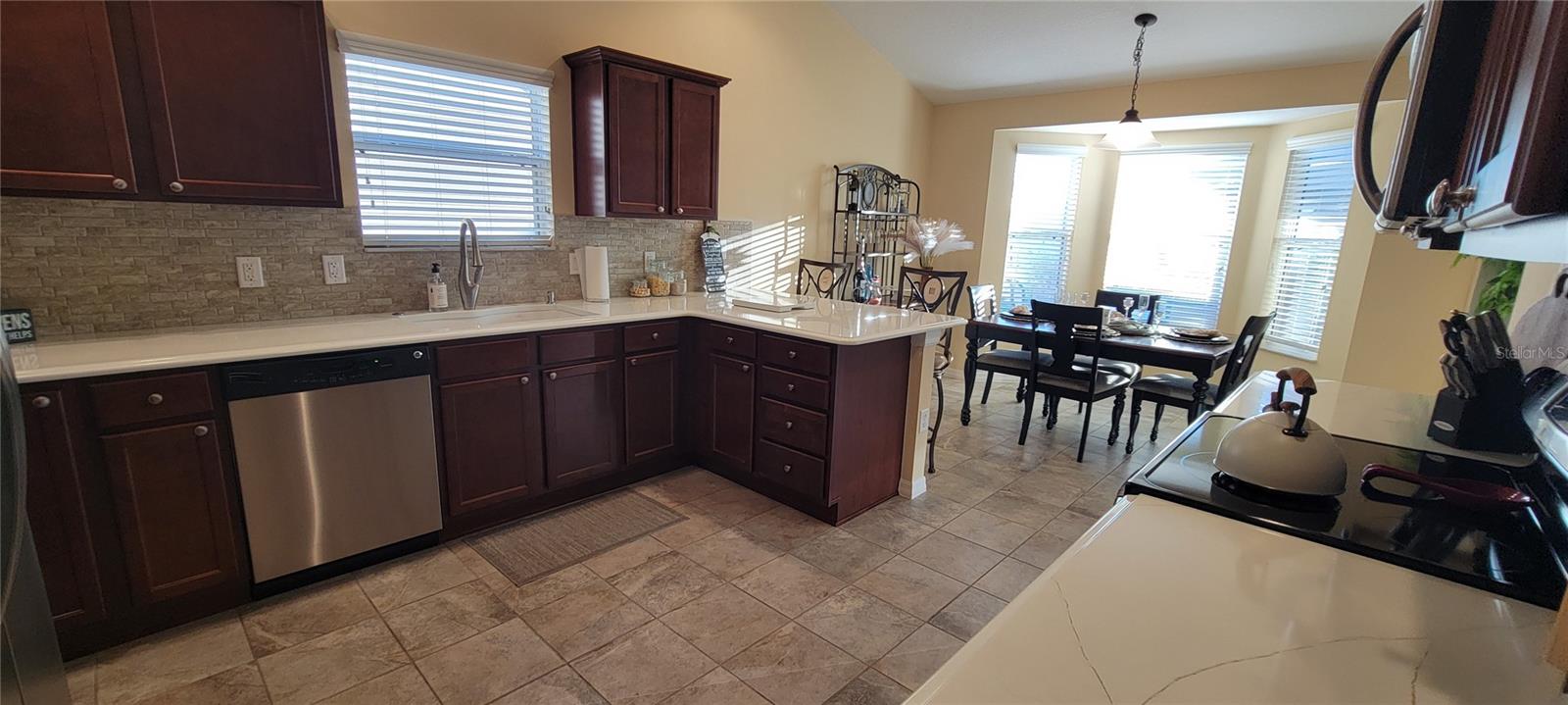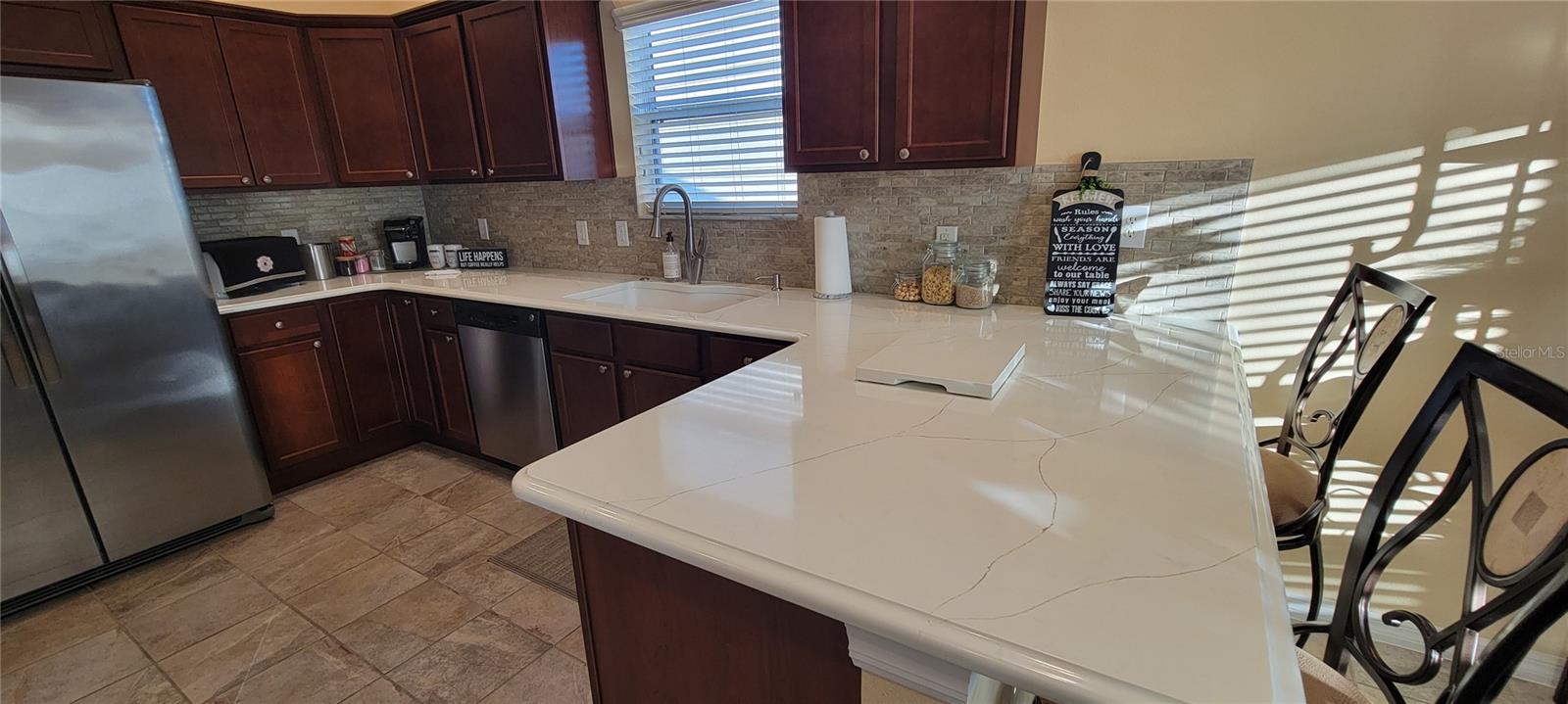 Move right into this pristine "Turnkey" Whispering Pines model in the desirable Village of Hadley! This 3-bedroom, 2-bathroom home offers 1644 sq ft of beautifully maintained living space. The heart of the home is a large, eat-in kitchen featuring quartz countertops, stainless steel appliances, a stylish tile backsplash, and a convenient breakfast bar. Enjoy gatherings in the open living and dining area, highlighted by rich hickory wood floors, a soaring vaulted ceiling, and triple sliders that lead to your private screened lanai. A stucco wall and mature landscaping ensure privacy – NO KISSING LANAI! The flexible 3rd bedroom/den offers additional living space. The primary bedroom is a true retreat with a generous walk-in closet and an ensuite bathroom featuring double sinks and a walk-in shower. All bedrooms boast elegant hickory wood flooring. Enjoy the vibrant Villages lifestyle with easy access to Sumter Landing, Colony shopping center, Odell Rec Center (with family pool), and the Hadley and Amelia adult pools. Ideally situated between Mallory and Havana Country Clubs. This is more than just a house; it's a home! Motivated seller – schedule your private showing today! 2025 ROOF, 2018 AC & 2018 HWH Staging decoration items do not convey with this sale.