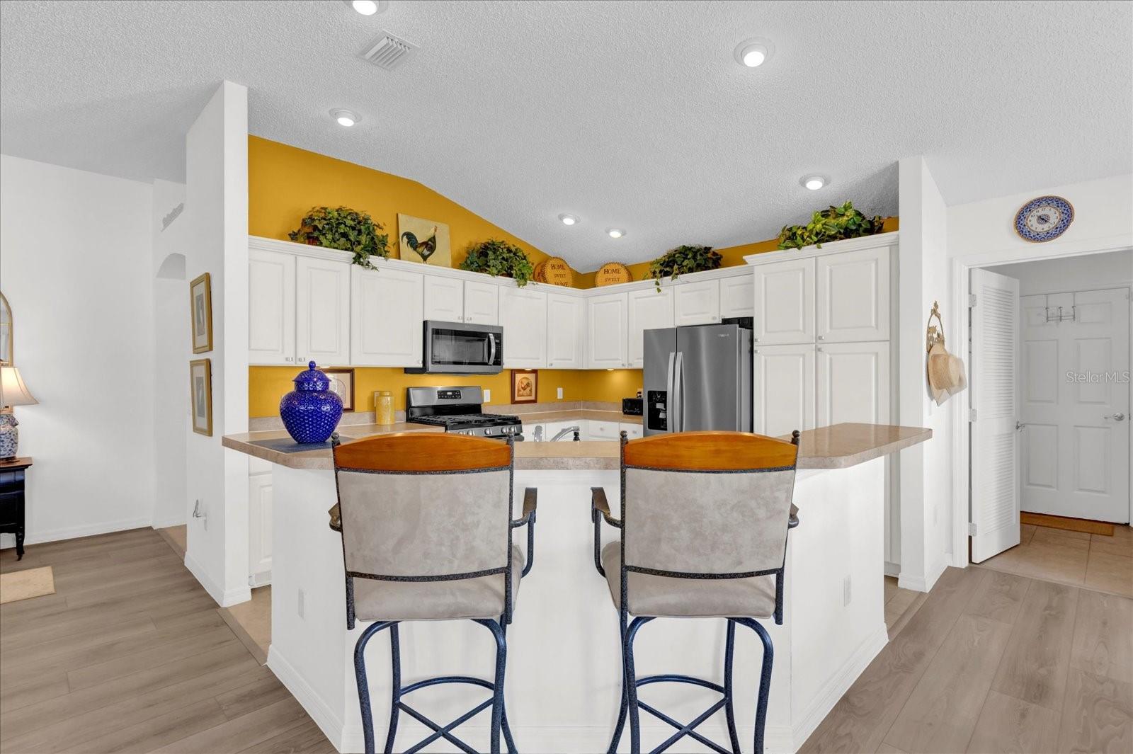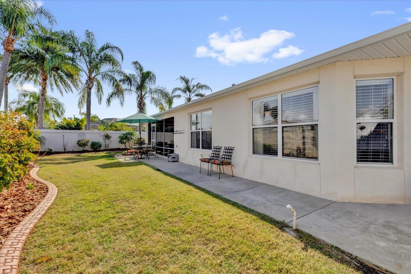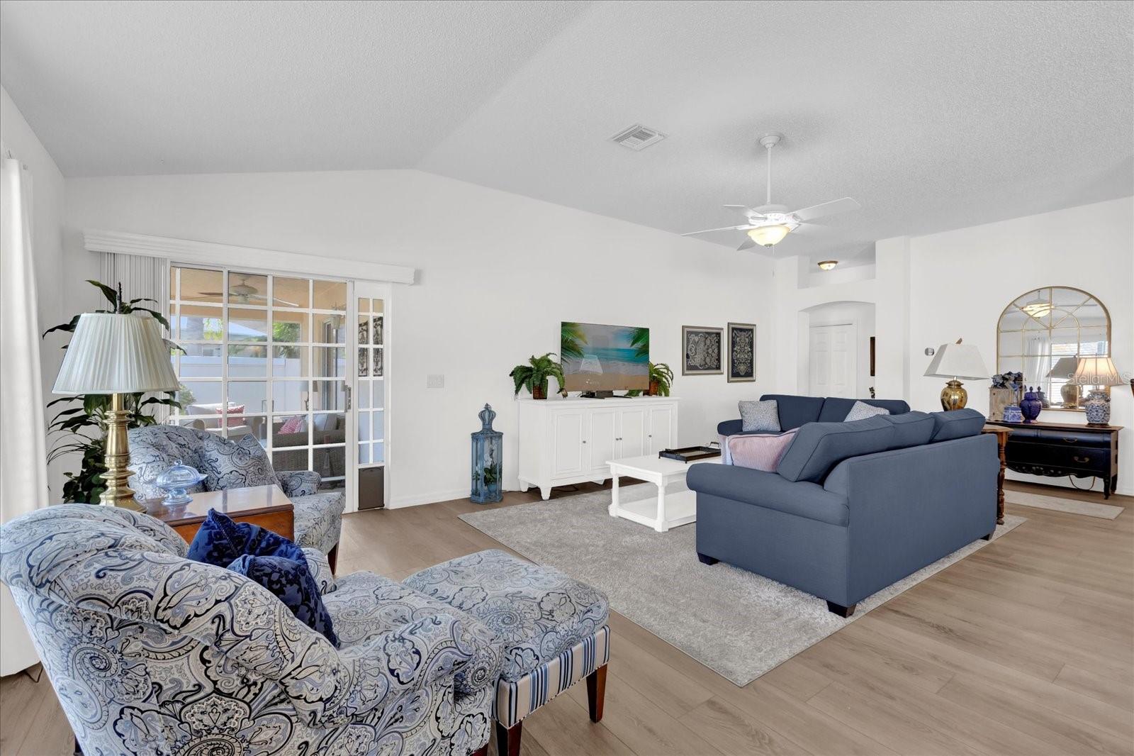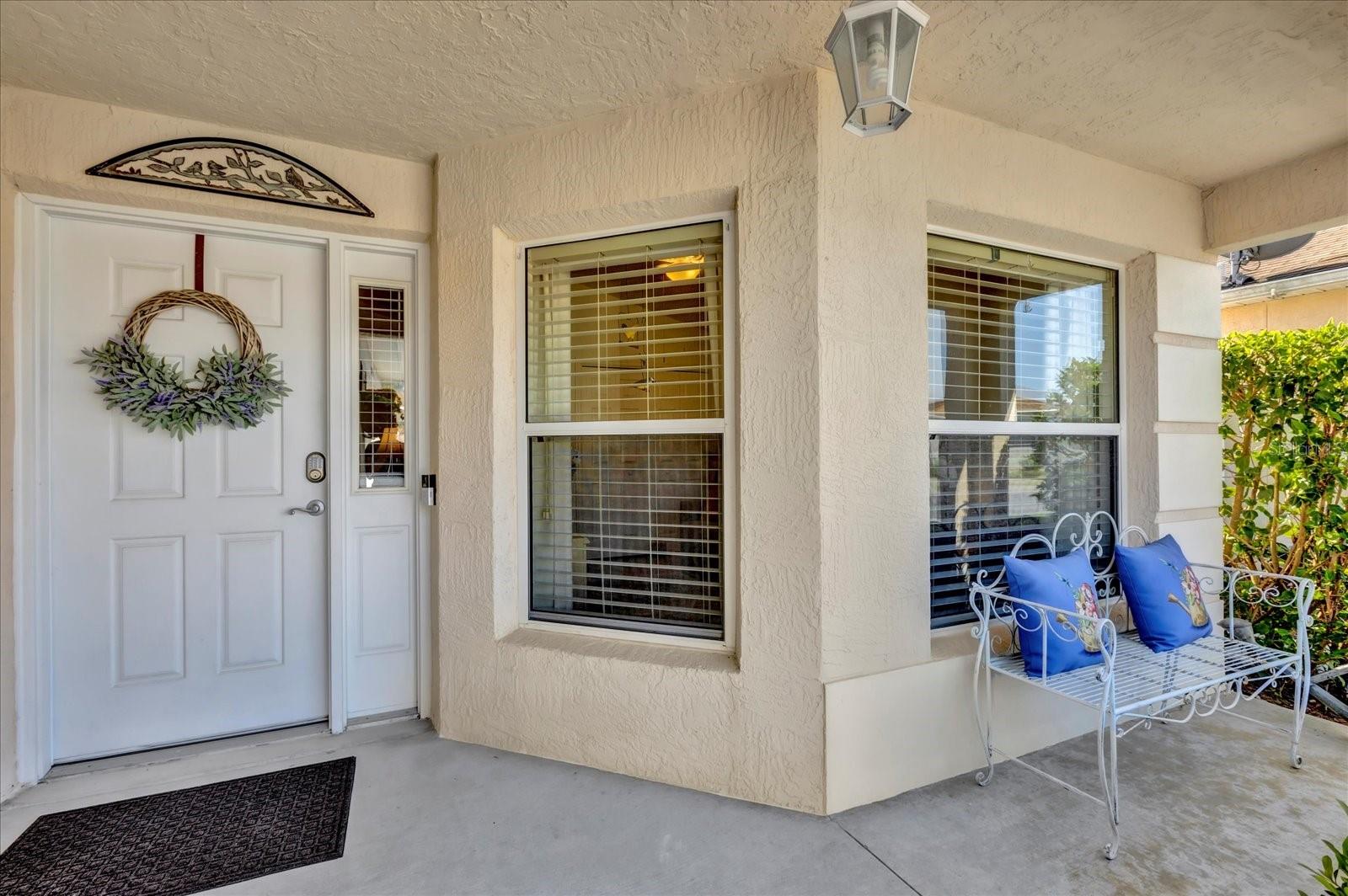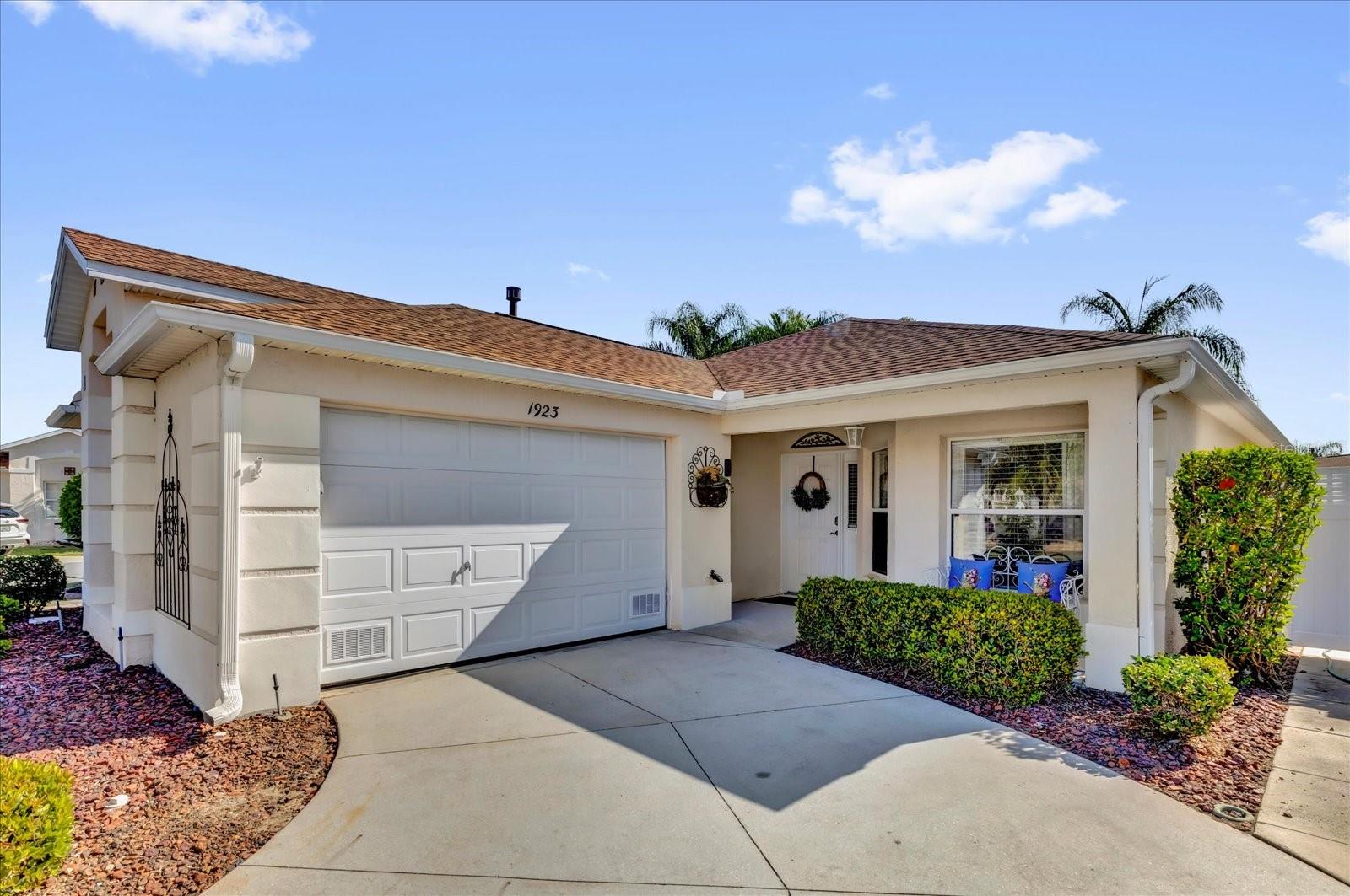 Discover this charming Grantham/Arlington floor plan courtyard villa, constructed with poured concrete and stucco for lasting durability. Situated on a spacious corner homesite, this home offers extra outdoor space, perfect for future expansion or added privacy. Featuring 3 bedrooms and 2 bathrooms, the interior is designed for easy maintenance with luxury vinyl flooring throughout, complemented by tile in the wet areas. The volume ceilings create an open and airy atmosphere, enhancing the home's inviting feel. The well-appointed kitchen features elegant White Bay cabinetry, stainless steel appliances, a gas range, and a side-by-side refrigerator, making it a functional and stylish space. For added convenience, the microwave, refrigerator, and stove were all replaced in August 2023 and dishwasher in April 2025. A welcoming front porch adds curb appeal, while the screened-in lanai at the rear provides a relaxing retreat. Courtyard villas are highly desirable for their low-maintenance lifestyle, making them an excellent choice for pet owners due to the enclosed and fenced yard or those seeking an easy-care home. Additional features include an interior laundry room, enhanced landscaping with Curb-It and decorative rock beds, double-pane windows, blinds, and gas utilities for efficiency. To enhance energy savings, vents were added to the bottom of the garage door along with a fan for improved air circulation. A new roof was installed in April 2024, offering added peace of mind. With a low bond balance of $4,765, this home is a fantastic value compared to similar properties. The location puts you in close proximity to the Bogart and Bacall executive golf courses, the Largo Recreation center featuring a family pool, an adult pool, and several tennis and pickleball courts. This is your chance to own a little slice of paradise!