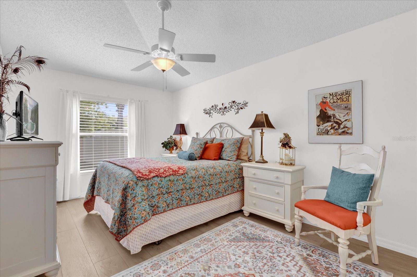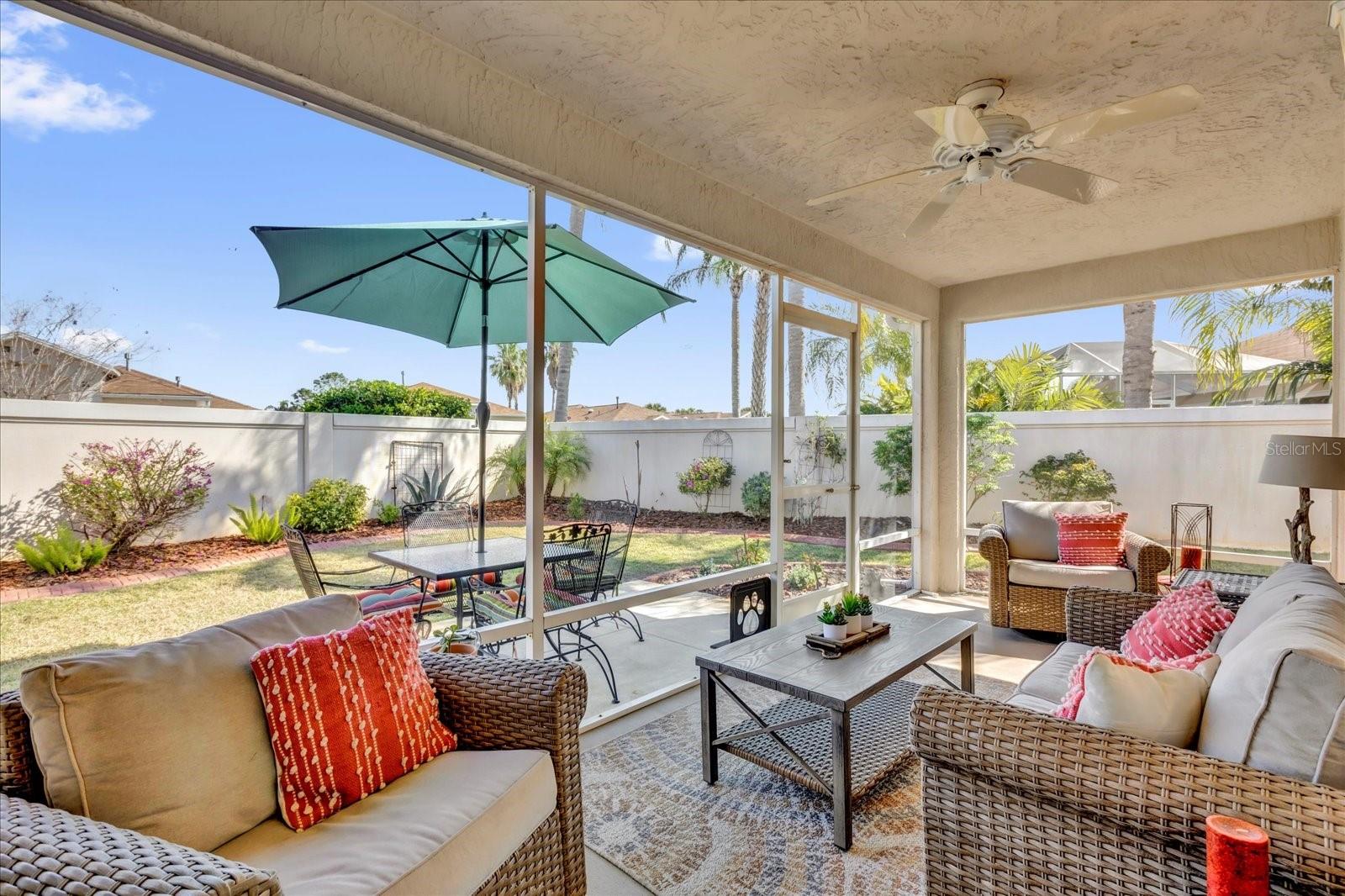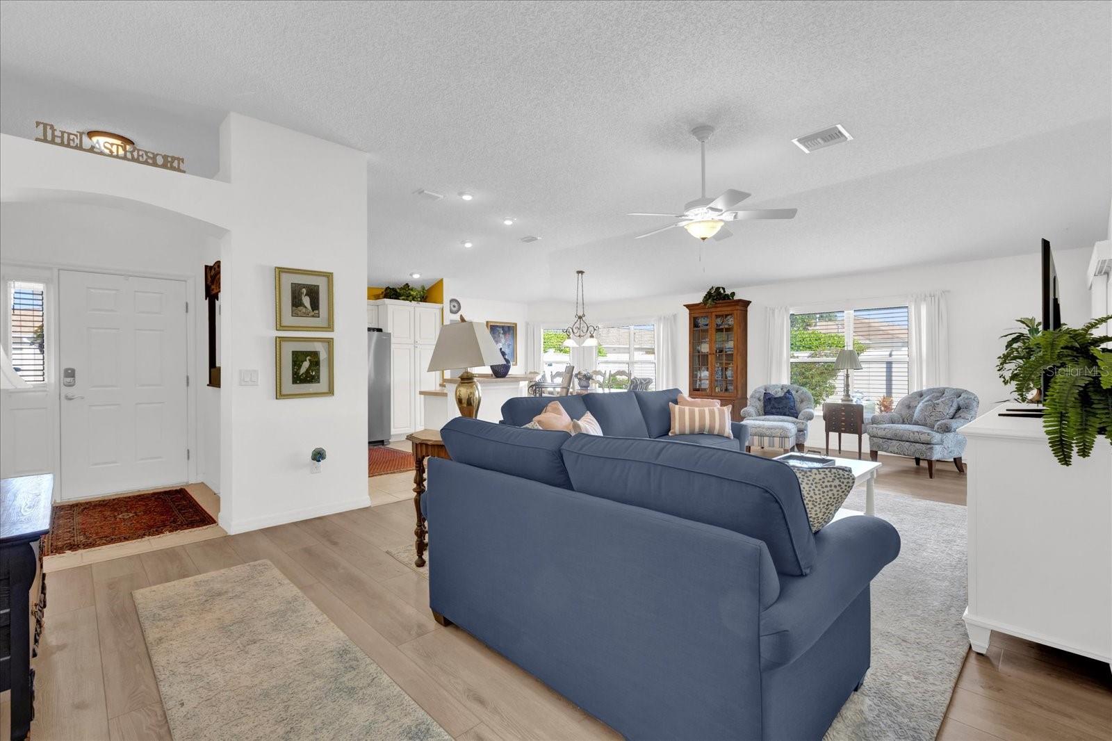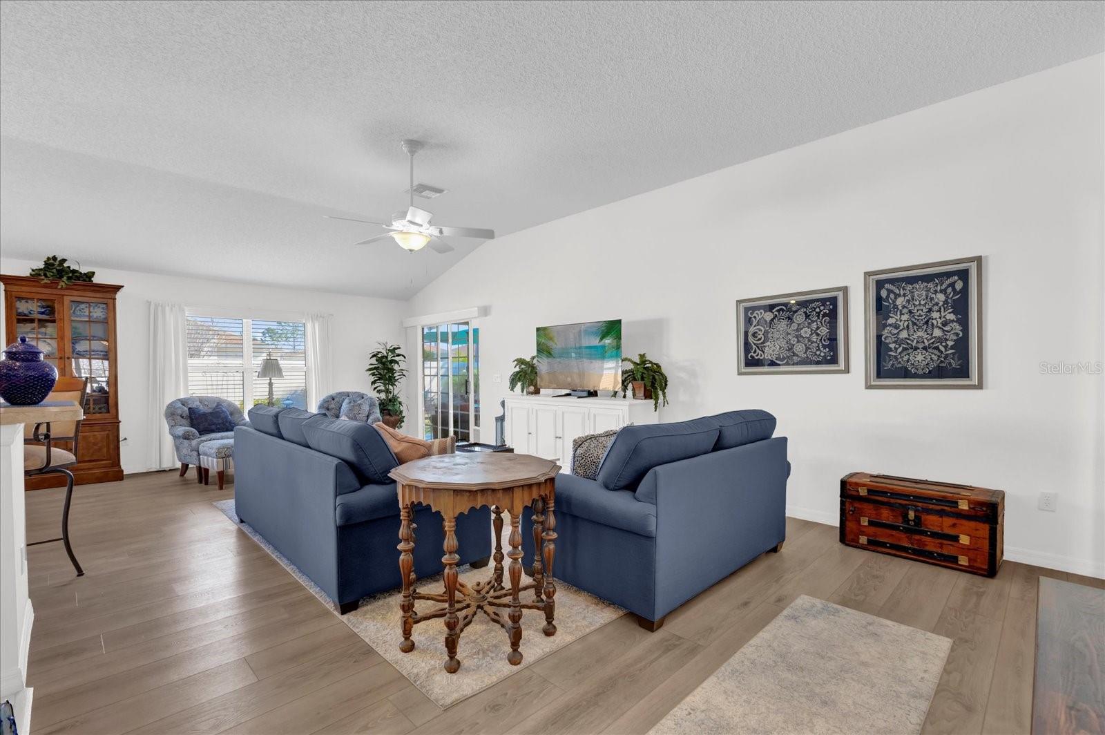 Discover this charming Grantham/Arlington floor plan courtyard villa, constructed with poured concrete and stucco for lasting durability. Situated on a spacious corner homesite, this home offers extra outdoor space, perfect for future expansion or added privacy. Featuring 3 bedrooms and 2 bathrooms, the interior is designed for easy maintenance with luxury vinyl flooring throughout, complemented by tile in the wet areas. The volume ceilings create an open and airy atmosphere, enhancing the home's inviting feel. The well-appointed kitchen features elegant White Bay cabinetry, stainless steel appliances, a gas range, and a side-by-side refrigerator, making it a functional and stylish space. For added convenience, the microwave, refrigerator, and stove were all replaced in August 2023 and dishwasher in April 2025. A welcoming front porch adds curb appeal, while the screened-in lanai at the rear provides a relaxing retreat. Courtyard villas are highly desirable for their low-maintenance lifestyle, making them an excellent choice for pet owners due to the enclosed and fenced yard or those seeking an easy-care home. Additional features include an interior laundry room, enhanced landscaping with Curb-It and decorative rock beds, double-pane windows, blinds, and gas utilities for efficiency. To enhance energy savings, vents were added to the bottom of the garage door along with a fan for improved air circulation. A new roof was installed in April 2024, offering added peace of mind. With a low bond balance of $4,765, this home is a fantastic value compared to similar properties. The location puts you in close proximity to the Bogart and Bacall executive golf courses, the Largo Recreation center featuring a family pool, an adult pool, and several tennis and pickleball courts. This is your chance to own a little slice of paradise!