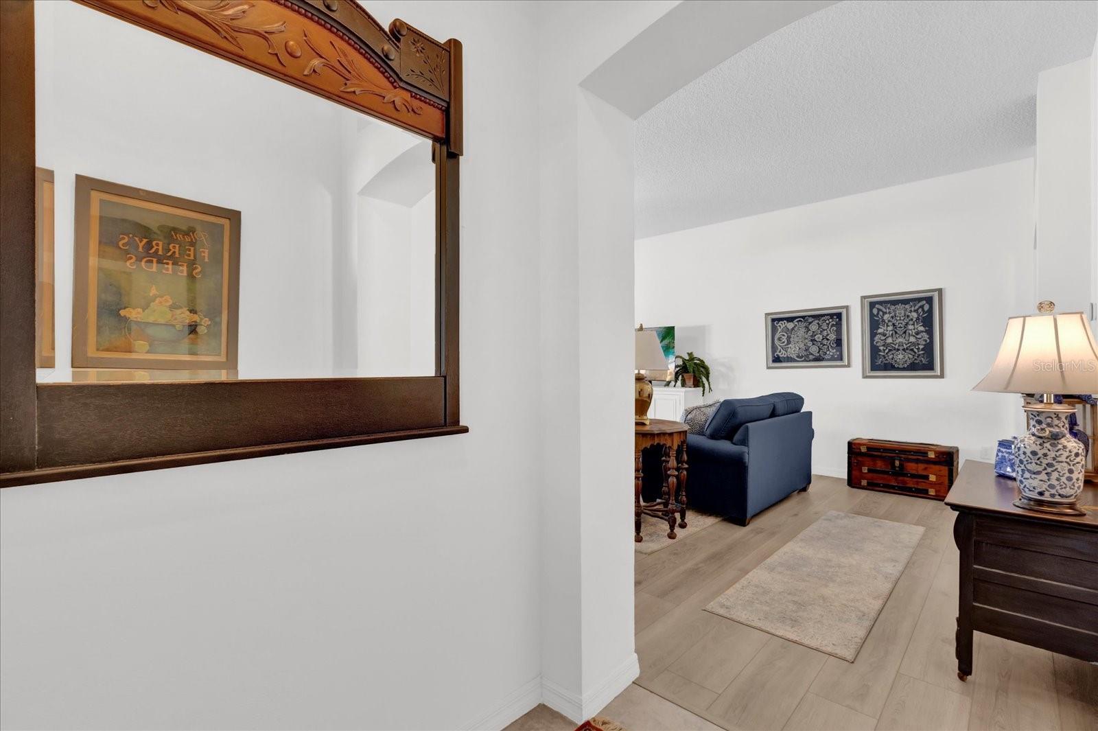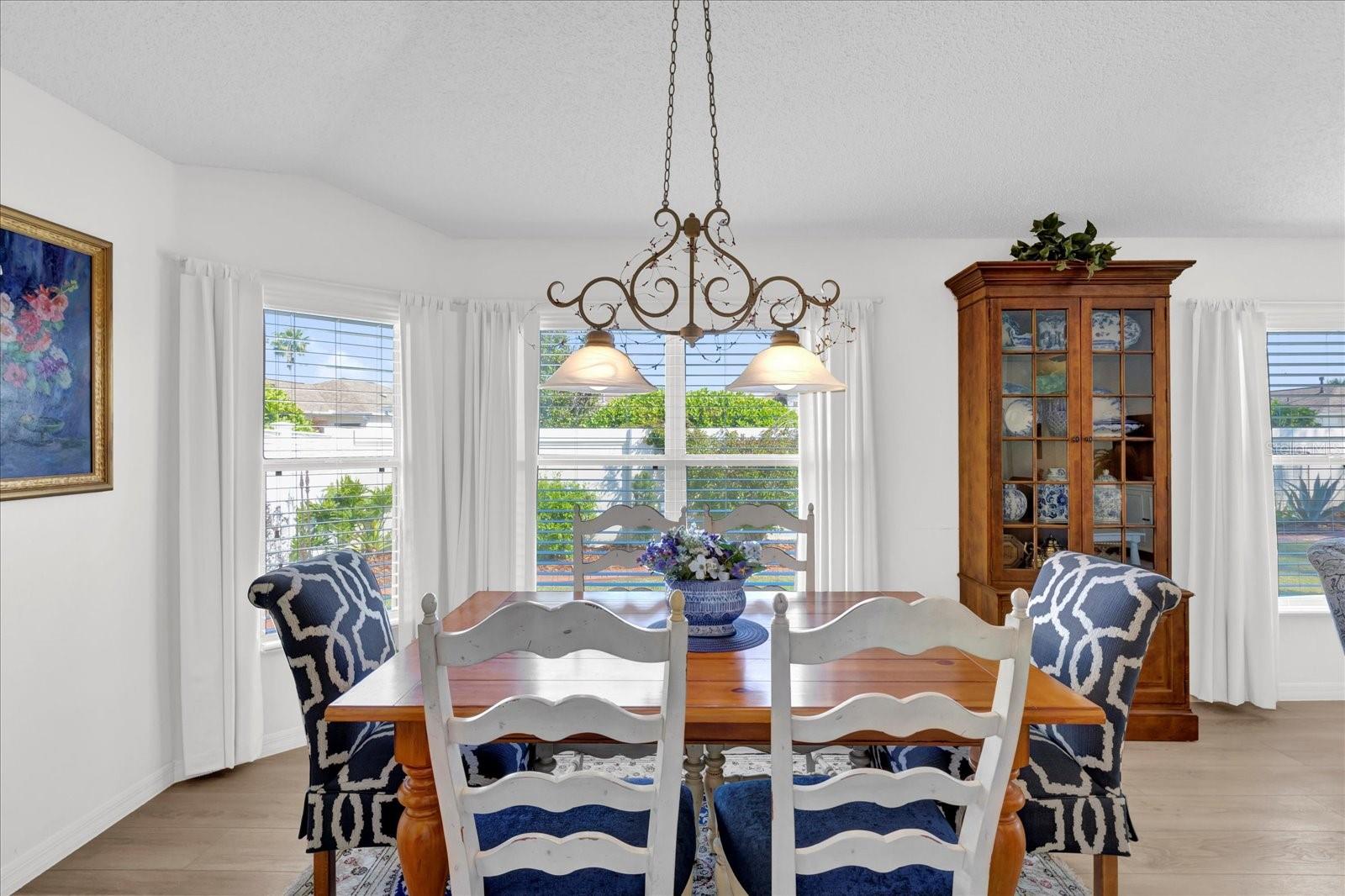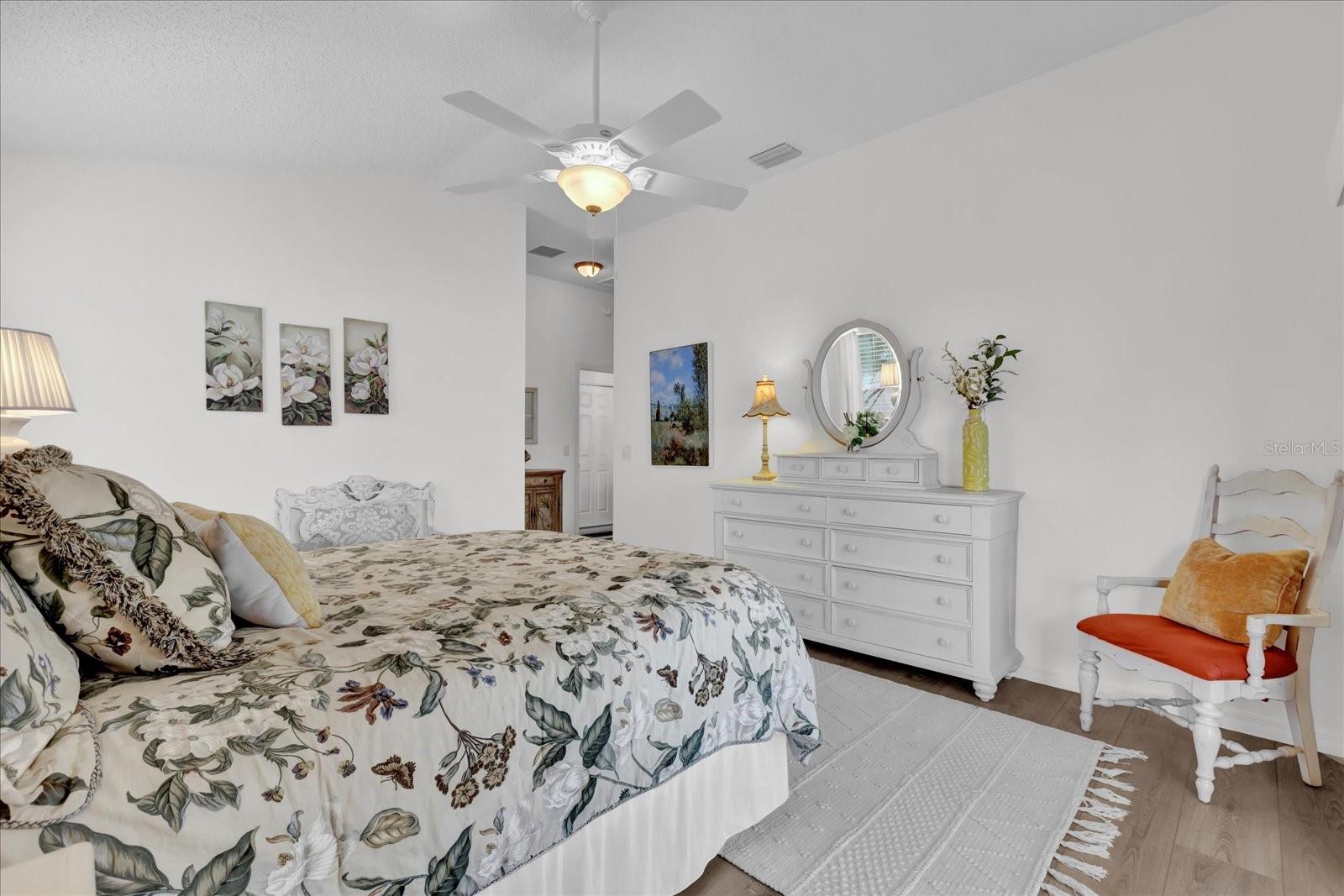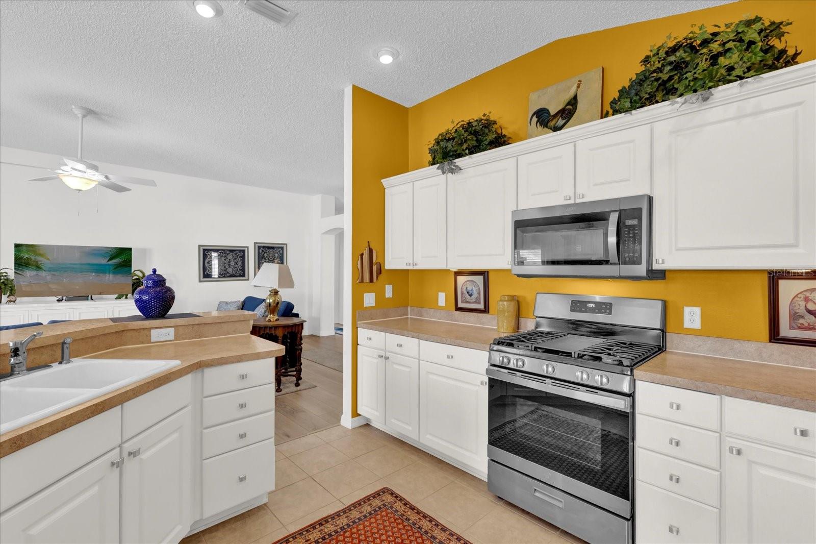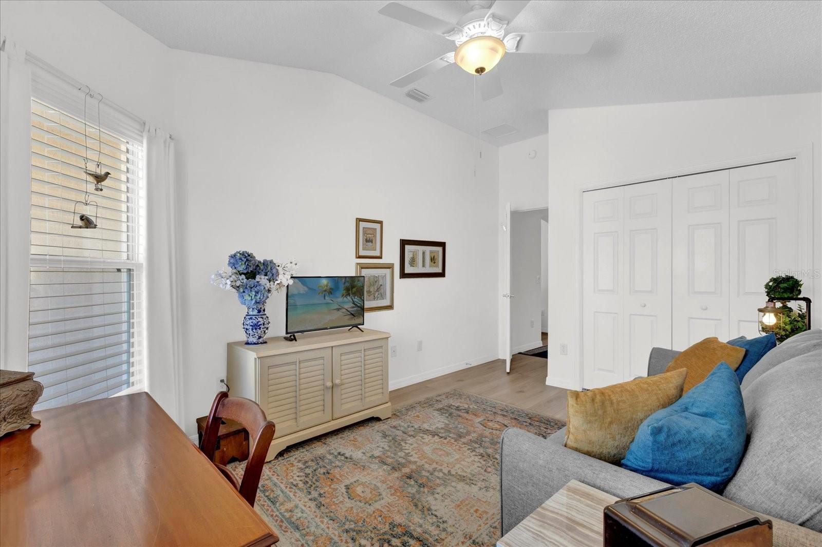Discover this charming Grantham/Arlington floor plan courtyard villa, constructed with poured concrete and stucco for lasting durability. Situated on a spacious corner homesite, this home offers extra outdoor space, perfect for future expansion or added privacy. Featuring 3 bedrooms and 2 bathrooms, the interior is designed for easy maintenance with luxury vinyl flooring throughout, complemented by tile in the wet areas. The volume ceilings create an open and airy atmosphere, enhancing the home's inviting feel. The well-appointed kitchen features elegant White Bay cabinetry, stainless steel appliances, a gas range, and a side-by-side refrigerator, making it a functional and stylish space. For added convenience, the microwave, refrigerator, and stove were all replaced in August 2023 and dishwasher in April 2025. A welcoming front porch adds curb appeal, while the screened-in lanai at the rear provides a relaxing retreat. Courtyard villas are highly desirable for their low-maintenance lifestyle, making them an excellent choice for pet owners due to the enclosed and fenced yard or those seeking an easy-care home. Additional features include an interior laundry room, enhanced landscaping with Curb-It and decorative rock beds, double-pane windows, blinds, and gas utilities for efficiency. To enhance energy savings, vents were added to the bottom of the garage door along with a fan for improved air circulation. A new roof was installed in April 2024, offering added peace of mind. With a low bond balance of $4,765, this home is a fantastic value compared to similar properties. The location puts you in close proximity to the Bogart and Bacall executive golf courses, the Largo Recreation center featuring a family pool, an adult pool, and several tennis and pickleball courts. This is your chance to own a little slice of paradise!