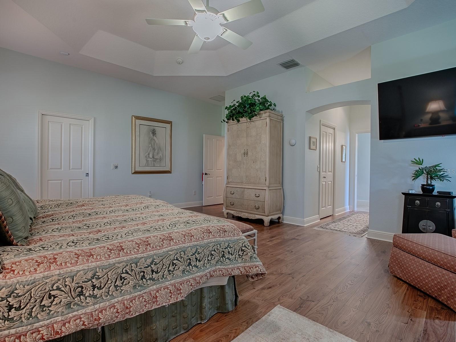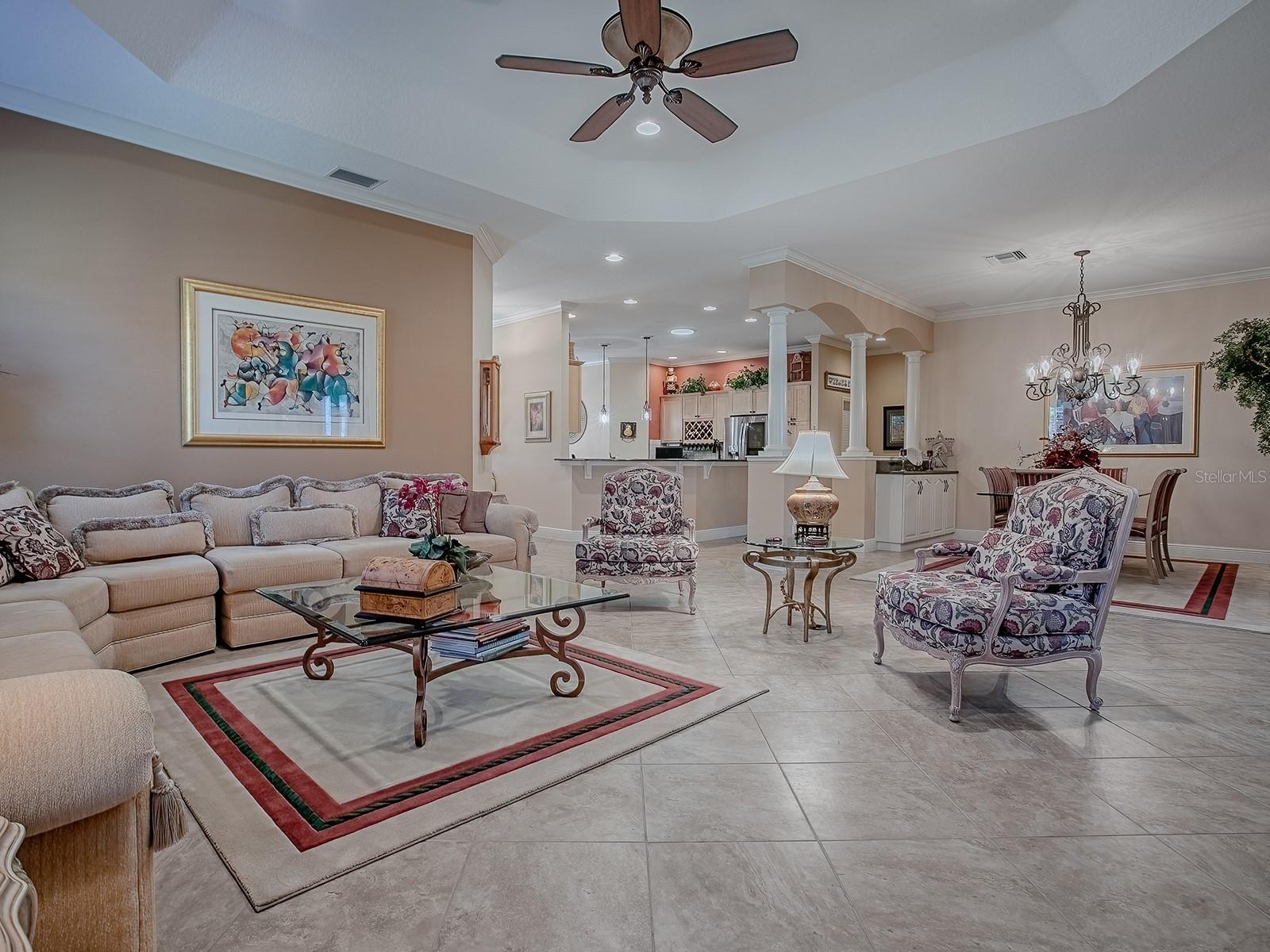 LOVELY CUSTOM EXPANDED WILLIAMSBURG PREMIER home with over 3000 sq. ft. and large 800+ sq. ft. OVERSIZED 2 car+ 2 GOLF CART GARAGE offering plenty of extra room for storage and more, located in the all premier Village of BRIDGEPORT AT LAKE SUMTER. Nice curb appeal with stone curbing, lovely flowering shrubs, palms and large covered FRONT PORCH. Step inside to find DIAGONAL TILE in the foyer, hallways, living and dining rooms, kitchen, laundry, and baths. The spacious kitchen offers GRANITE countertops, TILED backsplash, NEWER STAINLESS appliances with a GAS stove with double oven, NEW TOUCHLESS faucet, closet pantry, a SOLAR TUBE, lots of cabinet and counter space, built-in wine rack, a large island with overhang providing for seating, and a casual dining area with large window with PLANTATION SHUTTERS. You’ll find CROWN MOLDING throughout the home and many other lovely UPGRADES. The dining and living room conveniently flow into the added 24’x18’ FAMILY room featuring lovely HICKORY WOOD flooring, and a charming STONE GAS FIREPLACE, and plantation shutters, perfect for cozy gatherings. This room opens with FRENCH DOORS out to the spacious screened lanai where thoughtful design provides PRIVACY with the offset of the homes in the rear. The primary bedroom has lovely laminate flooring and boasts 3 WALK-IN CLOSETS, including a custom-designed 7' x 9' closet for added storage and organization. The en-suite bathroom is a spa-like haven with dual sinks, a vanity, a luxurious soaking tub, and a Roman walk-in shower. The two guest bedrooms are equally impressive, each featuring large closets and ceiling fans. The second bedroom offers direct access to the guest bath, creating a convenient and private space for visitors. The laundry room is around the corner from the kitchen and has lots of extra cabinet space, washer and dryer do convey with the home, and a built-in sink. And you will LOVE the garage and all the extra space it provides with over 800+ sq. ft. providing room for 2 cars, 2 golf carts, and then some. Other features in this spacious garage are insulated doors, pull down attic stairs, ceiling fans, lots of storage cabinets that convey, and overhead storage racks. There are 2 HVAC’s, both recently replaced, in 2022 and 2021. The roof was replaced in 2023. GREAT LOCATION just minutes away from LAKE SUMTER LANDING and Arnold Palmer Country Club and Golf Course, and the Bridgeport Village Recreation Center. COME SEE ALL THIS LOVELY HOME AND AREA HAS TO OFFER!