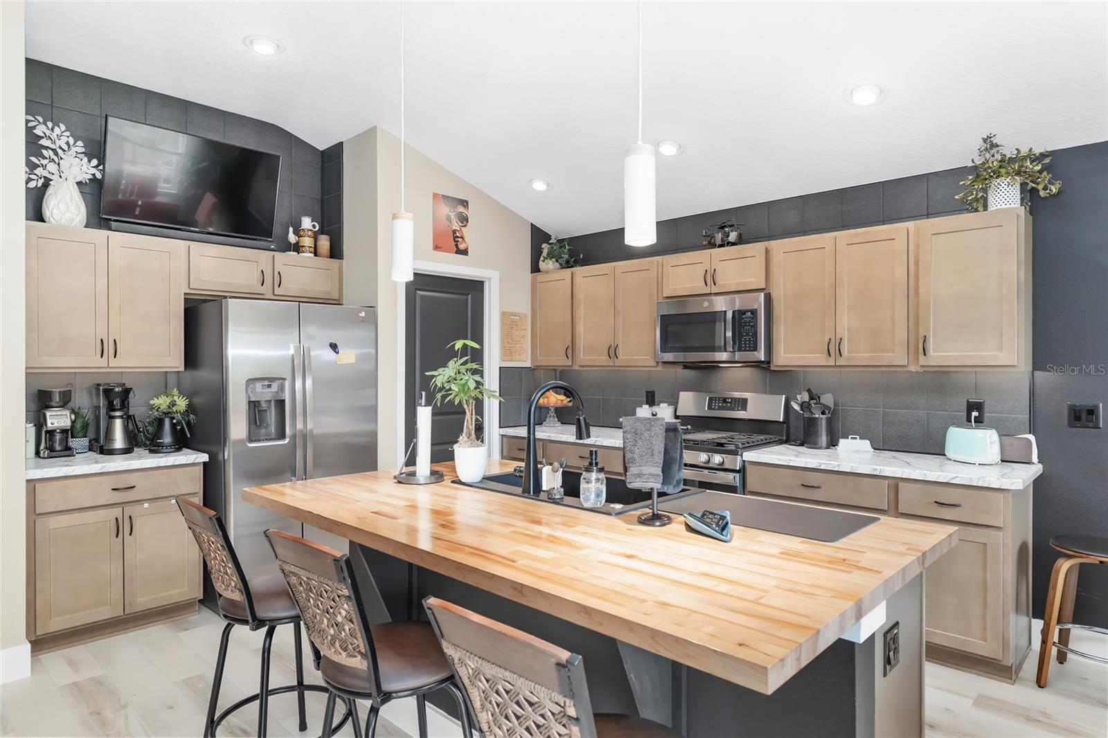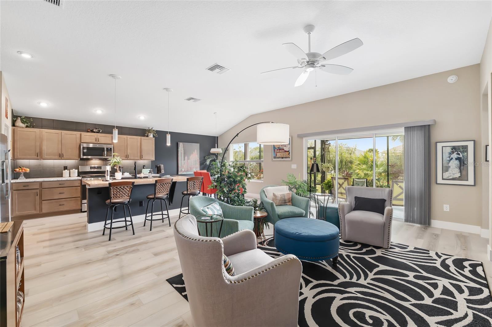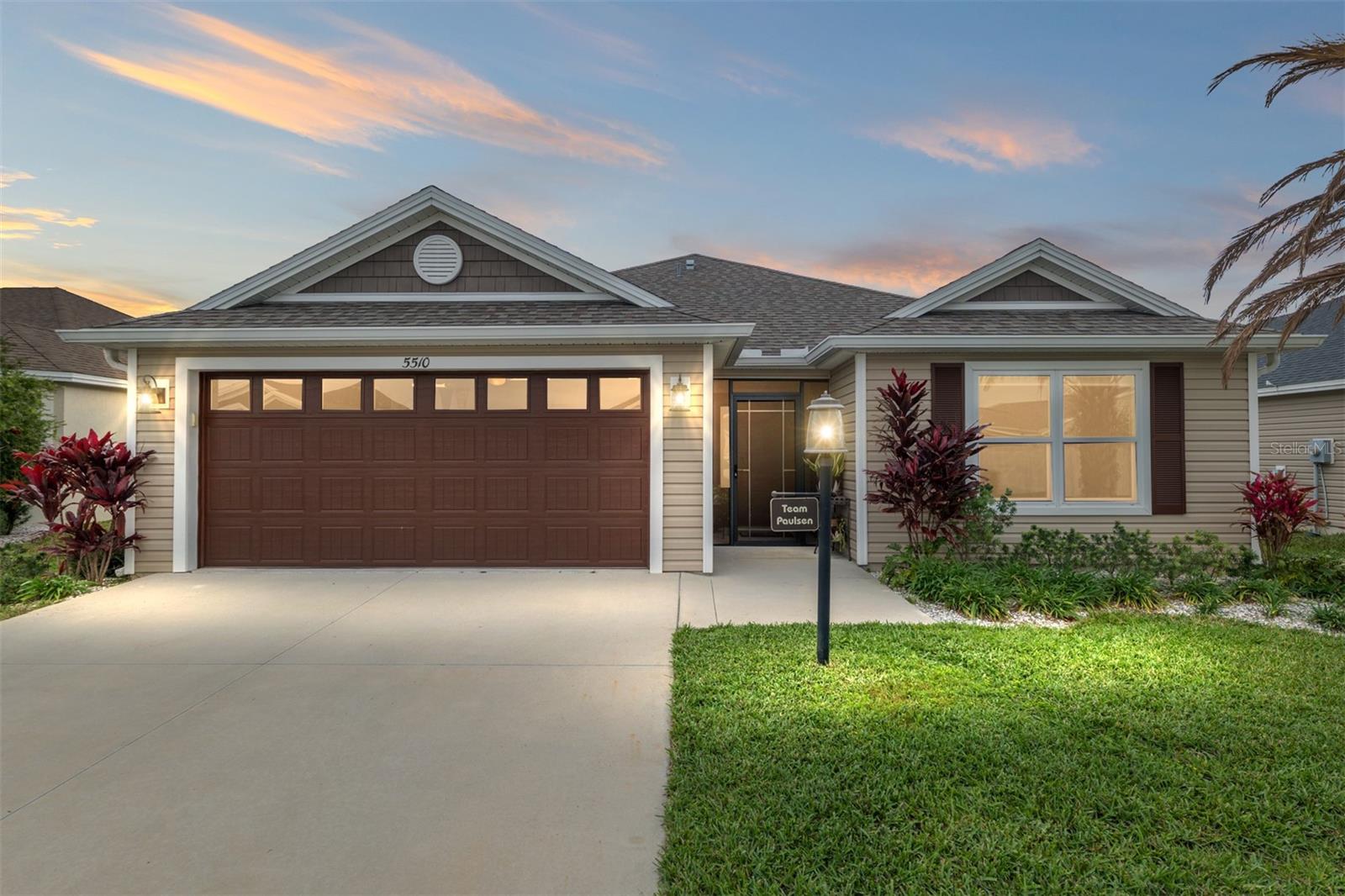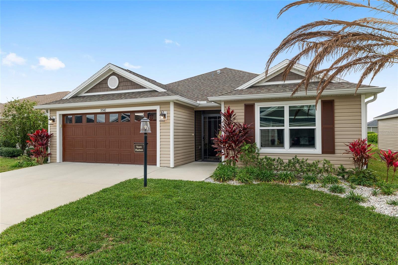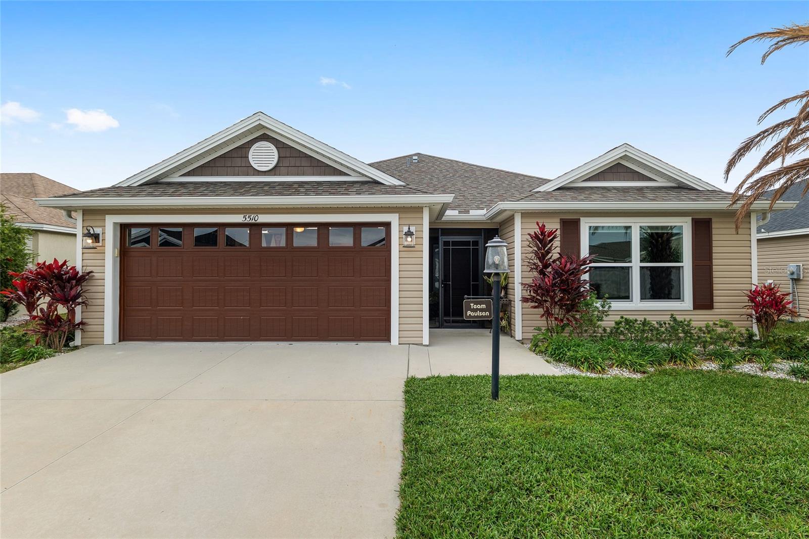 ~4-YEAR-OLD HOME~ ~NO CARPET~ ~LVP FLOORING~ ~WALK-IN PANTRY~ ~BUTCHER BLOCK ISLAND~ ~PRIVACY LANDSCAPING~ Come see this 3/2 Tall Pine in the vibrant Village of Hawkins. It is totally updated with consistent luxury vinyl plank flooring throughout the entire house. The pleasant foyer ushers you into the inviting HIGH-CEILING living/kitchen/dining area where you will view the colorful shrubbery outdoors. The enlarged custom BUTCHER BLOCK ISLAND accommodates both diners and workspace admirably. Bakers will love the upgraded range with convection oven. The kitchen tile backsplash stretches to the ceiling for the consummate look. A totally fitted WALK-IN PANTRY augments the kitchen. The primary bedroom flaunts a TRAY CEILING. Primary bath cabinet, trimmed with TILE BACKSPLASH, was switched to single sink with 6 drawers for beaucoup storage. The original DOUBLE SINK CABINET has been adeptly retained for reinstallation, if you prefer. The primary WALK-IN SHOWER is nicely outfitted with a practical bench. Two guest bedrooms can be closed off with the guest bath via pocket door from the foyer. Safety is increased with the guest bath tub conversion to WALK-IN SHOWER. All closets are fitted with built-in shelves and hanging space. In addition, the primary OVERSIZED WALK-IN CLOSET is equipped with drawers for organized access. All windows have custom coverings including room-darkening level in each bedroom. The LANAI IS ENLARGED with 9x9 BIRDCAGE over patio so no mosquito attack while grilling. The rear of the home has been impressively secluded with gorgeous PRIVACY LANDSCAPING. WHOLE HOUSE WATER FILTRATION freshens the water supply. A cleaner front entry is maintained with an added screen. The 2-CAR GARAGE houses a tub sink in cabinet with storage. Work out at nearby Everglades or Ezell Regional Rec Centers. Aviary family and Hawkins adult pools are short golf cart rides away. Enjoy an evening of music and dancing at nearby Sawgrass Grove. Tackle the links at Southern Oaks Championship Golf Course. Just a little further, you'll find 6 executive golf courses, Mickey Lee Pitch & Putt, Edna's, Magnolia Plaza, Lake Deaton Plaza, and Brownwood Paddock Square. Middleton and Eastport are not far, so you can enjoy concerts at The Tracy.