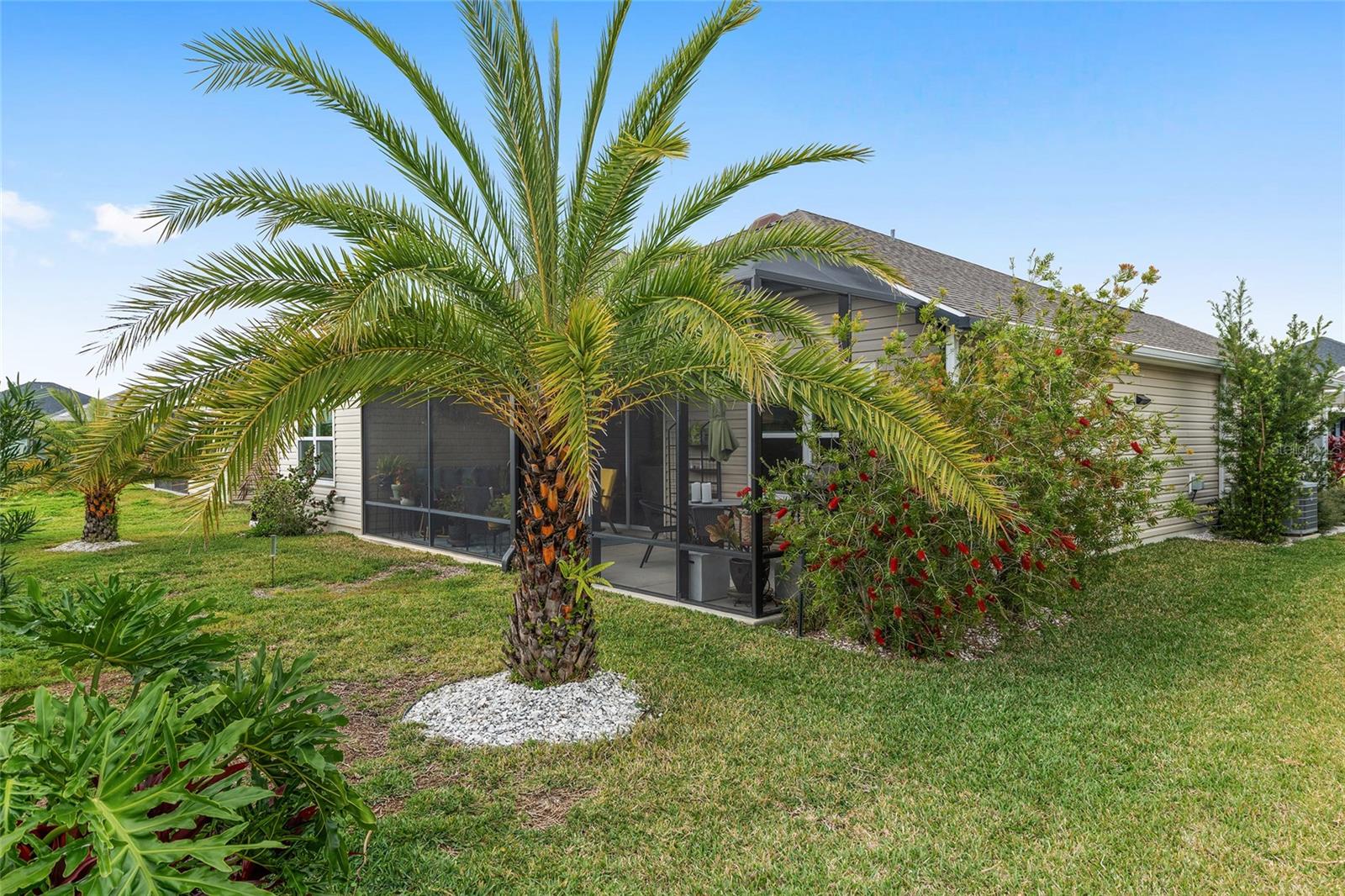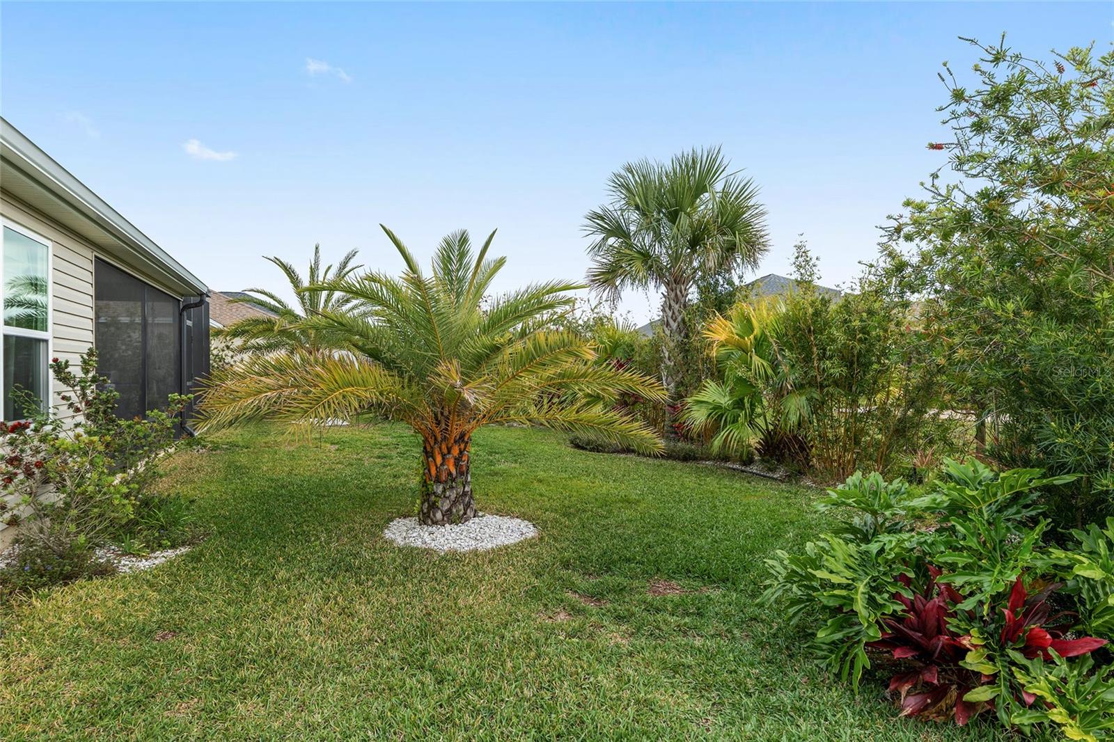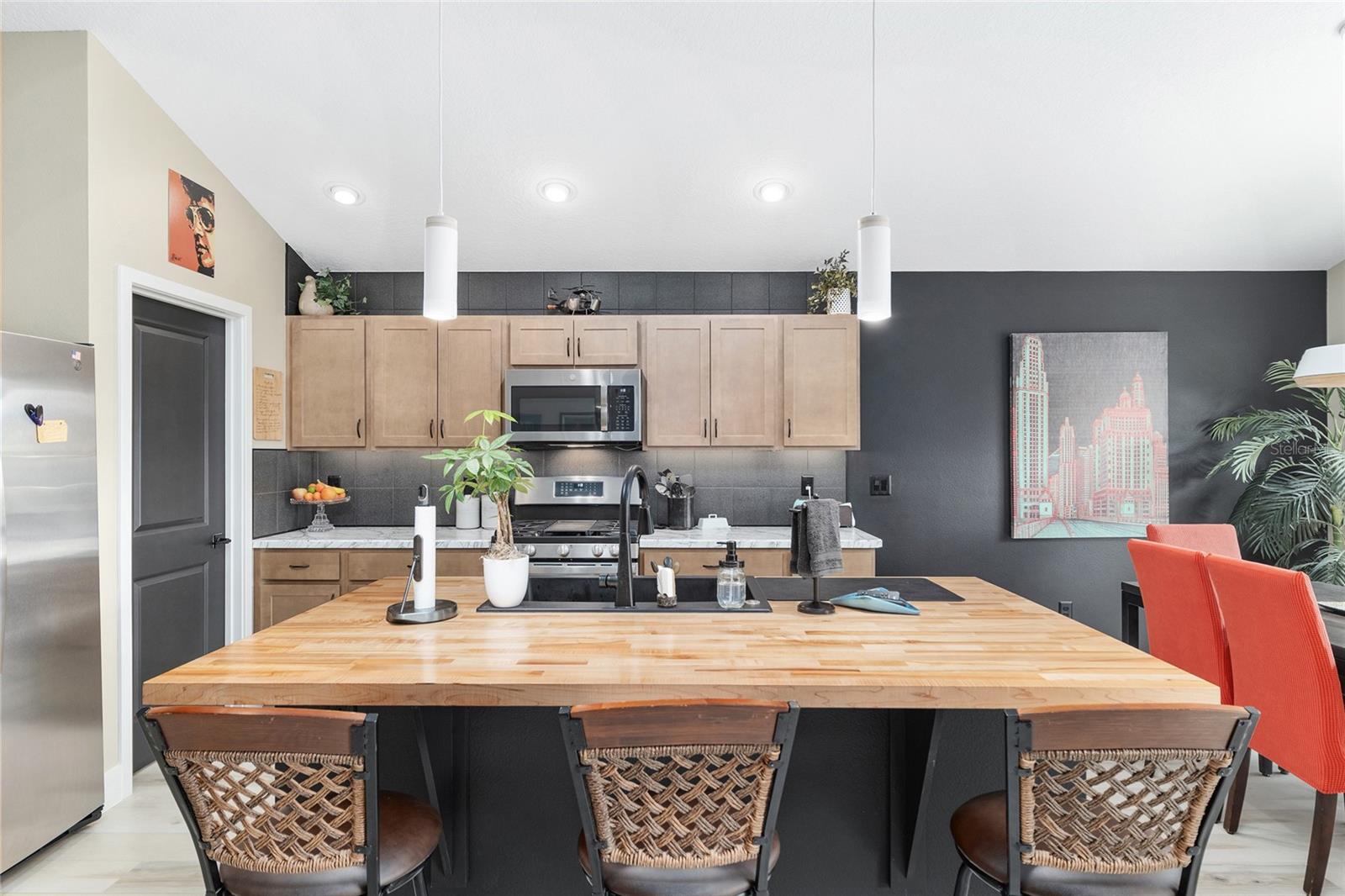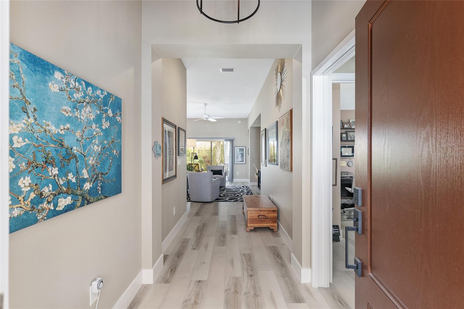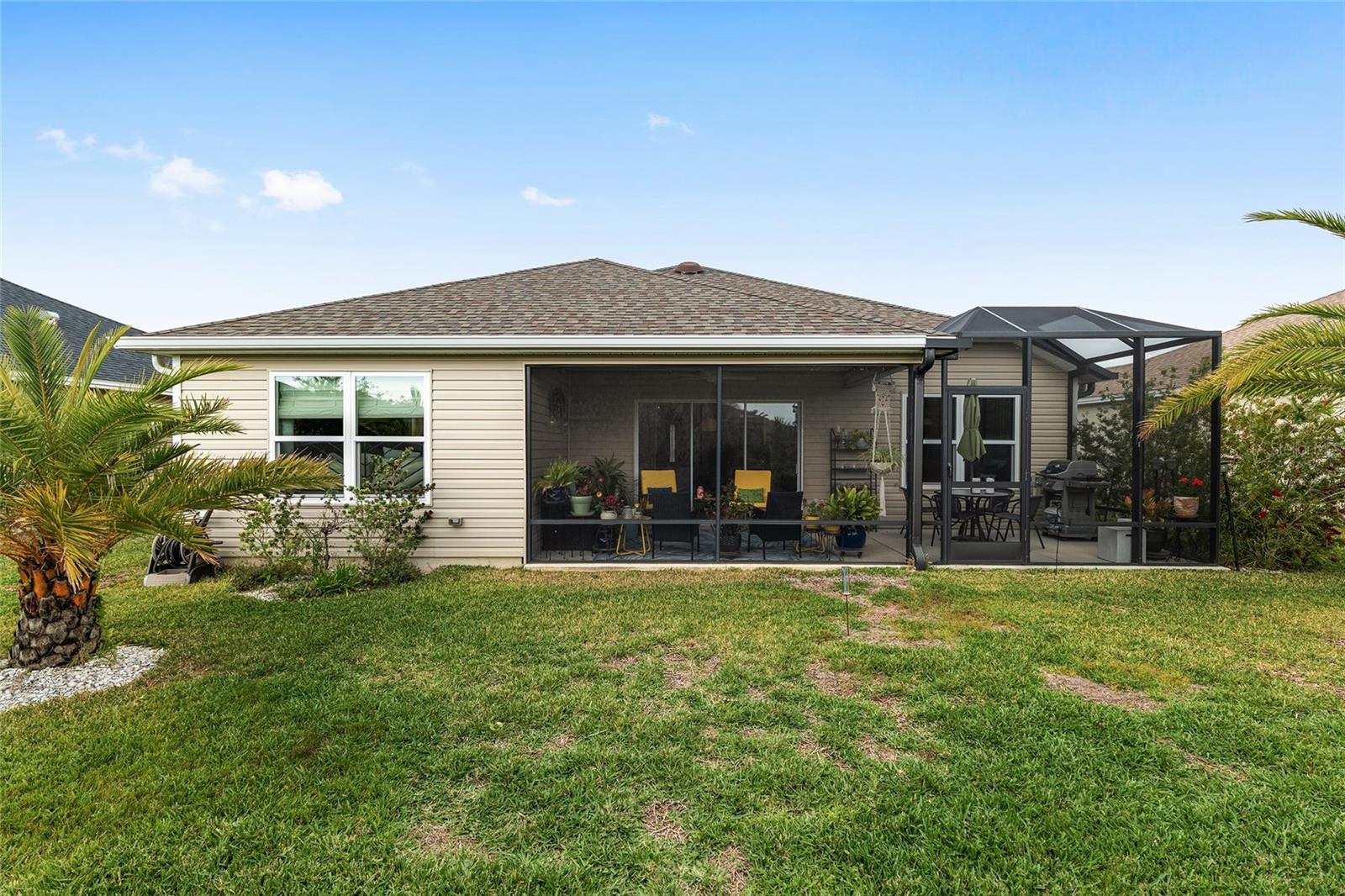 ~4-YEAR-OLD HOME~ ~NO CARPET~ ~LVP FLOORING~ ~WALK-IN PANTRY~ ~BUTCHER BLOCK ISLAND~ ~PRIVACY LANDSCAPING~ Come see this 3/2 Tall Pine in the vibrant Village of Hawkins. It is totally updated with consistent luxury vinyl plank flooring throughout the entire house. The pleasant foyer ushers you into the inviting HIGH-CEILING living/kitchen/dining area where you will view the colorful shrubbery outdoors. The enlarged custom BUTCHER BLOCK ISLAND accommodates both diners and workspace admirably. Bakers will love the upgraded range with convection oven. The kitchen tile backsplash stretches to the ceiling for the consummate look. A totally fitted WALK-IN PANTRY augments the kitchen. The primary bedroom flaunts a TRAY CEILING. Primary bath cabinet, trimmed with TILE BACKSPLASH, was switched to single sink with 6 drawers for beaucoup storage. The original DOUBLE SINK CABINET has been adeptly retained for reinstallation, if you prefer. The primary WALK-IN SHOWER is nicely outfitted with a practical bench. Two guest bedrooms can be closed off with the guest bath via pocket door from the foyer. Safety is increased with the guest bath tub conversion to WALK-IN SHOWER. All closets are fitted with built-in shelves and hanging space. In addition, the primary OVERSIZED WALK-IN CLOSET is equipped with drawers for organized access. All windows have custom coverings including room-darkening level in each bedroom. The LANAI IS ENLARGED with 9x9 BIRDCAGE over patio so no mosquito attack while grilling. The rear of the home has been impressively secluded with gorgeous PRIVACY LANDSCAPING. WHOLE HOUSE WATER FILTRATION freshens the water supply. A cleaner front entry is maintained with an added screen. The 2-CAR GARAGE houses a tub sink in cabinet with storage. Work out at nearby Everglades or Ezell Regional Rec Centers. Aviary family and Hawkins adult pools are short golf cart rides away. Enjoy an evening of music and dancing at nearby Sawgrass Grove. Tackle the links at Southern Oaks Championship Golf Course. Just a little further, you'll find 6 executive golf courses, Mickey Lee Pitch & Putt, Edna's, Magnolia Plaza, Lake Deaton Plaza, and Brownwood Paddock Square. Middleton and Eastport are not far, so you can enjoy concerts at The Tracy.