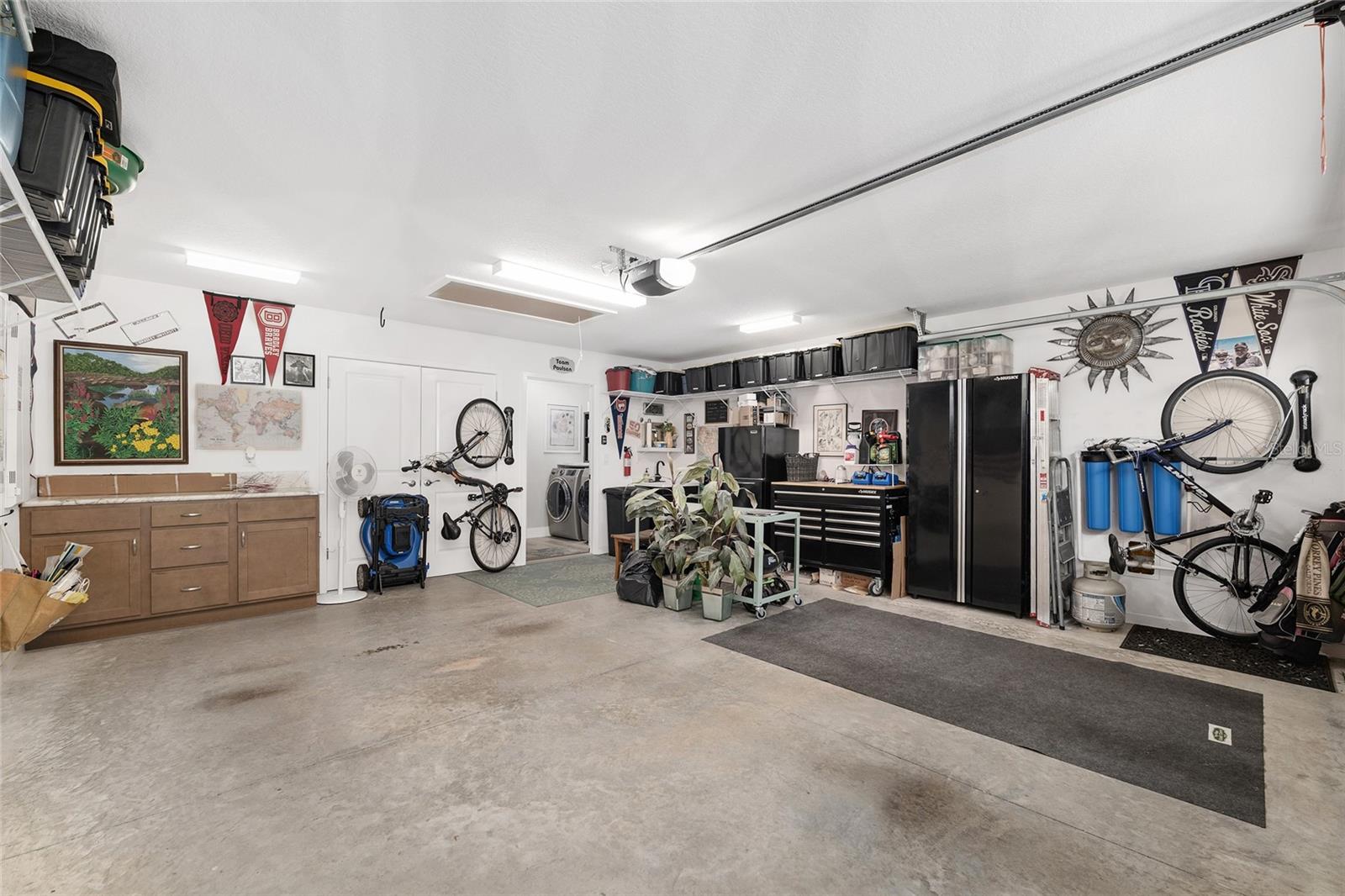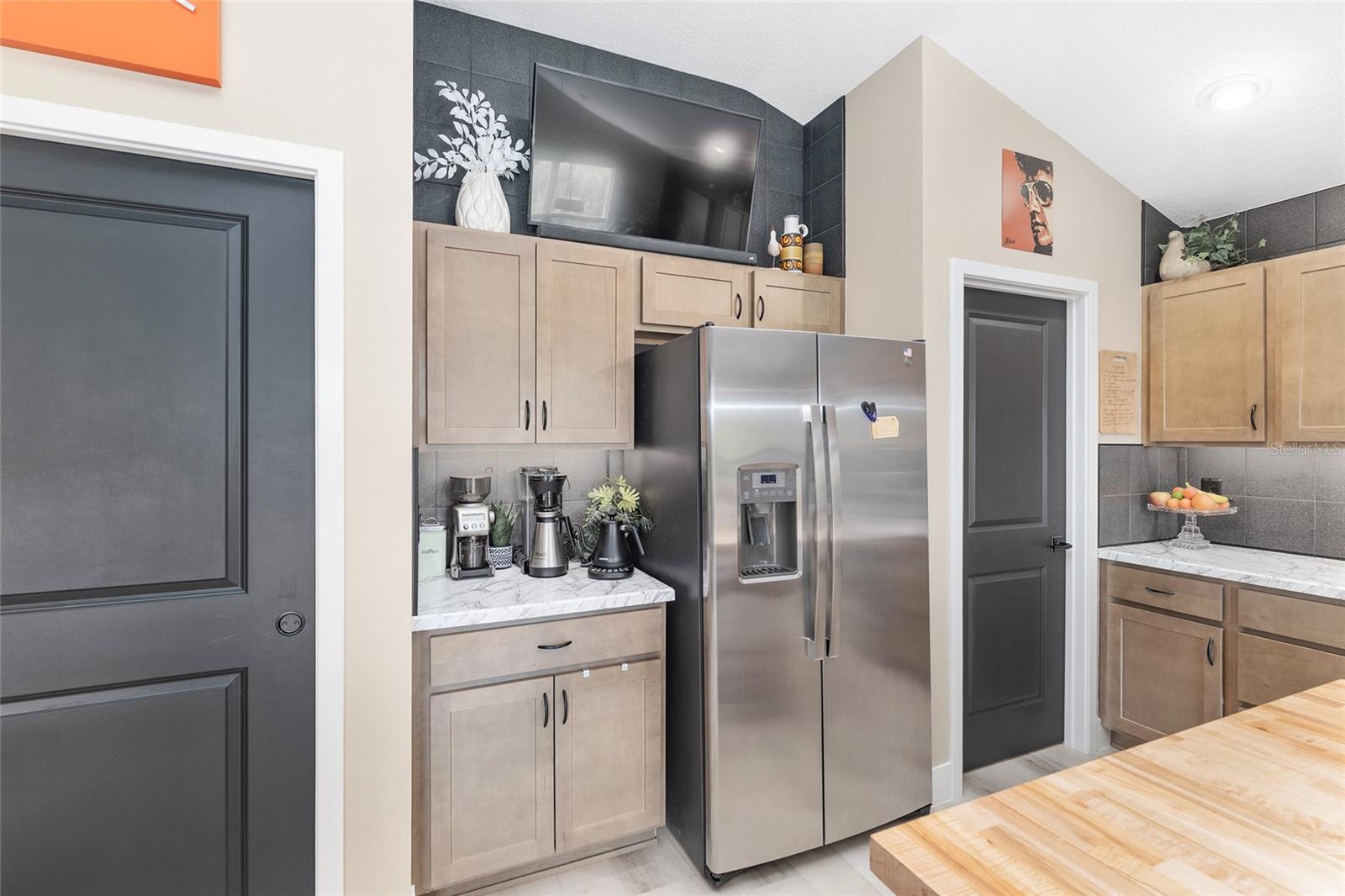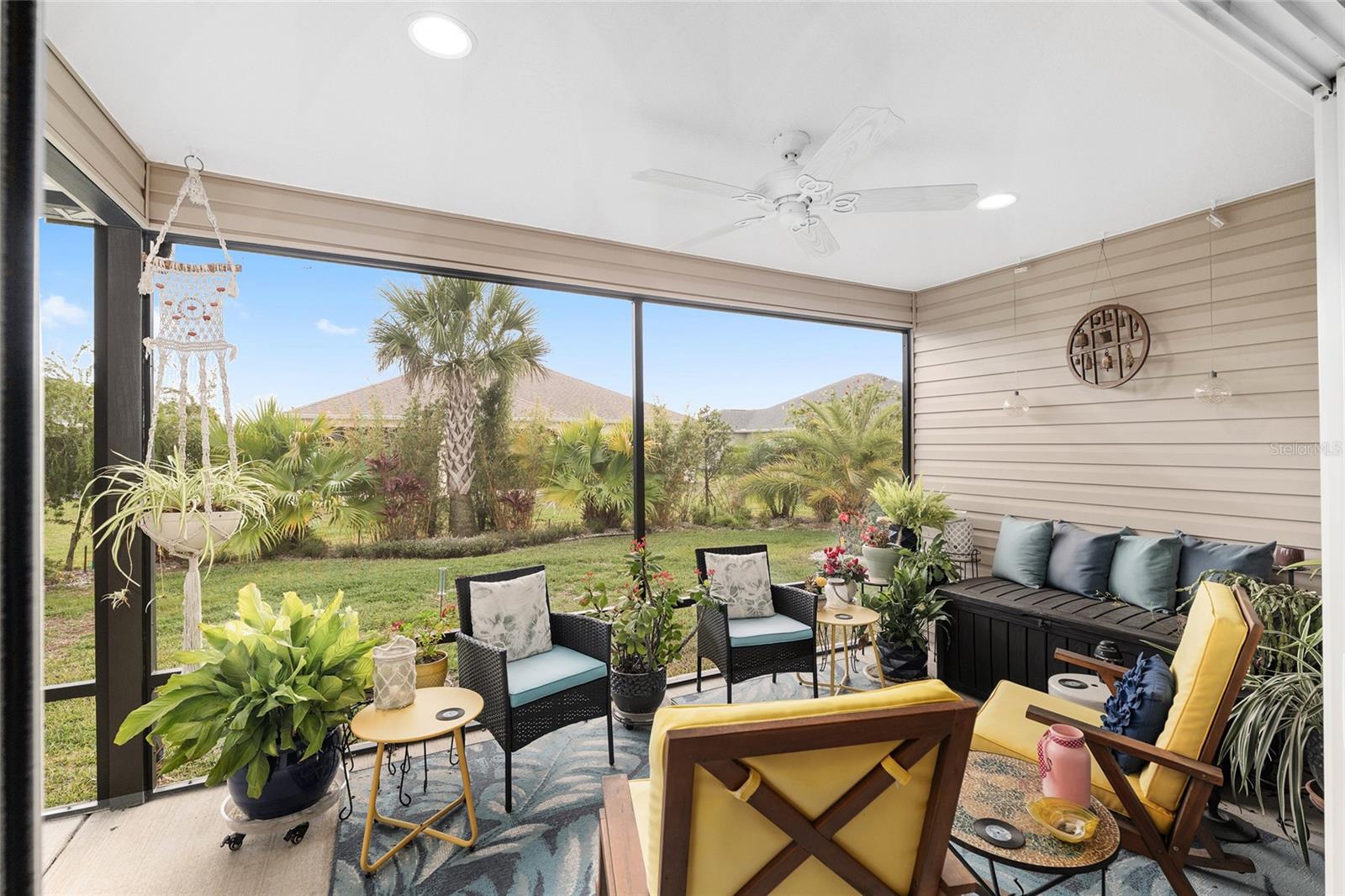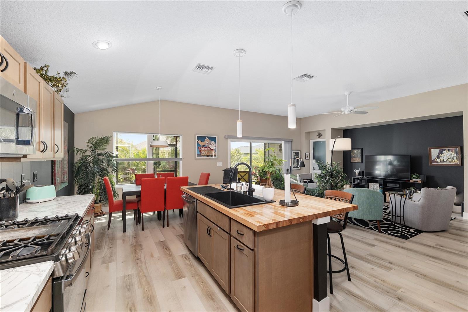 ~4-YEAR-OLD HOME~ ~NO CARPET~ ~LVP FLOORING~ ~WALK-IN PANTRY~ ~BUTCHER BLOCK ISLAND~ ~PRIVACY LANDSCAPING~ Come see this 3/2 Tall Pine in the vibrant Village of Hawkins. It is totally updated with consistent luxury vinyl plank flooring throughout the entire house. The pleasant foyer ushers you into the inviting HIGH-CEILING living/kitchen/dining area where you will view the colorful shrubbery outdoors. The enlarged custom BUTCHER BLOCK ISLAND accommodates both diners and workspace admirably. Bakers will love the upgraded range with convection oven. The kitchen tile backsplash stretches to the ceiling for the consummate look. A totally fitted WALK-IN PANTRY augments the kitchen. The primary bedroom flaunts a TRAY CEILING. Primary bath cabinet, trimmed with TILE BACKSPLASH, was switched to single sink with 6 drawers for beaucoup storage. The original DOUBLE SINK CABINET has been adeptly retained for reinstallation, if you prefer. The primary WALK-IN SHOWER is nicely outfitted with a practical bench. Two guest bedrooms can be closed off with the guest bath via pocket door from the foyer. Safety is increased with the guest bath tub conversion to WALK-IN SHOWER. All closets are fitted with built-in shelves and hanging space. In addition, the primary OVERSIZED WALK-IN CLOSET is equipped with drawers for organized access. All windows have custom coverings including room-darkening level in each bedroom. The LANAI IS ENLARGED with 9x9 BIRDCAGE over patio so no mosquito attack while grilling. The rear of the home has been impressively secluded with gorgeous PRIVACY LANDSCAPING. WHOLE HOUSE WATER FILTRATION freshens the water supply. A cleaner front entry is maintained with an added screen. The 2-CAR GARAGE houses a tub sink in cabinet with storage. Work out at nearby Everglades or Ezell Regional Rec Centers. Aviary family and Hawkins adult pools are short golf cart rides away. Enjoy an evening of music and dancing at nearby Sawgrass Grove. Tackle the links at Southern Oaks Championship Golf Course. Just a little further, you'll find 6 executive golf courses, Mickey Lee Pitch & Putt, Edna's, Magnolia Plaza, Lake Deaton Plaza, and Brownwood Paddock Square. Middleton and Eastport are not far, so you can enjoy concerts at The Tracy.