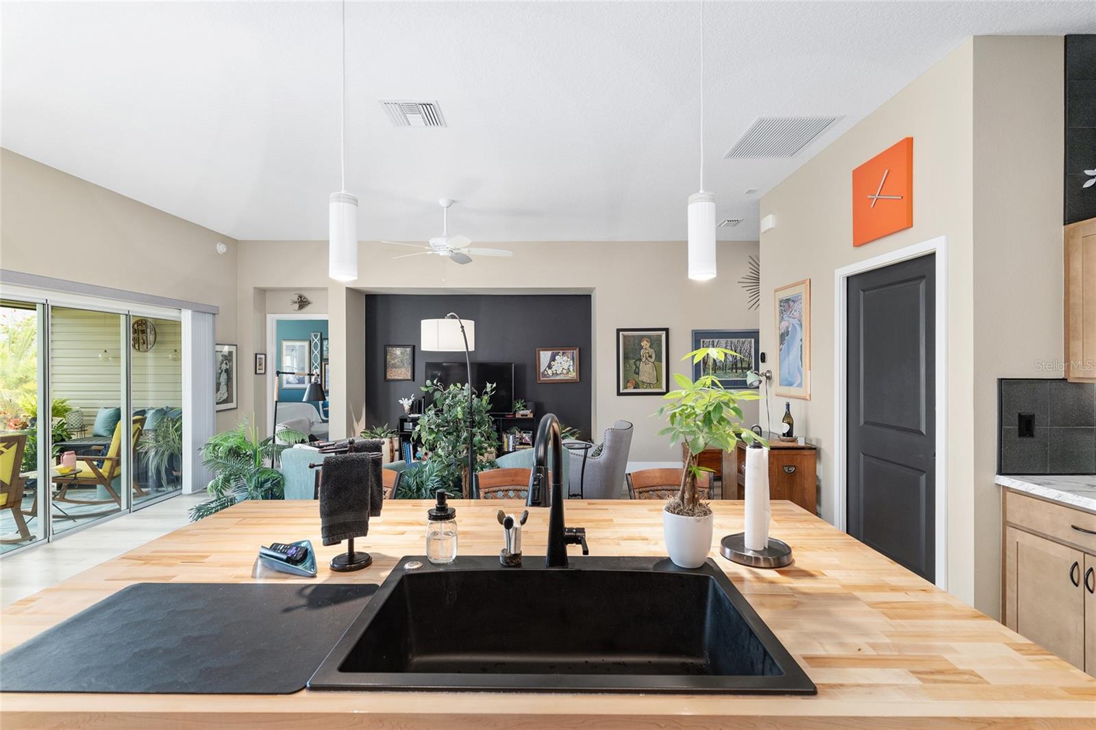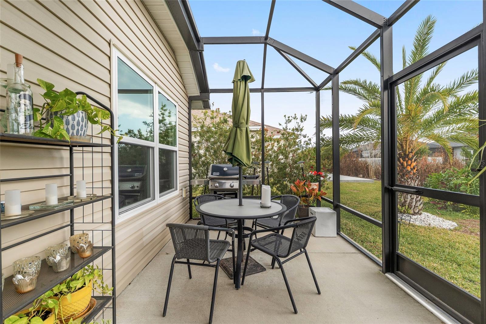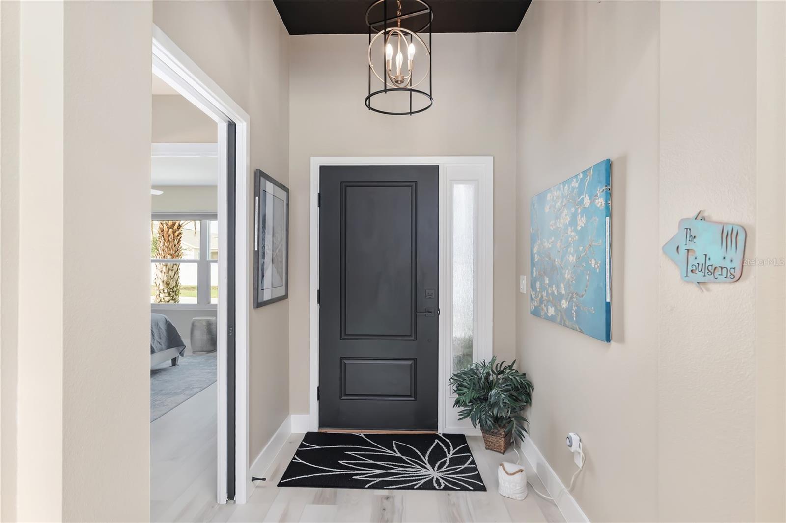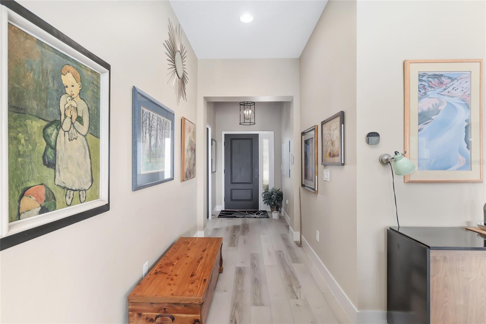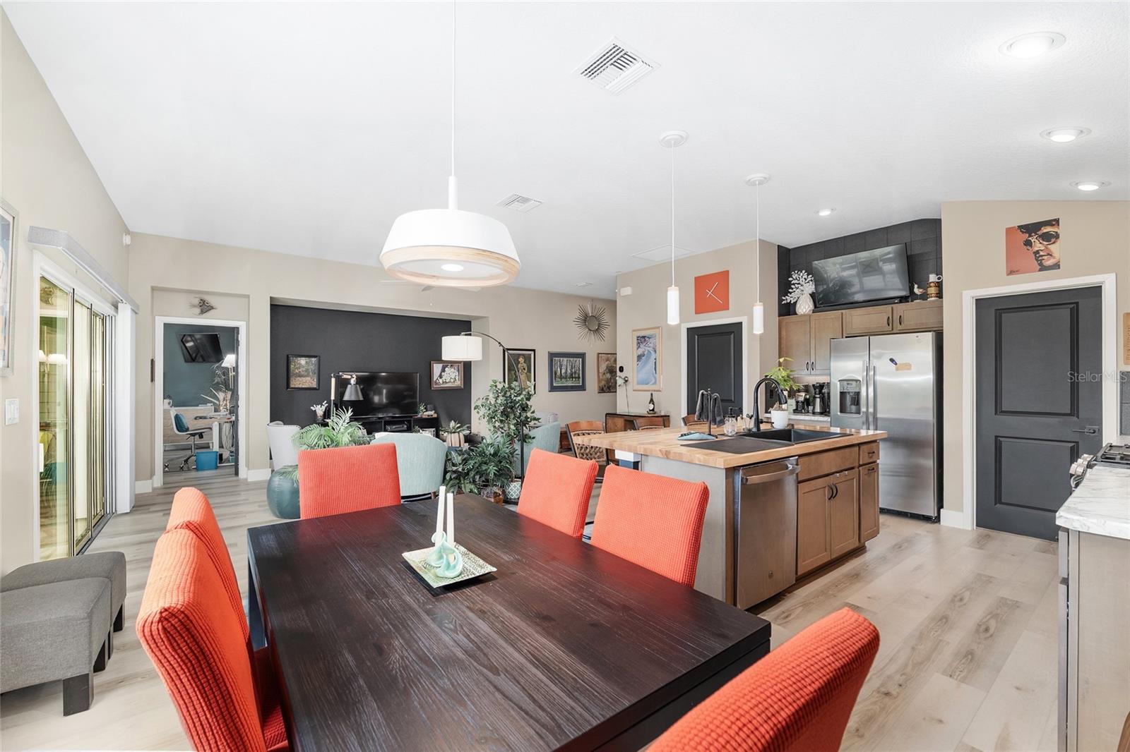 ~4-YEAR-OLD HOME~ ~NO CARPET~ ~LVP FLOORING~ ~WALK-IN PANTRY~ ~BUTCHER BLOCK ISLAND~ ~PRIVACY LANDSCAPING~ Come see this 3/2 Tall Pine in the vibrant Village of Hawkins. It is totally updated with consistent luxury vinyl plank flooring throughout the entire house. The pleasant foyer ushers you into the inviting HIGH-CEILING living/kitchen/dining area where you will view the colorful shrubbery outdoors. The enlarged custom BUTCHER BLOCK ISLAND accommodates both diners and workspace admirably. Bakers will love the upgraded range with convection oven. The kitchen tile backsplash stretches to the ceiling for the consummate look. A totally fitted WALK-IN PANTRY augments the kitchen. The primary bedroom flaunts a TRAY CEILING. Primary bath cabinet, trimmed with TILE BACKSPLASH, was switched to single sink with 6 drawers for beaucoup storage. The original DOUBLE SINK CABINET has been adeptly retained for reinstallation, if you prefer. The primary WALK-IN SHOWER is nicely outfitted with a practical bench. Two guest bedrooms can be closed off with the guest bath via pocket door from the foyer. Safety is increased with the guest bath tub conversion to WALK-IN SHOWER. All closets are fitted with built-in shelves and hanging space. In addition, the primary OVERSIZED WALK-IN CLOSET is equipped with drawers for organized access. All windows have custom coverings including room-darkening level in each bedroom. The LANAI IS ENLARGED with 9x9 BIRDCAGE over patio so no mosquito attack while grilling. The rear of the home has been impressively secluded with gorgeous PRIVACY LANDSCAPING. WHOLE HOUSE WATER FILTRATION freshens the water supply. A cleaner front entry is maintained with an added screen. The 2-CAR GARAGE houses a tub sink in cabinet with storage. Work out at nearby Everglades or Ezell Regional Rec Centers. Aviary family and Hawkins adult pools are short golf cart rides away. Enjoy an evening of music and dancing at nearby Sawgrass Grove. Tackle the links at Southern Oaks Championship Golf Course. Just a little further, you'll find 6 executive golf courses, Mickey Lee Pitch & Putt, Edna's, Magnolia Plaza, Lake Deaton Plaza, and Brownwood Paddock Square. Middleton and Eastport are not far, so you can enjoy concerts at The Tracy.