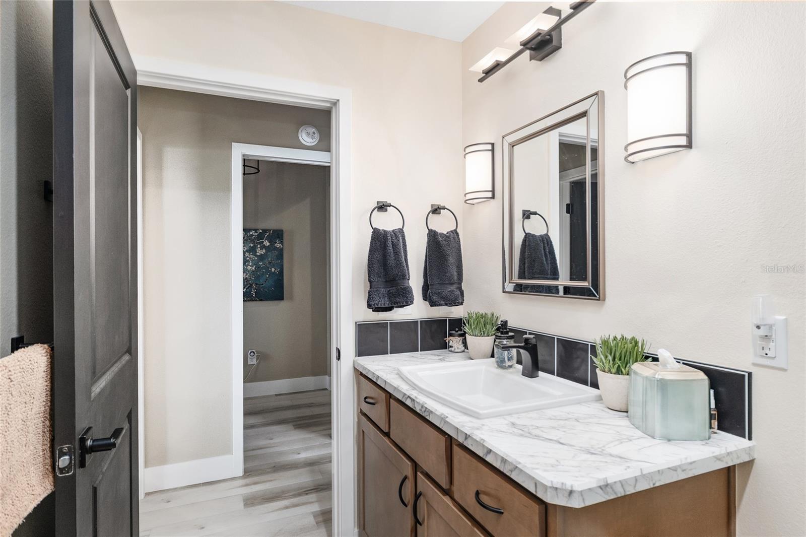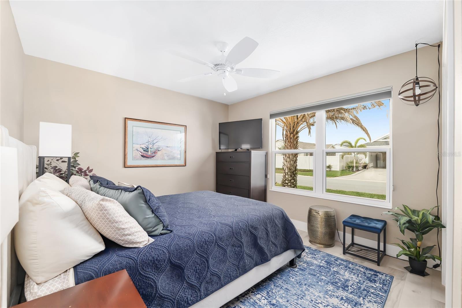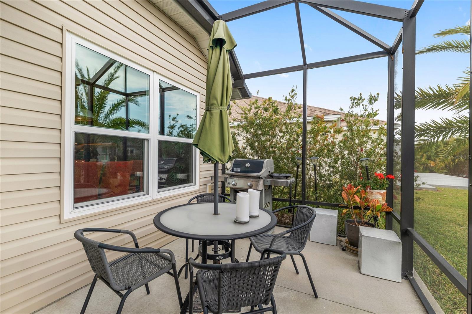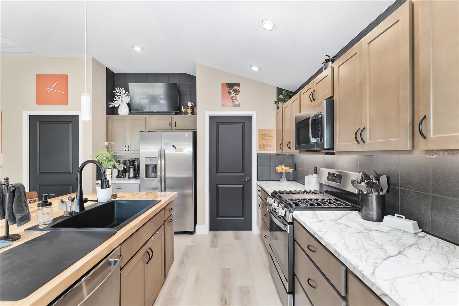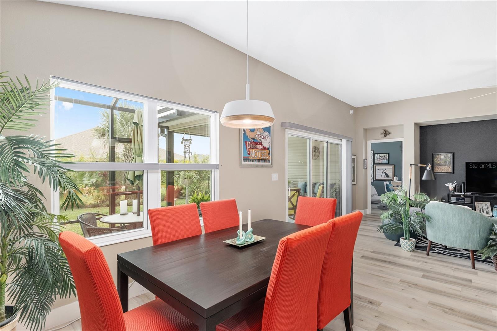 ~4-YEAR-OLD HOME~ ~NO CARPET~ ~LVP FLOORING~ ~WALK-IN PANTRY~ ~BUTCHER BLOCK ISLAND~ ~PRIVACY LANDSCAPING~ Come see this 3/2 Tall Pine in the vibrant Village of Hawkins. It is totally updated with consistent luxury vinyl plank flooring throughout the entire house. The pleasant foyer ushers you into the inviting HIGH-CEILING living/kitchen/dining area where you will view the colorful shrubbery outdoors. The enlarged custom BUTCHER BLOCK ISLAND accommodates both diners and workspace admirably. Bakers will love the upgraded range with convection oven. The kitchen tile backsplash stretches to the ceiling for the consummate look. A totally fitted WALK-IN PANTRY augments the kitchen. The primary bedroom flaunts a TRAY CEILING. Primary bath cabinet, trimmed with TILE BACKSPLASH, was switched to single sink with 6 drawers for beaucoup storage. The original DOUBLE SINK CABINET has been adeptly retained for reinstallation, if you prefer. The primary WALK-IN SHOWER is nicely outfitted with a practical bench. Two guest bedrooms can be closed off with the guest bath via pocket door from the foyer. Safety is increased with the guest bath tub conversion to WALK-IN SHOWER. All closets are fitted with built-in shelves and hanging space. In addition, the primary OVERSIZED WALK-IN CLOSET is equipped with drawers for organized access. All windows have custom coverings including room-darkening level in each bedroom. The LANAI IS ENLARGED with 9x9 BIRDCAGE over patio so no mosquito attack while grilling. The rear of the home has been impressively secluded with gorgeous PRIVACY LANDSCAPING. WHOLE HOUSE WATER FILTRATION freshens the water supply. A cleaner front entry is maintained with an added screen. The 2-CAR GARAGE houses a tub sink in cabinet with storage. Work out at nearby Everglades or Ezell Regional Rec Centers. Aviary family and Hawkins adult pools are short golf cart rides away. Enjoy an evening of music and dancing at nearby Sawgrass Grove. Tackle the links at Southern Oaks Championship Golf Course. Just a little further, you'll find 6 executive golf courses, Mickey Lee Pitch & Putt, Edna's, Magnolia Plaza, Lake Deaton Plaza, and Brownwood Paddock Square. Middleton and Eastport are not far, so you can enjoy concerts at The Tracy.