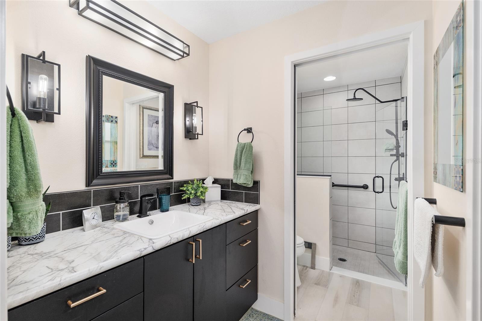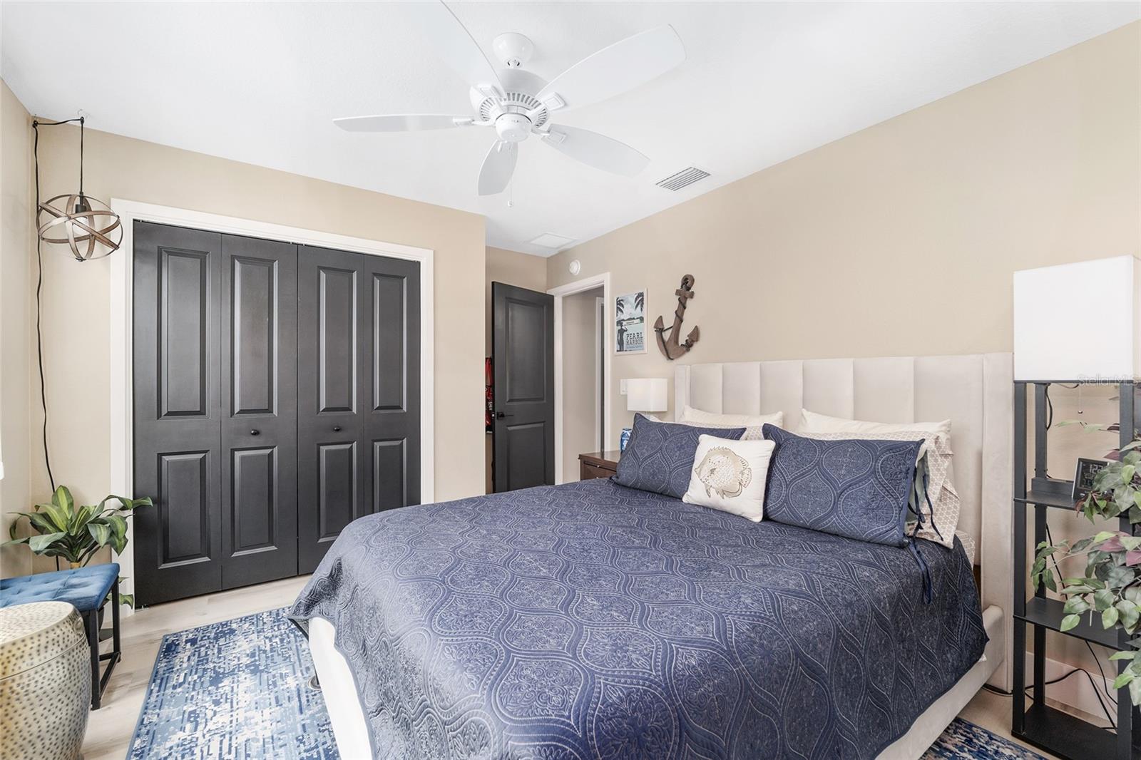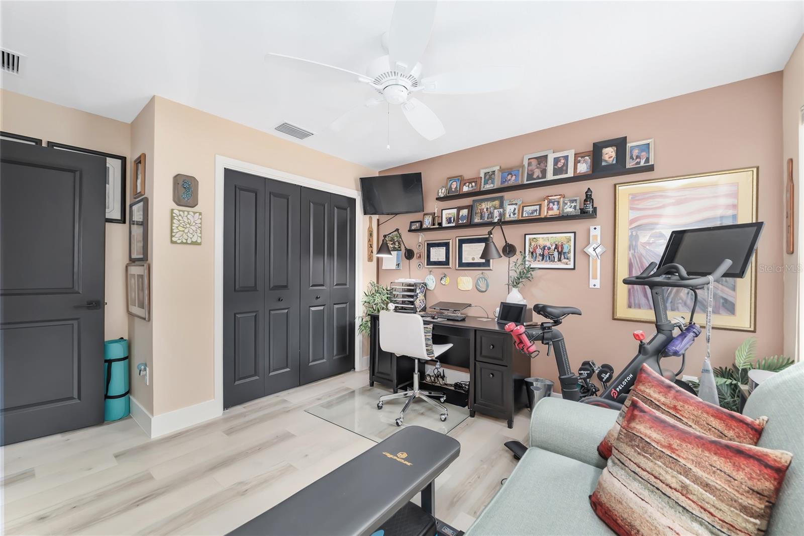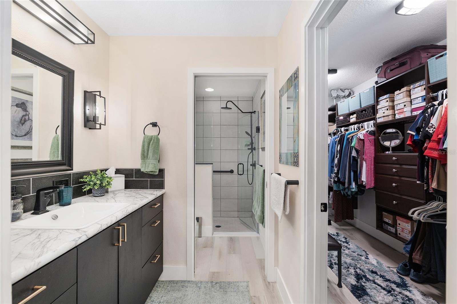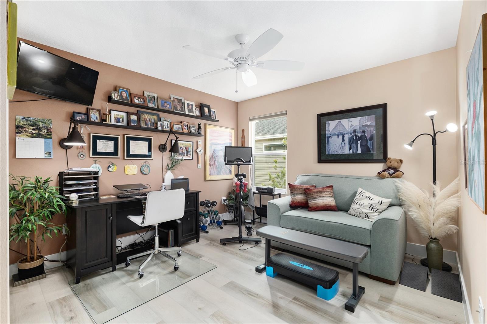 ~4-YEAR-OLD HOME~ ~NO CARPET~ ~LVP FLOORING~ ~WALK-IN PANTRY~ ~BUTCHER BLOCK ISLAND~ ~PRIVACY LANDSCAPING~ Come see this 3/2 Tall Pine in the vibrant Village of Hawkins. It is totally updated with consistent luxury vinyl plank flooring throughout the entire house. The pleasant foyer ushers you into the inviting HIGH-CEILING living/kitchen/dining area where you will view the colorful shrubbery outdoors. The enlarged custom BUTCHER BLOCK ISLAND accommodates both diners and workspace admirably. Bakers will love the upgraded range with convection oven. The kitchen tile backsplash stretches to the ceiling for the consummate look. A totally fitted WALK-IN PANTRY augments the kitchen. The primary bedroom flaunts a TRAY CEILING. Primary bath cabinet, trimmed with TILE BACKSPLASH, was switched to single sink with 6 drawers for beaucoup storage. The original DOUBLE SINK CABINET has been adeptly retained for reinstallation, if you prefer. The primary WALK-IN SHOWER is nicely outfitted with a practical bench. Two guest bedrooms can be closed off with the guest bath via pocket door from the foyer. Safety is increased with the guest bath tub conversion to WALK-IN SHOWER. All closets are fitted with built-in shelves and hanging space. In addition, the primary OVERSIZED WALK-IN CLOSET is equipped with drawers for organized access. All windows have custom coverings including room-darkening level in each bedroom. The LANAI IS ENLARGED with 9x9 BIRDCAGE over patio so no mosquito attack while grilling. The rear of the home has been impressively secluded with gorgeous PRIVACY LANDSCAPING. WHOLE HOUSE WATER FILTRATION freshens the water supply. A cleaner front entry is maintained with an added screen. The 2-CAR GARAGE houses a tub sink in cabinet with storage. Work out at nearby Everglades or Ezell Regional Rec Centers. Aviary family and Hawkins adult pools are short golf cart rides away. Enjoy an evening of music and dancing at nearby Sawgrass Grove. Tackle the links at Southern Oaks Championship Golf Course. Just a little further, you'll find 6 executive golf courses, Mickey Lee Pitch & Putt, Edna's, Magnolia Plaza, Lake Deaton Plaza, and Brownwood Paddock Square. Middleton and Eastport are not far, so you can enjoy concerts at The Tracy.