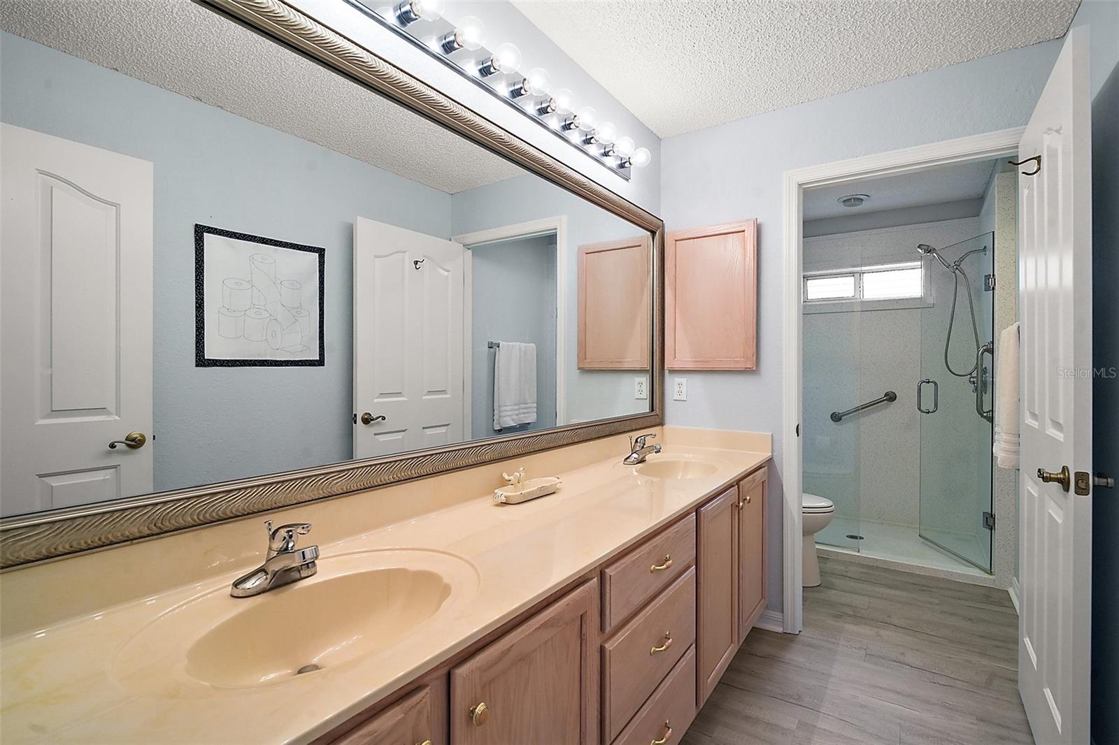 SPACIOUS 2900 sq ft HOME the perfect PREMIER, BELMONT model on HACIENDA HILLS "The Palms" CHAMPIONSHIP GOLF COURSE W/ a GORGEOUS PANORAMIC VIEW in The Village of SANTO DOMINGO. BOND PAID. When you step into the house, you're greeted by a spacious foyer featuring a high ceiling and luxury vinyl flooring that flows throughout the home. The hallway leads you to two roomy bedrooms, each with large windows and oversized closets, complete with fan/light combos which is ideal for guests. Conveniently situated between the bedrooms is a guest bathroom equipped with two sinks, a large mirror, and a private door leading to the toilet and a walk-in glass shower. As you move into the main living area, you'll appreciate the open floor plan, which creates an inviting space for entertaining. Adjacent to the living room is a sizable office with built-in features, perfect for all your work needs. There's also a half bath conveniently located off the living room. The living room itself is a versatile area that you can style to your liking, offering views of the golf course in the back. The open kitchen offers great countertop space, an eat-at bar, a raised stainless-steel dishwasher, a gas stove, and plenty of cabinets for storage. The laundry room is equipped with a sink, cabinets, and a large pantry/storage area with a door. The owner's suite is a bright and spacious retreat with golf course views, a sliding door leading to the enclosed lanai, a large closet, and an en suite bathroom featuring double sinks, a makeup area, cabinets, a toilet, and a walk-in shower. The enclosed 330 sq ft lanai provides stunning panoramic views of the beautiful Championship Golf Course, making it a perfect spot for a quiet evening or entertaining guests. ROOF 2019 - Air conditioner 2024. Hacienda Hills Championship Golf Course is 27-hole and nearby is El Santiago & El Diablo Executive Courses. Recreation Center close by where there's Bocce, Pickleball, Shuffleboard, & Tennis. Come see it for yourself. What an opportunity to get such a Beautiful Home in prime location on a Championship golf course. CALL today to see this BEAUTY!