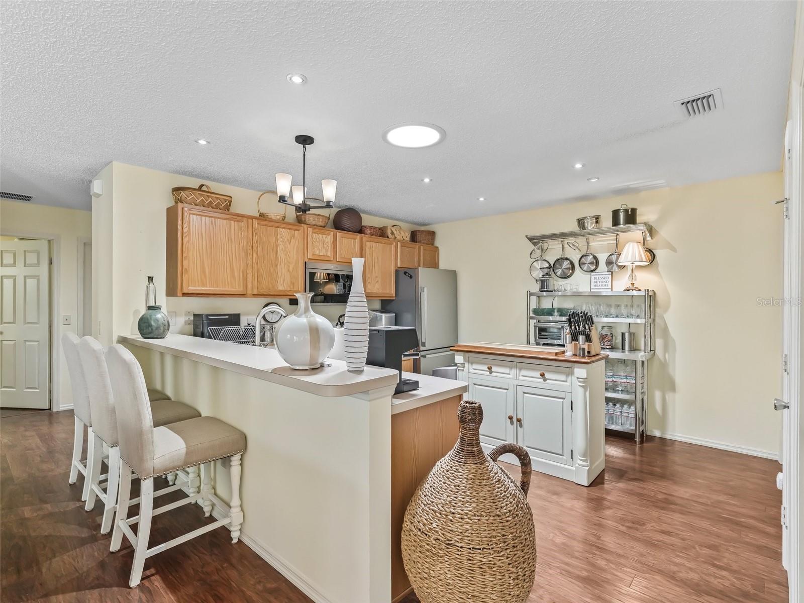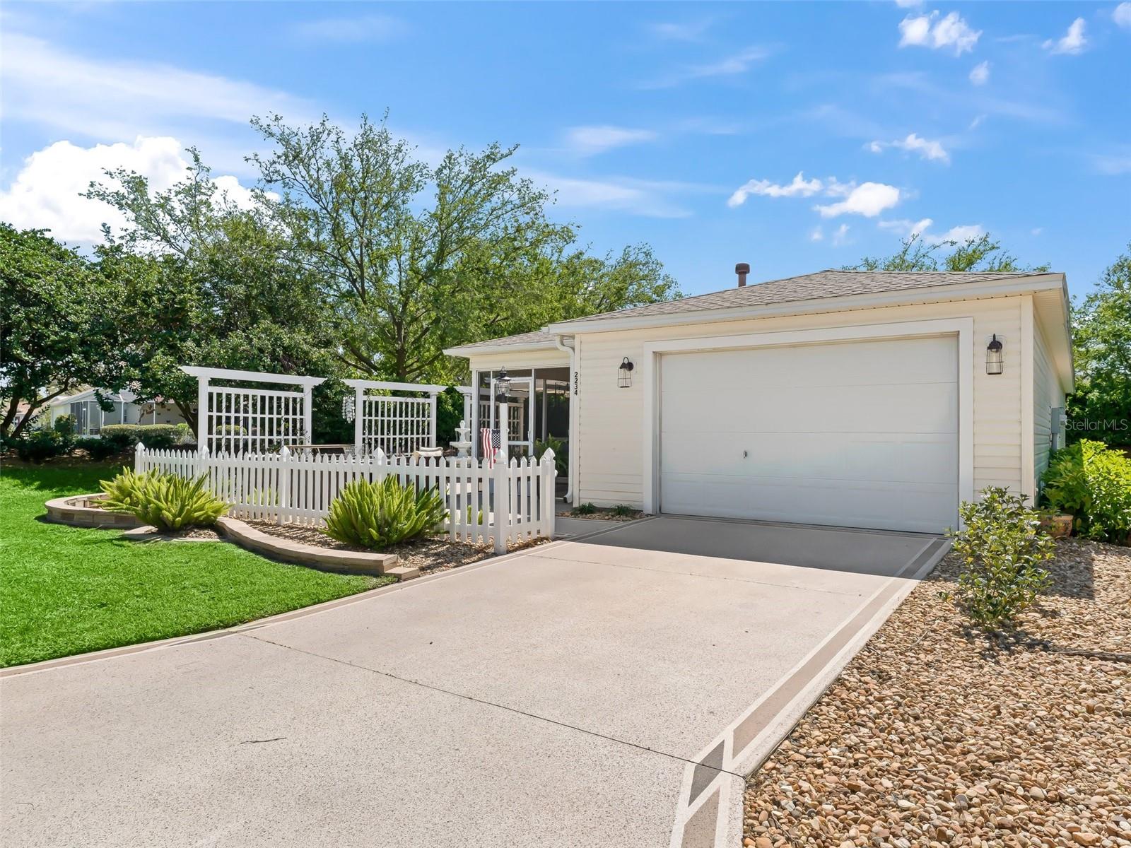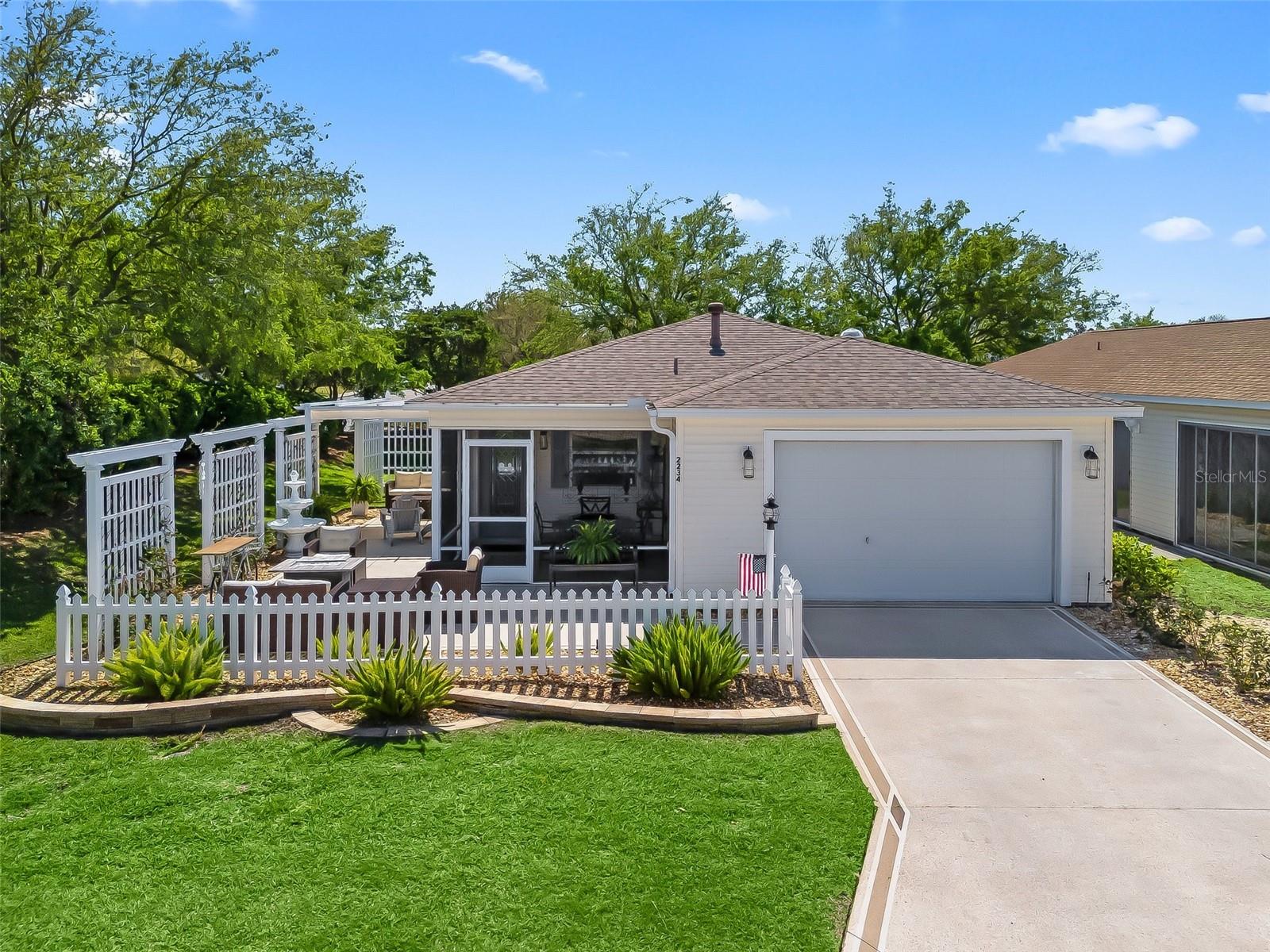 Located in The Village of Ashland! TURNKEY Exceptional 2/2 Colony Patio Villa in BELLAMY VILLAS, on a Private Dead End Street in the Village of Ashland with a Front Screened Lanai! ROOF 2020! No Carpet! Laminate Flooring Throughout! This charming home offers both Rear, and Side Privacy with a Fantastic Outdoor Living Space, just perfect for entertaining friends, and family! You will be Impressed by the Tremendous Curb Appeal featuring Meticulously maintained Lush Tropical Professional Landscaping, Painted Concrete Driveway, Front Patio, Large Pergola Covered Private Side Patio, and Front Screened Lanai with an Elegant Leaded Glass Door! The Dining and Living area combination create a Spacious gathering area anchored by the Light, Bright Kitchen featuring a Generous breakfast bar, Wood cabinetry, Stainless appliances, Pantry closet, and 5 Solar Tubes, total! This Colony Patio Villa showcases a Well designed Outdoor Oasis, and a Fantastic Abundance of Privacy, a Rare Gem in The Villages! The Primary suite provides the owner with a Walk in Closet, and an En suite bathroom. The En suite bathroom features a Solar tube, Walk in Shower, and a Nice size wood vanity! The 1 1/2 Car Garage has Epoxy floor, Utility sink, and additional cabinet space, perfect for your storage needs! Located close to Lake Sumter Landing, Churchill Street Recreation Center, Arnold Palmer Championship Golf Course, Executive Golf Courses, Neighborhood Pools, Family Pools, Shopping, Pickleball, Medical offices, Banks, and Restaurants!