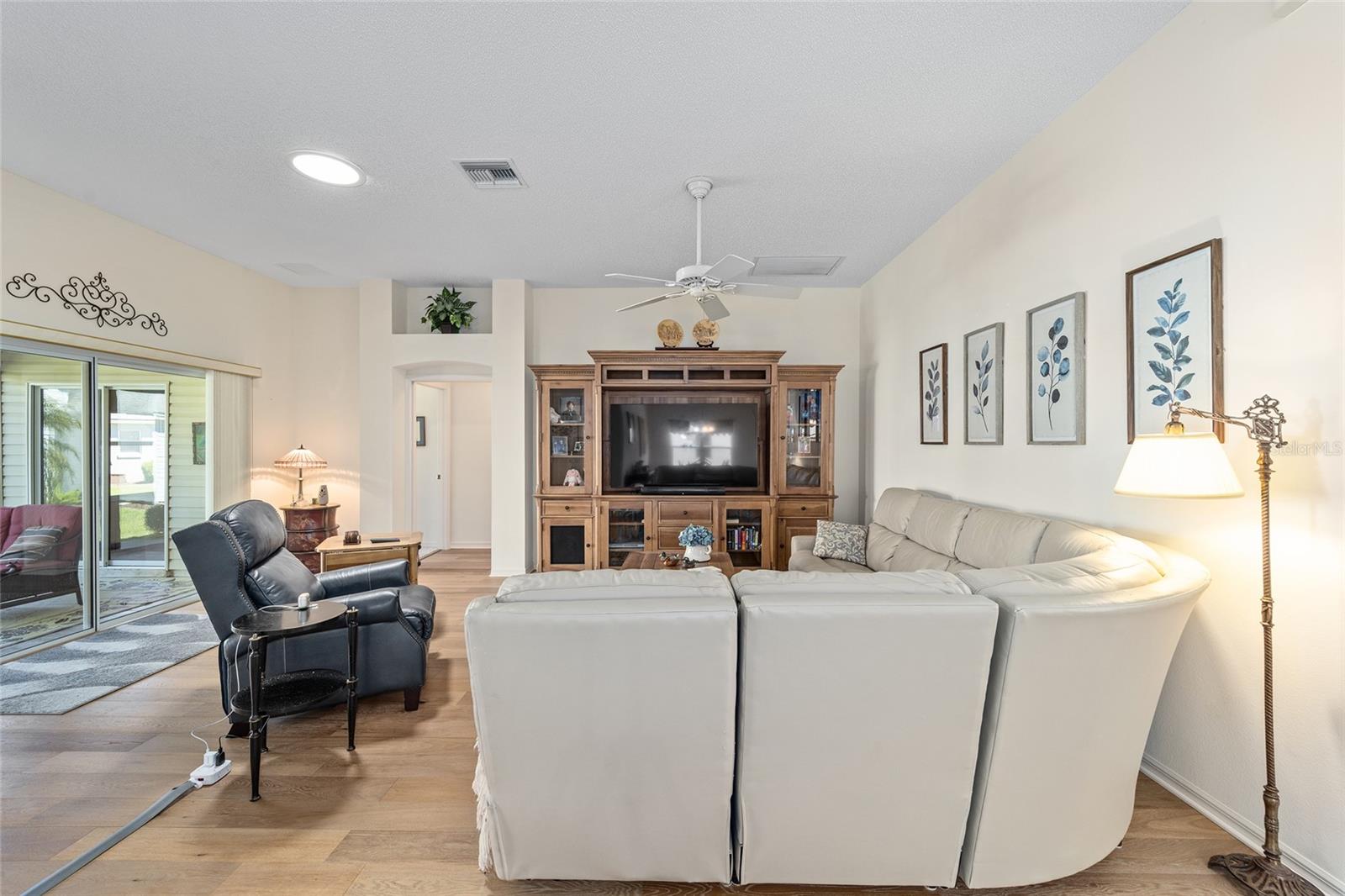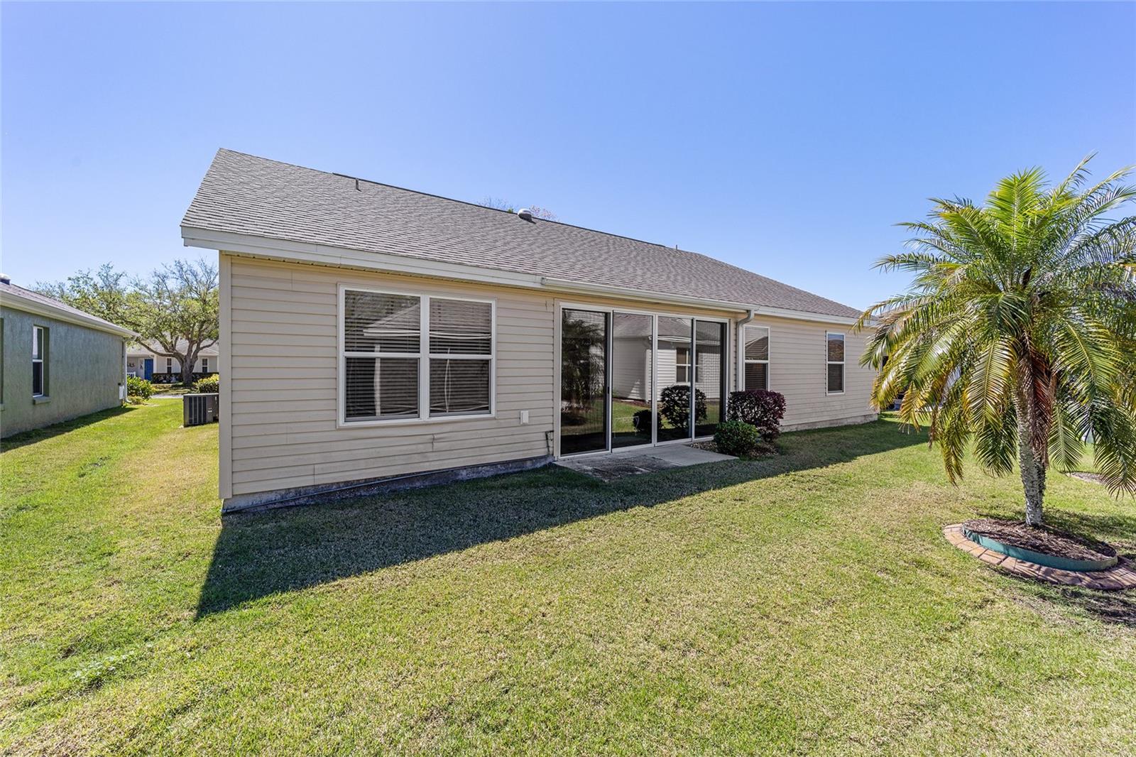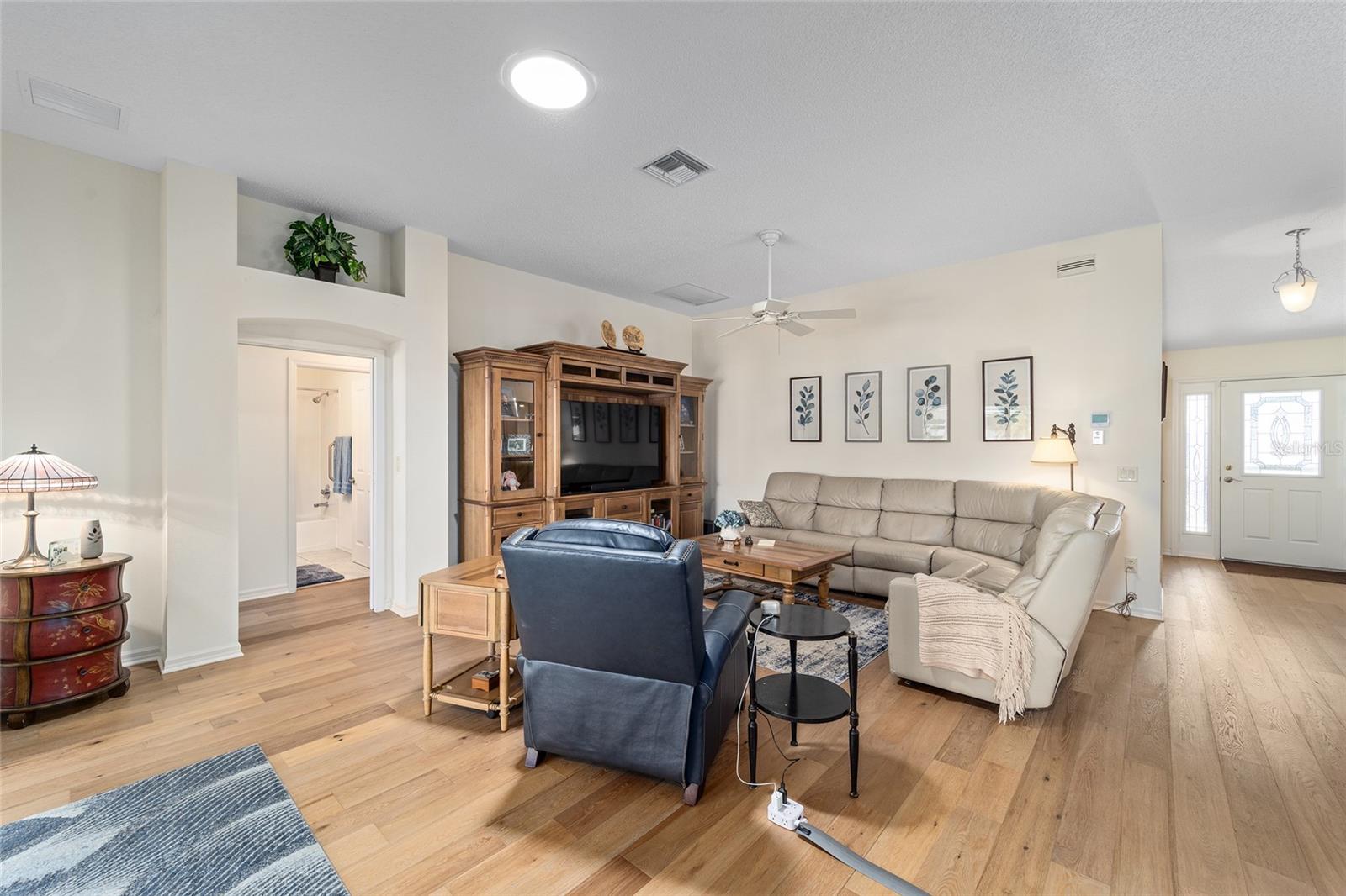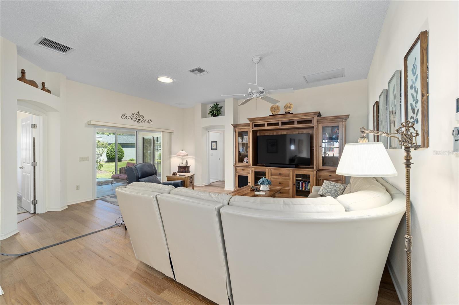***Great Price***NO BOND/OVERSIZED GARAGE! This designer home is located in the sought-after Village of Virginia Trace, less than one mile to Lake Sumter Landing Town Square with shops, restaurants, and nightly entertainment. As you enter the home, you are greeted by a leaded-glass front door with sidelights allowing an abundance of sunlight but without compromising privacy. The hardwood floor foyer leads you to the living room and dining room with the same beautiful engineered-hardwood flooring. The living room has a solar tube for additional natural lighting. The oversized kitchen features wood cabinets, granite countertops, tiled backsplash, and a bay window breakfast nook. The large primary bedroom suite has the same beautiful hardwood flooring and a walk-in closet. The primary bath has an L-shaped vanity with a beautiful granite countertop and two under-mount sinks. There is an additional walk-in closet accessible from the bathroom. The lanai is enclosed with glass windows and sliding doors lead to the backyard. The split floor plan provides two bedrooms and the guest bath. One of the guest bedrooms has a Murphy bed and can be used as an office as well. The garage is deep enough for a full-sized pickup truck. Roof 2020, HVAC April 2025, and hot water heater 2020.