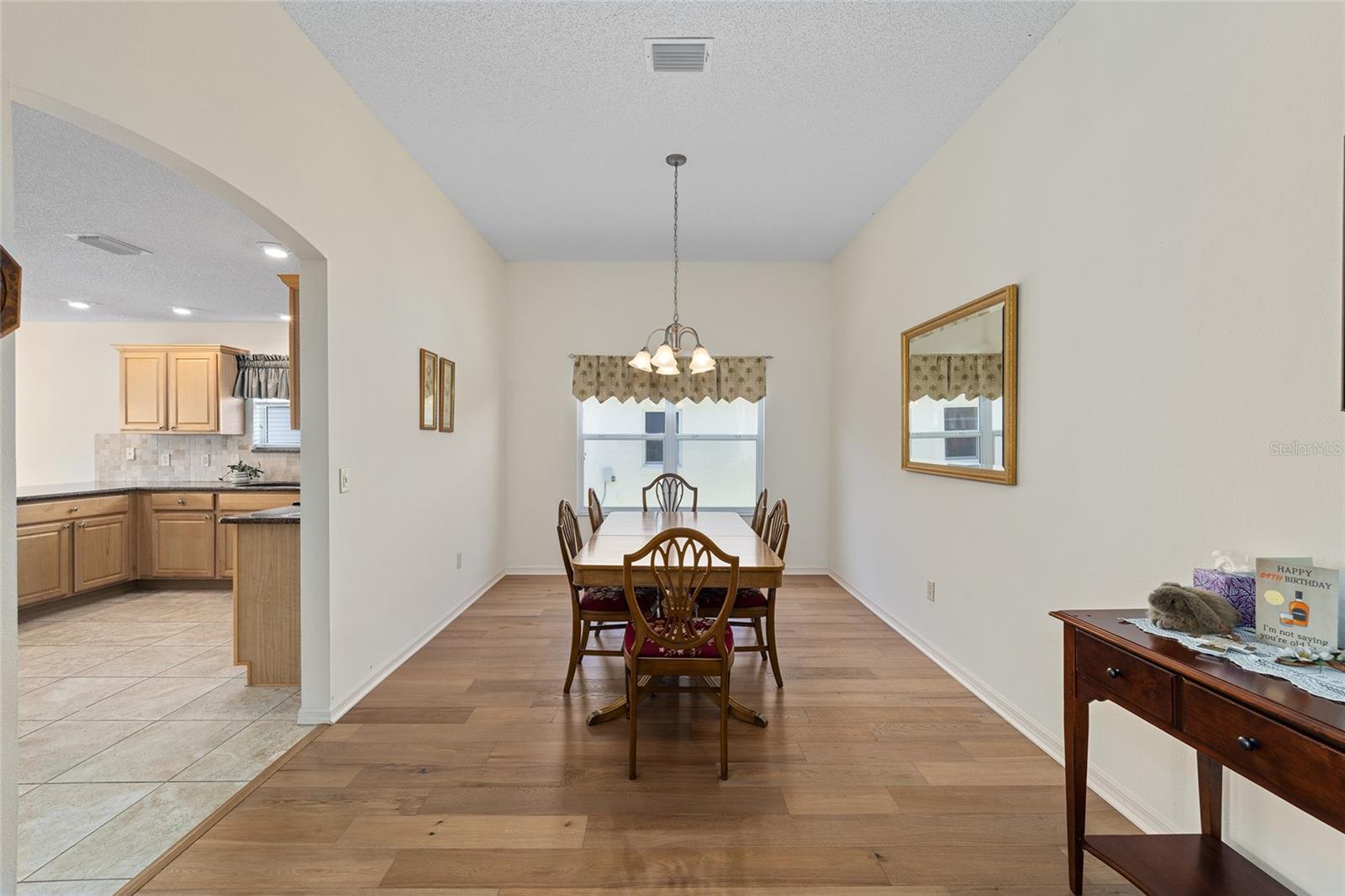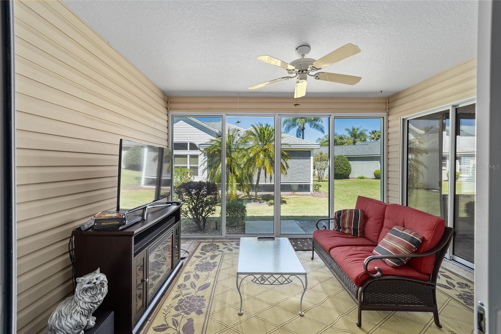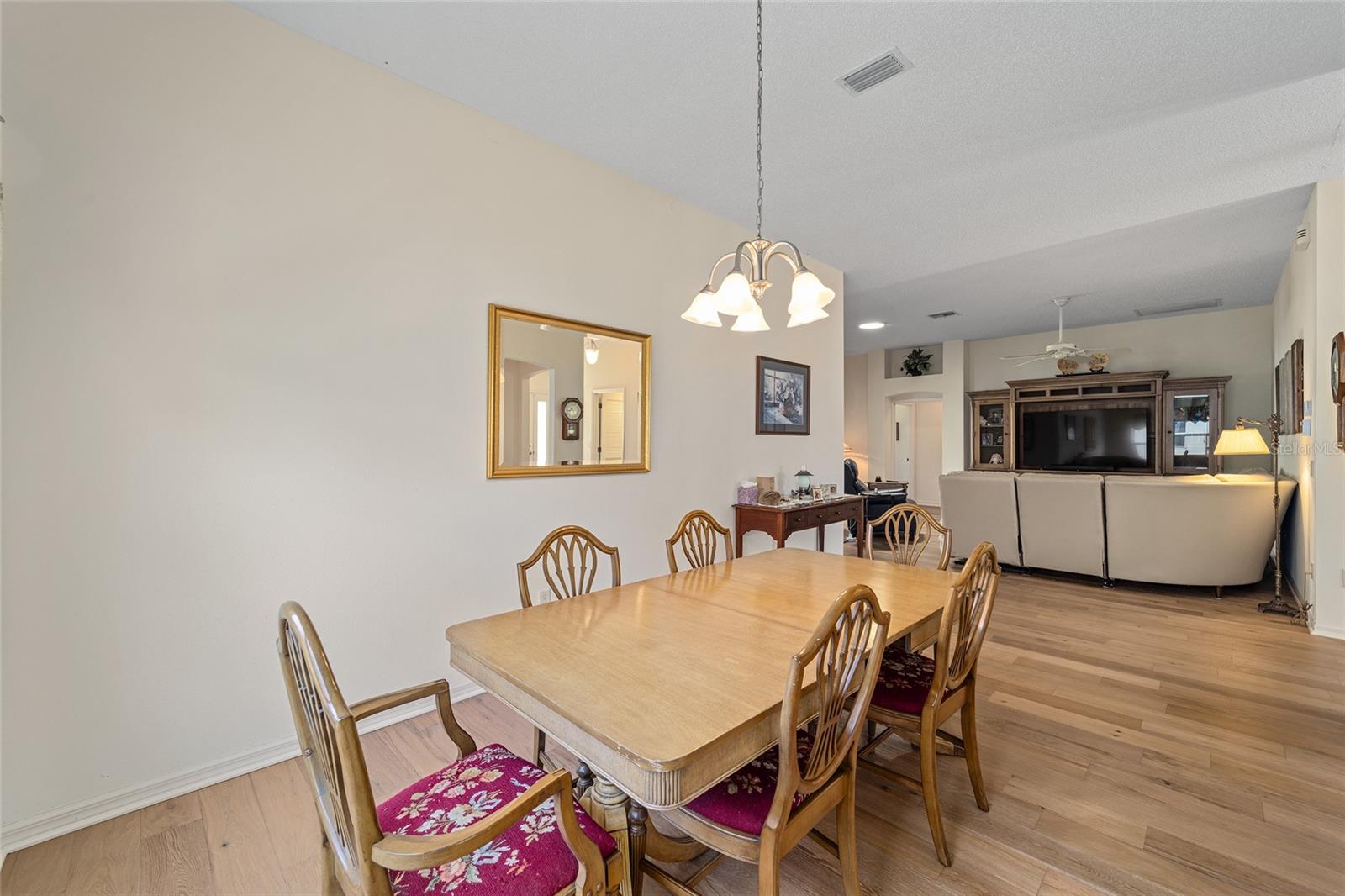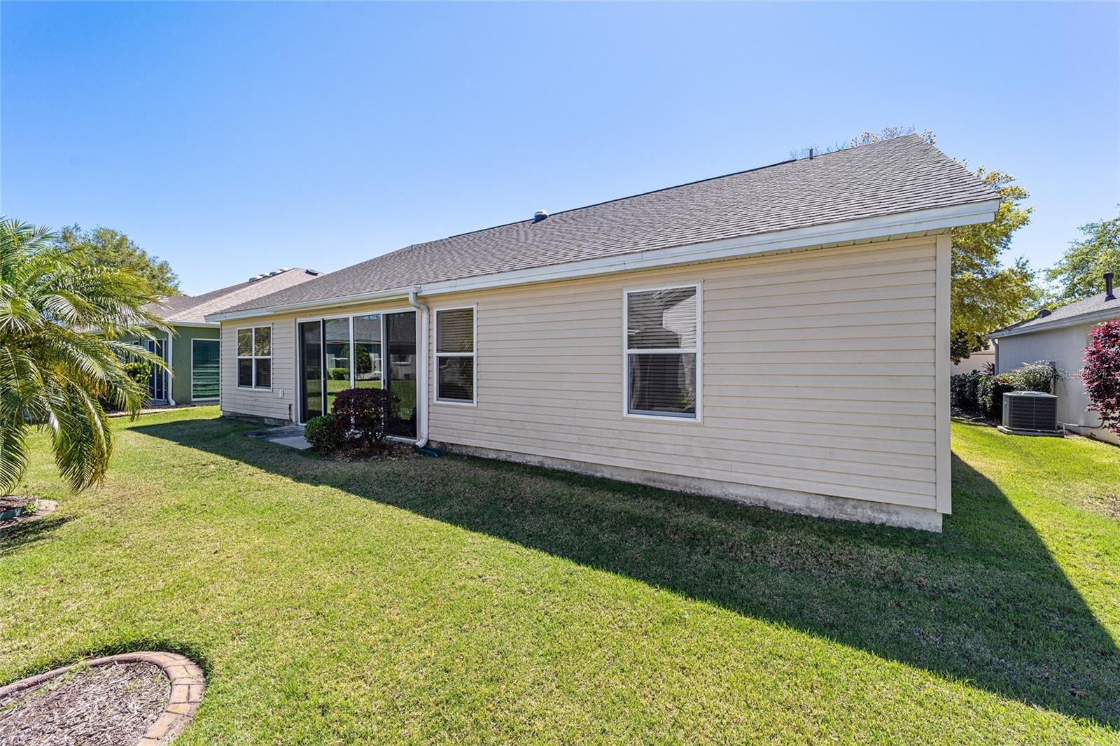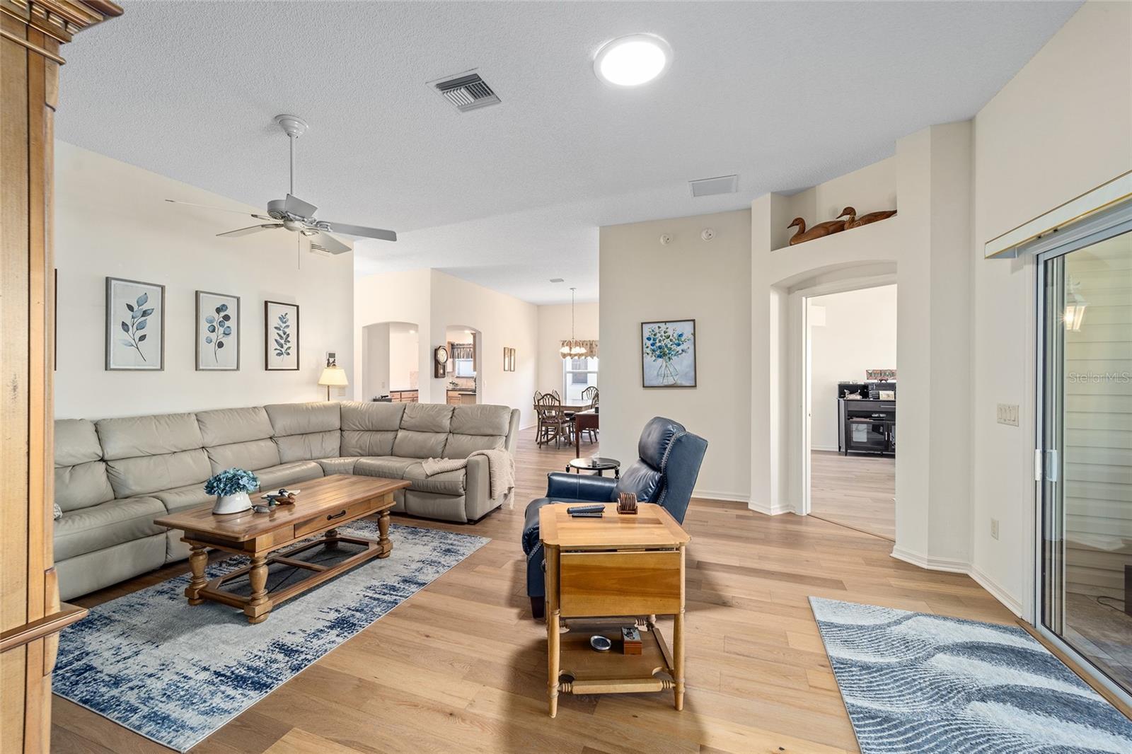 ***Great Price***NO BOND/OVERSIZED GARAGE! This designer home is located in the sought-after Village of Virginia Trace, less than one mile to Lake Sumter Landing Town Square with shops, restaurants, and nightly entertainment. As you enter the home, you are greeted by a leaded-glass front door with sidelights allowing an abundance of sunlight but without compromising privacy. The hardwood floor foyer leads you to the living room and dining room with the same beautiful engineered-hardwood flooring. The living room has a solar tube for additional natural lighting. The oversized kitchen features wood cabinets, granite countertops, tiled backsplash, and a bay window breakfast nook. The large primary bedroom suite has the same beautiful hardwood flooring and a walk-in closet. The primary bath has an L-shaped vanity with a beautiful granite countertop and two under-mount sinks. There is an additional walk-in closet accessible from the bathroom. The lanai is enclosed with glass windows and sliding doors lead to the backyard. The split floor plan provides two bedrooms and the guest bath. One of the guest bedrooms has a Murphy bed and can be used as an office as well. The garage is deep enough for a full-sized pickup truck. Roof 2020, HVAC April 2025, and hot water heater 2020.