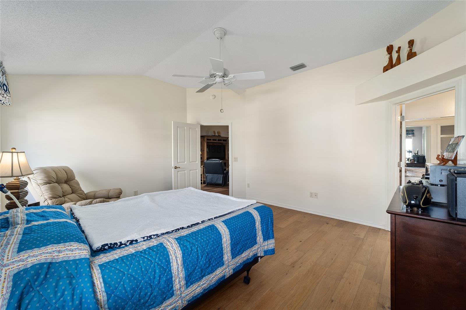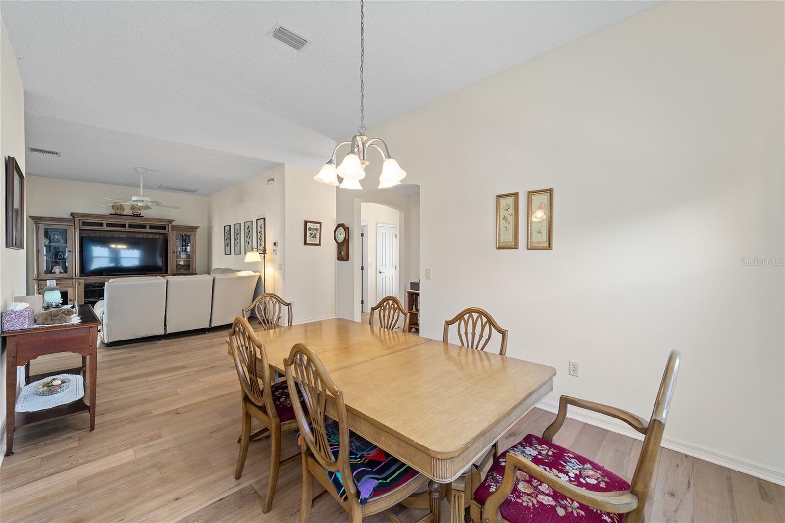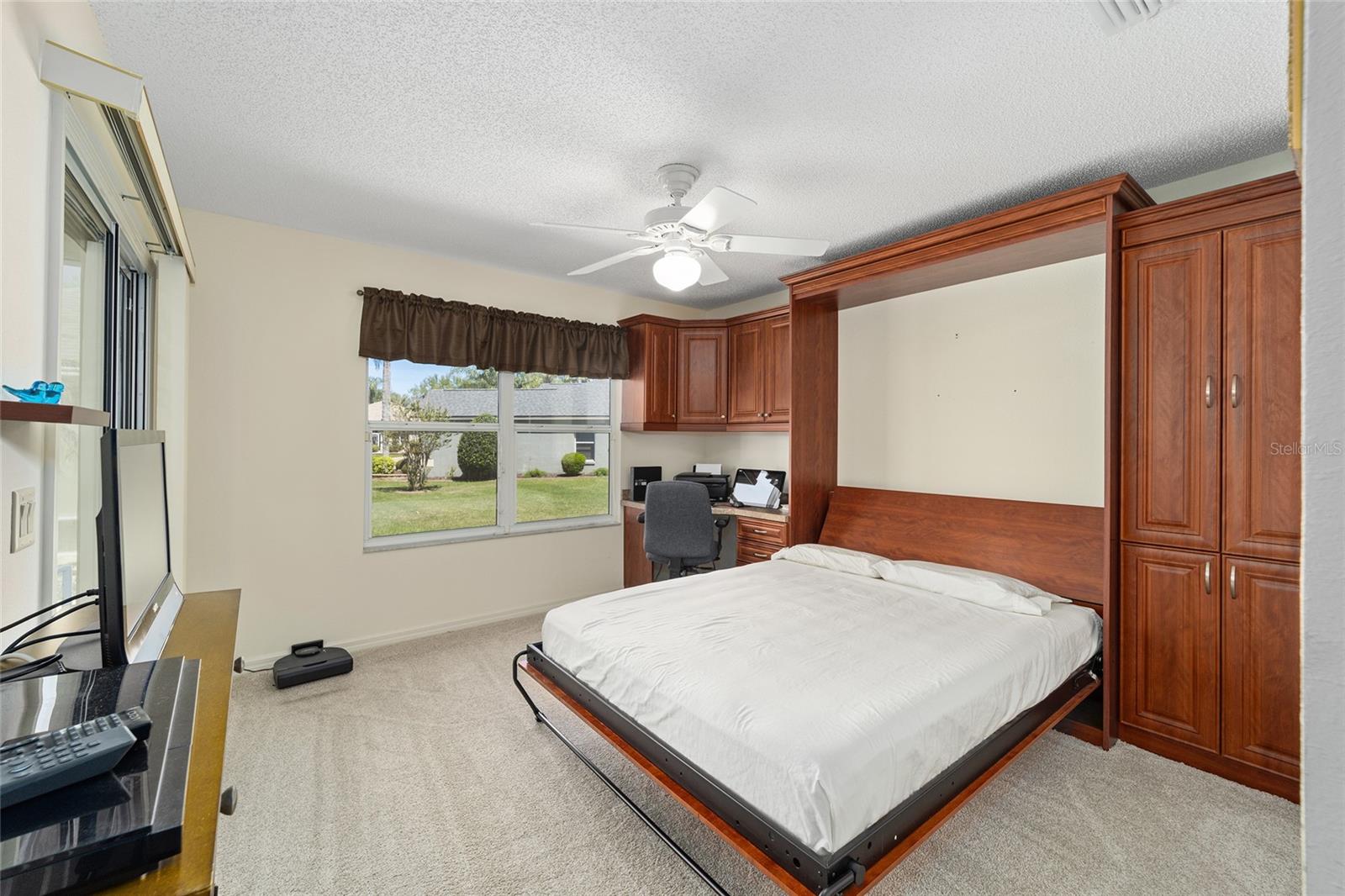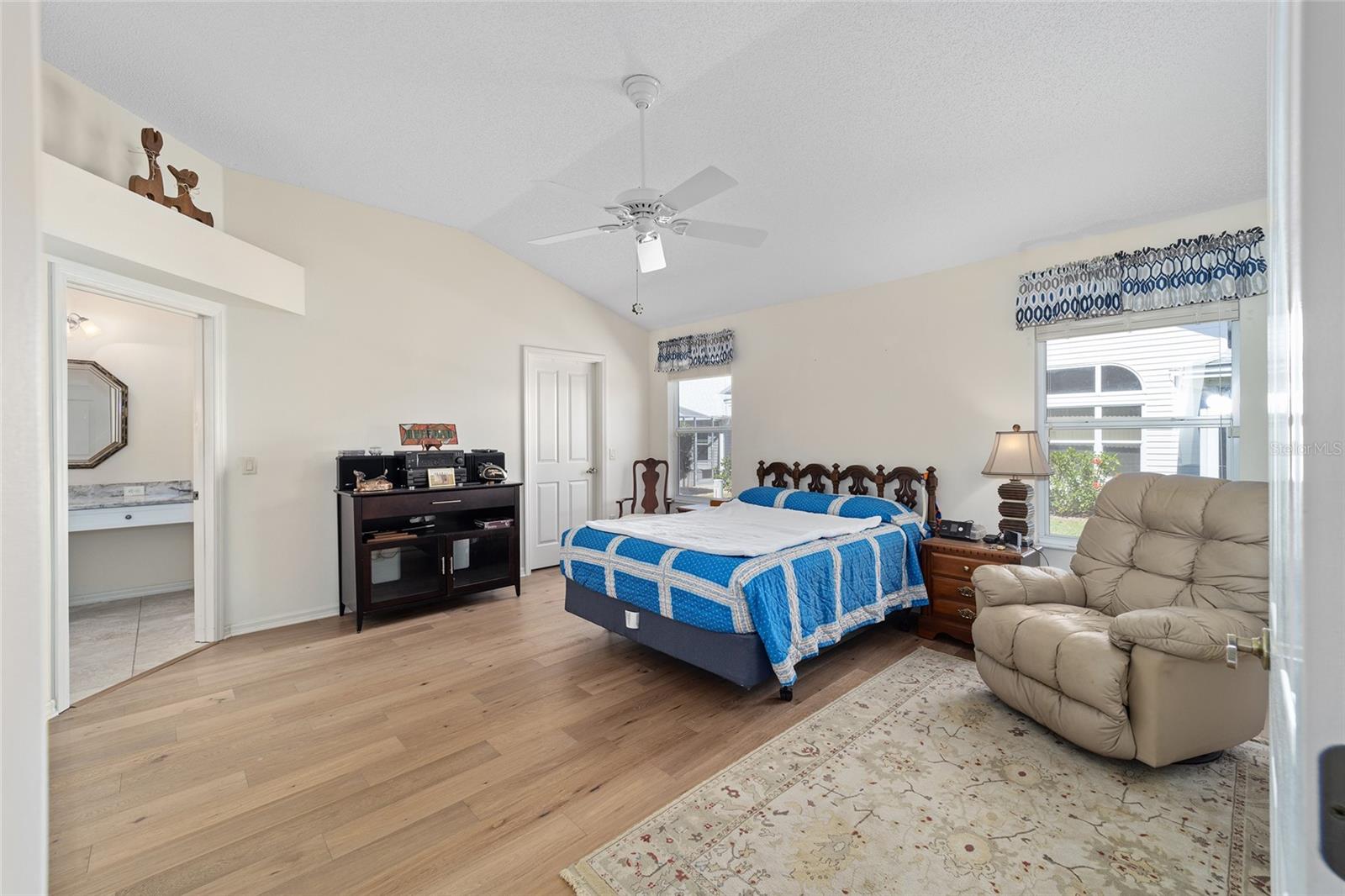 ***Great Price***NO BOND/OVERSIZED GARAGE! This designer home is located in the sought-after Village of Virginia Trace, less than one mile to Lake Sumter Landing Town Square with shops, restaurants, and nightly entertainment. As you enter the home, you are greeted by a leaded-glass front door with sidelights allowing an abundance of sunlight but without compromising privacy. The hardwood floor foyer leads you to the living room and dining room with the same beautiful engineered-hardwood flooring. The living room has a solar tube for additional natural lighting. The oversized kitchen features wood cabinets, granite countertops, tiled backsplash, and a bay window breakfast nook. The large primary bedroom suite has the same beautiful hardwood flooring and a walk-in closet. The primary bath has an L-shaped vanity with a beautiful granite countertop and two under-mount sinks. There is an additional walk-in closet accessible from the bathroom. The lanai is enclosed with glass windows and sliding doors lead to the backyard. The split floor plan provides two bedrooms and the guest bath. One of the guest bedrooms has a Murphy bed and can be used as an office as well. The garage is deep enough for a full-sized pickup truck. Roof 2020, HVAC April 2025, and hot water heater 2020.