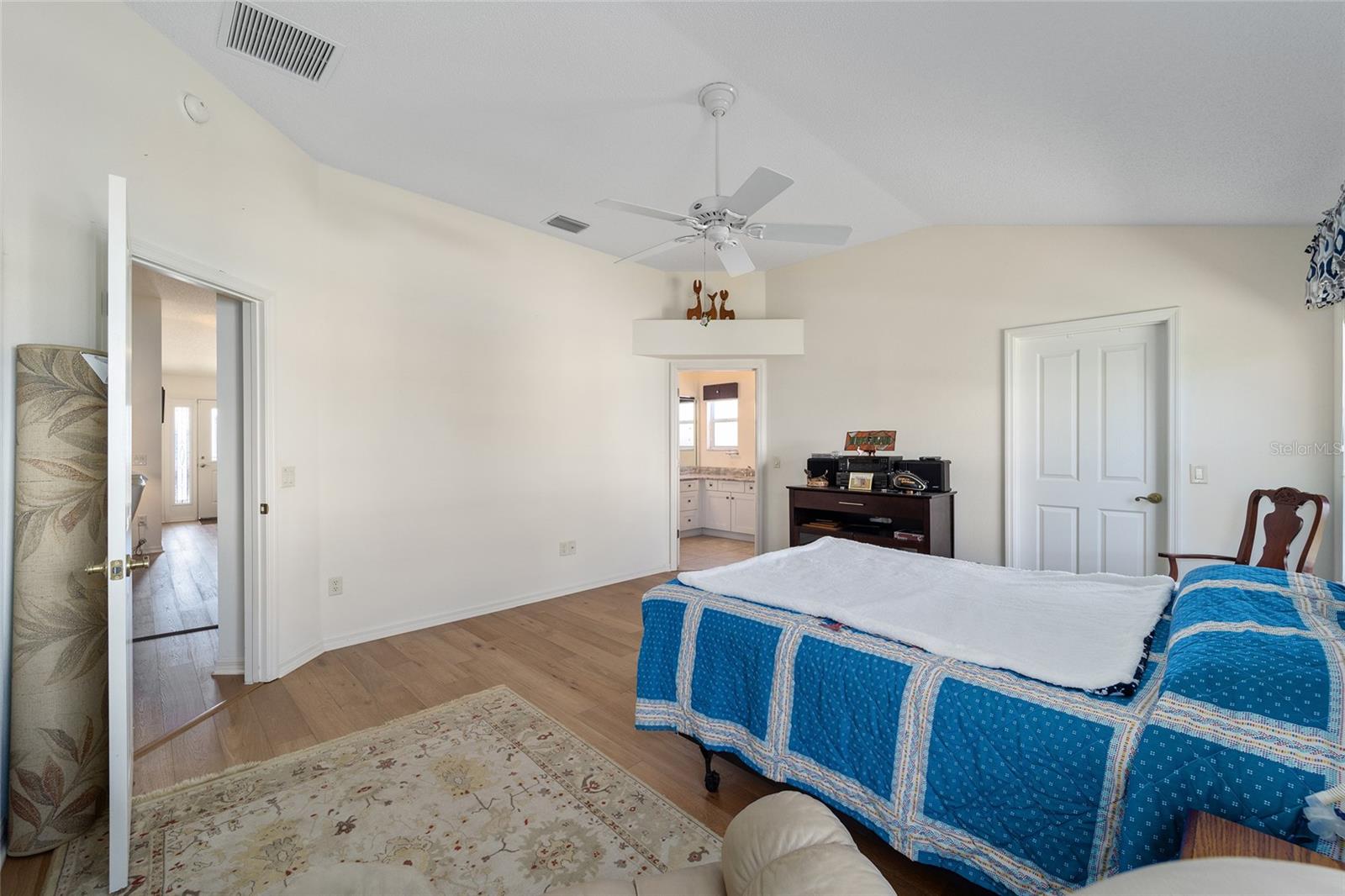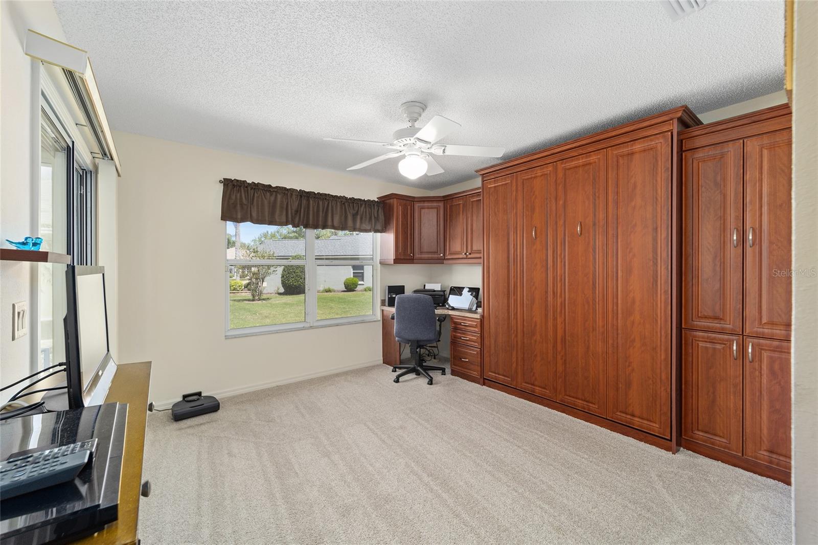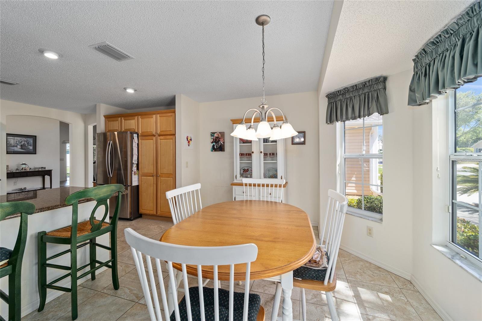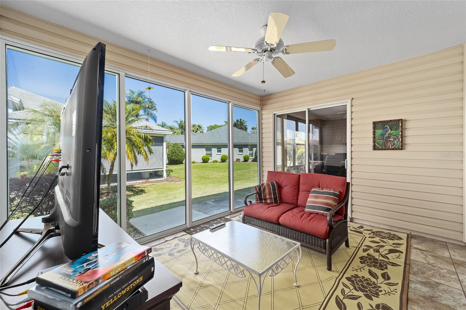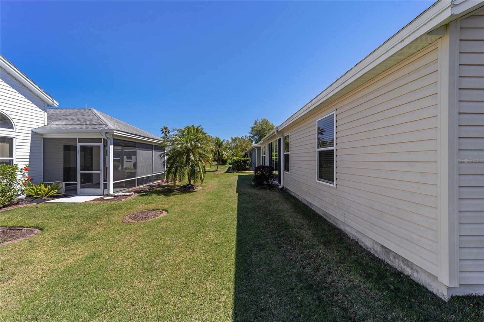 ***Great Price***NO BOND/OVERSIZED GARAGE! This designer home is located in the sought-after Village of Virginia Trace, less than one mile to Lake Sumter Landing Town Square with shops, restaurants, and nightly entertainment. As you enter the home, you are greeted by a leaded-glass front door with sidelights allowing an abundance of sunlight but without compromising privacy. The hardwood floor foyer leads you to the living room and dining room with the same beautiful engineered-hardwood flooring. The living room has a solar tube for additional natural lighting. The oversized kitchen features wood cabinets, granite countertops, tiled backsplash, and a bay window breakfast nook. The large primary bedroom suite has the same beautiful hardwood flooring and a walk-in closet. The primary bath has an L-shaped vanity with a beautiful granite countertop and two under-mount sinks. There is an additional walk-in closet accessible from the bathroom. The lanai is enclosed with glass windows and sliding doors lead to the backyard. The split floor plan provides two bedrooms and the guest bath. One of the guest bedrooms has a Murphy bed and can be used as an office as well. The garage is deep enough for a full-sized pickup truck. Roof 2020, HVAC April 2025, and hot water heater 2020.