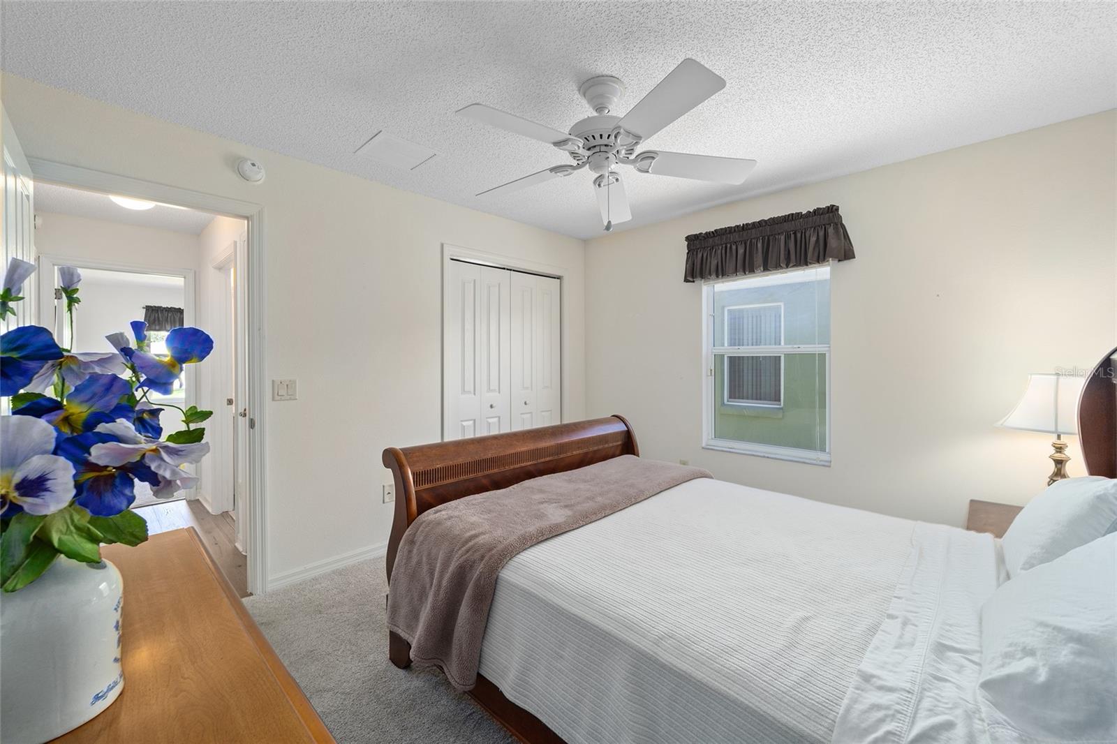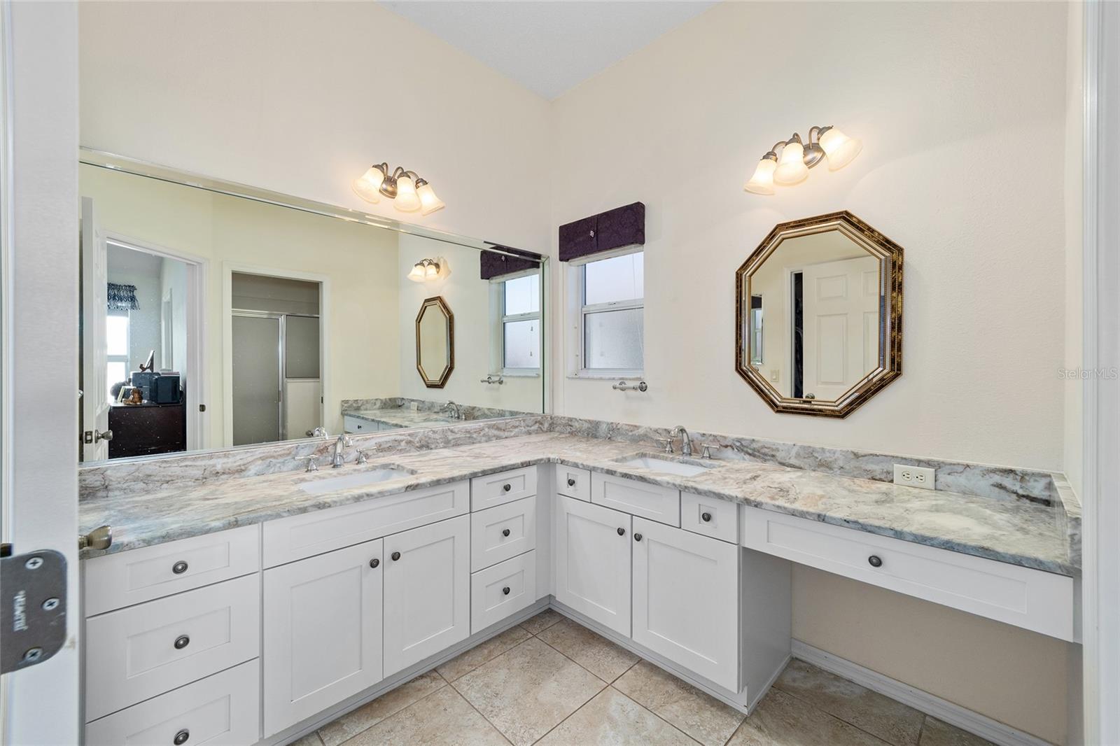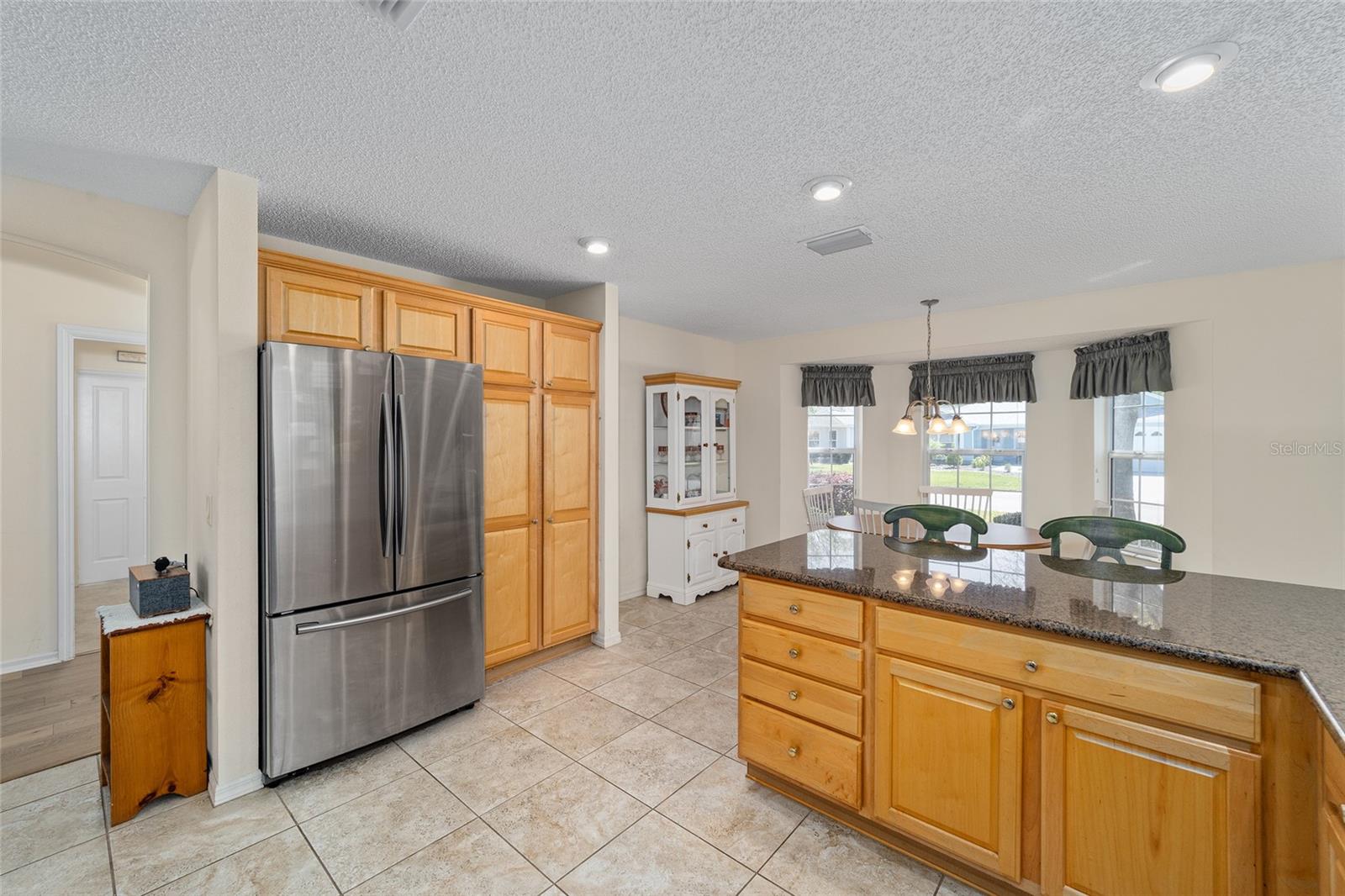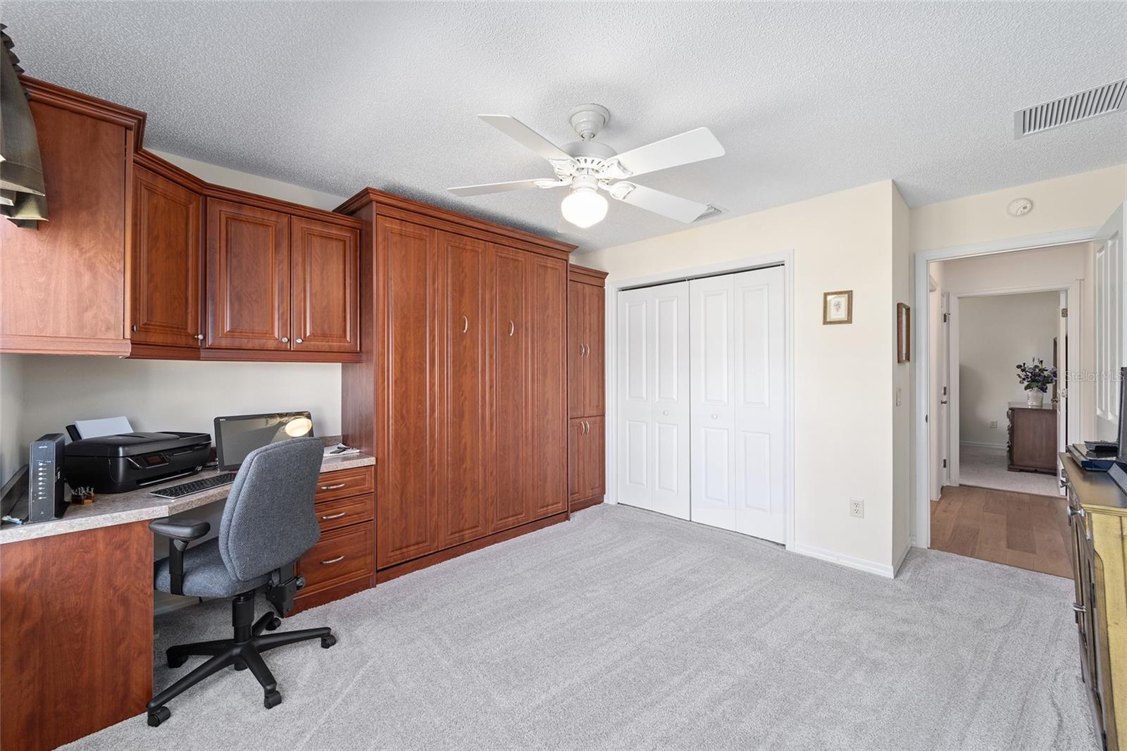 ***Great Price***NO BOND/OVERSIZED GARAGE! This designer home is located in the sought-after Village of Virginia Trace, less than one mile to Lake Sumter Landing Town Square with shops, restaurants, and nightly entertainment. As you enter the home, you are greeted by a leaded-glass front door with sidelights allowing an abundance of sunlight but without compromising privacy. The hardwood floor foyer leads you to the living room and dining room with the same beautiful engineered-hardwood flooring. The living room has a solar tube for additional natural lighting. The oversized kitchen features wood cabinets, granite countertops, tiled backsplash, and a bay window breakfast nook. The large primary bedroom suite has the same beautiful hardwood flooring and a walk-in closet. The primary bath has an L-shaped vanity with a beautiful granite countertop and two under-mount sinks. There is an additional walk-in closet accessible from the bathroom. The lanai is enclosed with glass windows and sliding doors lead to the backyard. The split floor plan provides two bedrooms and the guest bath. One of the guest bedrooms has a Murphy bed and can be used as an office as well. The garage is deep enough for a full-sized pickup truck. Roof 2020, HVAC April 2025, and hot water heater 2020.