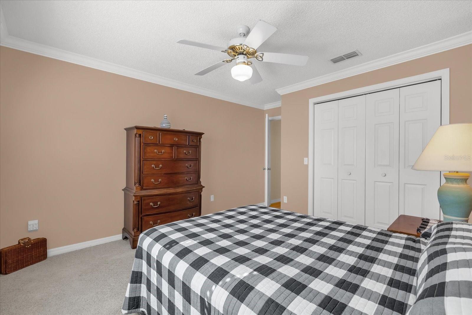Welcome to your dream home! This impressive three-bedroom, two-bath Vera Cruz designer home has everything you need and more. From the moment you approach you will notice the painted driveway and expanded entryway, you'll feel right at home. Inside, be greeted by a warm color scheme that flows throughout the open floor plan. The new luxury vinyl plank flooring adds an elegant touch, while upgraded lighting and fans create a modern ambiance. The kitchen is a chef's dream with its oversized layout and breakfast nook. The living room and dining room are equally impressive, ideal for hosting gatherings or simply relaxing with loved ones. The primary suite is a retreat with double large step-in closets and an en-suite bath featuring an oversize vanity with double sinks, step-in shower and linen closet. The guest wing offers two spacious bedrooms with ample closet space as well as an upgraded step-in tile shower in the second bath. But that's not all, this home also boasts an enclosed lanai complete with large sliding windows for added space to entertain or use as an office, craft room or even a TV room. Step out onto the patio for some fresh air while enjoying your morning coffee. Did we mention no bond! Convenience is key when it comes to this home's location. You'll be just minutes from Spanish Springs Town Square and Lake Sumter Landing Market Square where you can enjoy nightly entertainment, endless shopping options and mouthwatering restaurants. Plus, nearby executive and champion golf courses or recreation centers offer plenty of activities for everyone. This impeccably maintained home is move-in ready and all that's missing is you! Don't wait any longer to start living The Village lifestyle in your new forever home.