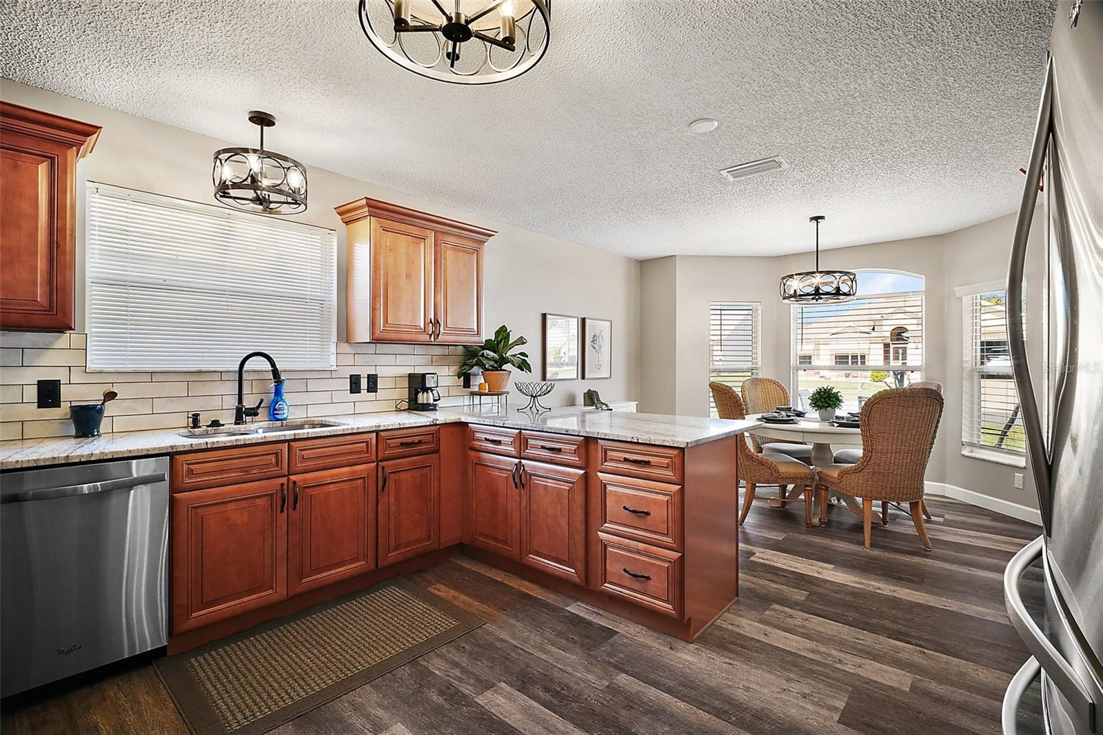 This beautiful 3-bedroom, 2-bath Vera Cruz designer home features numerous updates and overlooks the 5th hole of the El Diablo Executive Golf Course in The Village of Santo Domingo. You'll love the convenient location, just 2.8 miles from Spanish Springs Town Square, 5.8 miles from Lake Sumter, and 12 miles from Brownwood Paddock Square. Only a short golf cart ride away, you'll find a recreation center that offers a pool, pickleball courts, shuffleboard, and more. Get ready to move in, relax, and enjoy the Village life, as all the work has already been done. This stunning home boasts maple cabinets, granite countertops, stainless steel appliances, and ample storage. The 2019 updates include a new roof, fresh paint, new light fixtures, updated flooring, an extra-wide concrete driveway with patio, and a sprinkler system. The bond is paid! Your dream home awaits—call to schedule your private showing today. Please note that room sizes and garage size are approximate. The seller does not have information regarding pet size or number restrictions, or rental restrictions. Buyers are encouraged to verify all information for accuracy.