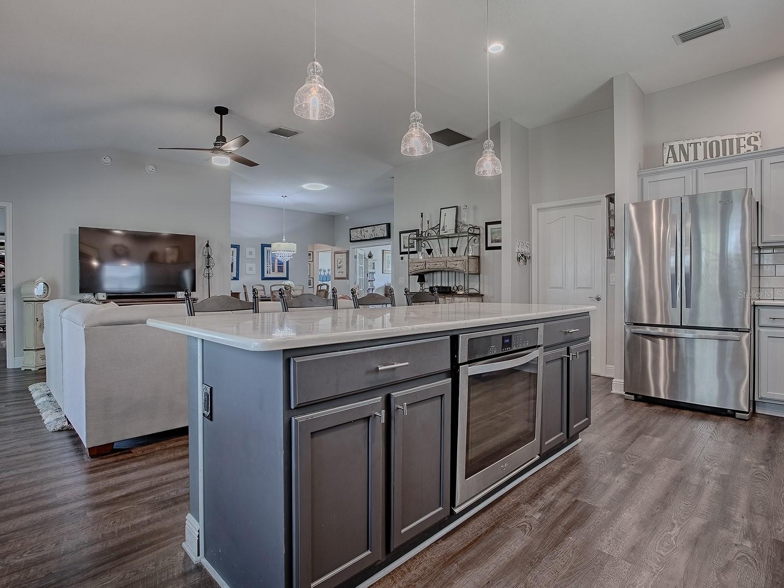 A panoramic golf course view and spectacular sunsets await you from the fabulous custom lanai of this designer home located on the first hole of Cane Garden’s Hibiscus championship golf course. Enjoy golf front living in the centrally located Village of Sunset Pointe while only a short drive to Lake Sumter Landing or Brownwood Town Square. The heart of this home is a gourmet chef’s dream kitchen complete with a stainless steel six-burner gas VIKING range, VIKING dishwasher and a built-in oven, as well as a French door stainless refrigerator, microwave and glass range hood. The expansive quartz counters provide plenty of prep area, and the oversized custom quartz island is sure to be a favorite gathering spot for friends and family. The open floor plan seamlessly flows from dining to living areas which is great for entertaining. Adjacent to the dining room is a quiet and cozy den with custom French doors perfect for reading or relaxing. The primary bedroom features a beautiful board & batten statement wall, and comfortably accommodates a king size bed ensemble. The ensuite primary bath has a comfort-height vanity with dual sinks and a glass-enclosed step in shower – perfect for unwinding at the end of a busy day. Sliding patio doors lead from the living room to the awesome 24x20 (480 sq. ft.) screened lanai. Whether hosting a large party or just soaking in the serenity of a golf course & sunset view, this will instantly be your favorite place! Beyond the lanai the large yard offers plenty of space to enjoy the fabulous Florida sunshine – all in the privacy of your own backyard with NO houses behind. There’s even room for a pool. The oversize 2 car garage has built-in storage & pull-down stairs to the attic. The garage door has a remote-controlled screen allowing for comfortable use in all seasons. New roof (2022), and new A/C (2023). Bond balance is $5,716. This great location is only a short golf cart ride to Cane Garden Country Club, and the Hibiscus and Jacaranda championship golf courses. Also close by are the beautiful Pelican and Heron executive courses. Several rec centers are nearby, including the Sunset Pointe, Poinciana, Hibiscus, and Allamanda Neighborhood Rec Centers, as well as Lake Miona, Seabreeze, and Colony Cottage Regional Rec Centers. Abundant shopping and dining venues are available in several convenient locations easily accessible by golf cart or car. Call today to schedule your private showing.