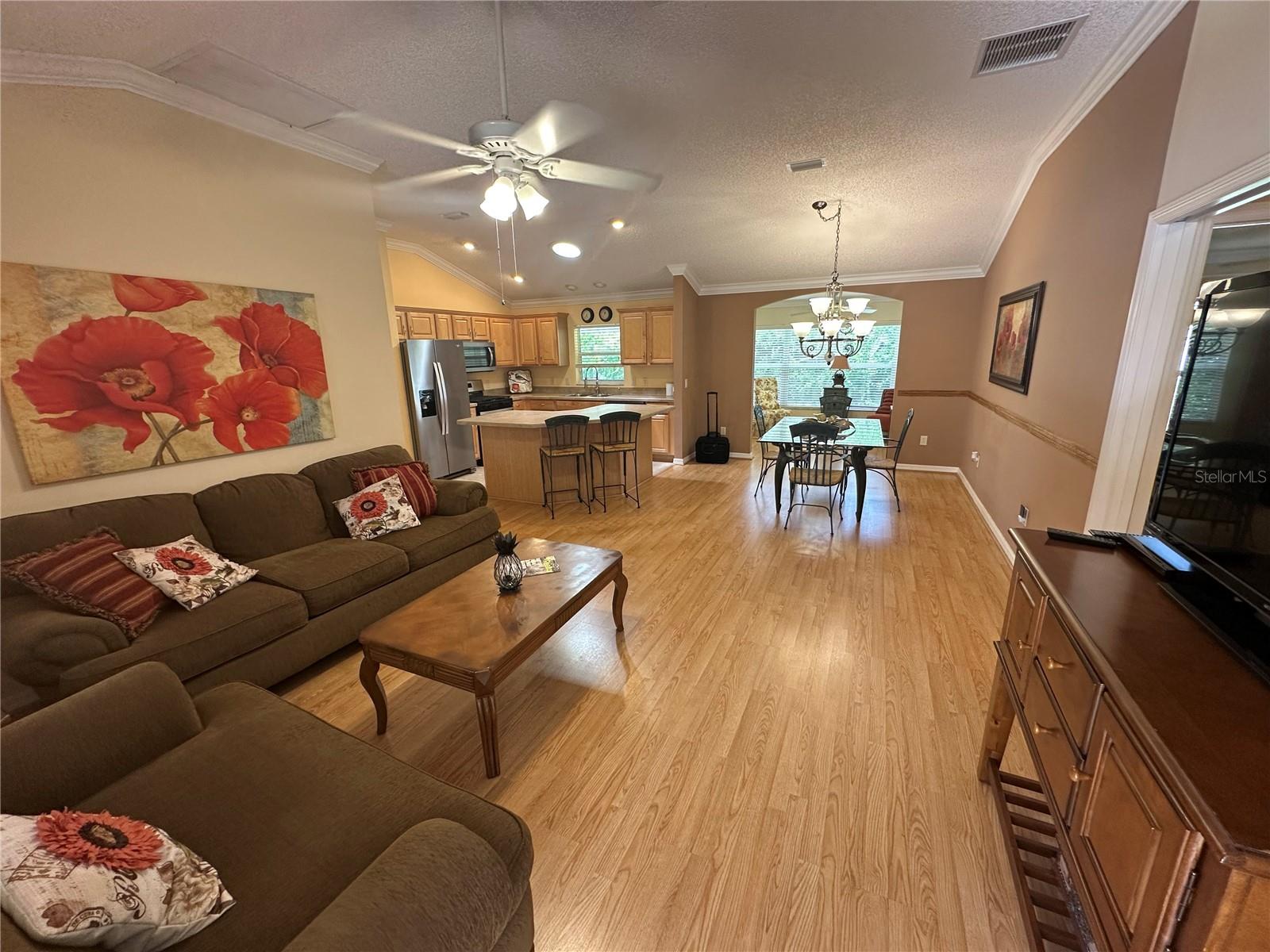 Turnkey, Golf cart included !!!Move in ready…. Your Dream home awaits or a great investment. Welcome to this stunning Block & Stucco 3-bedroom, 2-bathroom home located on a quiet cul-de-sac in the sought-after Village of Lynnhaven. Situated on an oversized corner lot with its beautiful shade trees, this awesome residence features a spacious 2-car garage and a dedicated golf cart garage. With over 1600 sq ft, and recently updated with a NEW ROOF (Jan 2025) and NEW STAINLESS APPLIANCES (Dec 2024) When you walk up to front door there is a front porch sitting area complete with its own wicker patio set that you could sit and enjoy the peace and serenity of the area. As you walk inside, you’ll find an open floor plan with tall ceilings, crown molding, laminate flooring and the split bedroom design. The interior is tastefully decorated with warm, neutral tones and elegant lighting that give it a luxurious feel. Natural light fills the home with three solar tubes, especially brightening the laundry room, guest bath, and kitchen. The beautiful living room furniture makes you feel warm and comfortable and with of plenty of room makes it easy to entertain guests The kitchen is highlighted by the solar light that makes the birch like cabinets with pullout drawers look exquisite. The countertop that you can use as a breakfast bar. Also you will enjoy the new gas range which everyone seems to want in their homes. The owner’s suite includes a King size bedroom suit with a large walk-in closet and an en-suite bath that has dual sinks, step-in shower with glass doors and a linen closet for added convenience. Bedrooms 2 and 3 are also decorated with that warm inviting furniture for your guests. And the 2nd bath has another solar light that adds natural light to the room. As we move to the back of the house, you will find that extra living space that can be used as a den, office or whatever you like. This room is highlighted by the windows all around the room The screened in lanai is just off this room where you can sit and enjoy the back yard with privacy hedge. And there is a concrete pad outside the lanai that is used for barbecuing. This awesome location is only 15 minutes from Lake Sumter Landing and Spanish Springs. Palmer Legends Country Club, Pimlico and Churchill golf executive golf courses and recreation centers are just minutes away along with restaurants like Olive Garden, Bonefish Grill, Culvers, Dunkin and numerous shops on 466. Also in the area is a Publix and Fresh Market and the new Costco. Enjoy these nearby amenities that are only minutes away. Additional highlights include: *Gas range and heating system *Block & Stucco construction * Low bond balance under $6000 * Crown molding thru out the home *Front porch sitting area *Privacy hedge in back yard * Large corner lot with beautiful shade trees *Gutters *Turnkey with all the items you need to just move in * Elegant chandelier in in dining area Don’t miss your chance to see this well-maintained turnkey home. Call us today for your private showing