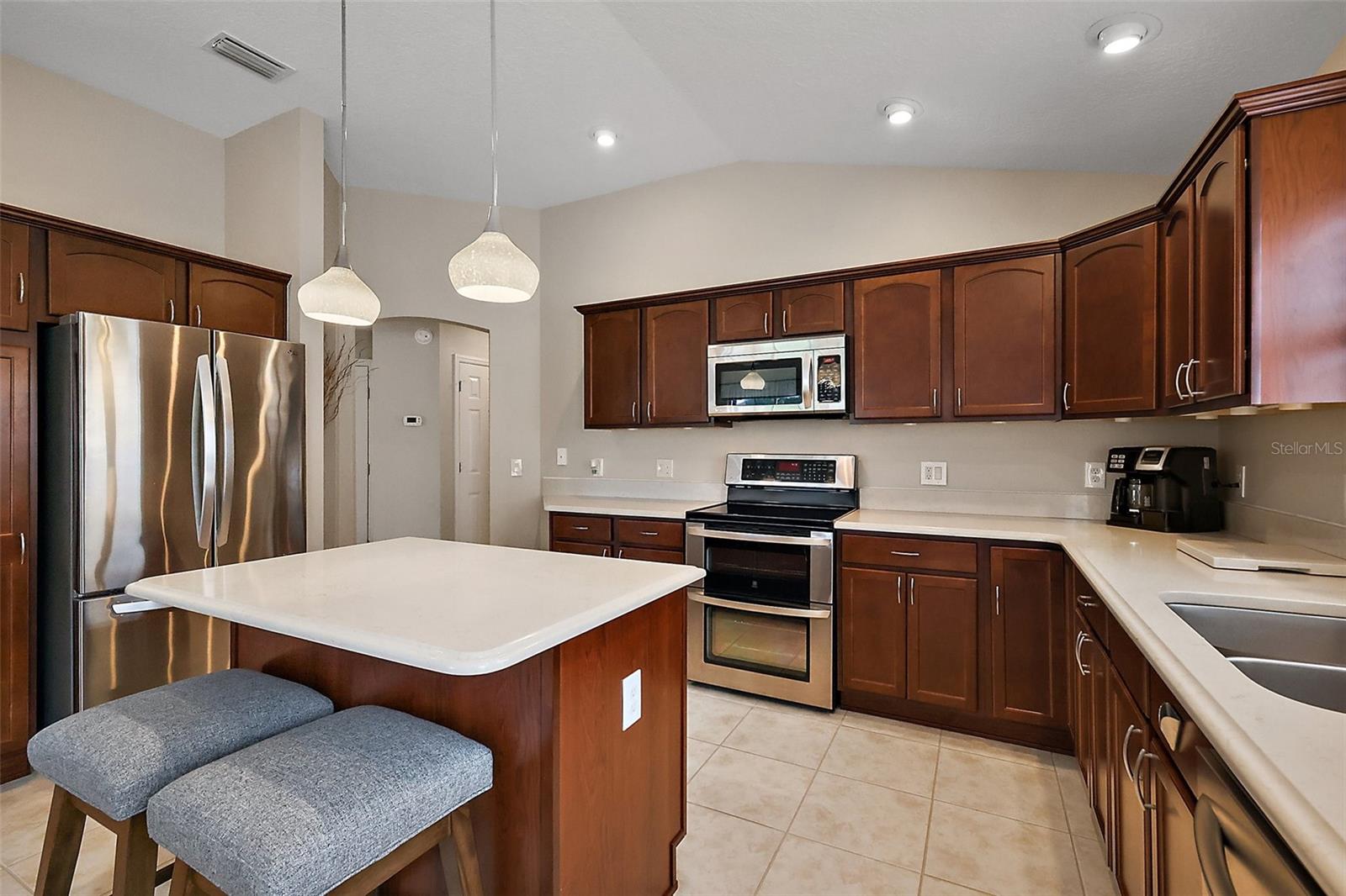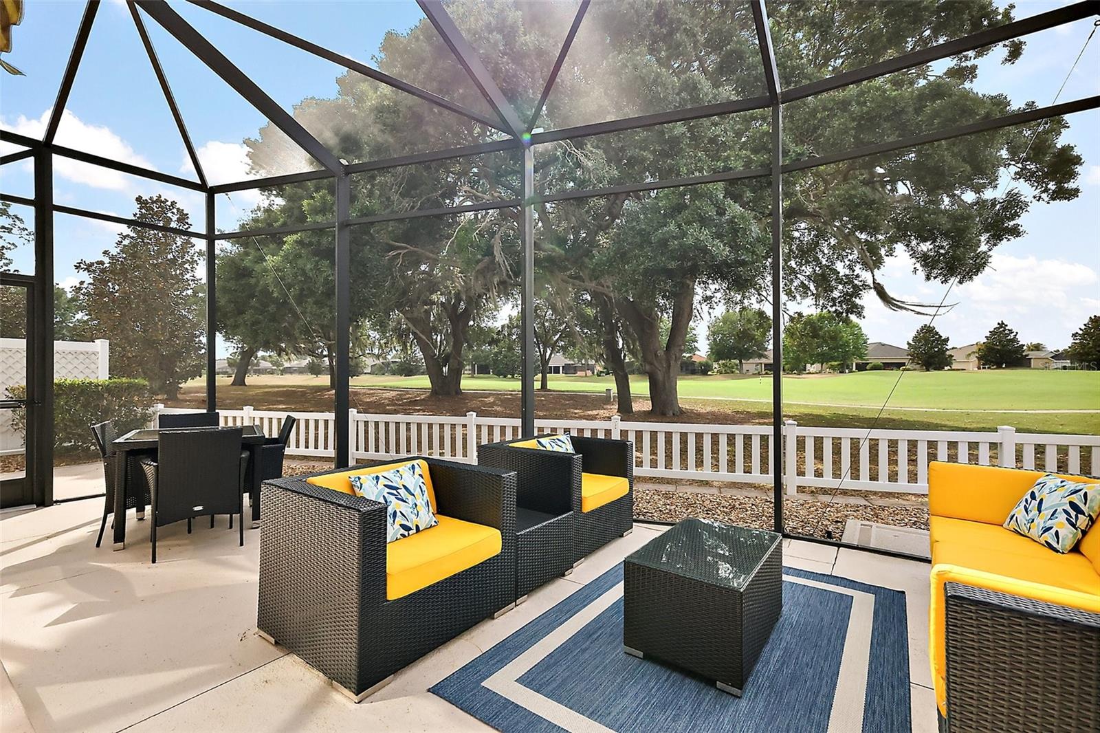 STUNNING CHAMPIONSHIP GOLF FRONT 3/2 Stoneybrook Courtyard Villa with CLIMATE-CONTROLLED, GLASS-ENCLOSED LANAI and 25’ x 14’ EXPANSIVE BIRDCAGE in the Village of Pennecamp! This fabulous home offers ABUNDANT PRIVACY and GORGEOUS VIEWS of the CANE GARDEN COUNTRY CLUB'S JACARANDA COURSE with enhanced landscaping, pebble and paver hardscaping, PAINTED drive and walkway, front sitting area, and a beautiful custom front door with LEADED-GLASS insert and side-light. NEW ROOF IN 2025! Recent improvements include: NEW EXTERIOR and INTERIOR PAINT and NEW PLANTATION SHUTTERS ON ALL WINDOWS. Step into a spacious TILED foyer filled with natural light and an immediate sense of warmth in this meticulously maintained, move-in ready villa. The magnificent kitchen boasts WOOD CABINETRY, QUARTZ countertops, a large center ISLAND with breakfast bar and pendant lights, STAINLESS appliances, and built-in PANTRY. Soaring VAULTED ceilings and LAMINATE flooring extend through the expansive dining and living areas, where two large dining room windows and a vaulted ceiling offer additional natural light. The living room features sliding doors that open to a CLIMATE-CONTROLLED, GLASS-ENCLOSED lanai with tile flooring, ceiling fan, mini split, and roll-down awnings. From here, enjoy direct access to the wonderfully PRIVATE 25’ x 14’ EXPANSIVE BIRDCAGE and fully fenced backyard—perfect for entertaining or simply relaxing with UNOBSTRUCTED GOLF VIEWS. The primary bedroom offers PANORAMIC windows with golf course views, a peaked ceiling, and a generous WALK-IN closet. Its en-suite bathroom includes wood cabinetry, dual sinks, a WALK-IN frameless glass tiled shower, and a linen closet. Bedroom two features a vaulted ceiling, large window with PLANTATION SHUTTERS, and built-in closet, while bedroom three also includes a large window and built-in closet. The guest bath features a tub/shower, wood vanity, and window. Patio and Front Bedroom furniture are included. Remaining BRAND NEW FURNITURE AVAILABLE SEPARATELY. The one and a half car garage provides plenty of space for a car and GOLF CAR, and includes an epoxy-coated floor, laundry area, utility sink, attic access, workbench, and extra cabinetry for storage. The Altamonte Villas in the Village of Pennecamp are ideally located halfway between Lake Sumter Landing Market Square and Brownwood Paddock Square, convenient to Allamanda Recreation Center, St Charles Pool, Bonita Pass Executive Golf Course, and abundant shopping and dining on both CR 466 and CR 466A. Altamonte Villas are part of the larger "Jacaranda Island" neighborhood, which is celebrated as one of the friendliest and most social neighborhoods in The Villages. PLEASE WATCH OUR WALKTHROUGH VIDEO OF THIS FABULOUS HOME IN A GREAT LOCATION, and CALL TODAY to schedule your Private Showing or Virtual Tour!