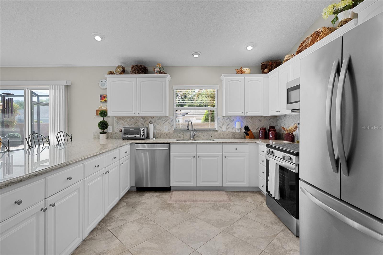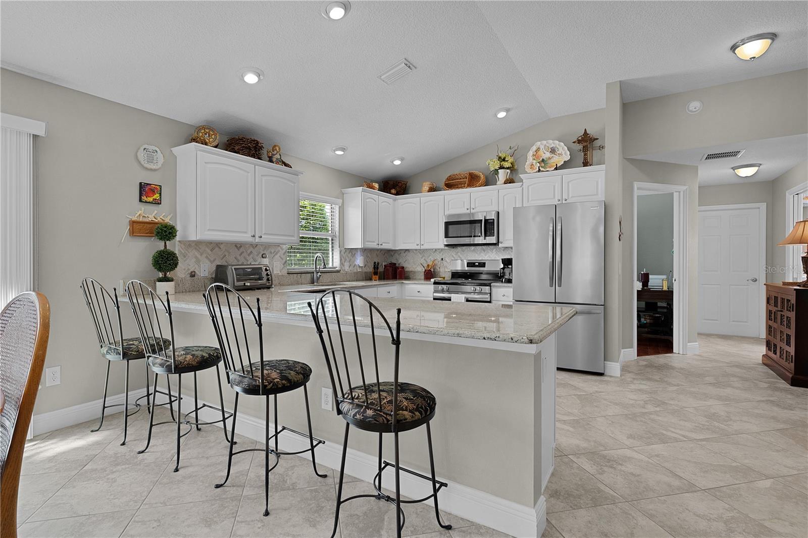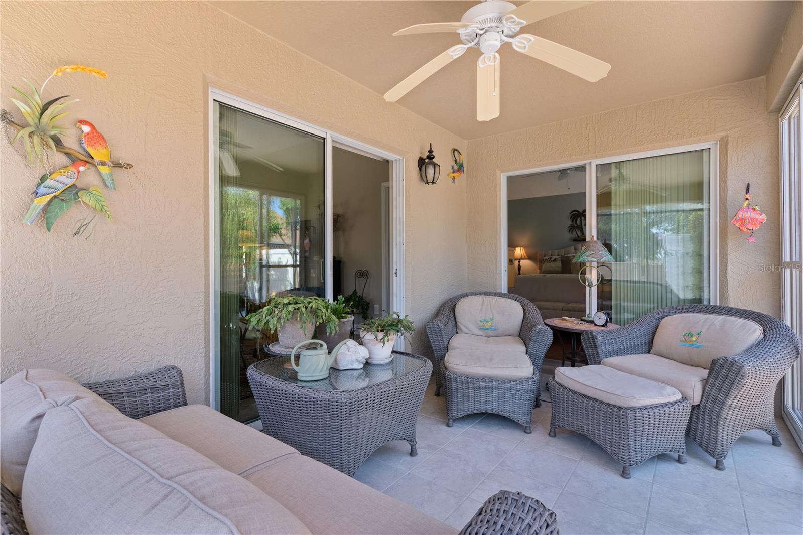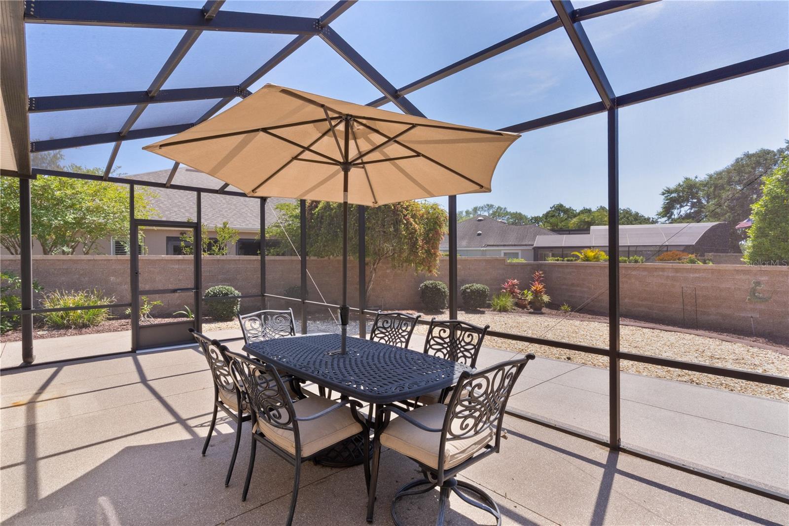 Rare highly sought after corner lot Courtyard Villa with Exceptional Outdoor Living – Altamonte Villas in Pennecamp! Discover this stunning 3-bedroom, 2-bath Foxglove model courtyard villa, perfectly positioned on an oversized end-unit lot in the desirable Altamonte Villas on Jacaranda Island. Located in the heart of The Villages—just minutes from Lake Sumter Landing—this home offers the ideal blend of privacy, style, and Florida charm. The expansive courtyard is a true highlight, boasting a large birdcage, two patios, a pergola, and still plenty of space for a future pool and spa. Impeccably manicured coastal landscaping creates a peaceful, resort-like ambiance—perfect for entertaining or quiet relaxation. Step inside to a beautifully maintained interior with a neutral, timeless color scheme and thoughtful upgrades throughout. Enjoy granite countertops, stainless steel appliances, white cabinetry, and a classic ceramic tile backsplash. Ceramic tile and hardwood flooring add sophistication and warmth, while vaulted ceilings and tall baseboards enhance the spacious feel. Updated bathrooms and an enclosed lanai ensure comfort no matter the weather. Additional features include a new roof May 2025, freshly painted interior and exterior, 2024 water heater, original but well-maintained HVAC system, and new fuse box 2024. Bond balance: $7,856.58. This rare offering checks all the boxes—location, layout, and lifestyle. Whether you're hosting gatherings or savoring peaceful moments in your own private retreat, this villa is ready to welcome you home.