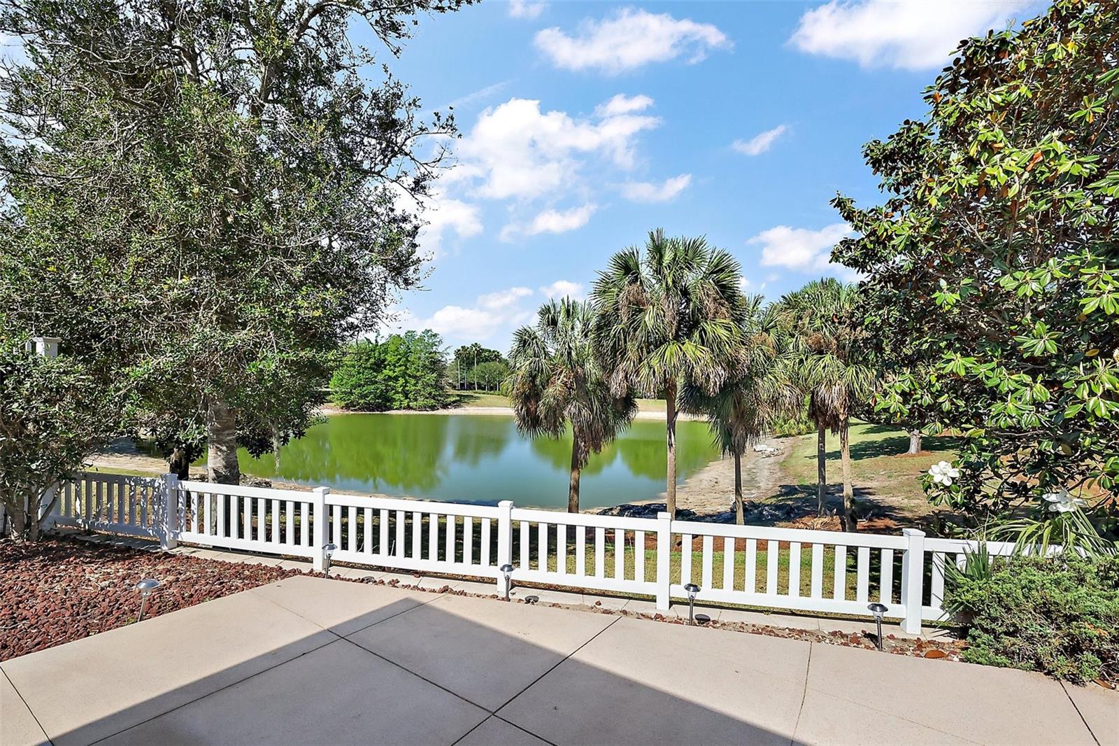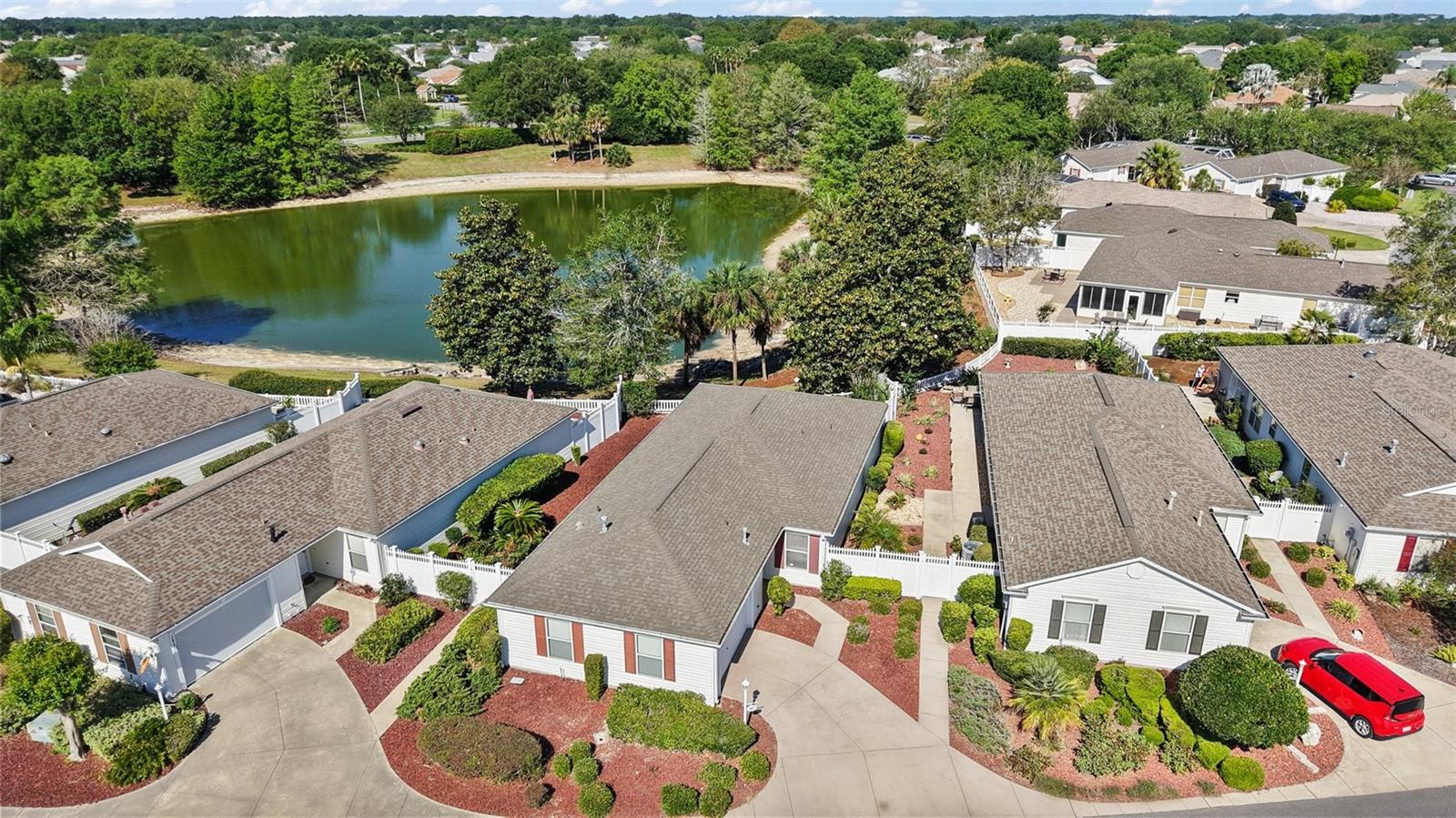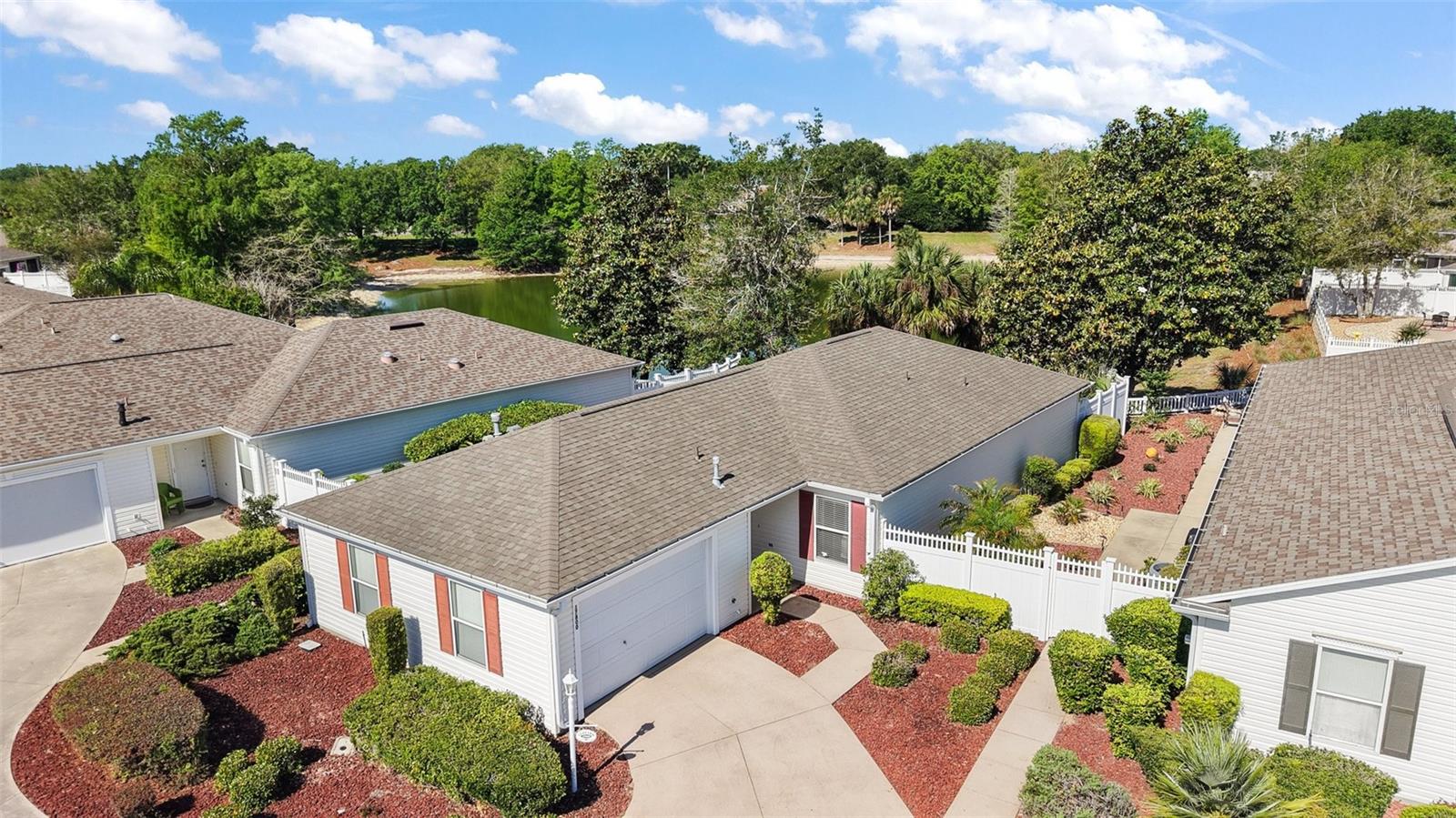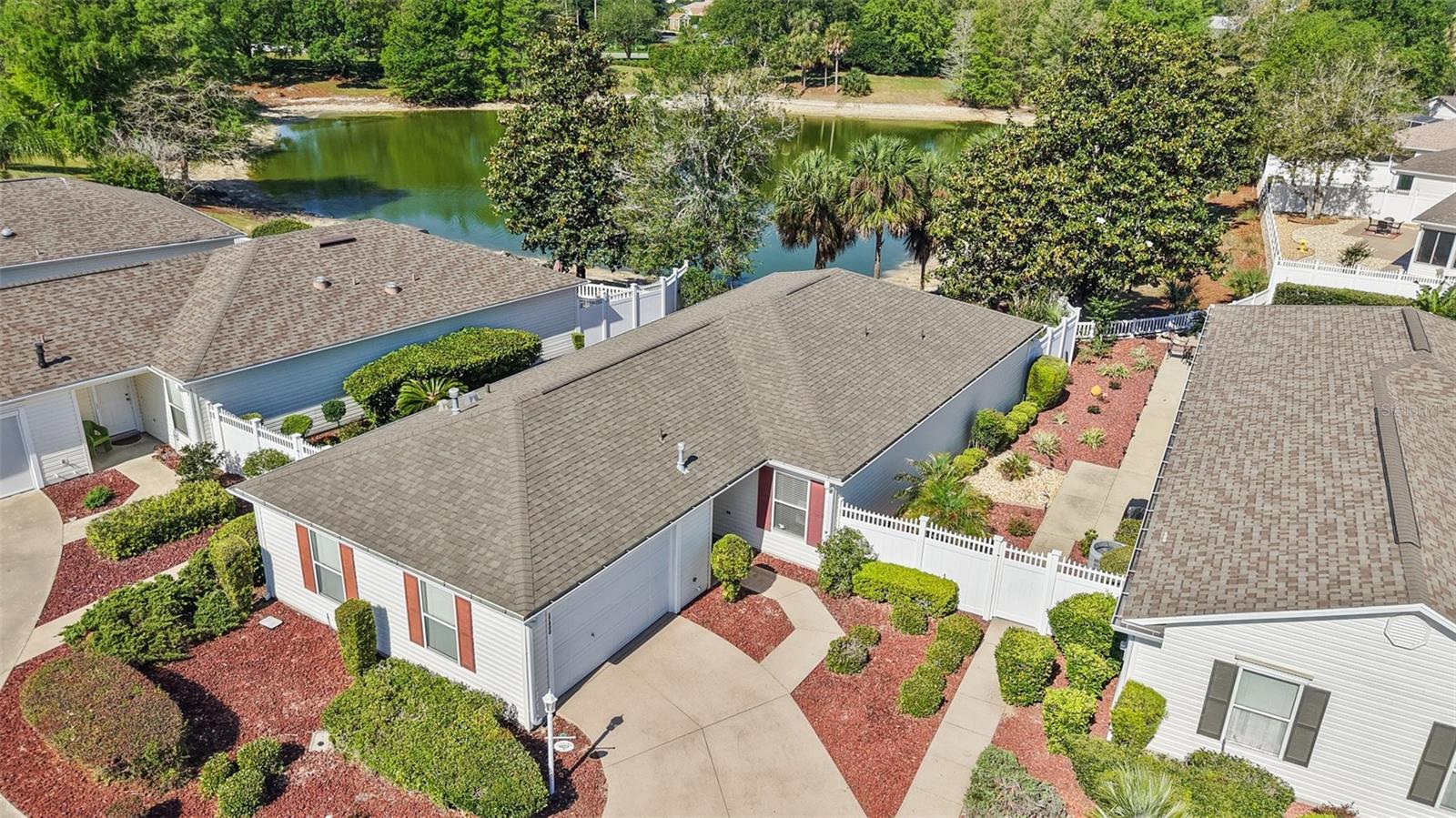 Welcome to this WATERFRONT 2/2 Marathon Courtyard Villa with a fully fenced yard in the Village of Springdale. You will love the exceptional water views! OFFERED TURNKEY. BOND PAID. NEWER ROOF 2022. NEW HVAC 2025 (10-year warranty). NEWER Water Heater 2018. Enhanced landscaping creates exceptional curb appeal, setting the tone for the updated interior filled with natural light and thoughtful design. Step inside to find an open floor plan—ideal for both everyday living and entertaining. The kitchen features WHITE CABINETRY, UPDATED STAINLESS STEEL APPLIANCES, GAS COOKING, a window over the sink, and a convenient breakfast bar, making it both functional and inviting. The dining room includes a classic chandelier and sliding glass doors to the side patio, perfect for grilling or enjoying morning coffee. The spacious living room offers its own sliding glass doors to the lanai, bringing in the tranquil water view and extending your living space outdoors. The primary bedroom is a cozy retreat with sliding glass doors to the lanai, a walk-in closet, and an en suite bathroom with a walk-in shower. Bedroom 2 includes a built-in closet, while the guest bath provides a tub/shower and extended vanity space for comfort and convenience. The spacious lanai and patio area are surrounded by enhanced landscaping, creating a beautiful and private outdoor living experience ideal for entertaining or enjoying the WATER VIEWS. The garage includes an electronic garage door opener, attic storage space, and a utility sink. The Village of Springdale is ideally located near Nancy Lopez Legacy and Glenview Country Clubs and Championship Golf Courses, Mulberry Regional Recreation Center, VA Administration, Savannah Regional Recreation Center, Springdale Walking Trail, Mulberry Dog Park, neighborhood pools, pickleball, tennis, bocce, shuffleboard, and a variety of shopping and dining options. PLEASE WATCH OUR WALKTHROUGH VIDEO OF THIS UPDATED HOME IN A FANTASTIC LOCATION, and CALL TODAY for your private showing or virtual tour!