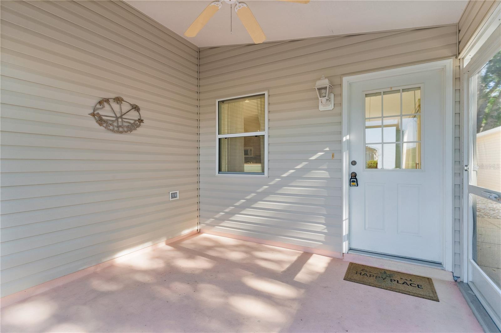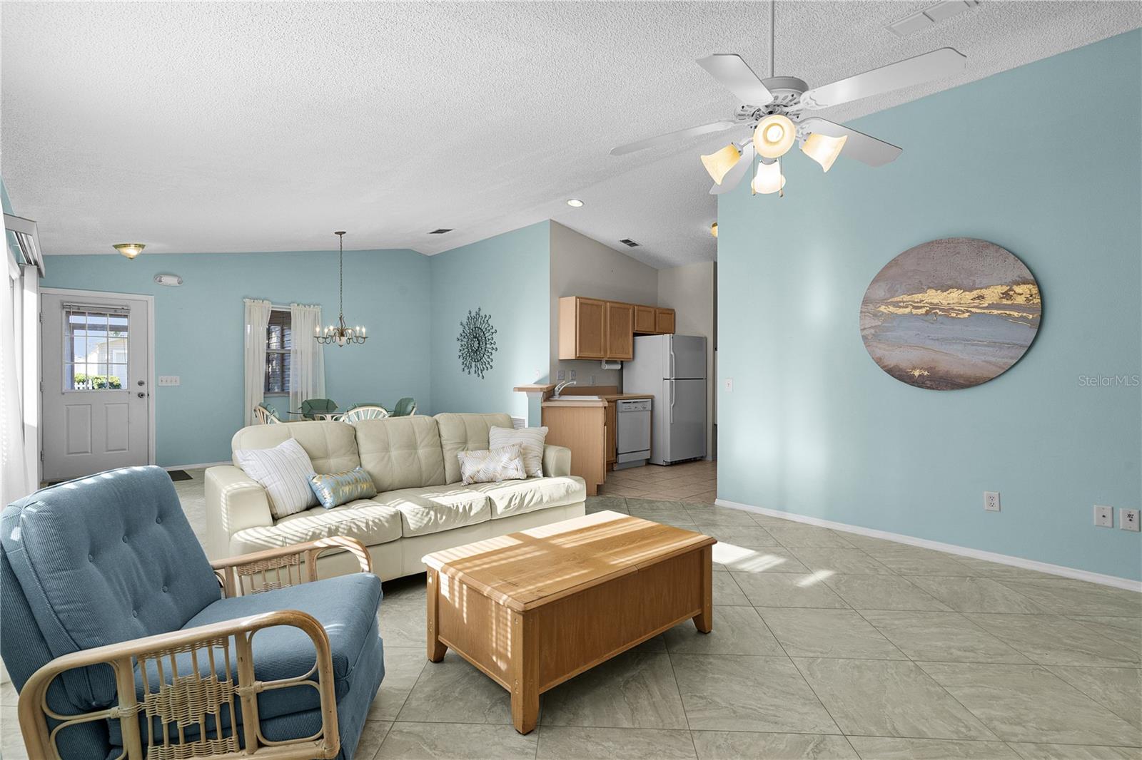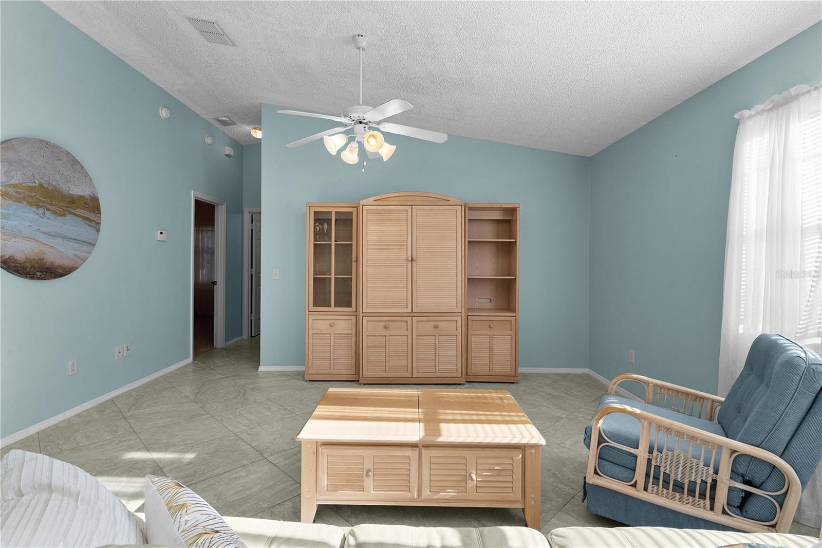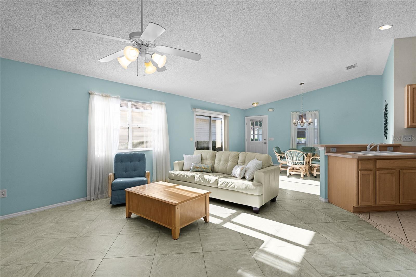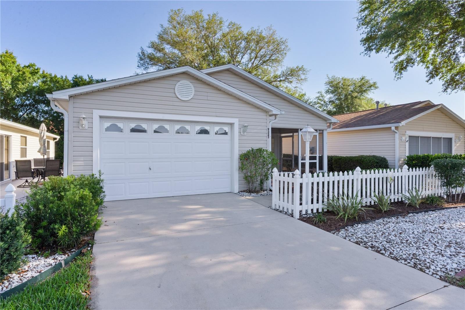 BOND PAID! TURNKEY! Welcome to this charming 2-bedroom, 2-bath Cabot Cove Patio Villa located in the desirable Ivy Stone Villas in The Village of Woodbury. Step through the screened front lanai into a spacious open-concept living and dining area featuring vaulted ceilings and tile flooring installed in 2017. Sliding glass doors open to the side patio, perfect space for grilling or outdoor seating. The kitchen offers ample counter and cabinet space to meet all your culinary needs, and just off the kitchen, you’ll find a convenient indoor laundry room with a large pantry. Access the 1.5-car garage—perfectly sized for your vehicle and golf cart. The primary suite includes vaulted ceilings, a generous walk-in closet, and an ensuite bathroom with a walk-in shower. The guest bedroom features double-door closet space and is ideal for visitors, complete with brand-new carpet in both bedrooms. The guest bath features a tub and shower combination and is conveniently located. Storage can be found in the linen closet just outside the guest bath. Enjoy being ideally situated between Spanish Springs and Lake Sumter Landing, just minutes from top dining, shopping, live music, and dancing. You're also just 2 minutes from Nancy Lopez Country Club and The Legacy Restaurant. Surrounded by golf courses and multiple neighborhood pools, this villa offers the ultimate Villages lifestyle. Roof 2020 HVAC 2024. Come make this your next home!