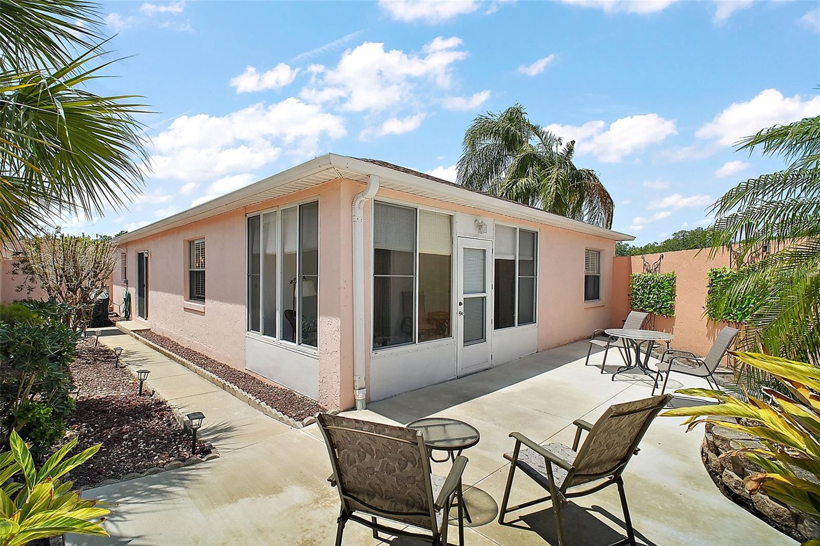 NO BOND! NEW ROOF & WATER HEATER (2024), NEW HVAC & ELECTRICAL PANEL with a charger for your Electric Car (2025)! FURNITURE PACKAGE OPTIONAL & SEPARATE! 2 Bedroom /2 Bath LOW MAINTENANCE Courtyard Villa on a Corner Lot in El Cortez Villas! Walking distance or a very Short Golf Cart ride to Spanish Springs Town Square and/or a 10 minute Golf Cart ride to Lake Sumter Landing. Whether you're looking for an investment, a charming part-time getaway, or your full-time residence, this property fits the bill. UPDATED KITCHEN with Quartz Counters, New Cabinetry, Stylish Backsplash, Newer Appliances, Pantry Closet and easy access to the garage. The Light & Bright OPEN Floorplan combines the living/dining rooms with TRAVERTINE FLOORING - extending Easy Maintenance and a Sleek Polished look everywhere you turn. The Primary Bedroom fits a king-sized bed & offers an inviting En-suite Bathroom with step-in shower plus a CUSTOM DESIGNED WALK-IN CLOSET (2025) and EASY ACCESS through Sliding GLASS DOORS to the ENCLOSED LANAI. The ENCLOSED LANAI can be accessed from Sliding Glass Doors in the Living Room as well. Check out the private, fully enclosed courtyard area with a NEW Concrete Pad/Design (2025)- ideal for grilling with loved ones, relaxing in the sun, hosting summer barbeques or playing with your furry friends too. The Village of El Cortez is conveniently located near all your day-day shopping, medical, & banking needs. Residents also enjoy spending time at the Chula Vista Club - a great spot for relaxing poolside - or playing bocce, shuffleboard, pickleball and tennis. Golfers appreciate the quick trip to either of the two executive golf courses, the resident-only Mira Mesa course, and the neighboring Chula Vista course.