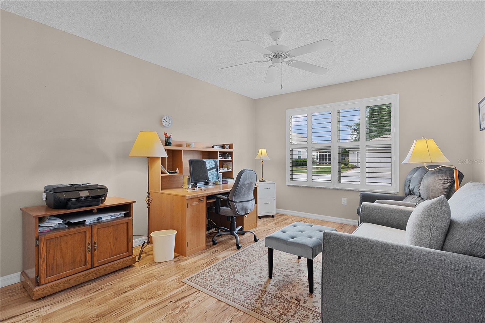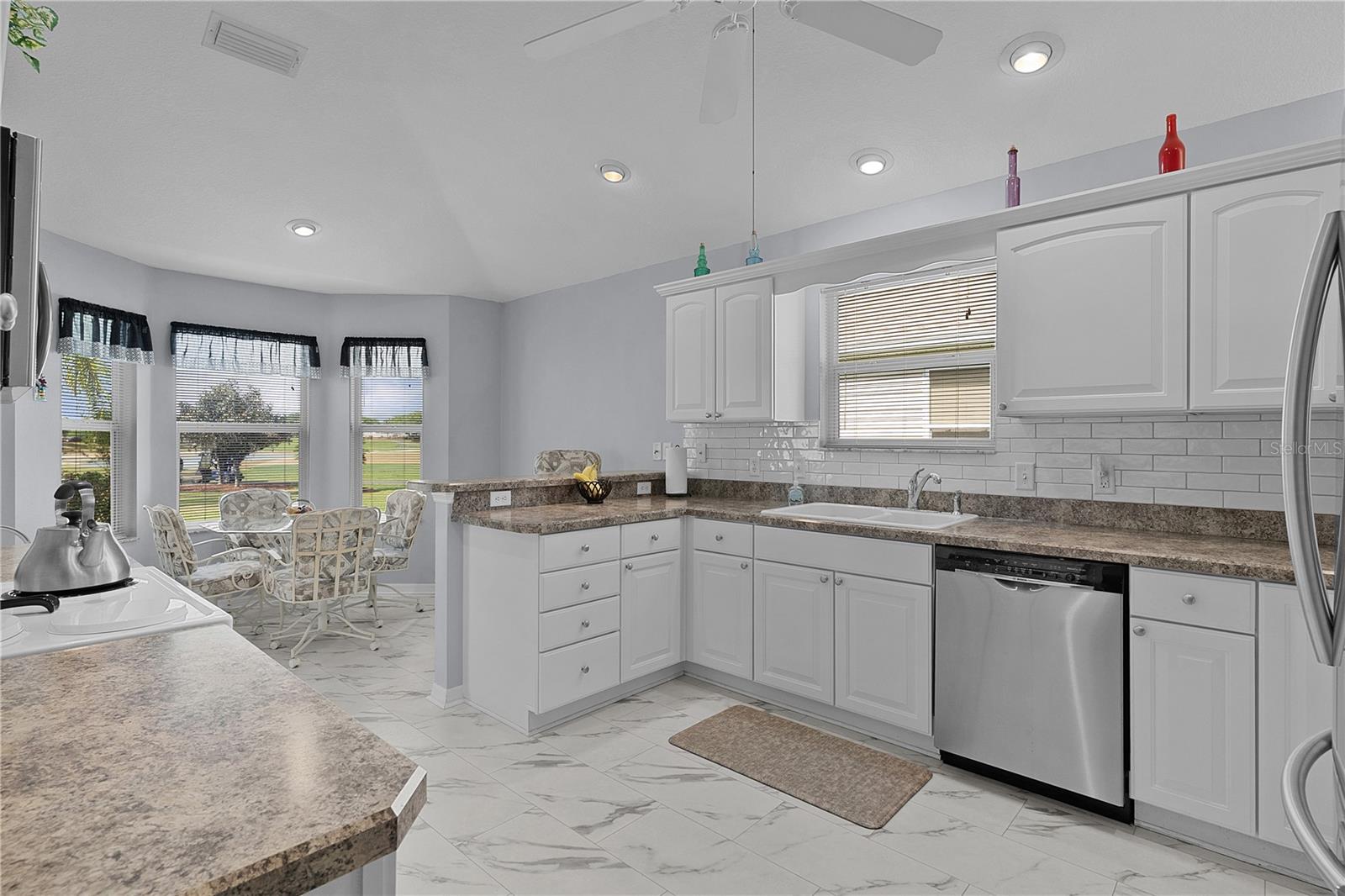 ~PRICE REDUCTION~ ~NO BOND~ ~2024 HVAC~ ~2020 ROOF~ ~GORGEOUS GOLF COURSE & WATER VIEW~ This 3/2 WHISPERING PINE model in CALUMET GROVE offers a perfect blend of updates, space, and scenic beauty — located between the 4th green and 5th tee of the OAKLEIGH EXECUTIVE GOLF COURSE. You'll love the stacked rock landscape and painted driveway that welcome you in. Inside, soaring VAULTED CEILINGS and rich LAMINATE FLOORING set a warm, inviting tone. The living room is bright and airy with a ceiling fan and custom blinds. The renovated kitchen is a showstopper with tile flooring, Hi-Def countertops, TILE BACKSPLASH, stainless steel appliances, roll-out shelving, GAS HOOKUP AVAILABLE, and charming CROWN MOLDING. Enjoy meals in your cozy EAT-IN KITCHEN with that view! The spacious primary bedroom features PLANTATION SHUTTERS, high ceilings, a ceiling fan, and an OVERSIZED WALK-IN CLOSET. The ensuite bath offers a beautifully TILED WALK-IN SHOWER with NEW SHOWER HEAD, double vanities with NEW FAUCETS, and high ceilings for an open feel. Guests will appreciate the 2 additional bedrooms also with laminate flooring, ceiling fans, and built-in closets. The EXPANDED guest bath features a tile tub/shower combo with a TRANSOM WINDOW for natural light as well as a DEEP LINEN CLOSET for additional storage. The laundry is in the garage with additional cabinetry for storage. The 2-car garage is fully equipped with painted floors, attic stairs, full attic decking, and a sliding screen for extra comfort. Relax year-round in the EXPANDED ENCLOSED LANAI featuring indoor/outdoor carpet, telescoping sliders, 2 ceiling fans, and a small grilling pad just outside. 2024 HVAC, 2020 Roof, 2013 Hot Water Heater. Enjoy a truly relaxing lifestyle with GOLF COURSE VIEWS, WATER VIEWS, and all the wonderful amenities The Villages has to give you. Don't miss this one — it's minutes from the Calumet Grove Pool and First Responders Rec Center. Also close to the Mulberry Grove Rec Center, Legacy Restaurant at Nancy Lopez and the Legacy Bar & Grill. The Mulberry Grove Shopping Plaza provides dining, shopping and medical, including the VA Clinic!