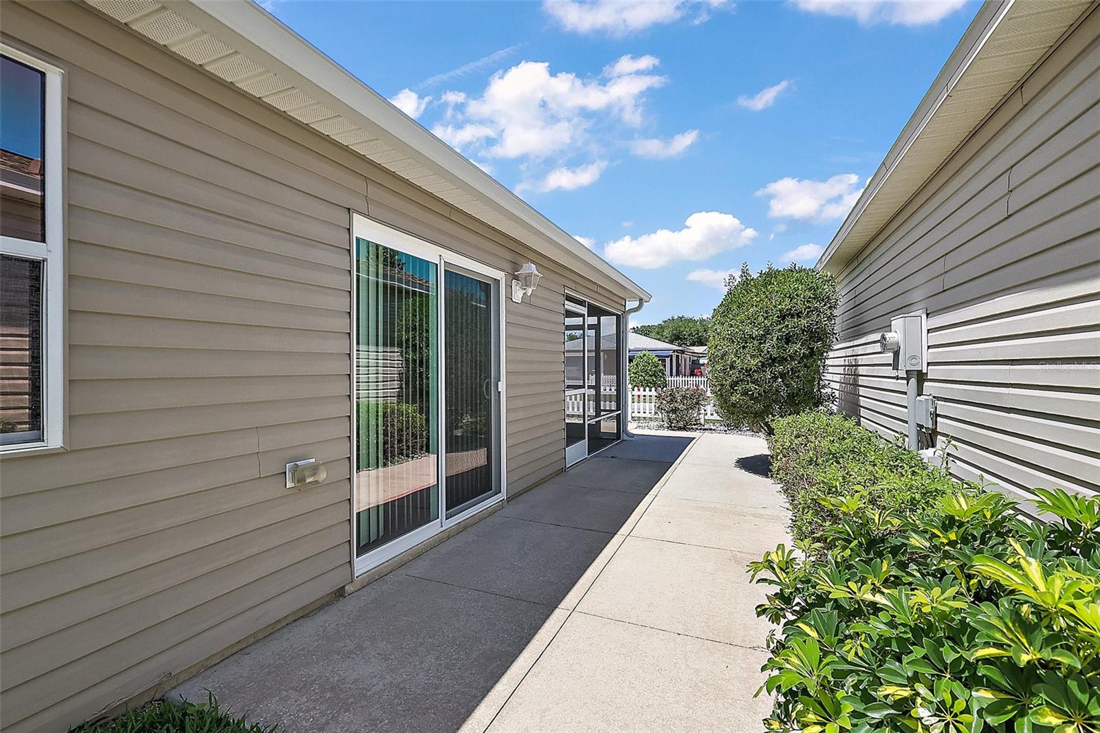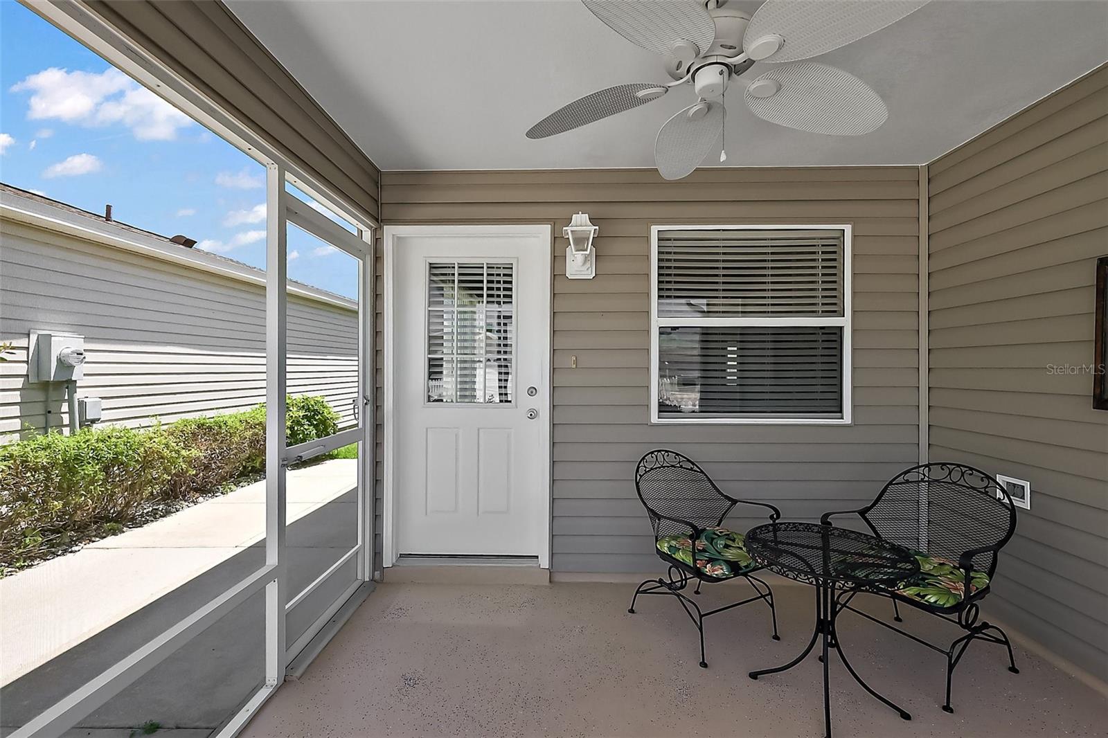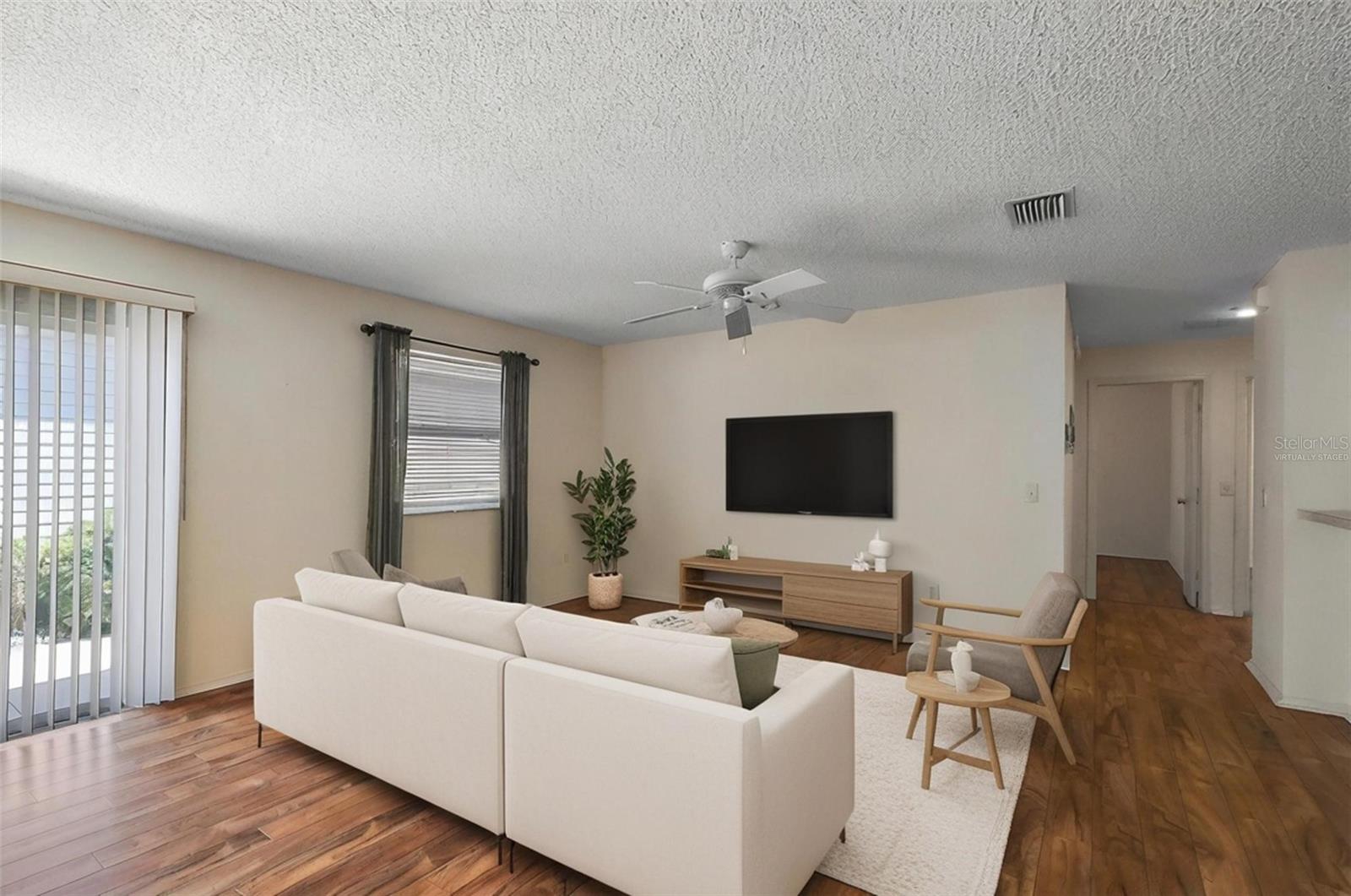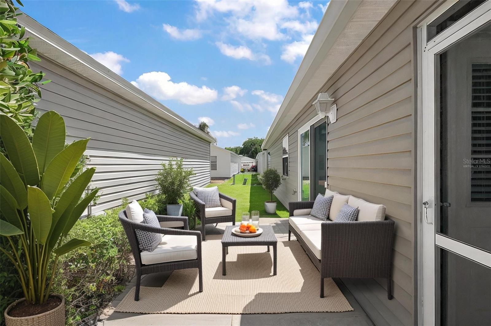 Under contract-accepting backup offers. One or more photo(s) has been virtually staged. Welcome to this 2/2 Colony Patio Villa in the charming Village of Ashland. Featuring NO carpet, a PAID bond, and a 2021 roof, this home is ready for you to make it your own. The front exterior features lush landscaping and a welcoming front lanai that leads to the entryway. Inside, you'll find laminate flooring throughout. The open living and dining area includes a sliding glass door that opens to the side patio, perfect for enjoying the outdoors. The kitchen boasts WHITE CABINETRY, breakfast bar, and dinette area. The primary suite is a true oasis with a walk-in closet and ensuite bath which boasts a walk-in shower with glass doors. Bedroom two is perfect for guests with a built in closet and close proximity to the guest bathroom. This home offers valuable updates, including a 25-year roof warranty that began in 2021. Interior paint and hardwood laminate flooring were completed in 2015. Additional upgrades include a water softener and reverse osmosis system, a lanai ceiling fan, and two updated vanity lights. Conveniently located between 466 and 466A, the Village of Ashland is only a short golf cart ride to Lake Sumter Landing and the shopping, restaurants, and banks on 466. Nearby, you’ll find Publix, Fresh Market, CVS, Walgreens, Ace Hardware, Bonefish Grill, Olive Garden, Culver's, Bob Evans, and Starbucks. The Village of Ashland has its own neighborhood recreation center, complete with an adult swimming pool, bocce, shuffleboard courts, and horseshoe pits. Just around the corner is the Churchill Street Village Recreation Center. Nearby executive courses include Pimlico, Churchill Greens, and Belmont. The Arnold Palmer Country Club and Championship Golf Course is also just minutes away. PLEASE WATCH OUR WALKTHROUGH VIDEO OF THIS HOME and call today to schedule your Private Showing or Virtual Tour!