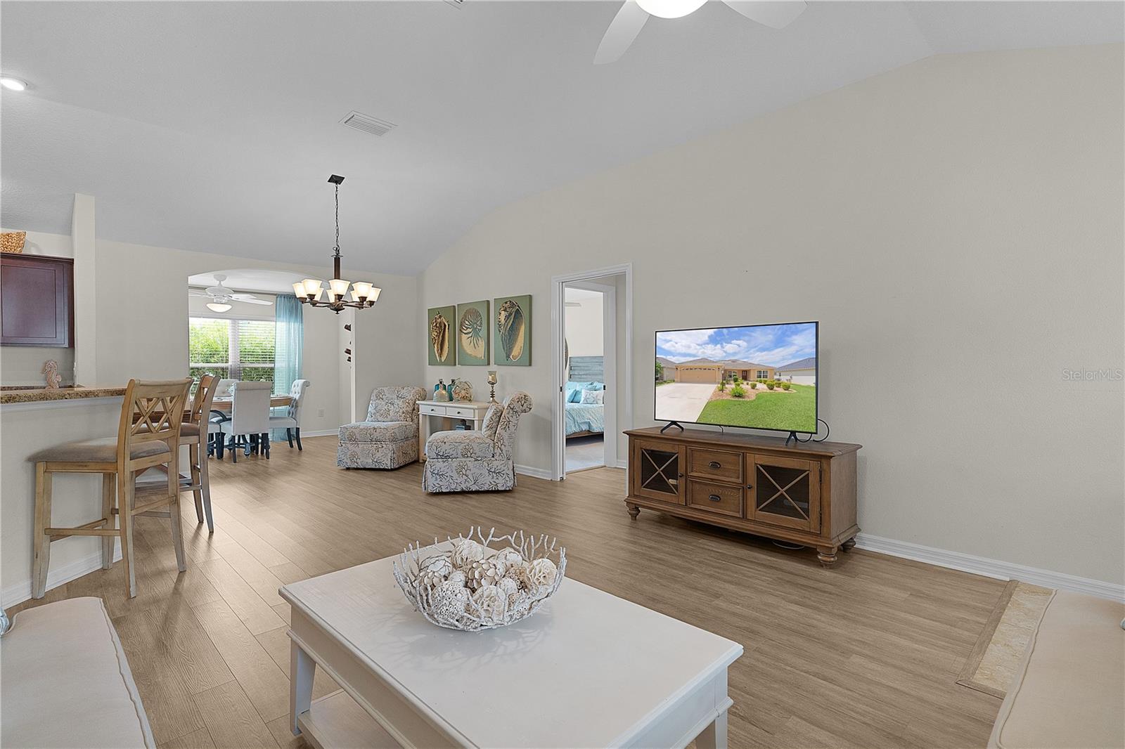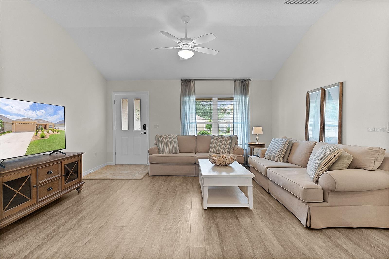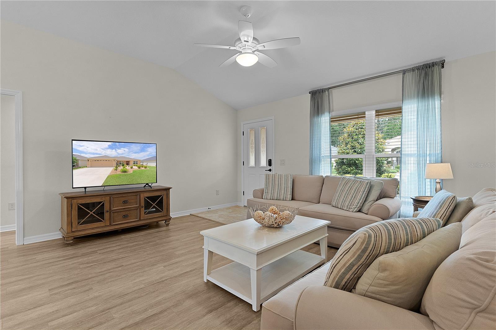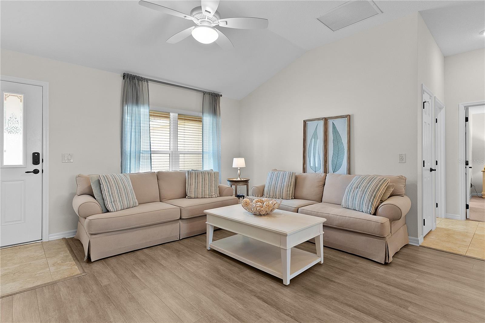 Move right in and start enjoying the Villages Lifestyle right away! FABULOUS PRICE on this Beautiful 3/2 Block/Stucco ALLAMANDA Designer home with a Sunny Florida Room...and is ready for immediate occupancy. Being offered TURNKEY with Quality furnishings, you’ll want to make this wonderful home your own. As you approach, you'll be greeted with attractive curb appeal and a cozy North-facing covered front porch - very welcoming! Inside, you’ll immediately feel at home with a spacious living area featuring VAULTED KNOCKDOWN CEILINGS and LUXURY VINYL PLANKING in the main living area, Florida Room and Guest room. You'll love the open concept of this very popular model which boasts 3 bedrooms (closets in all), 2 spacious bathrooms, Florida Room, Inside laundry with extra cabinets, and an Oversized 2-car garage. Ideal for entertaining, the open kitchen offers Stainless appliances with a Natural Gas Range, plenty of cabinets with pull-out shelves, a Closet pantry, ceiling fan, and the breakfast bar makes for a wonderful gathering spot. The inviting Florida Room leads to the South-facing Covered and Screened lanai to enjoy the fresh air without the elements, and the strategically placed hedge offers a bit of PRIVACY. The outdoor patio is a perfect spot for grilling. The Large primary suite features an en-suite bath with DUAL sinks, 2 WALK-IN CLOSETS, Custom Tiled Walk-in Shower, Ceiling fan and Privacy commode. You and your guests will appreciate the Privacy afforded by a pocket door to the 2 guest bedrooms and a full guest bath which offers a deep soaking tub/shower combo! Additional features include a whole house Nova Water Filtration system, Tankless Gas Water Heater, gutters, blinds, window treatments, utility tub, and the extra storage closet in the garage will be appreciated. Conveniently located in the Village of Fenney, you can easily access all your favorite activities by golf cart --numerous golf courses, pools, recreation centers, dining, shopping, medical services, and much, much more! Be sure to watch the VIDEO TOUR! The tax line reflects property taxes, and the CDD line includes the bond, maintenance, and fire district. Bond balance: $21,225.36. So…what are you waiting for? If not now, when? Call to book your private showing today before it is too late!