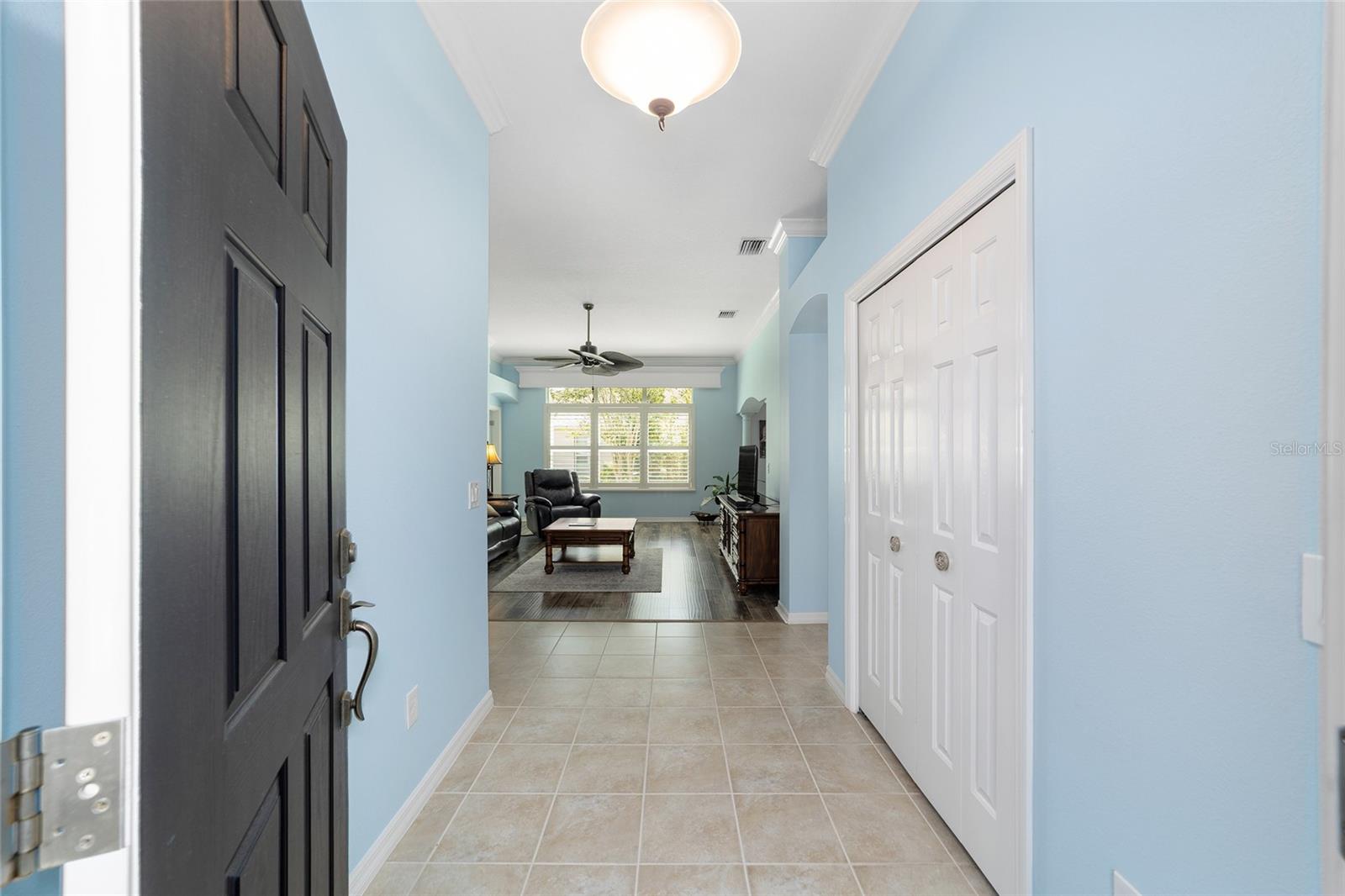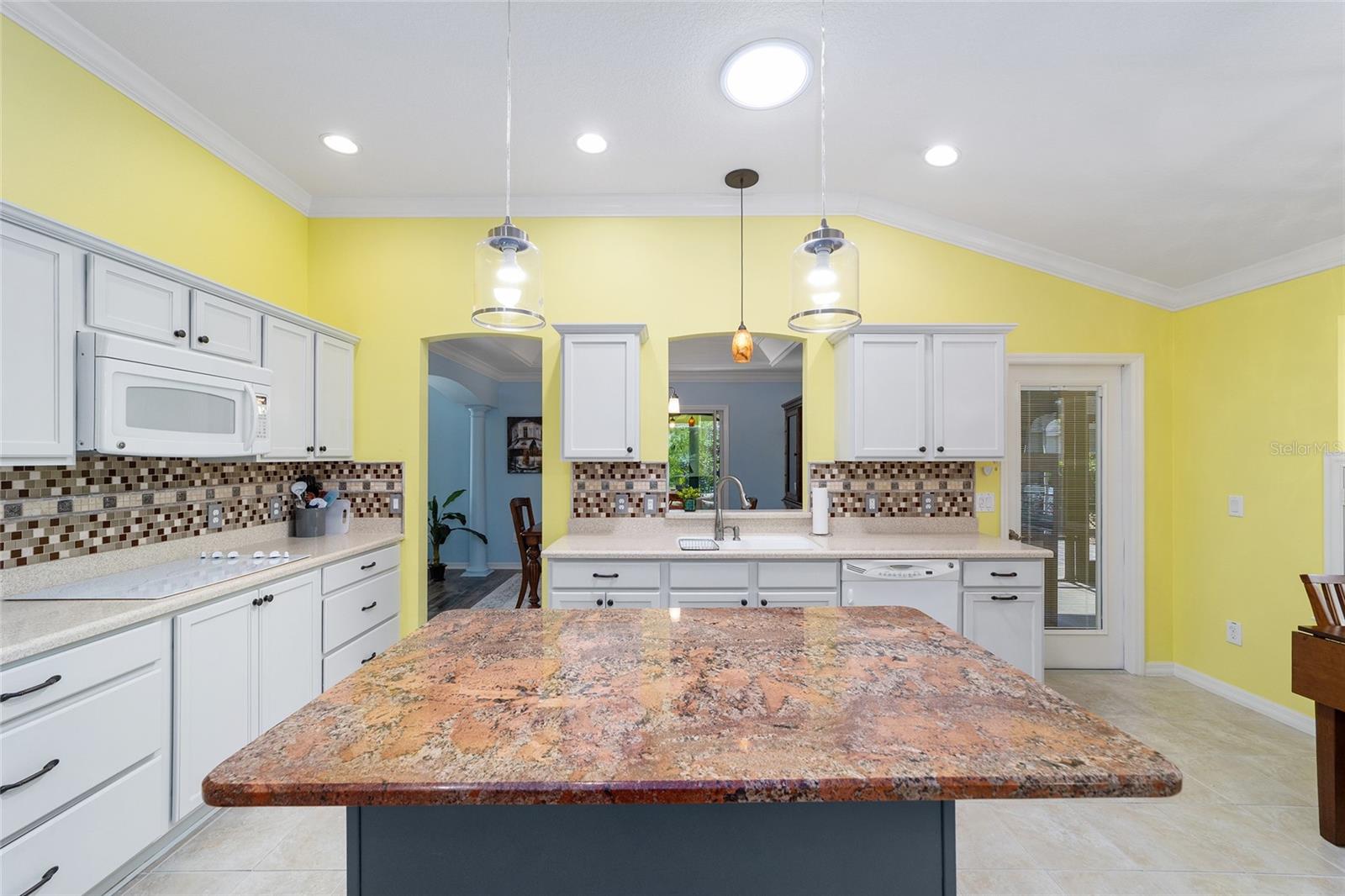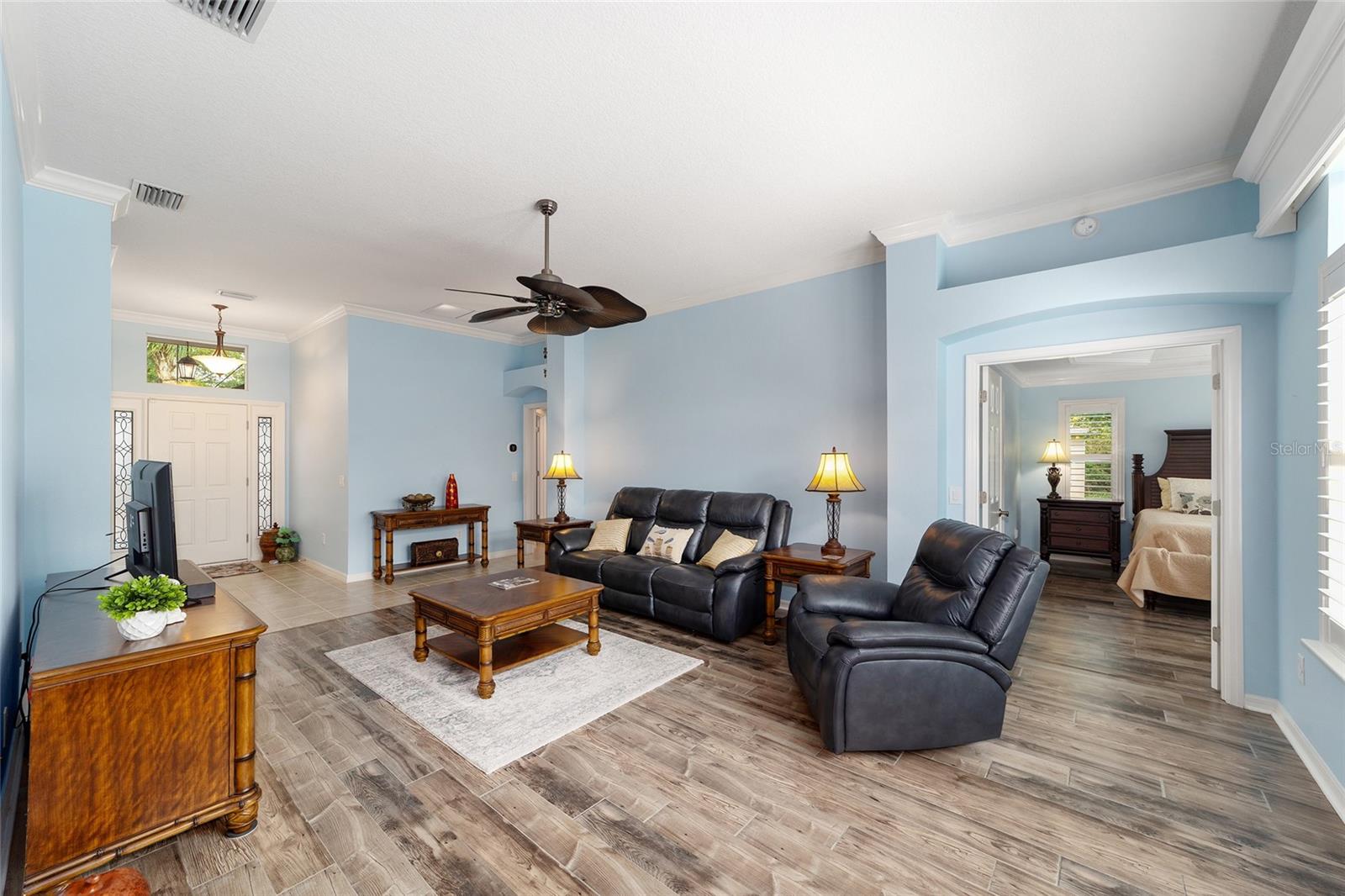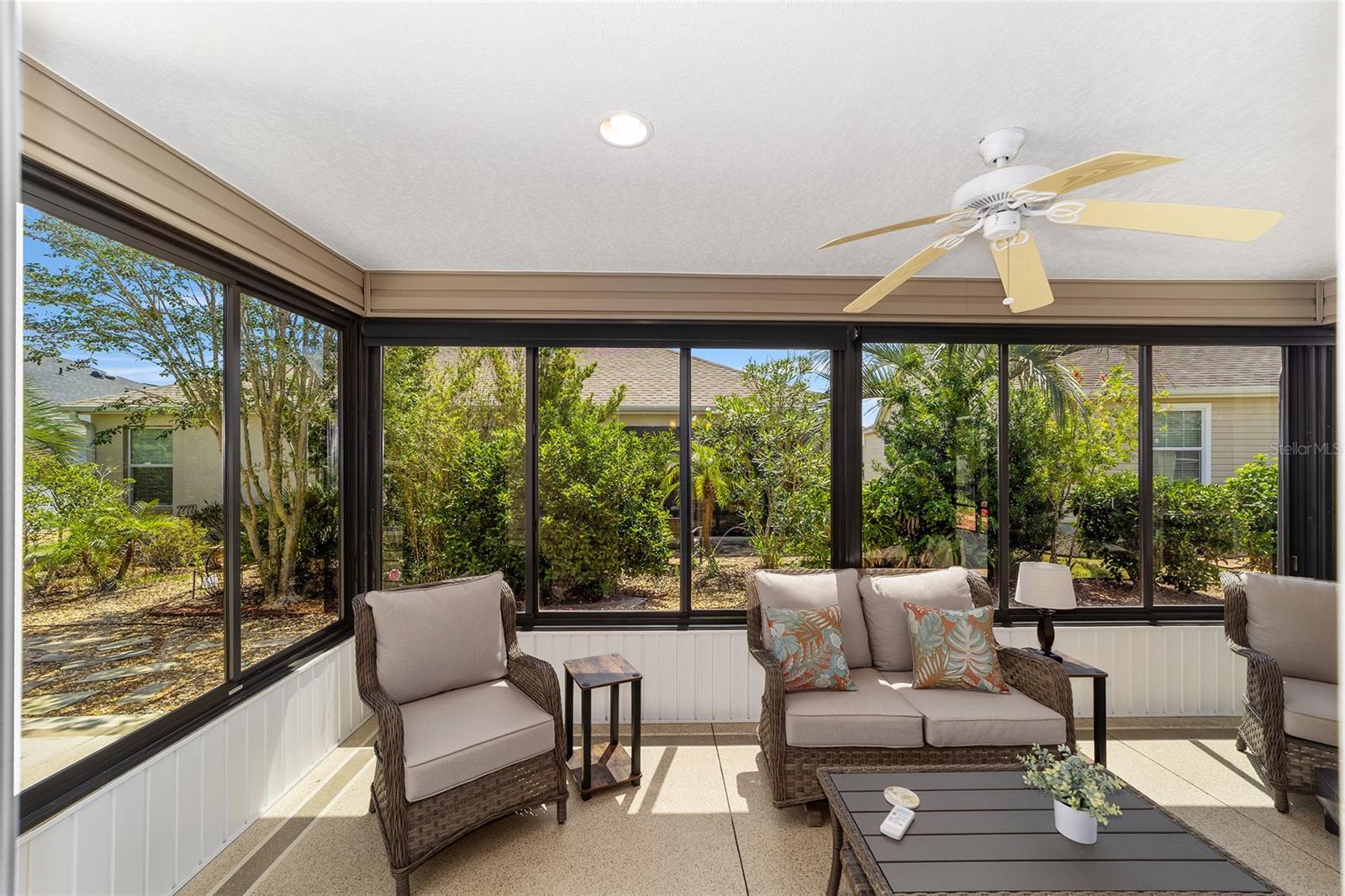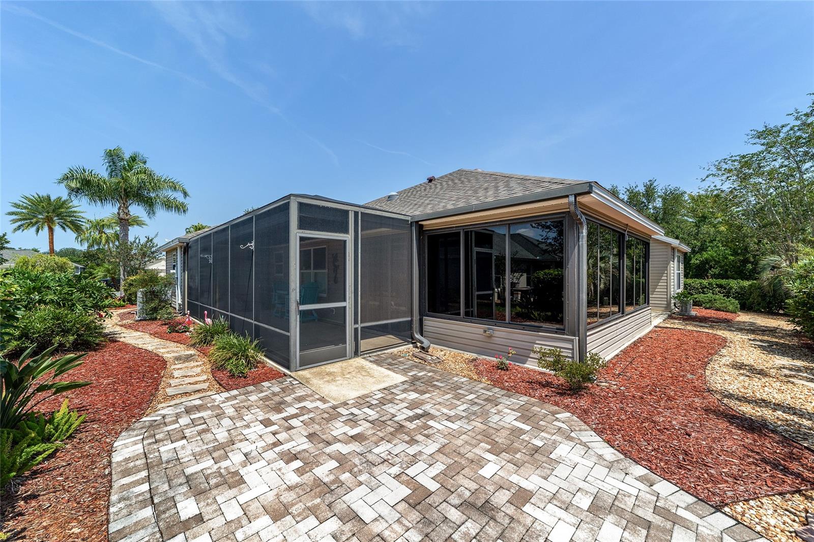 WELCOME TO A CHARMING RETREAT IN THE SOUGHT-AFTER VILLAGE OF BUTTONWOOD! NESTLED ON A QUIET CUL-DE-SAC, THIS BEAUTIFULLY APPOINTED, FULLY FURNISHED TURNKEY HOME IS READY FOR NEW OWNERS WHO WILL APPRECIATE ITS MANY EXCEPTIONAL FEATURES AND INVITING LAYOUT. A welcoming pathway leads to a stylish screened foyer, offering a graceful entrance into the home. Inside, a tiled entryway opens to a spacious living room, with a convenient hallway closet to the right. The layout flows effortlessly, with the kitchen to the right and a private guest wing to the left—complete with two bedrooms, a full bath, and a pocket door for added privacy. Elegant French doors reveal a generously sized master suite off the main living area. The ensuite bath boasts dual walk-in closets, a large double vanity, a glass-enclosed shower with built-in seating, and a separate water closet, all accessed through thoughtful pocket doors. Designed for culinary enthusiasts, the kitchen features a granite island, quality appliances, a modern cooktop, pull-out cabinet drawers, and a cozy breakfast nook. Nearby, the laundry room offers ample storage, a washer and dryer, and direct access to a spacious garage. The garage includes a separate golf cart space, additional cabinetry, a workbench, and a high-end water softener system. The central dining area, located just off the living room, connects to the kitchen via a pass-through window and a doorway. Sliding doors lead to a wraparound lanai equipped with a mini-split system, large three-quarter windows with drop-down shades, and access to a tranquil patio surrounded by lush landscaping. At the other end of the lanai, a small hallway opens to a second fully screened lanai and another spacious patio—ideal for relaxing or entertaining. ADDITIONAL FEATURES INCLUDE PLANTATION SHUTTERS ON EVERY WINDOW, CROWN MOLDING THROUGHOUT, AND STYLISH, COMFORTABLE FURNISHINGS IN EVERY ROOM. SURROUNDED BY NUMEROUS GOLF COURSES AND CLOSE TO A VARIETY OF RECREATIONAL ACTIVITIES, THIS ELEGANT, PRIVATE RESIDENCE OFFERS THE BEST OF BOTH WORLDS. DON’T MISS THIS RARE OPPORTUNITY TO OWN A TRUE GEM IN BUTTONWOOD! PRIVACY, ELEGANCE, AND CONVENIENCE AWAIT—THIS HOME IS A MUST-SEE! [Roof replaced in 2025 A/C 2022 Water Heater 2021]